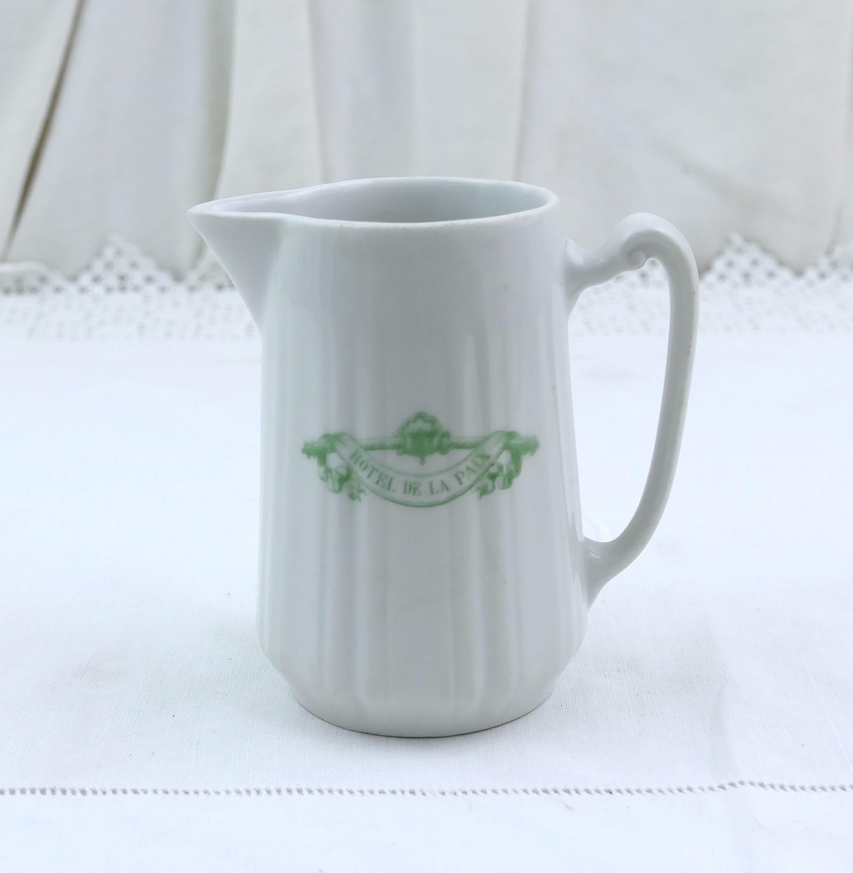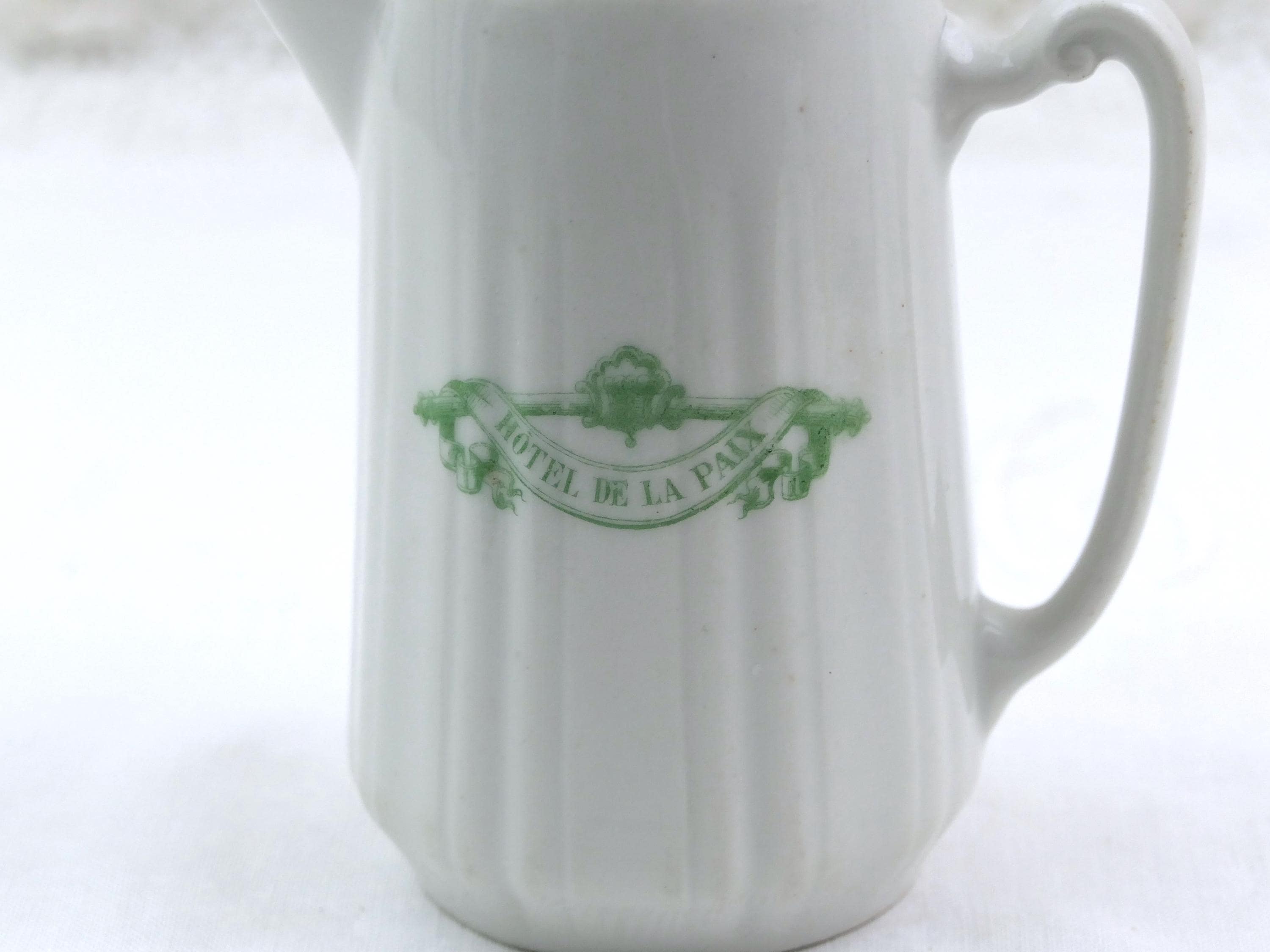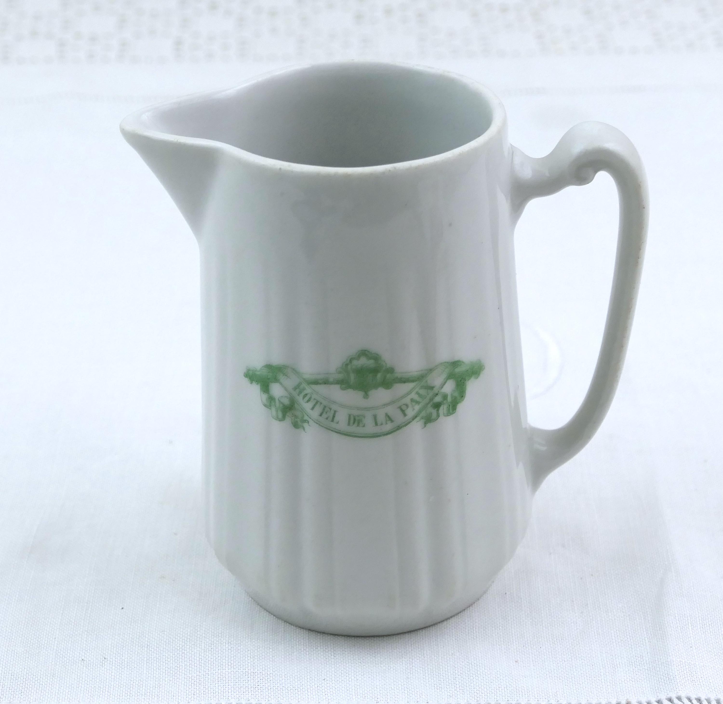 Antique French creamer from a hotel called hotel de la paix. Made of white porcelain china. Ca early 1900s.