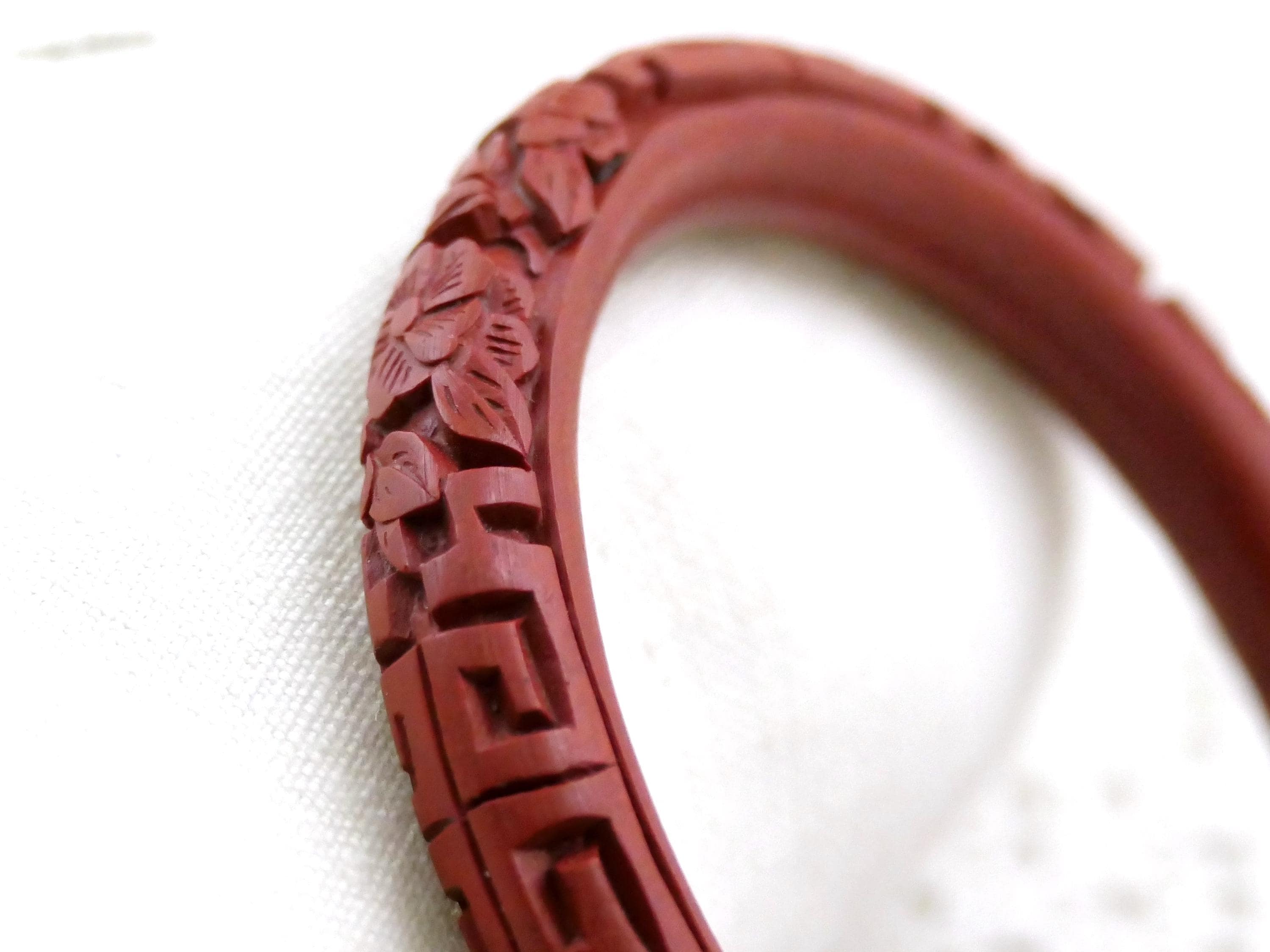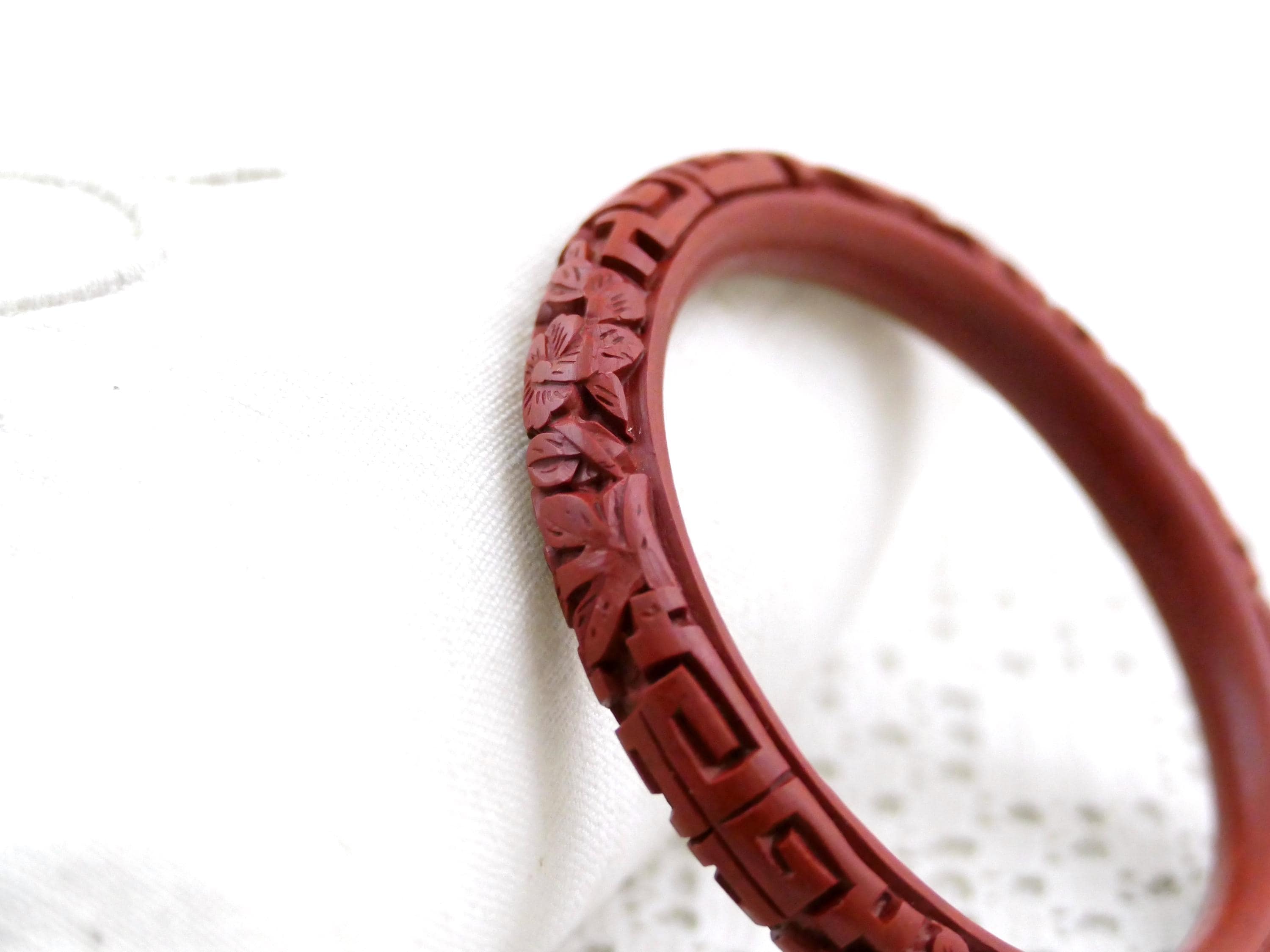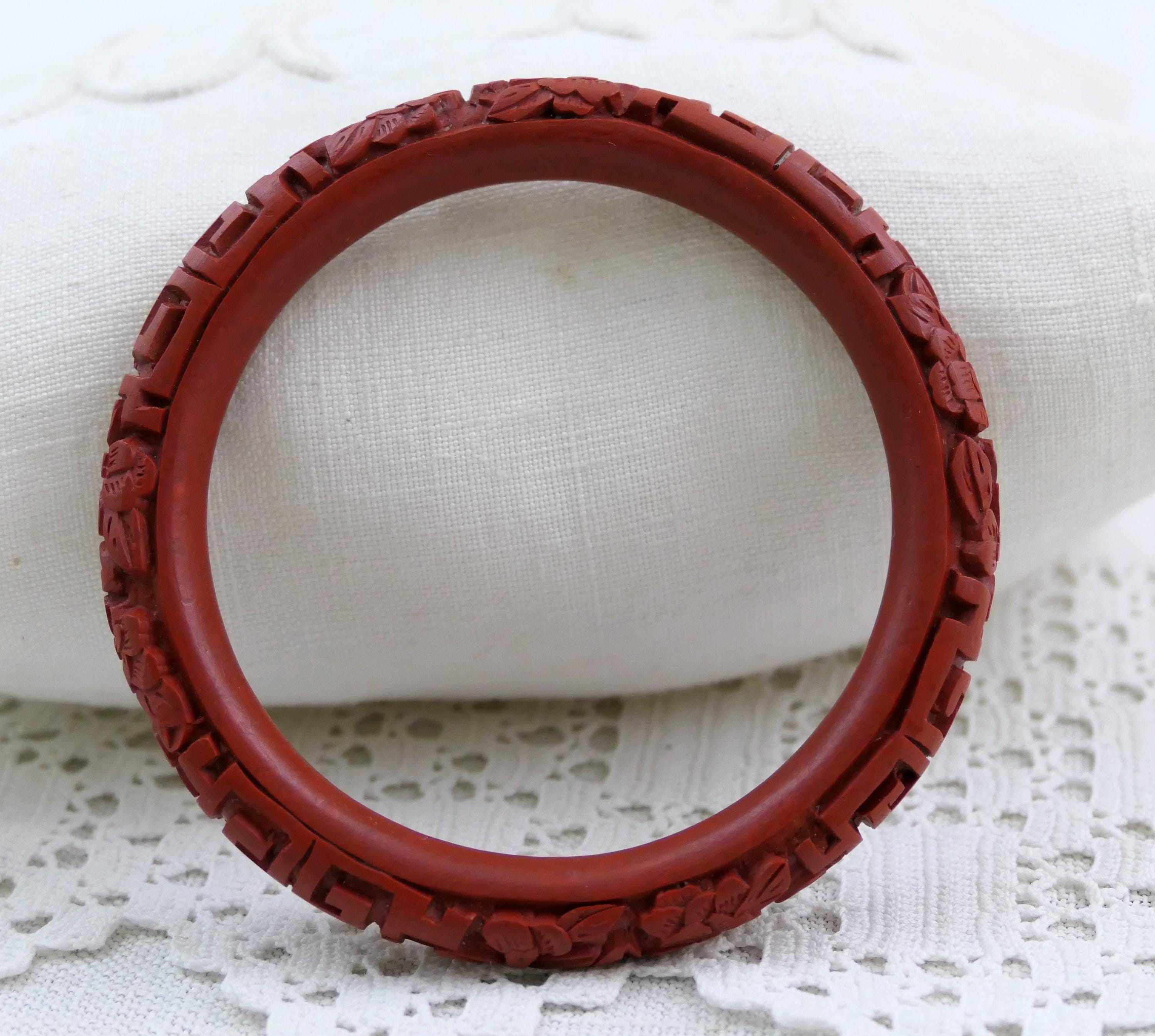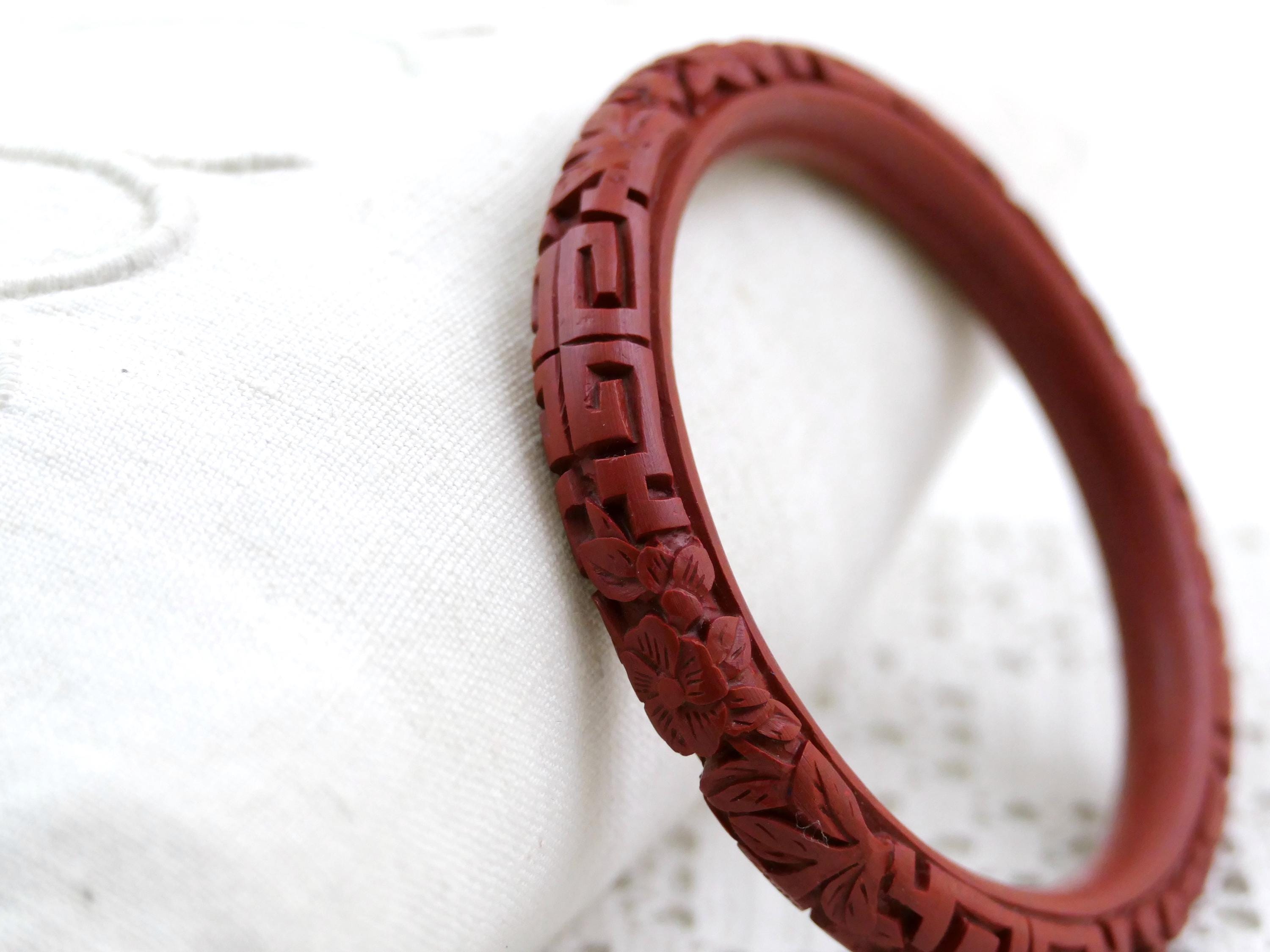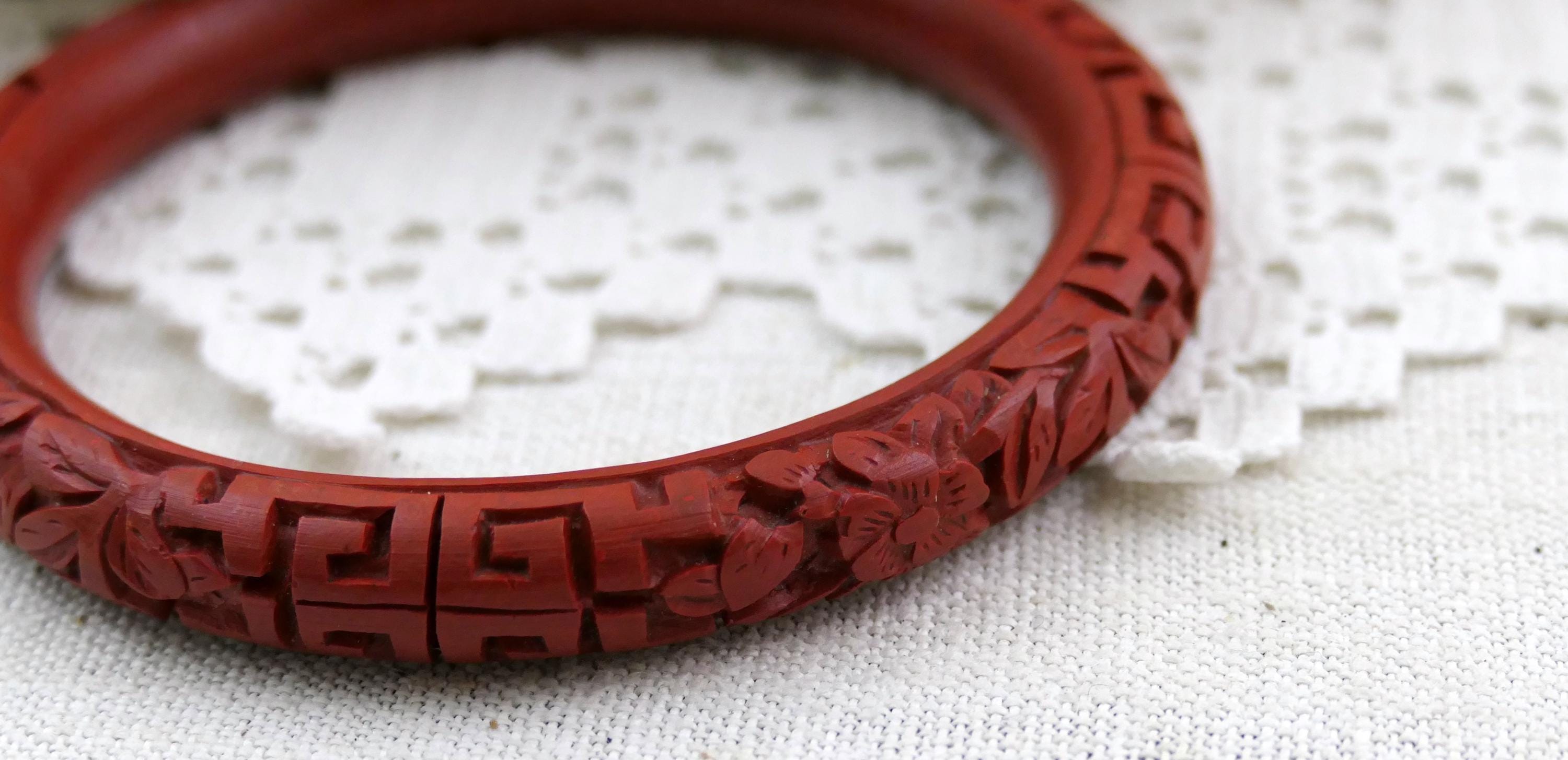 Vintage carved cinnabar bangle. Made in China of deep red carved lacquer. Ca mid to late 1900s.