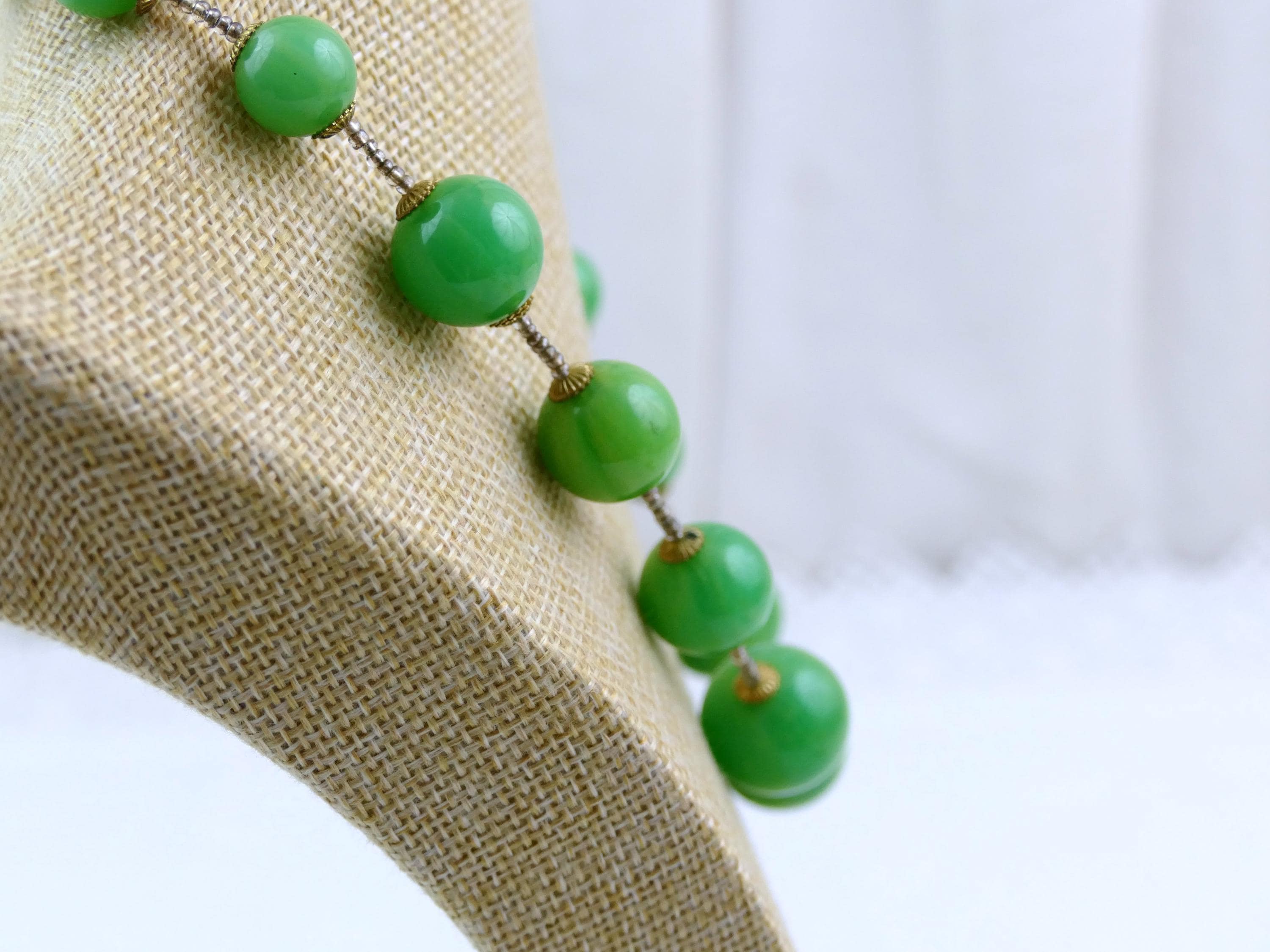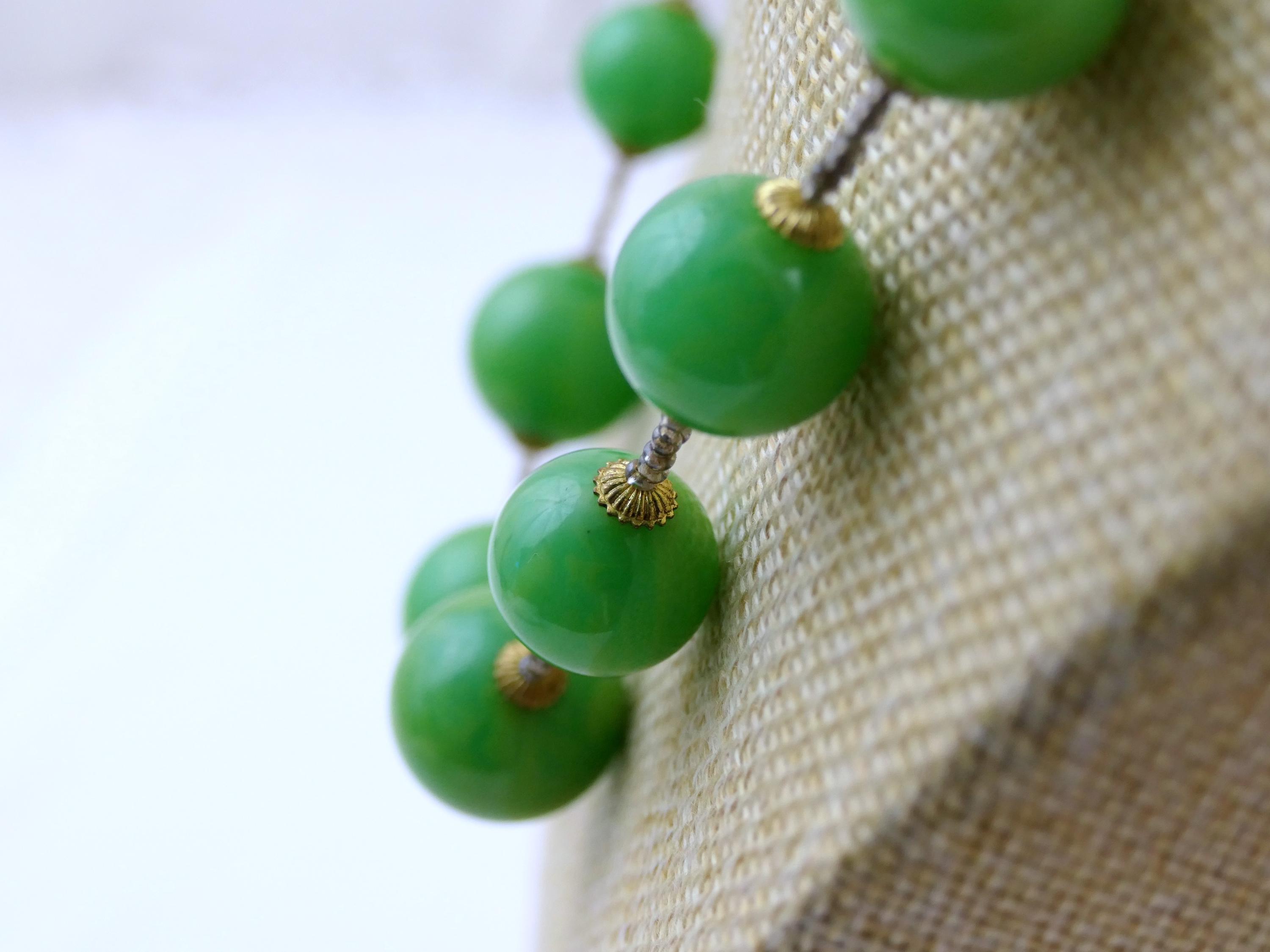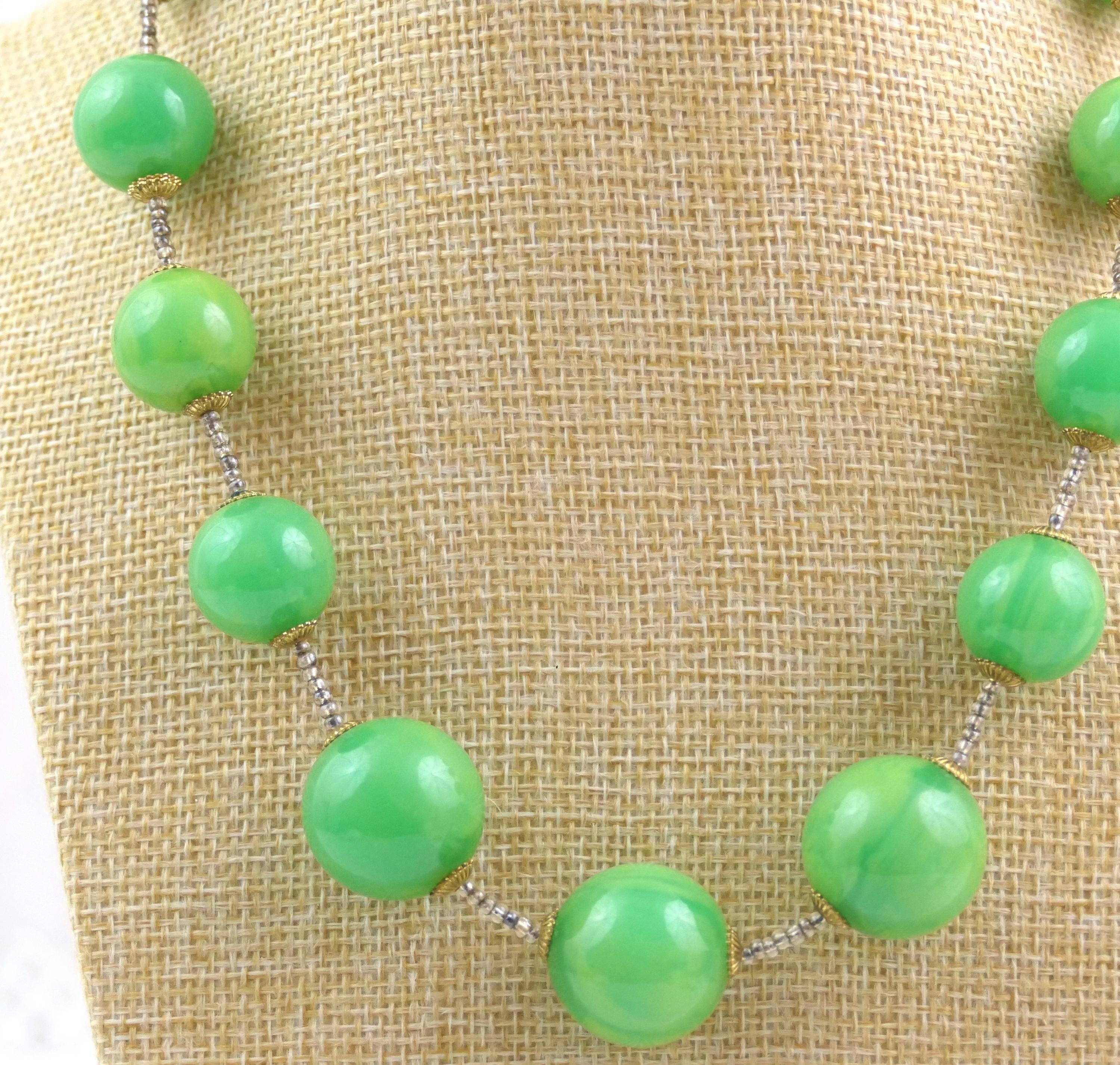 Vintage marbled emerald green Catalin beaded necklace. Made of colored Bakelite. Ca 1950s.