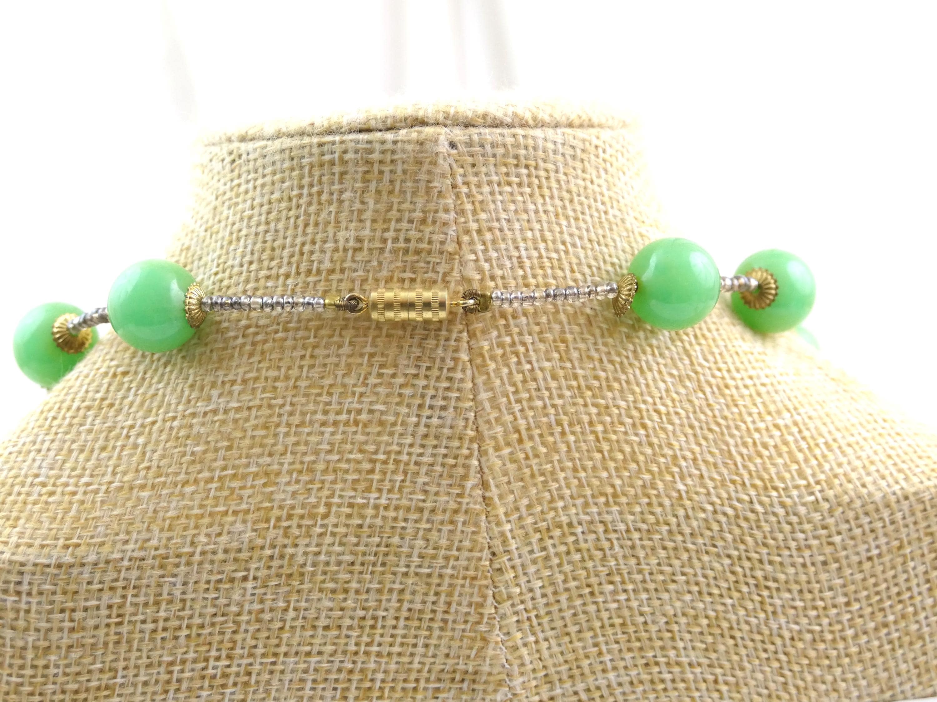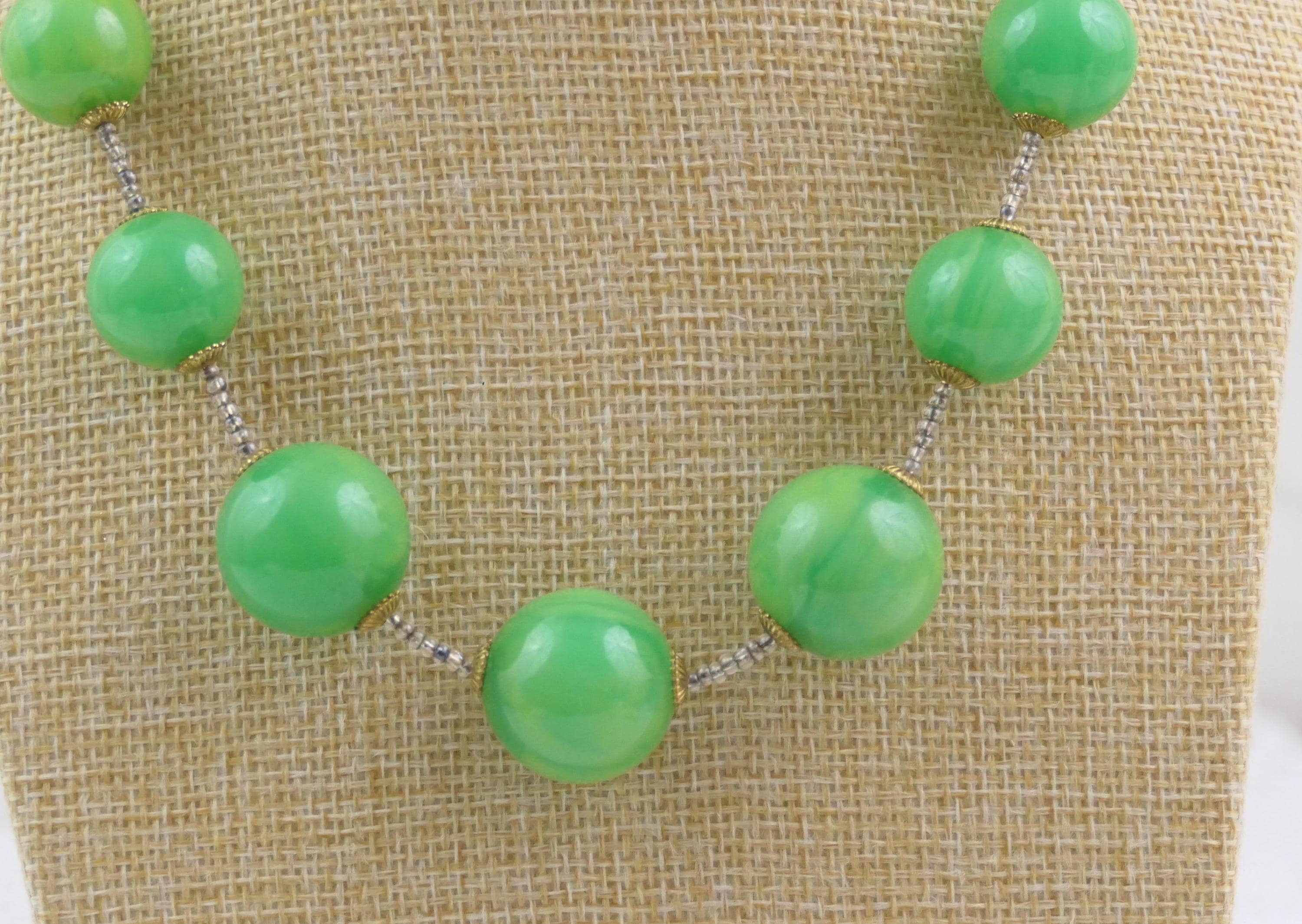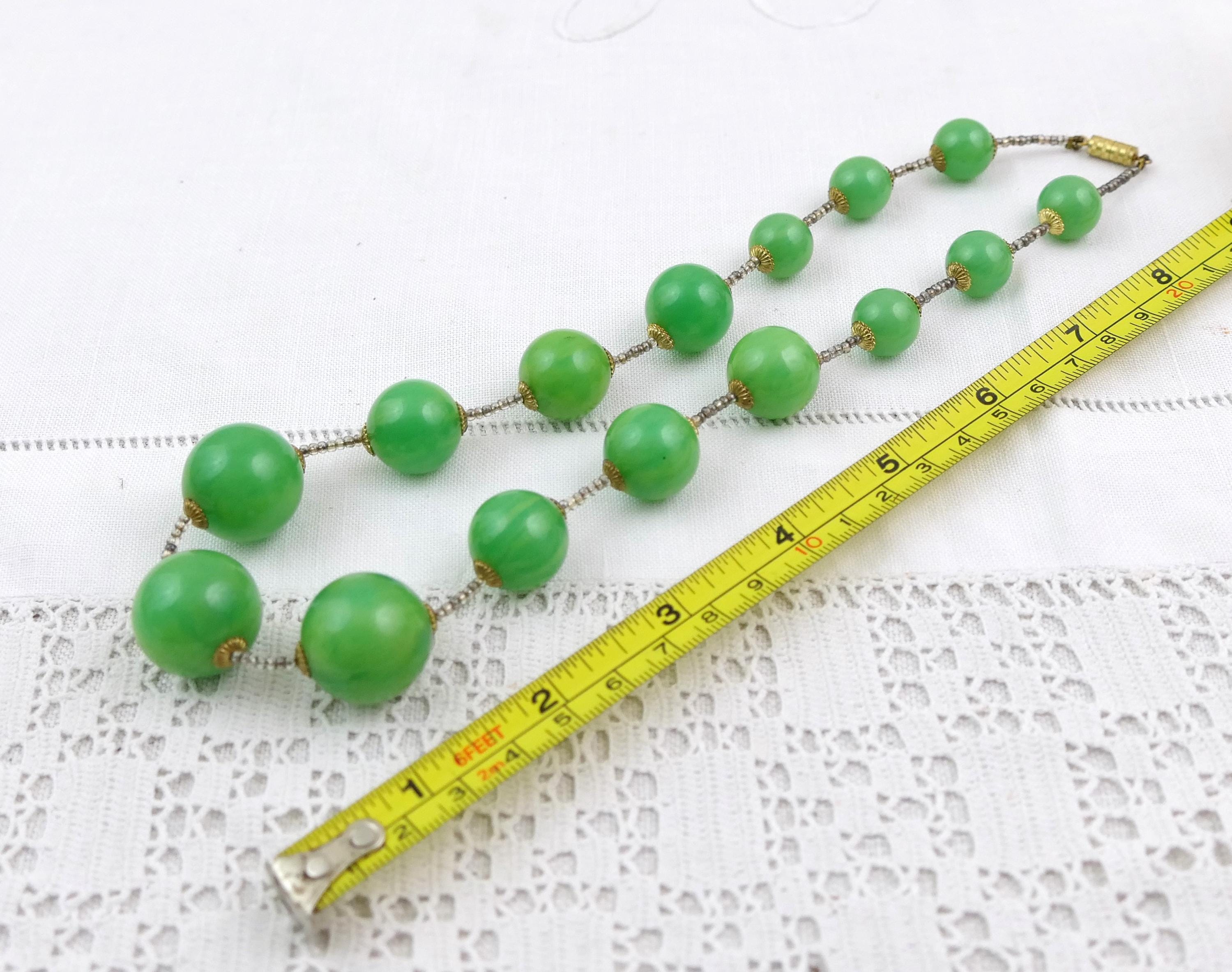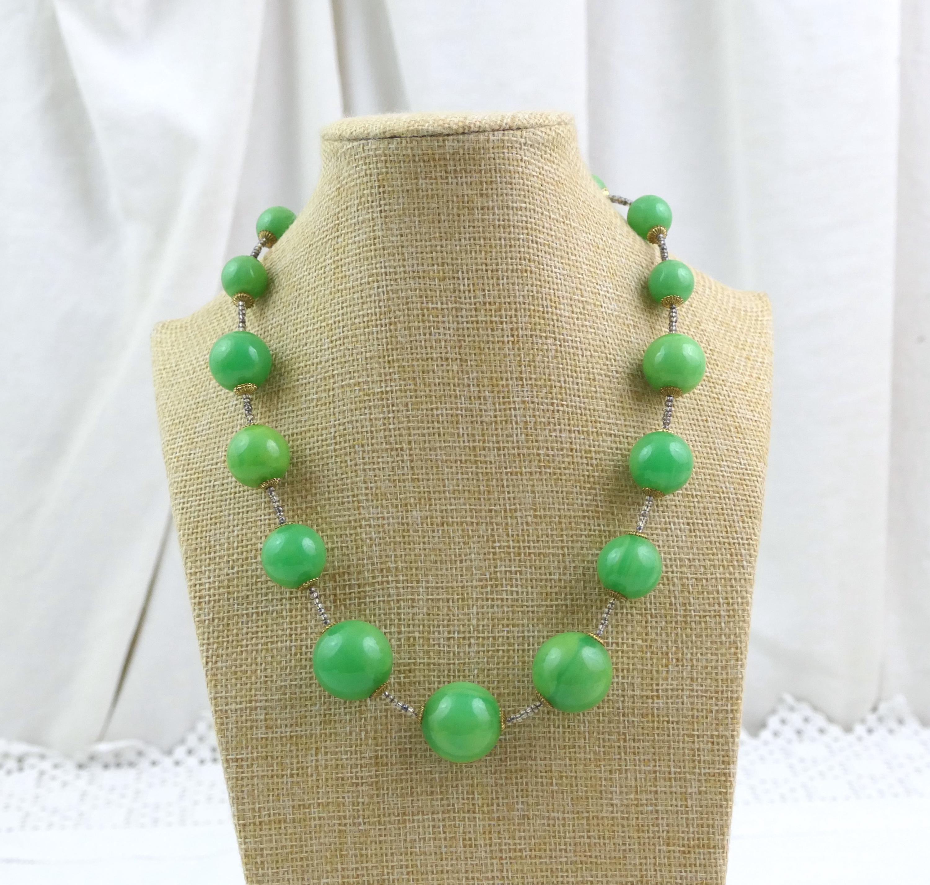 Vintage marbled emerald green Catalin beaded necklace. Made of colored Bakelite. Ca 1950s.