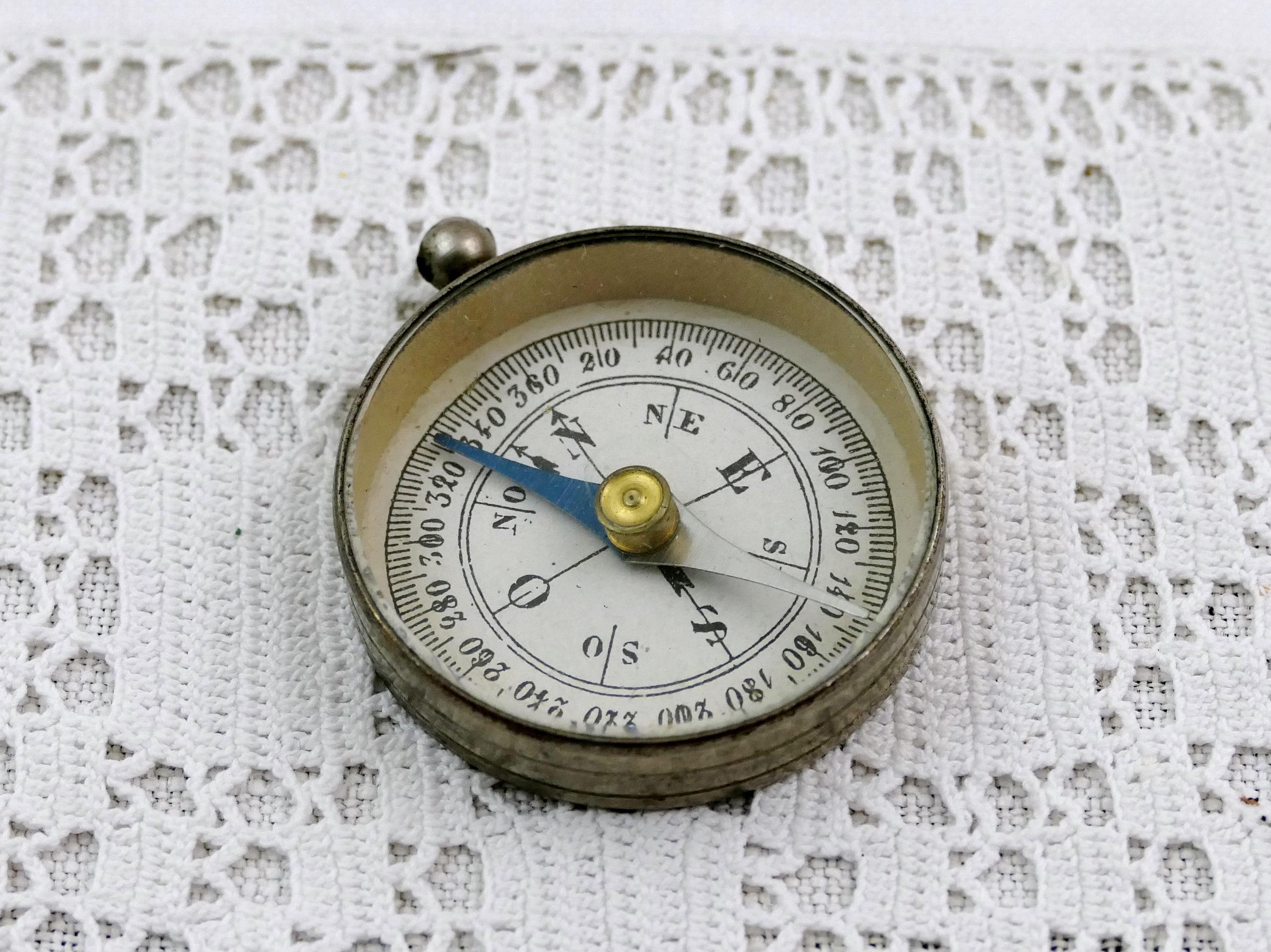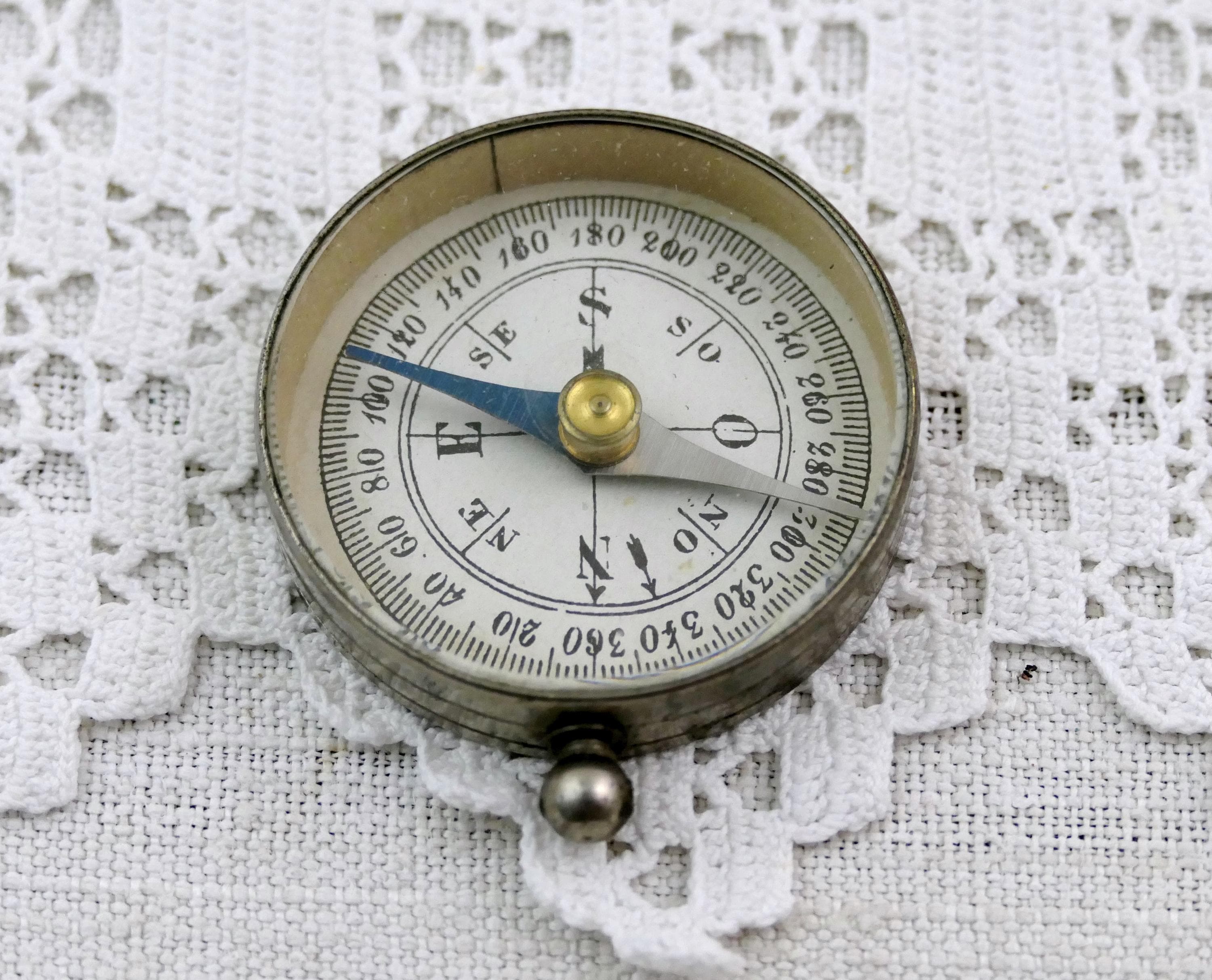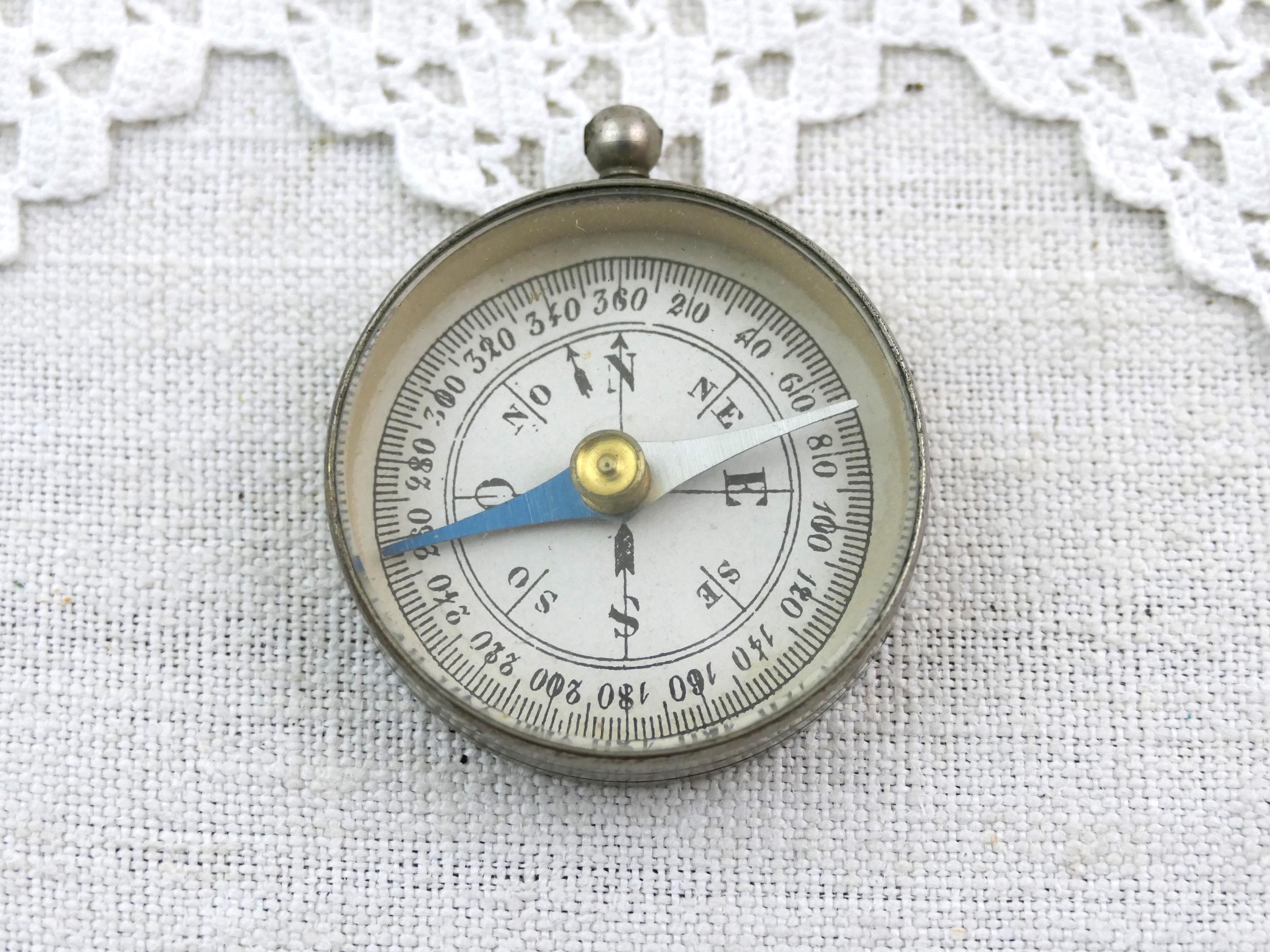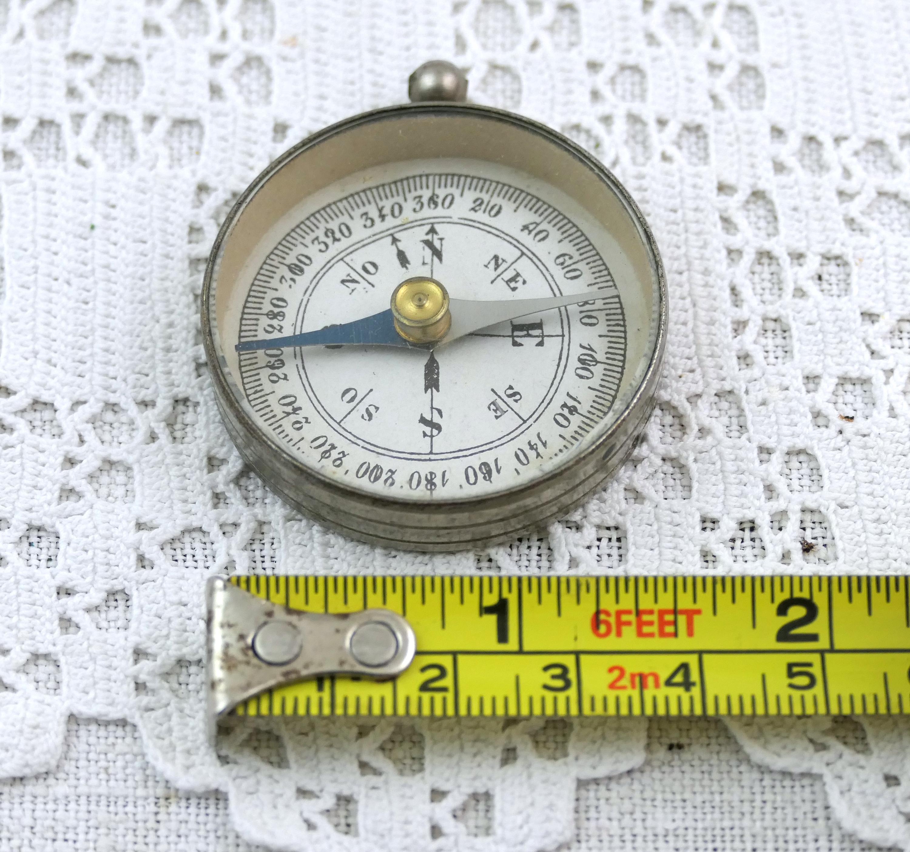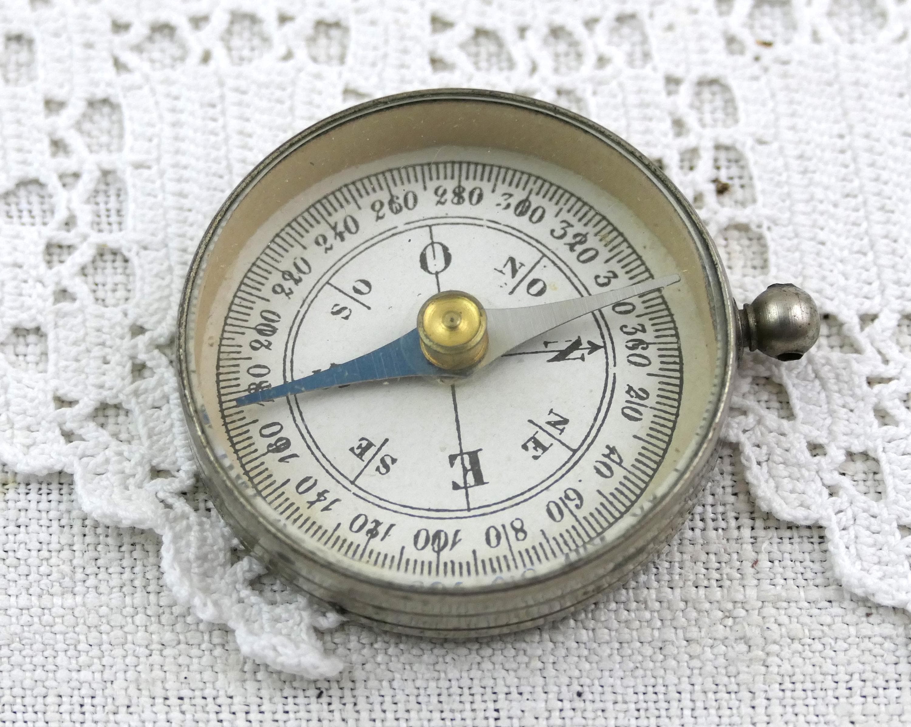 Antique round dry magnetic portable compass. Made of chrome plated metal with beveled glass. Original box Ca early 1900s.