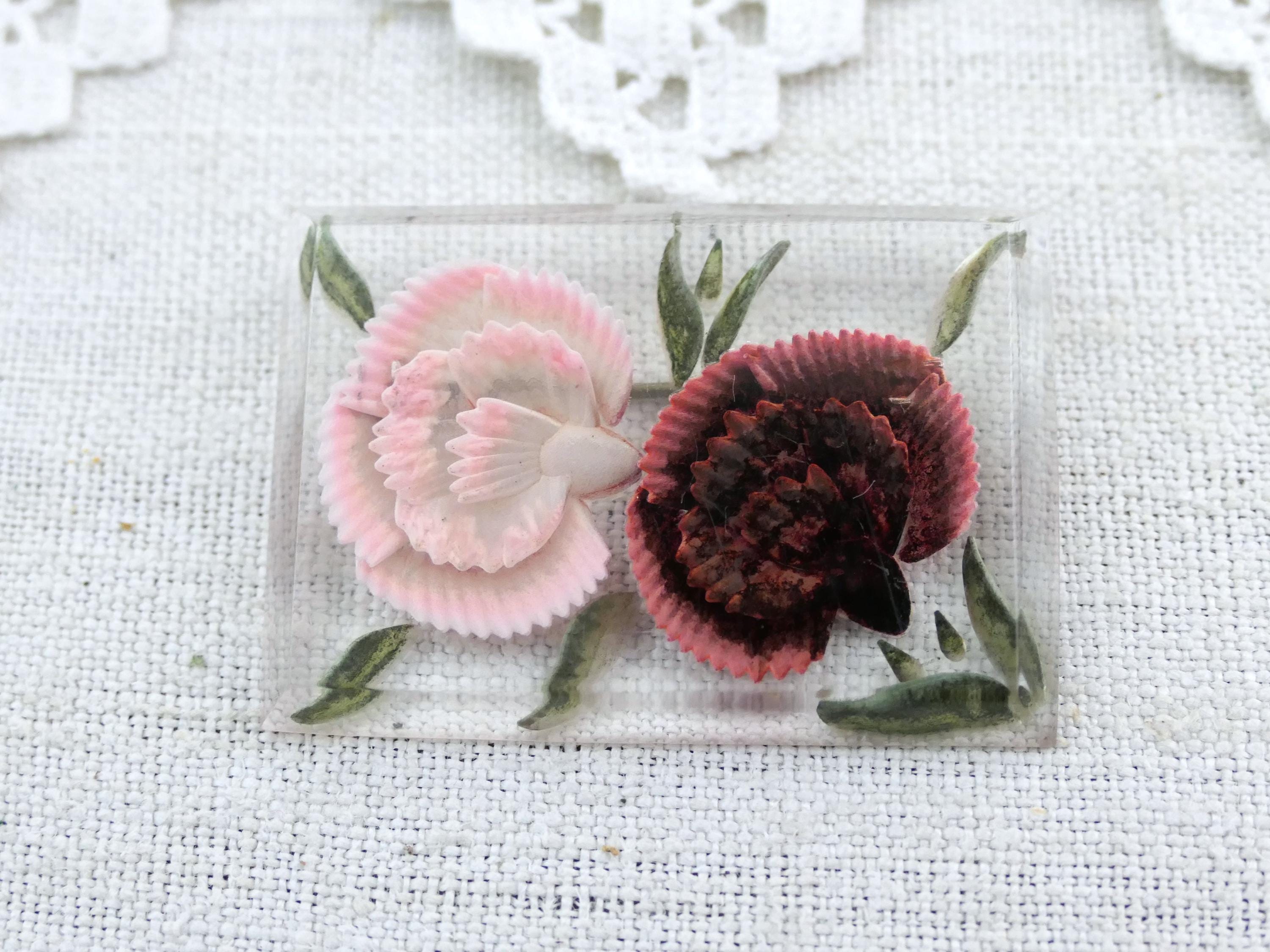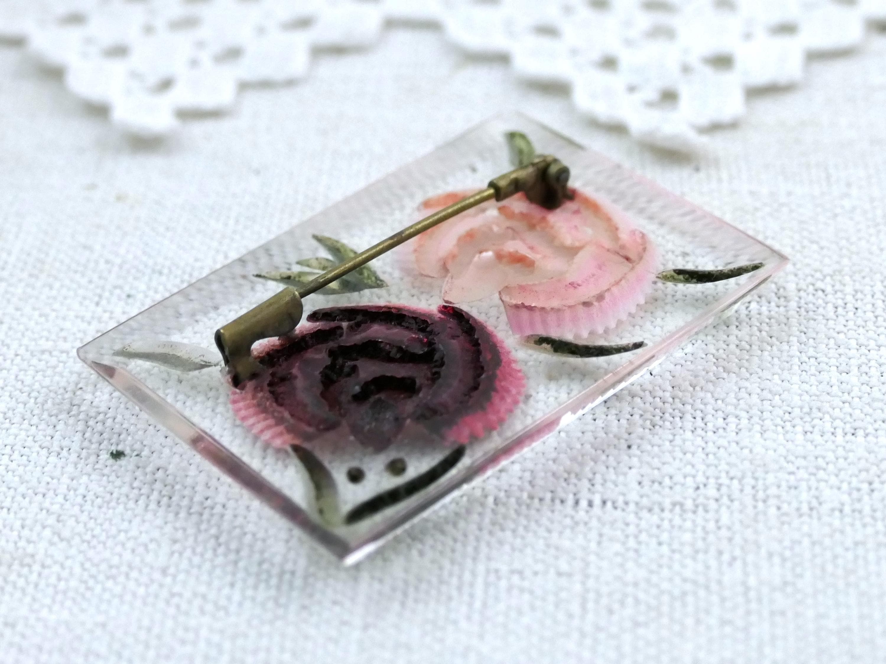 Vintage brooch with reverse carved rose pattern. Made of clear Lucite resin with the pattern carved from the back. Ca 1940s / 1950s.