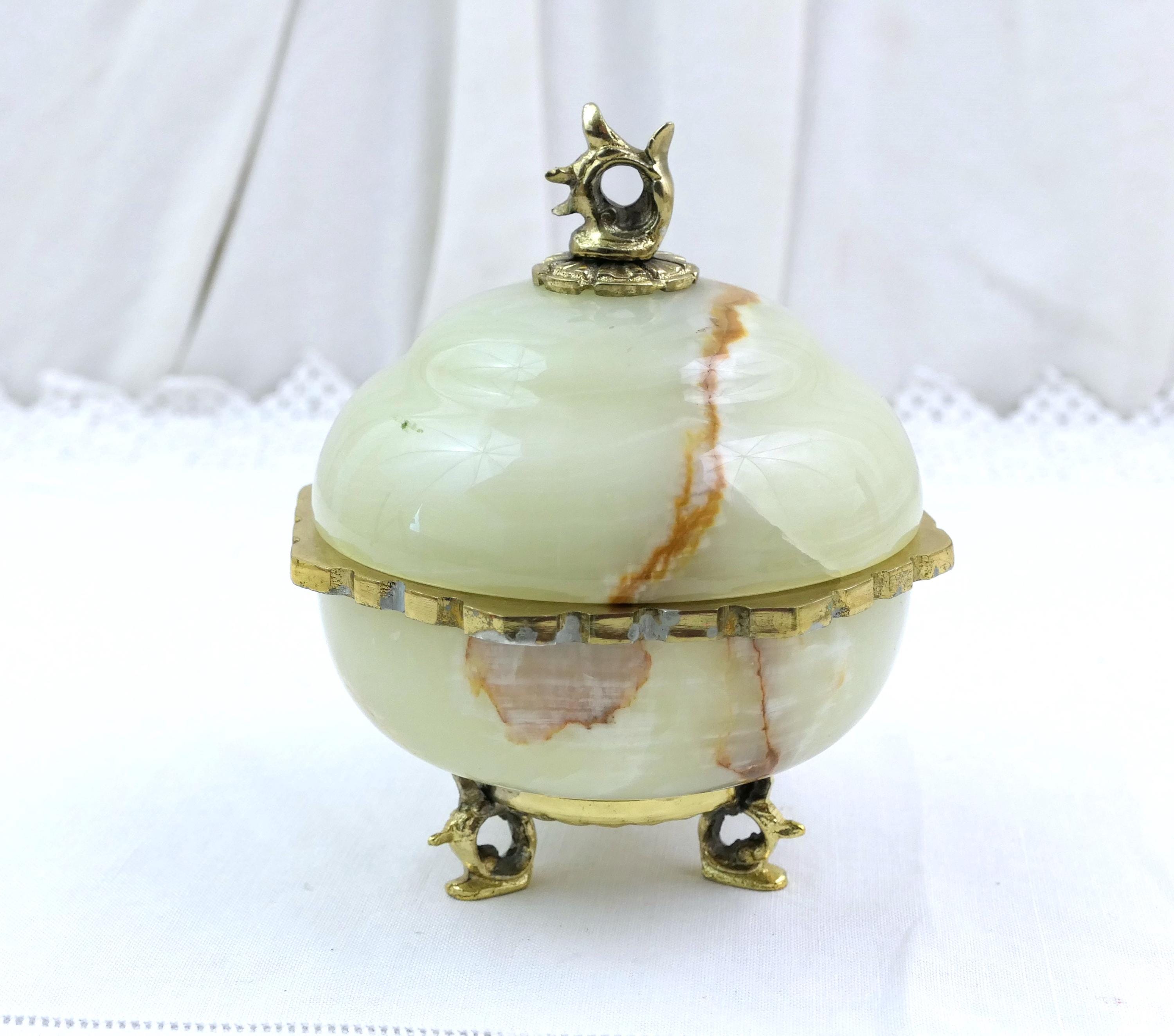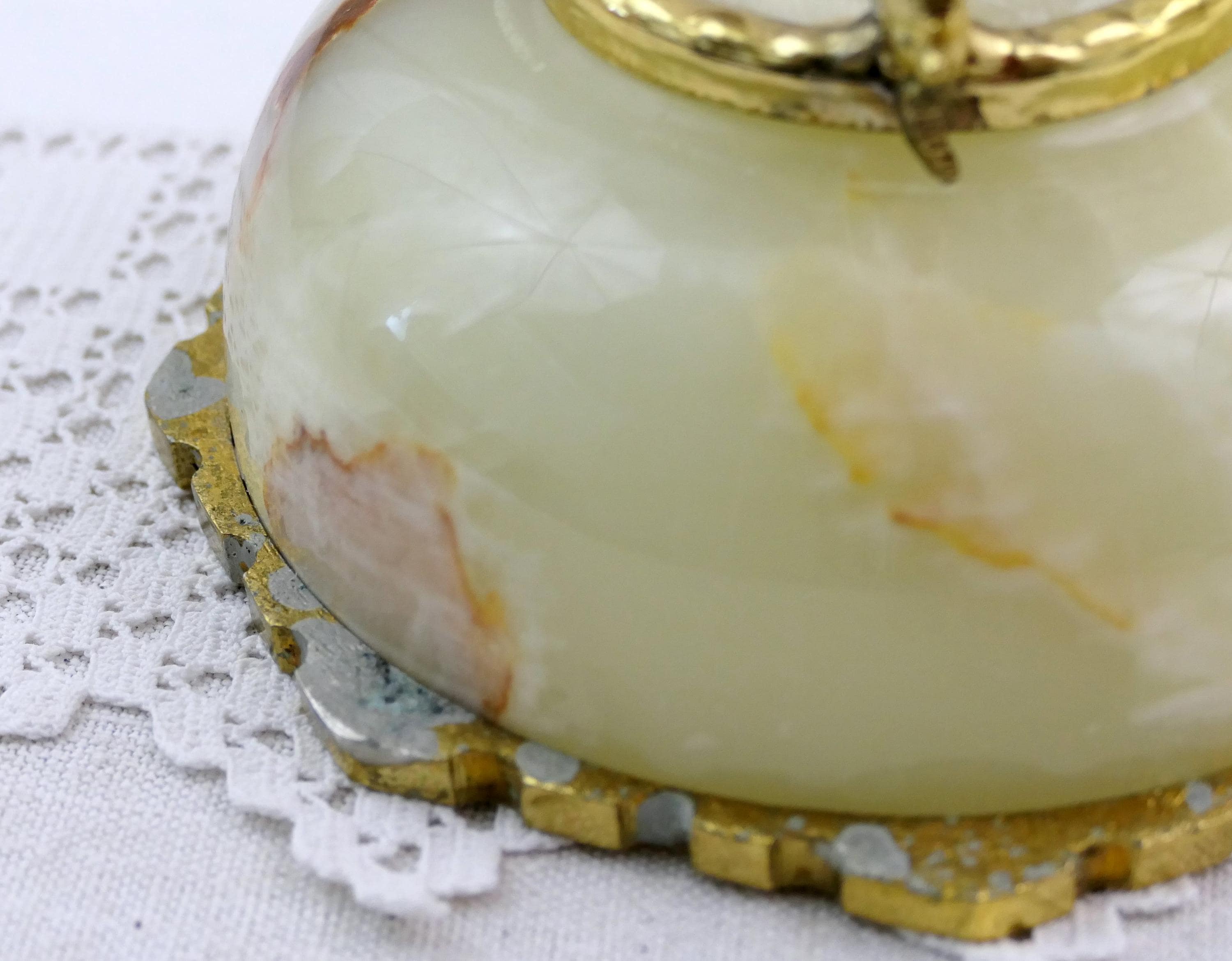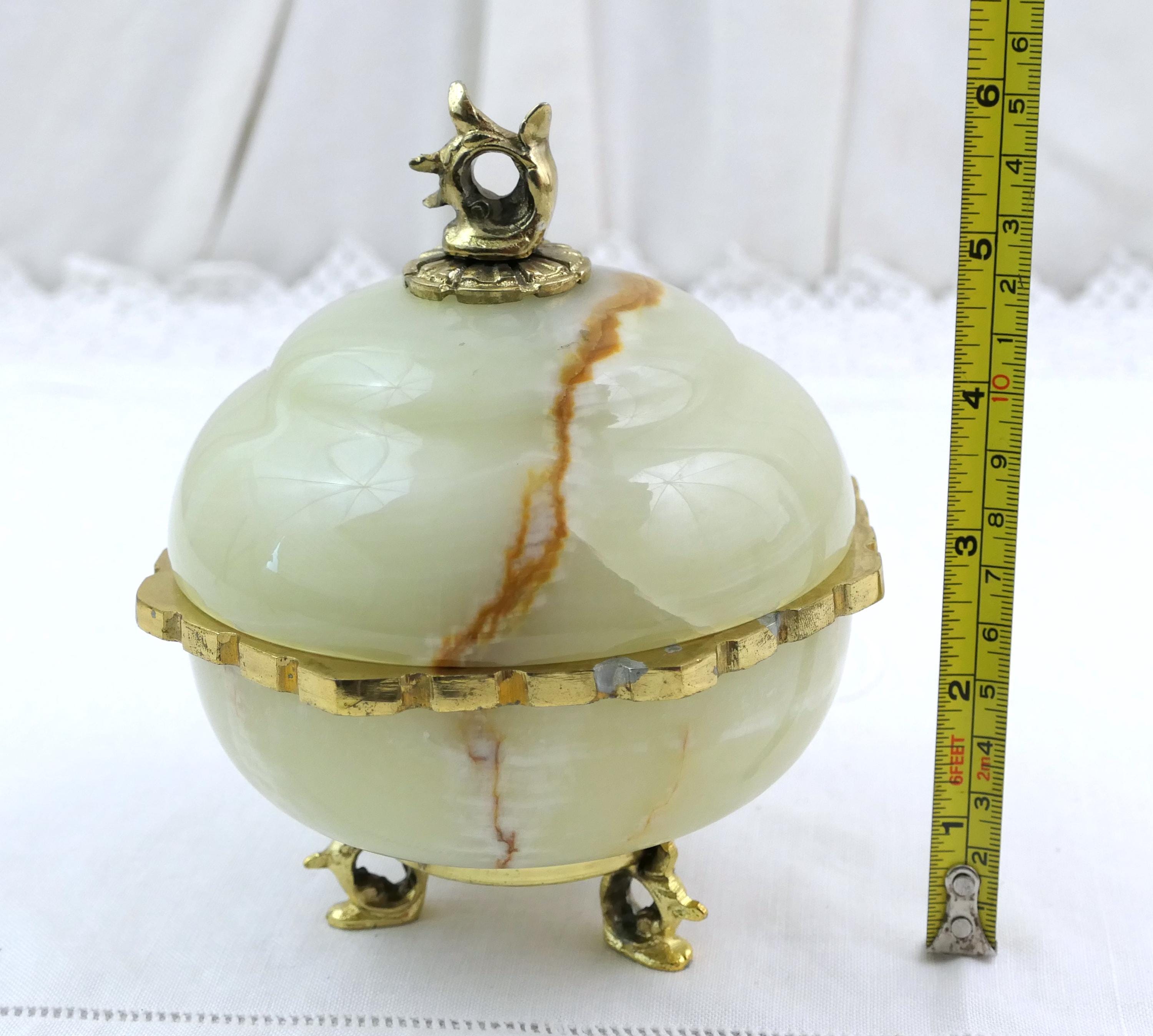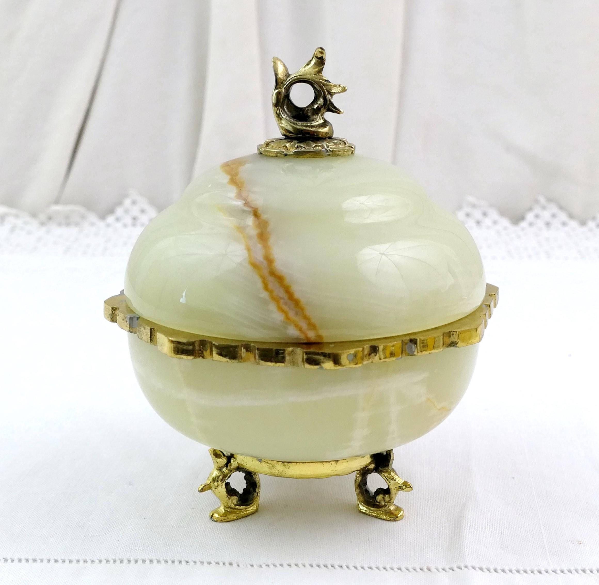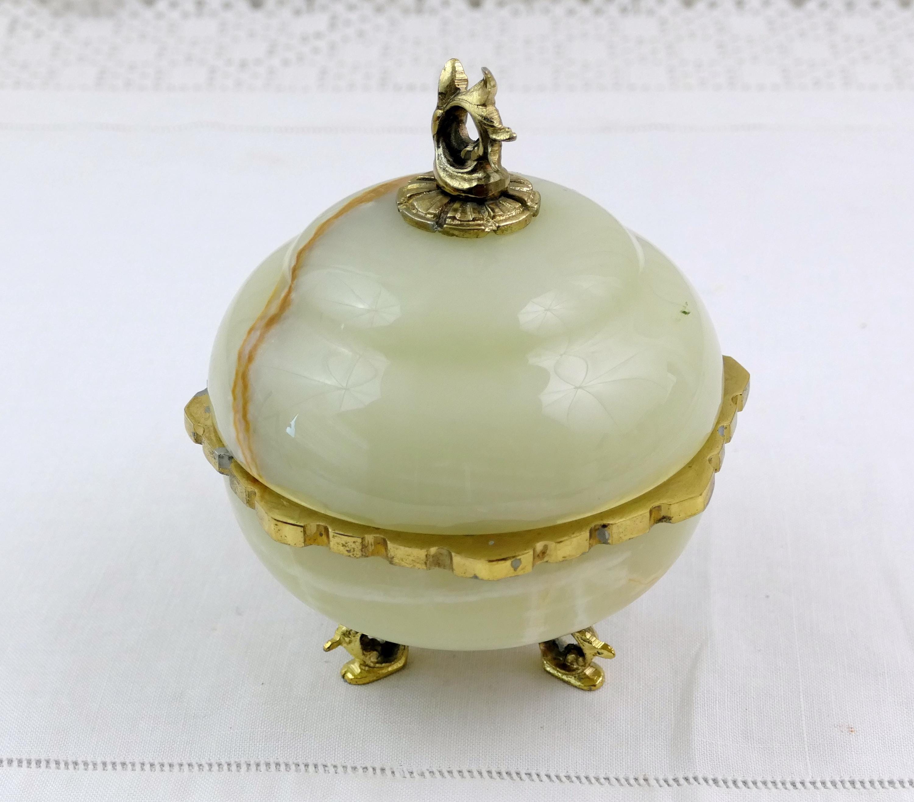 Vintage footed Italian carved polished stone trinket box. Made of onyx stone with gold tone metal. Ca mid 1900s.
