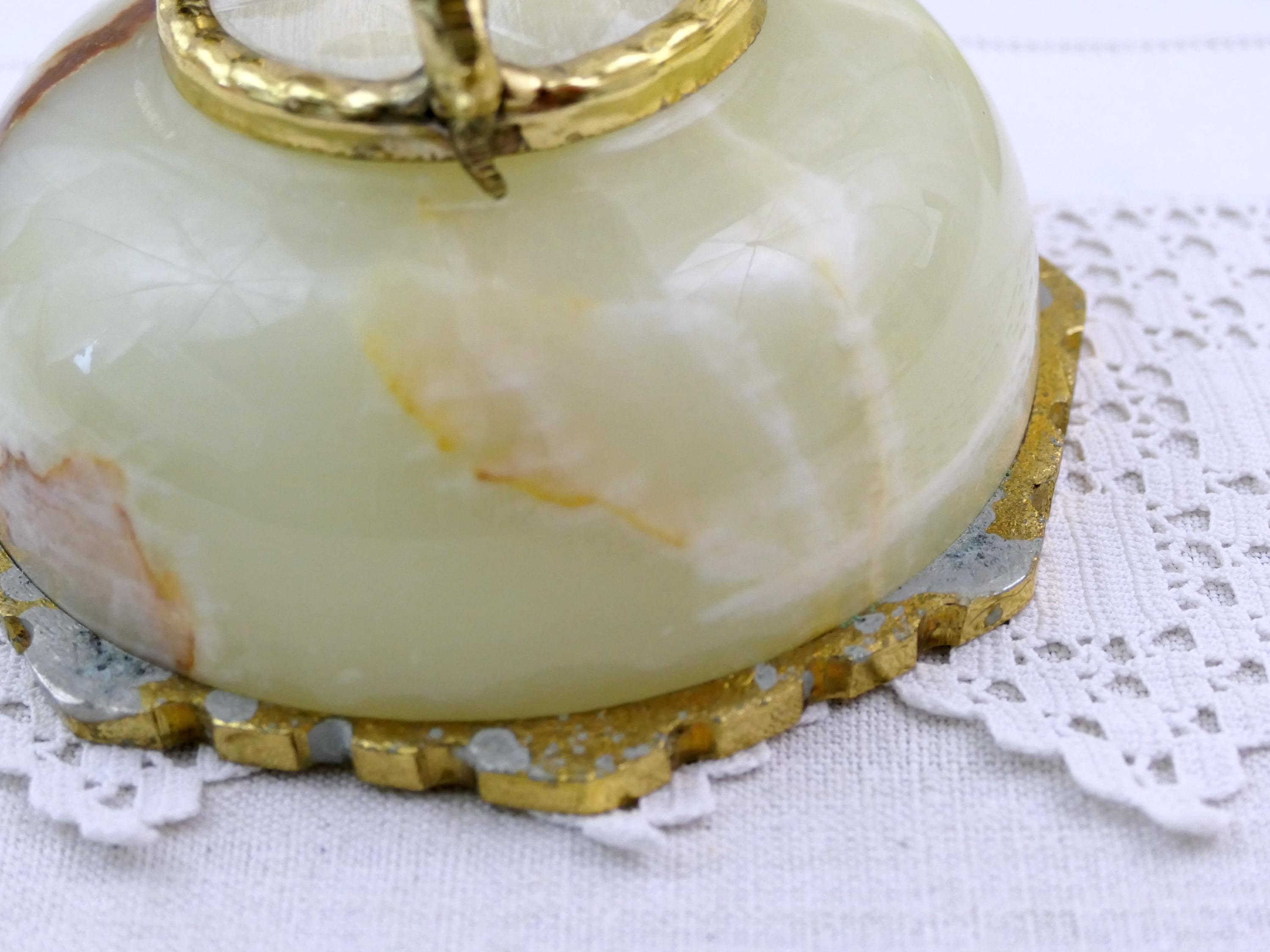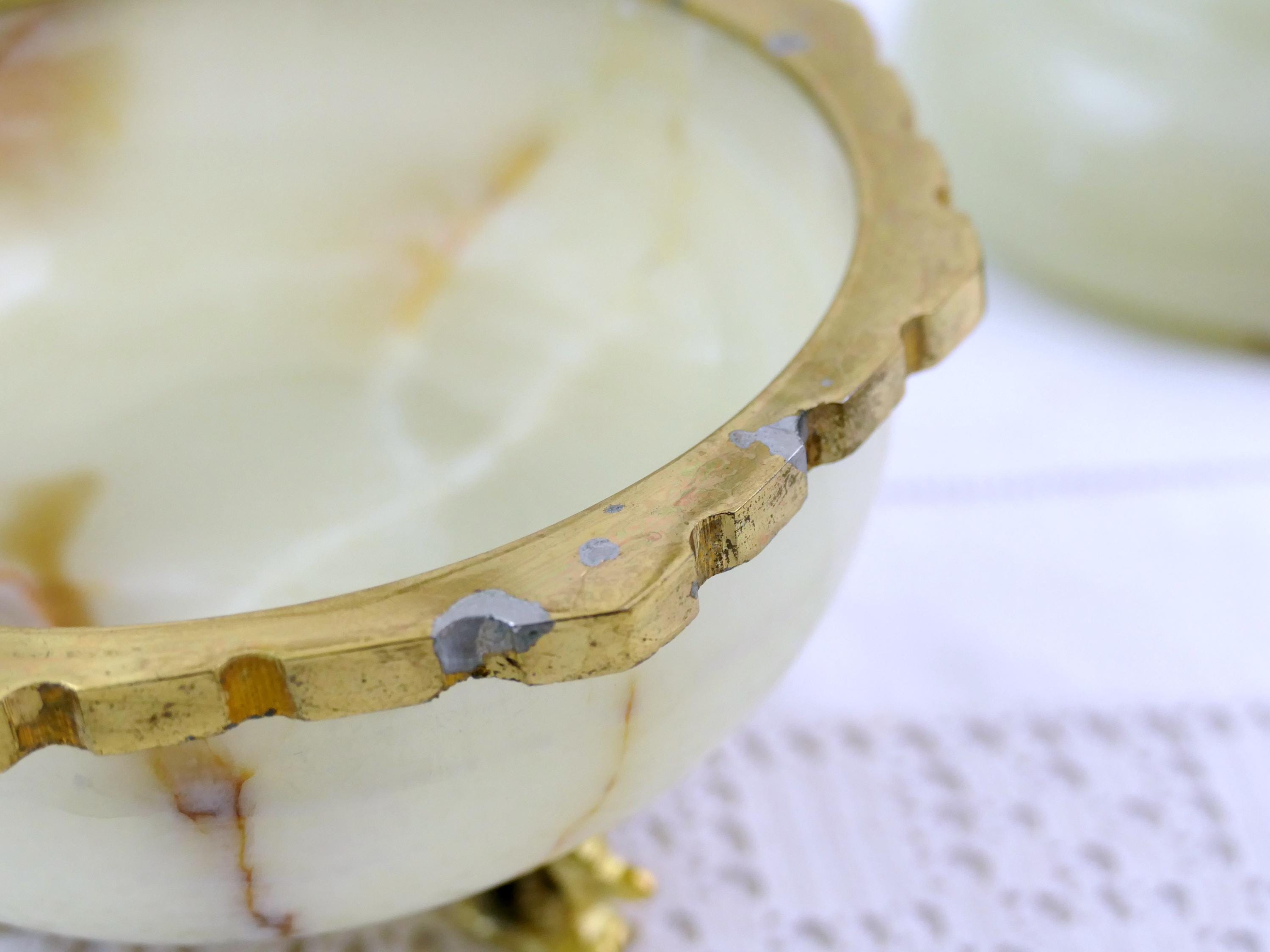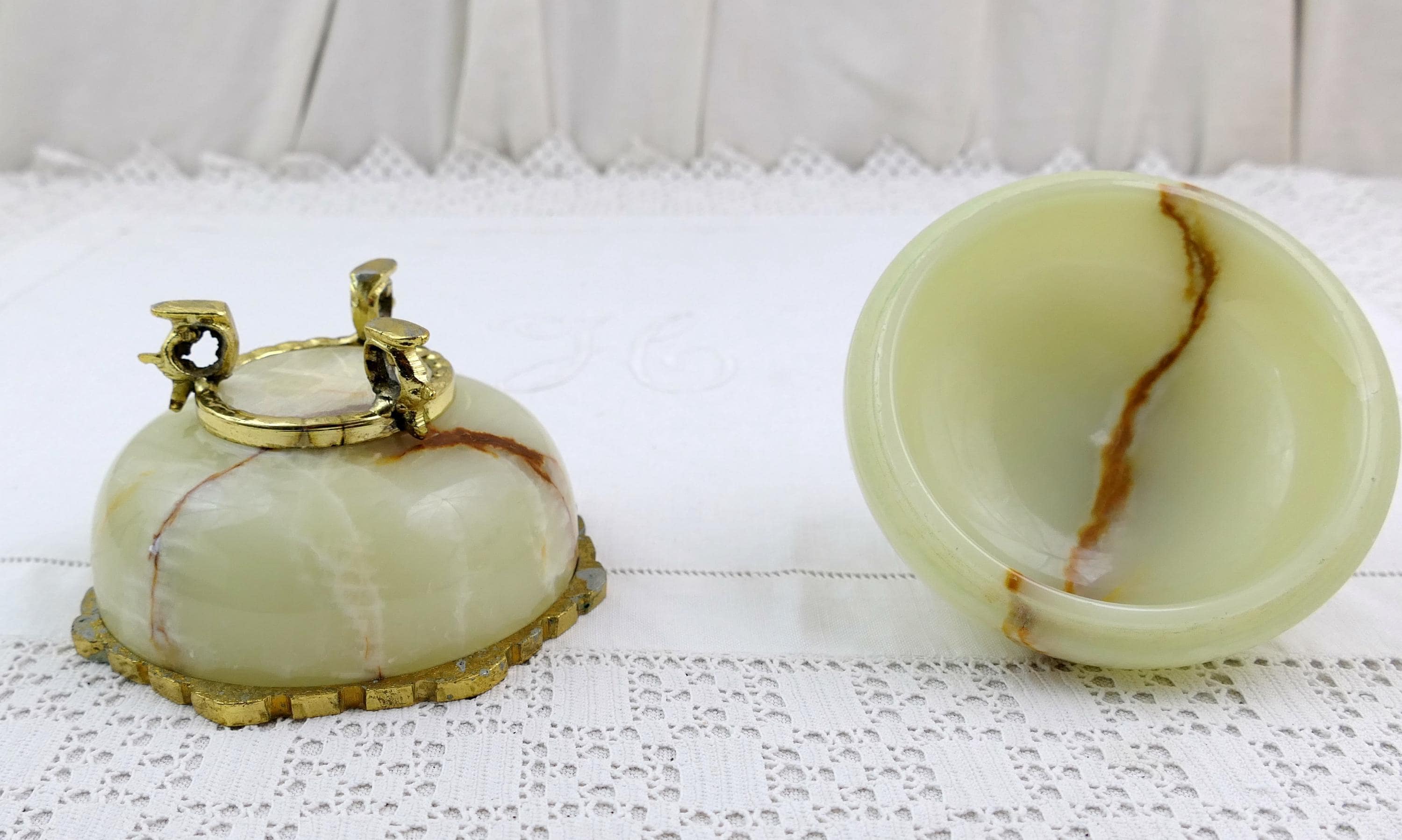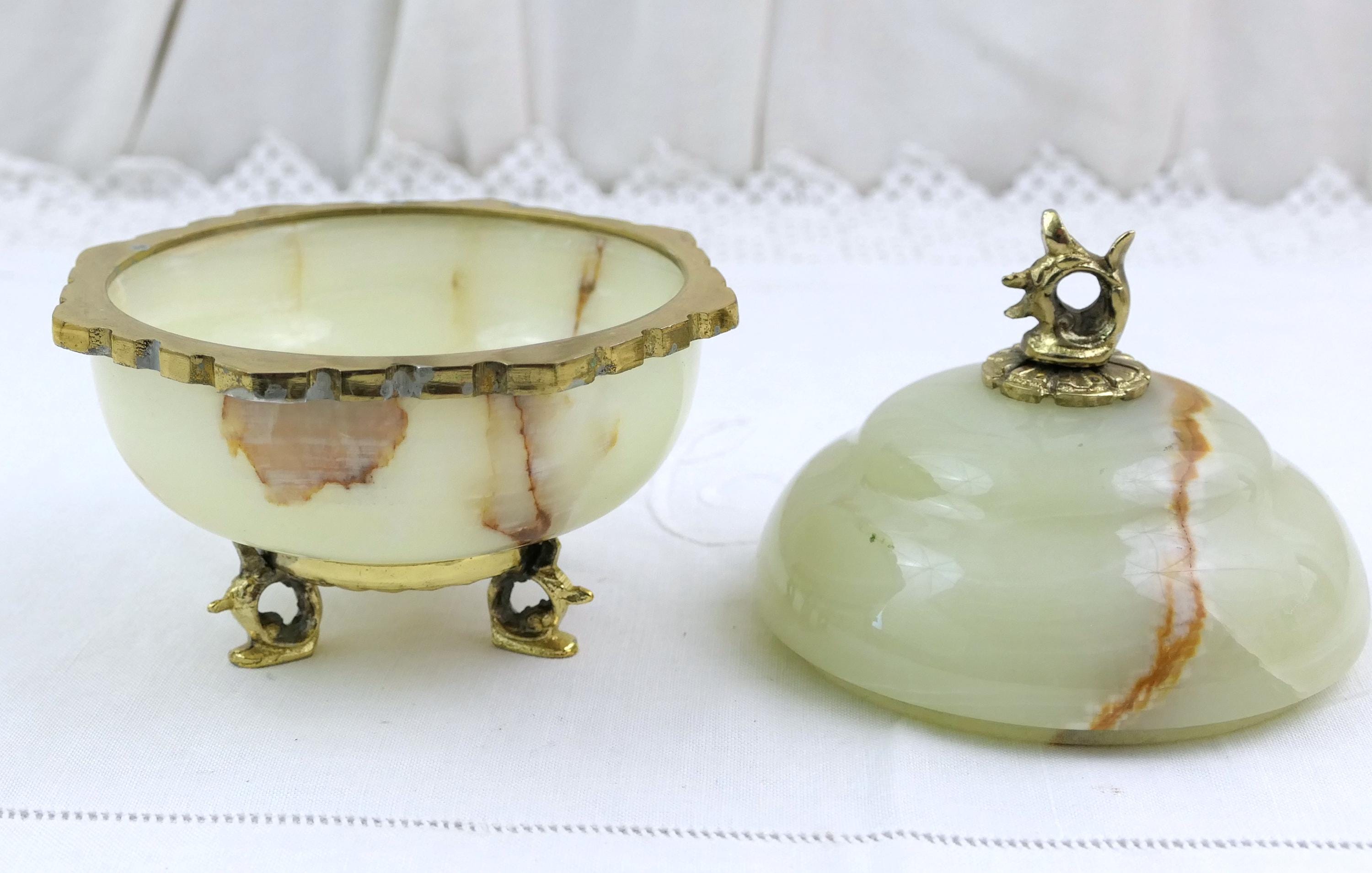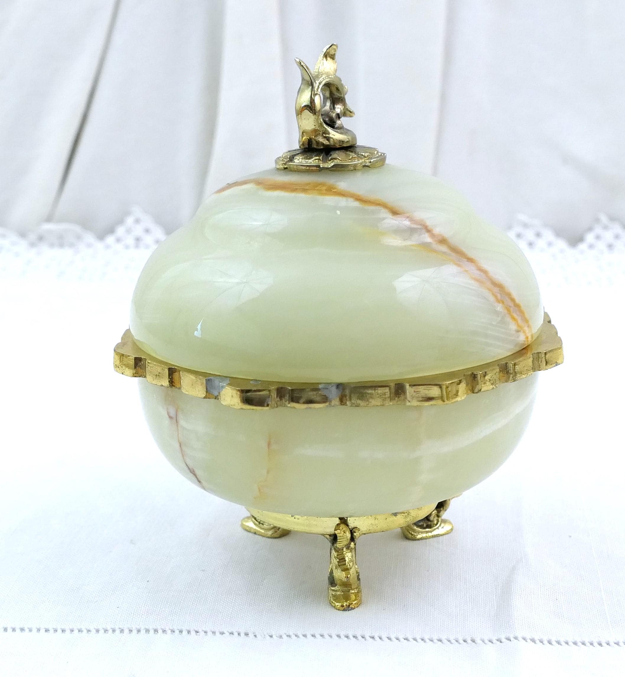 Vintage footed Italian carved polished stone trinket box. Made of onyx stone with gold tone metal. Ca mid 1900s.