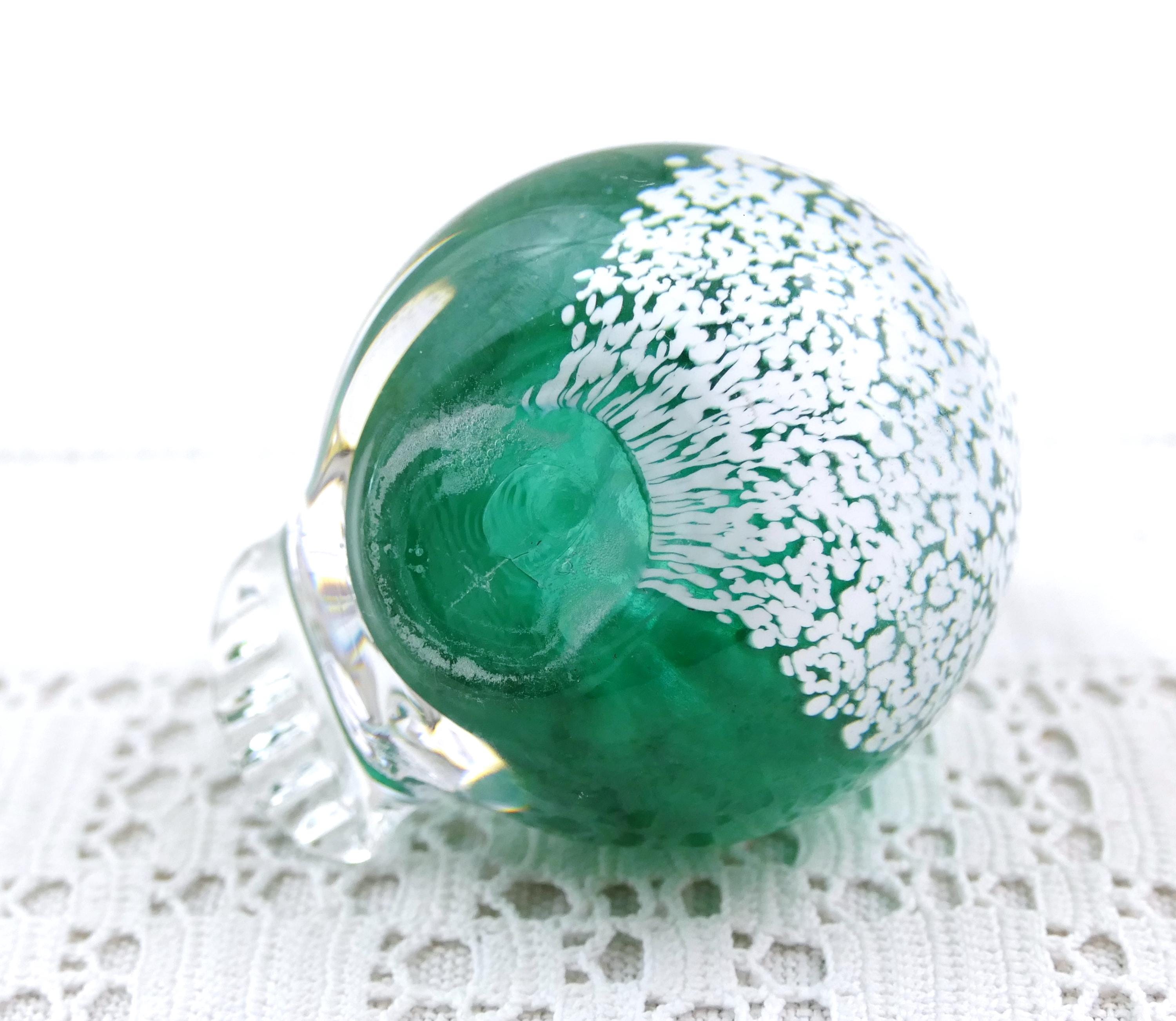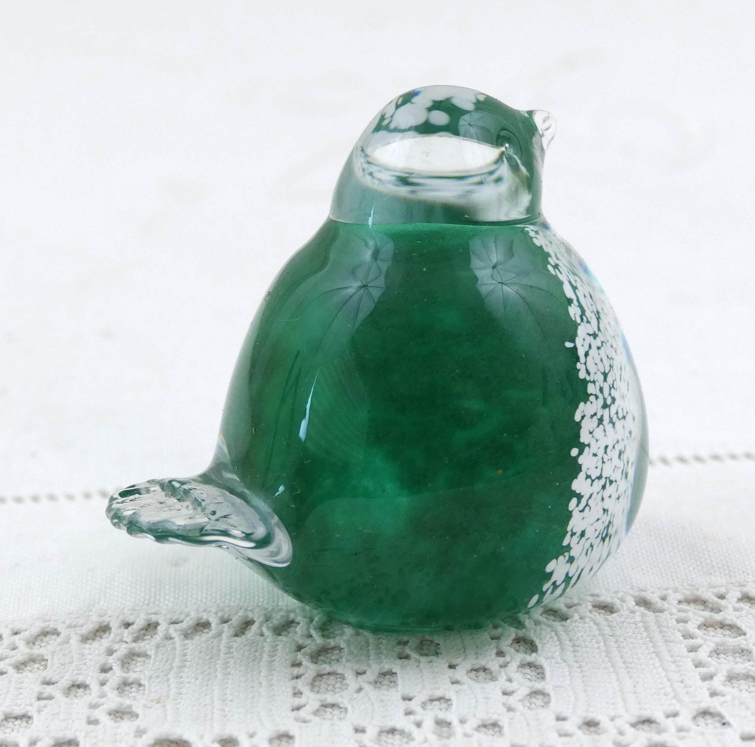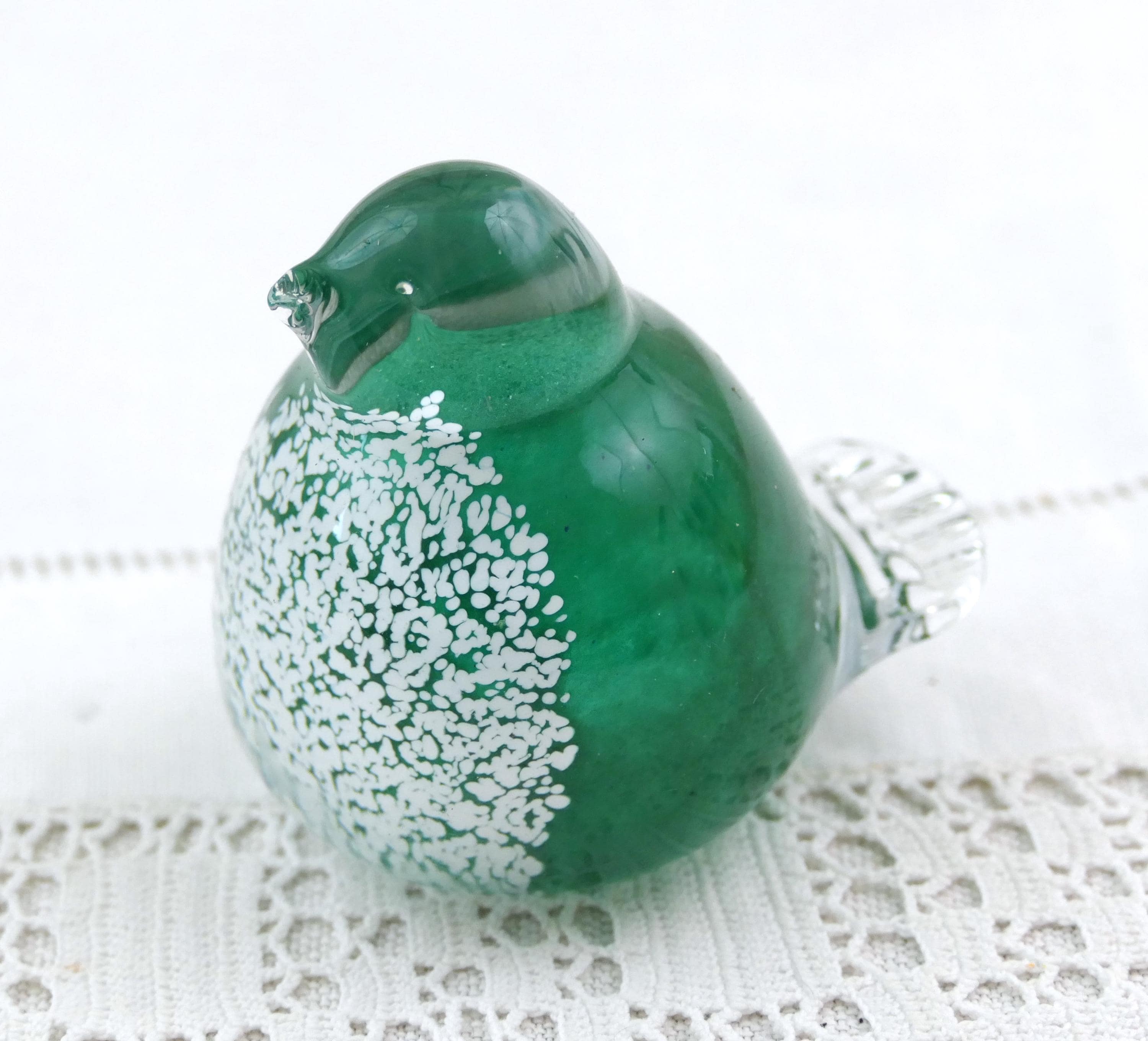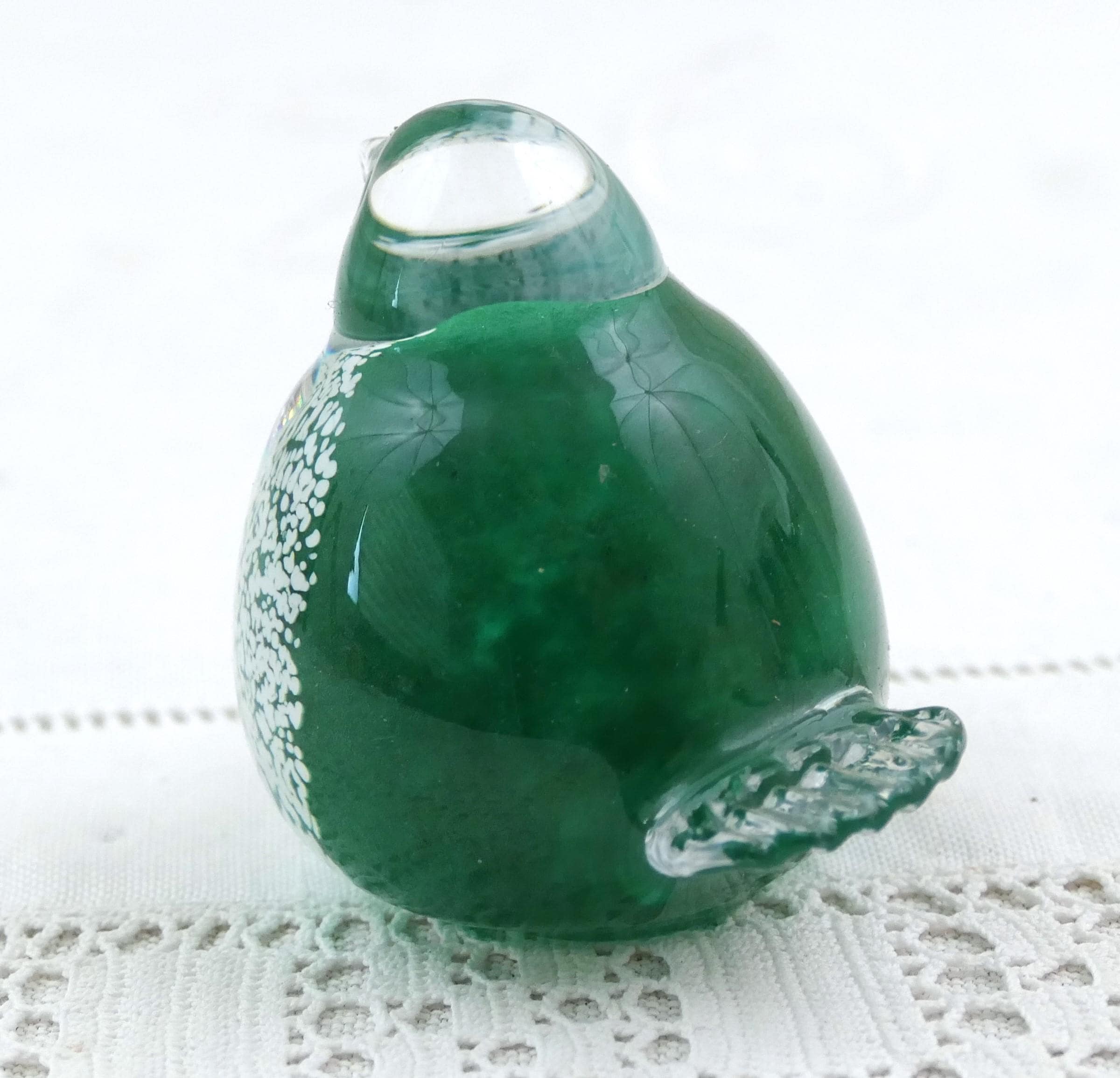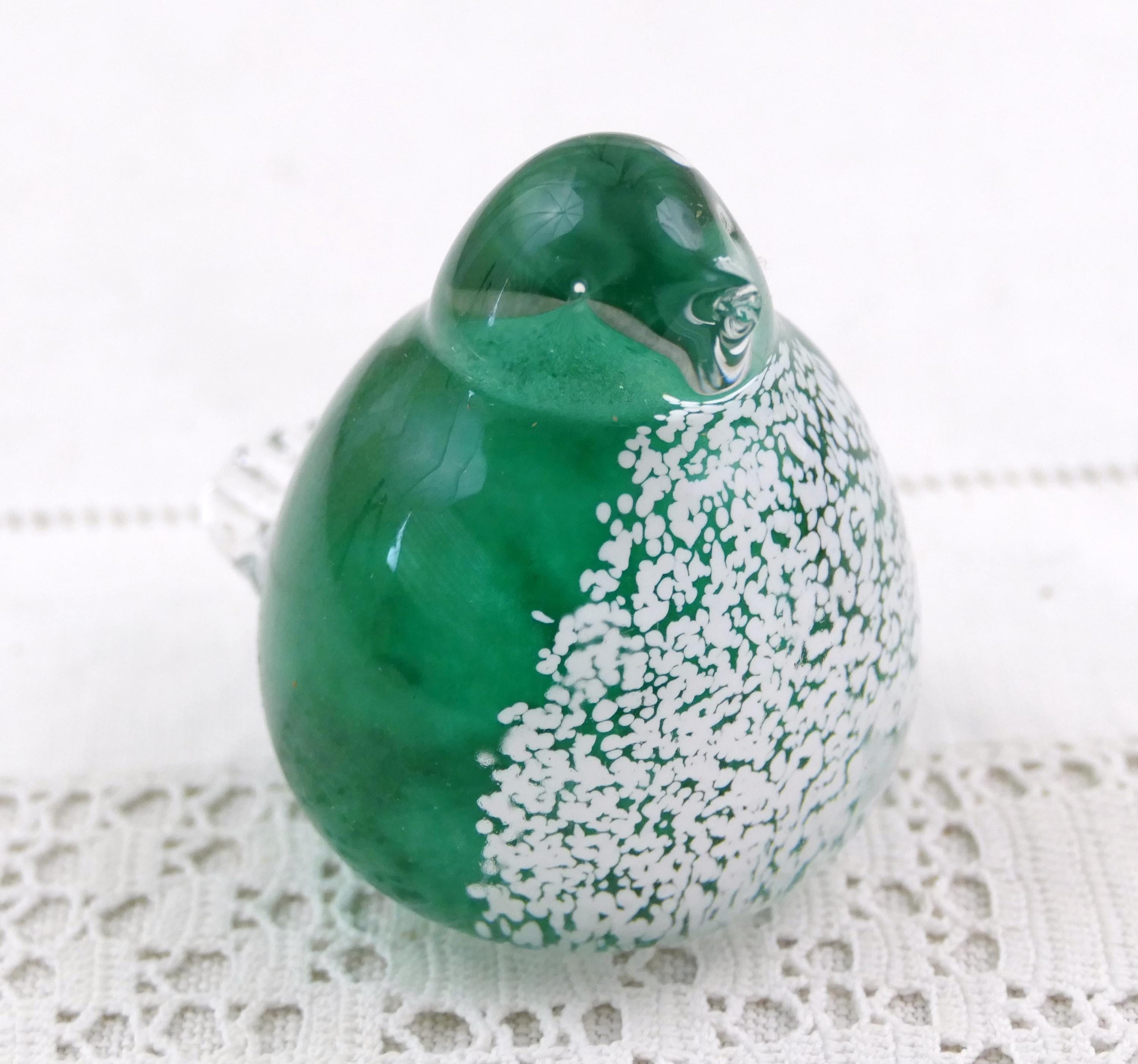 Vintage handmade green and white bird figurine. Made of green glass in the Murano style. Ca late 1900s.