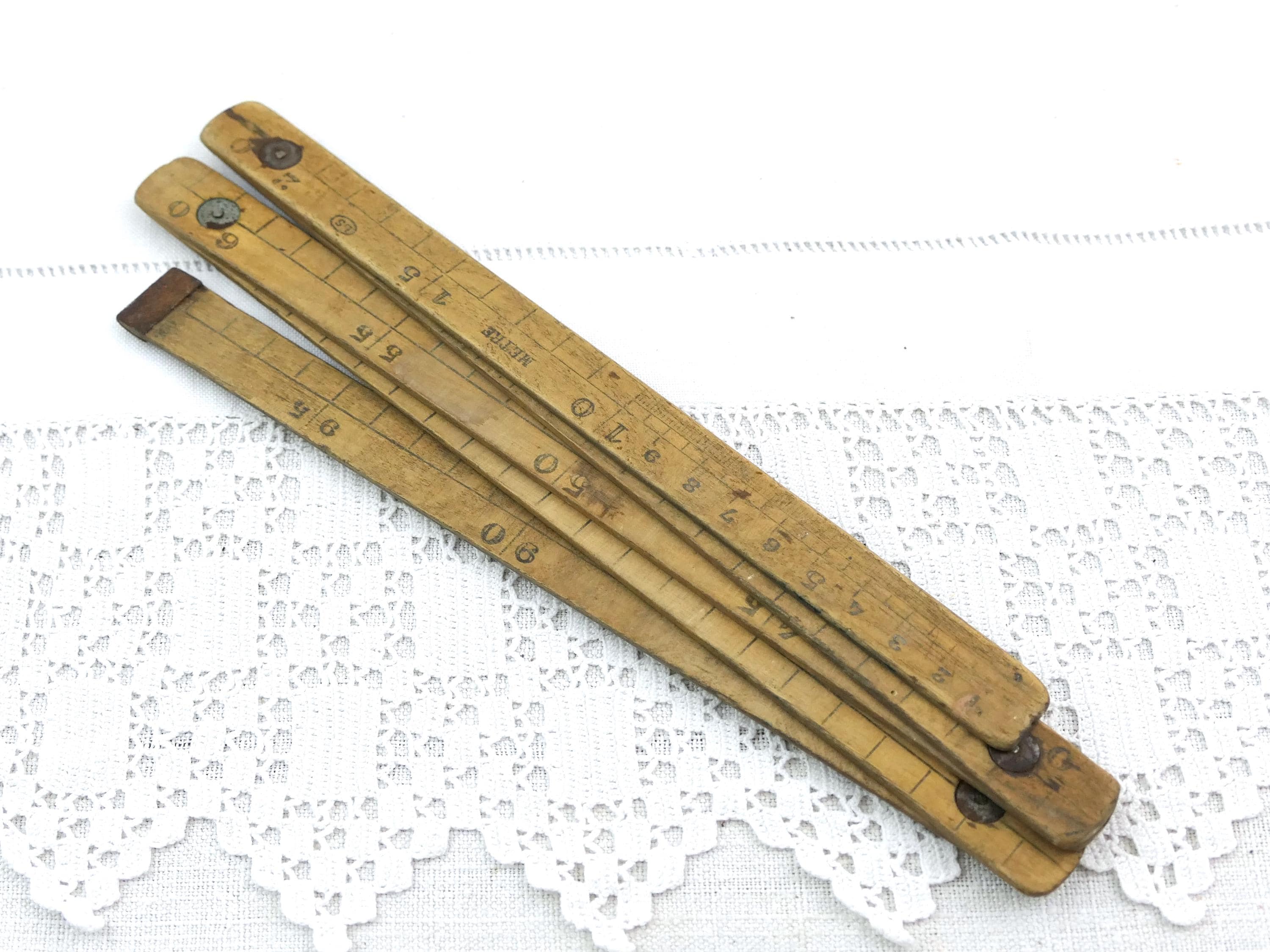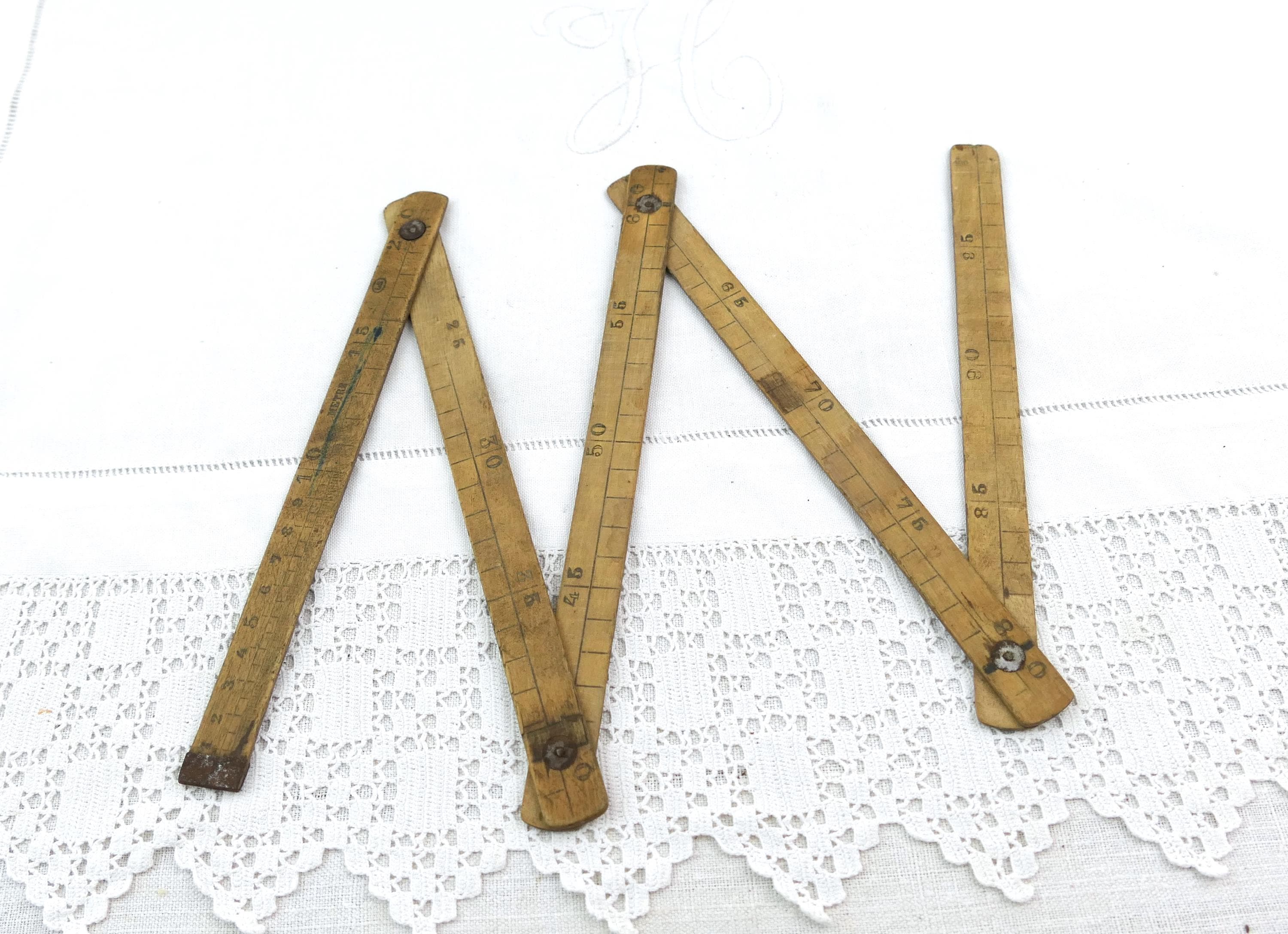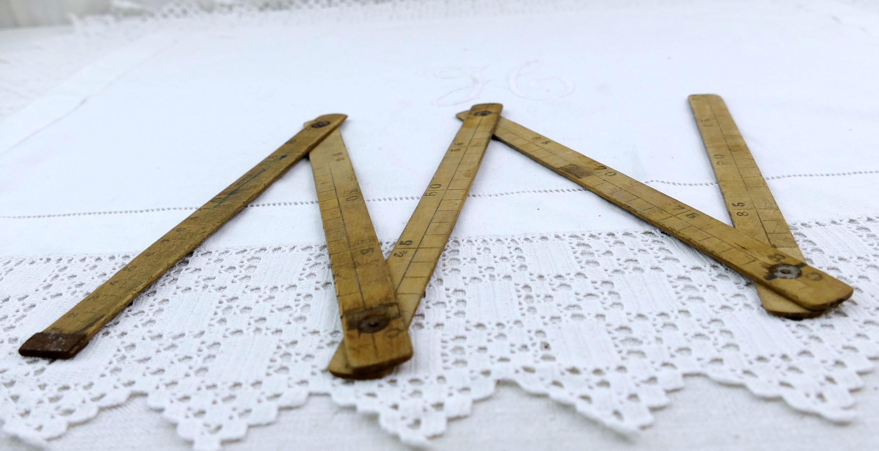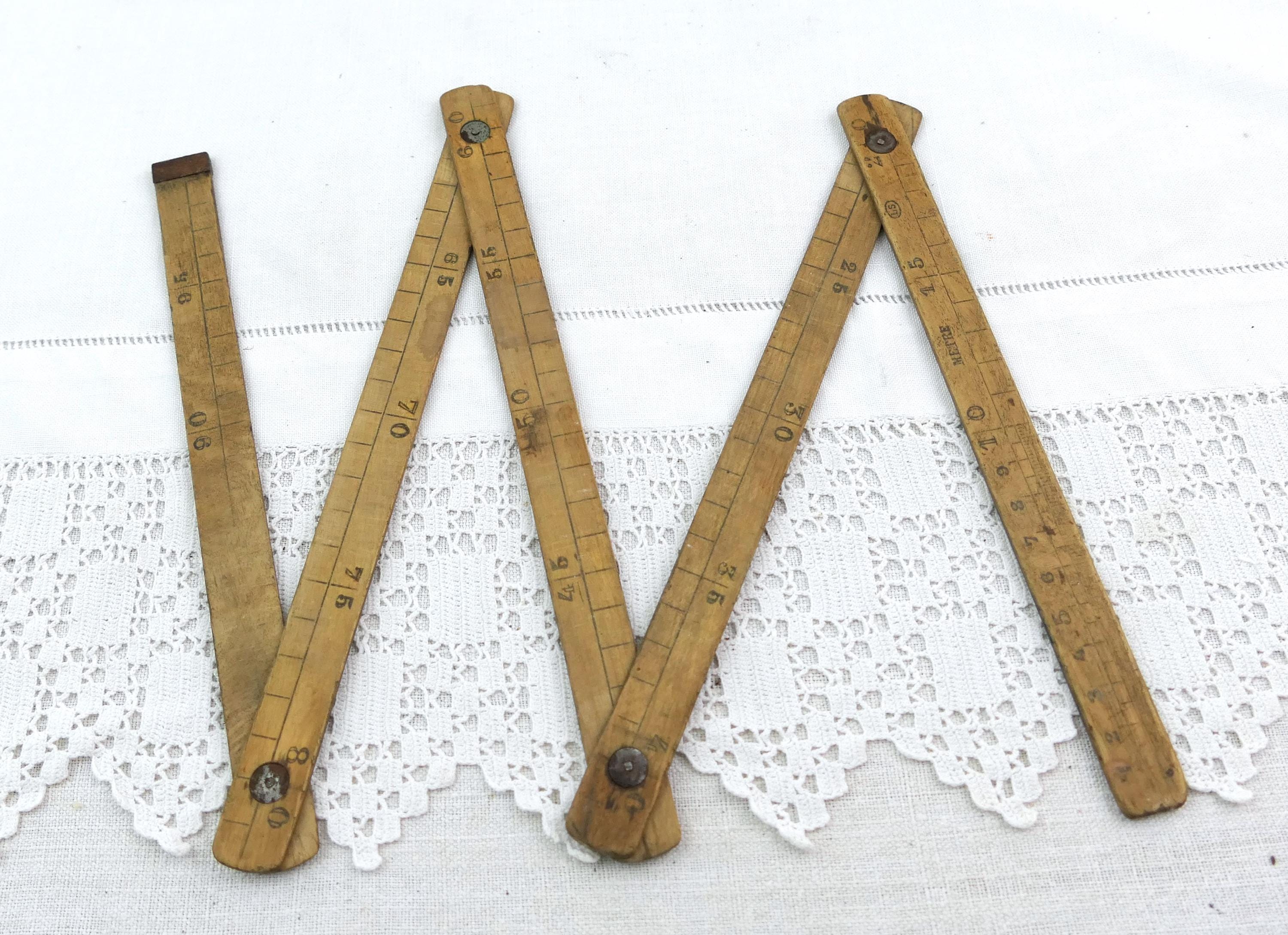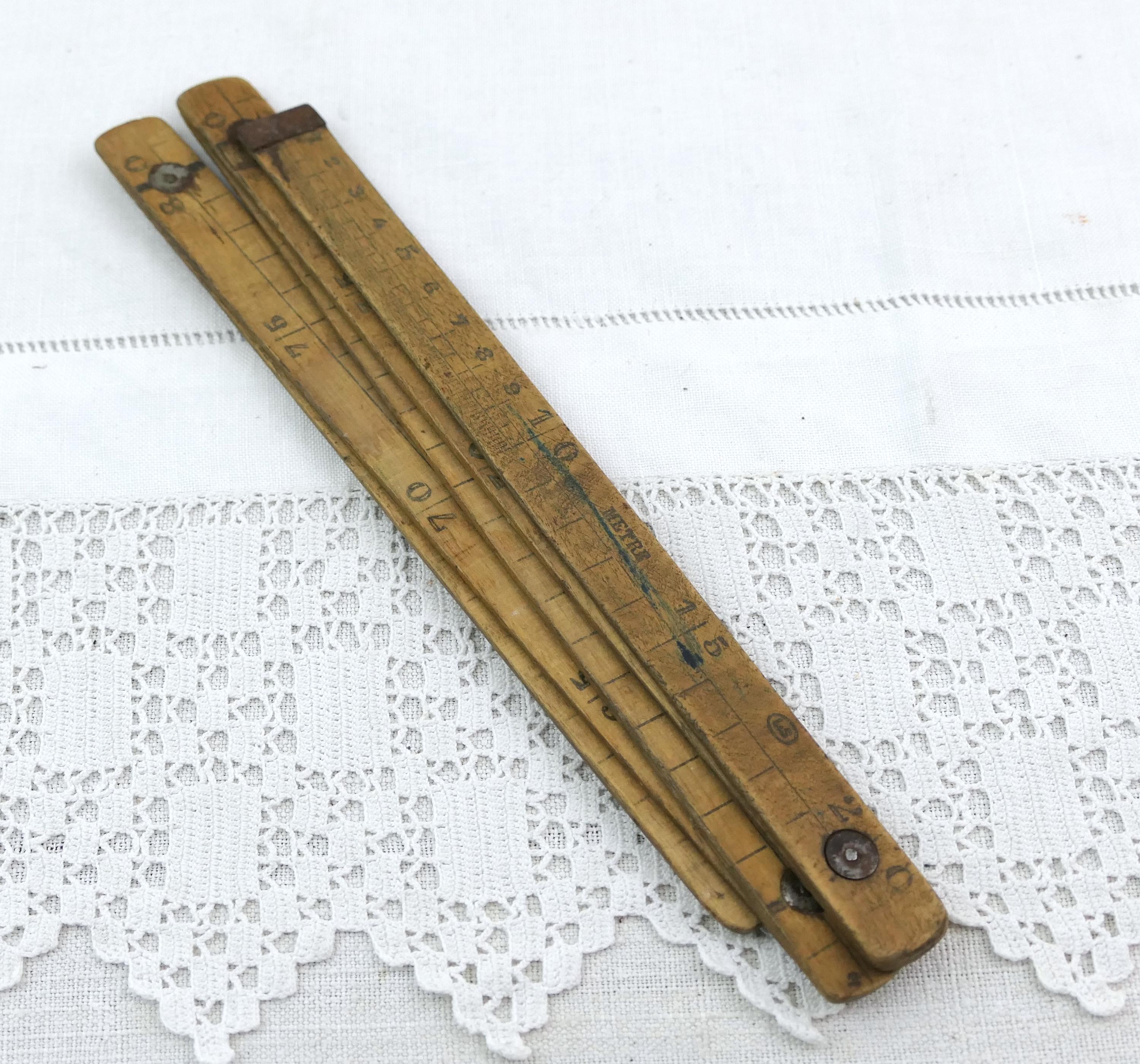 Antique French folding pocket treen measuring tape. Made of wood with worn patina. 1 meter long by 10 cm sections. Ca 1800s _ mid 1900s.