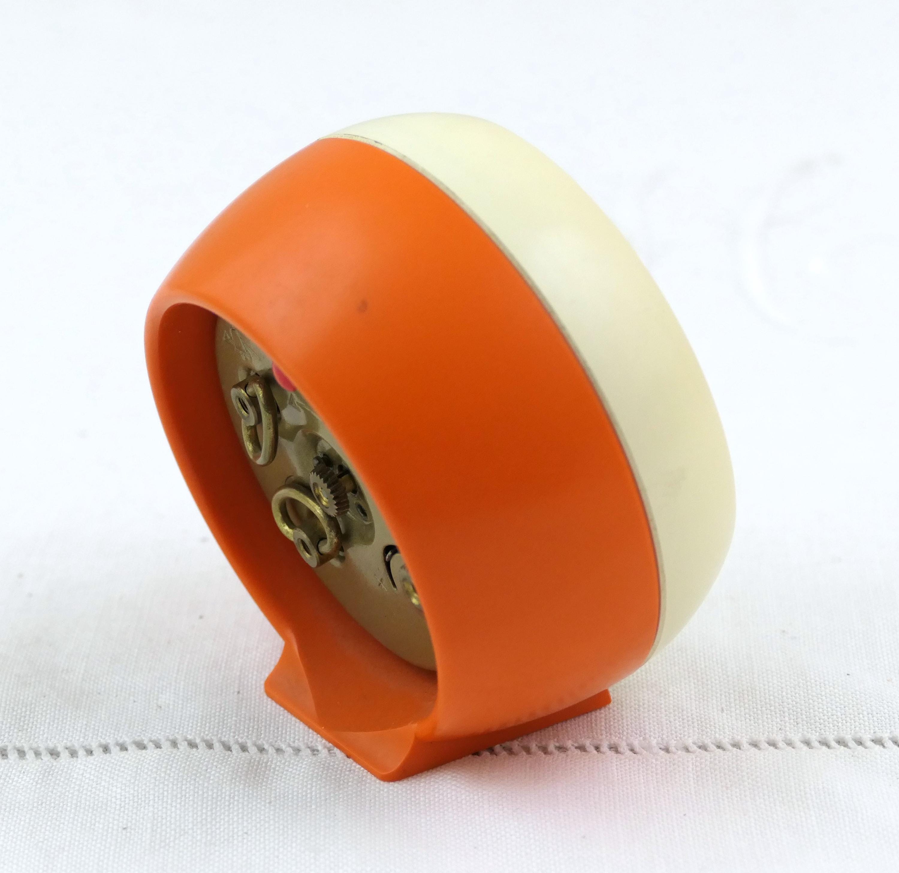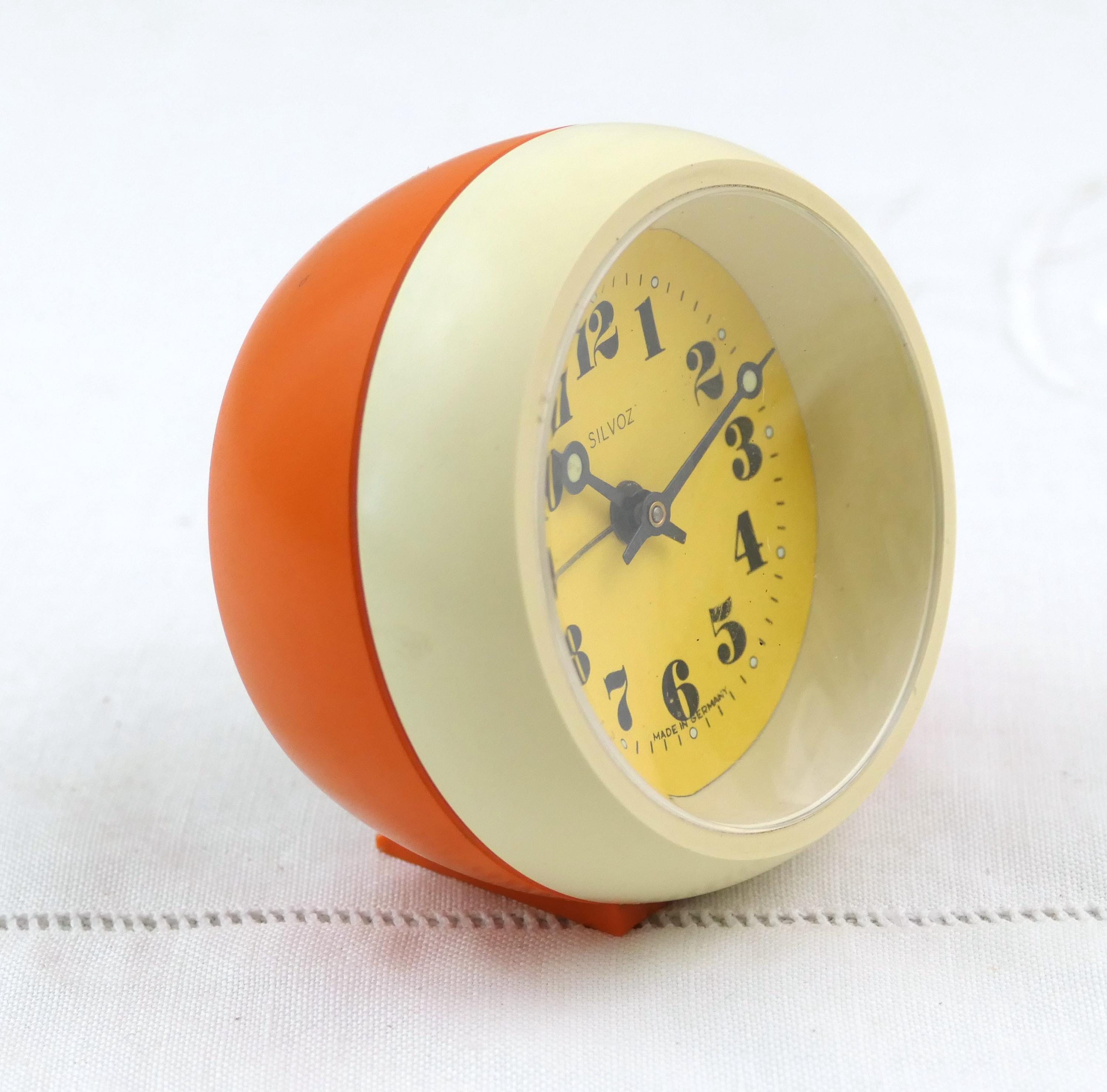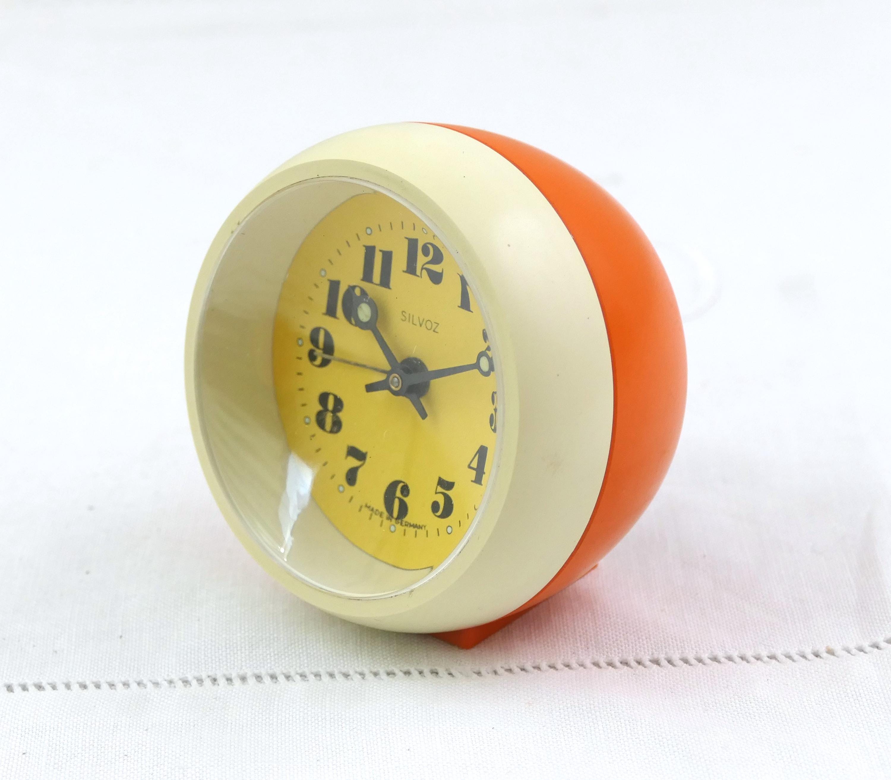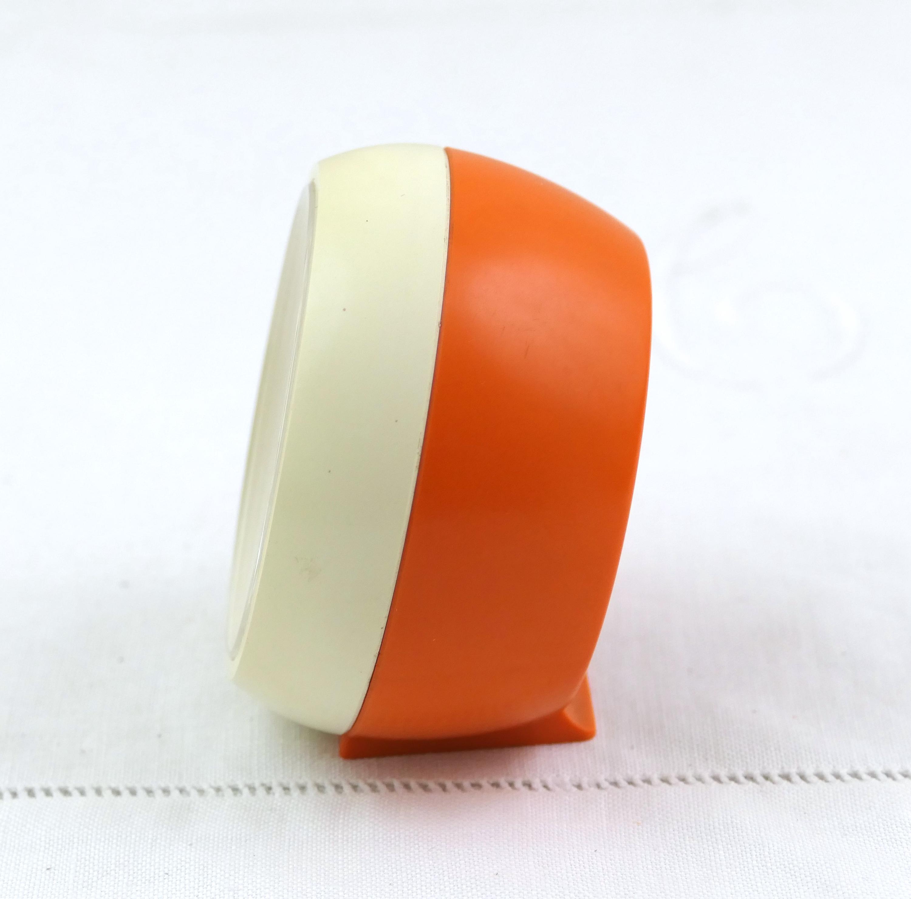 Small vintage orange and off white mechanical alarm clock. Made in Germany by Silvoz of orange plastic. Clock and alarm are in working condition, faint ticking, needs winding every 24 hours. Ca 1960s / 1970s.