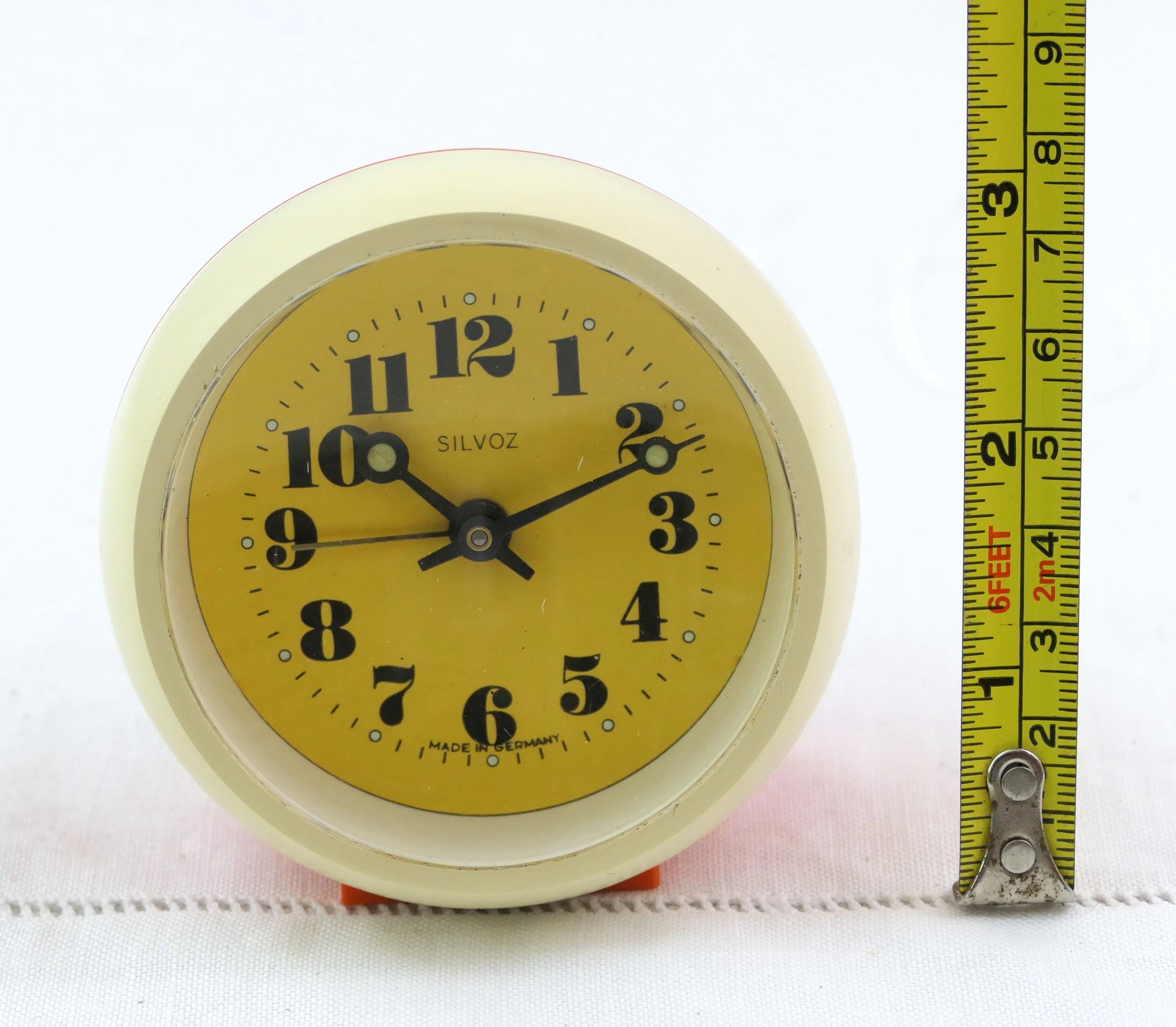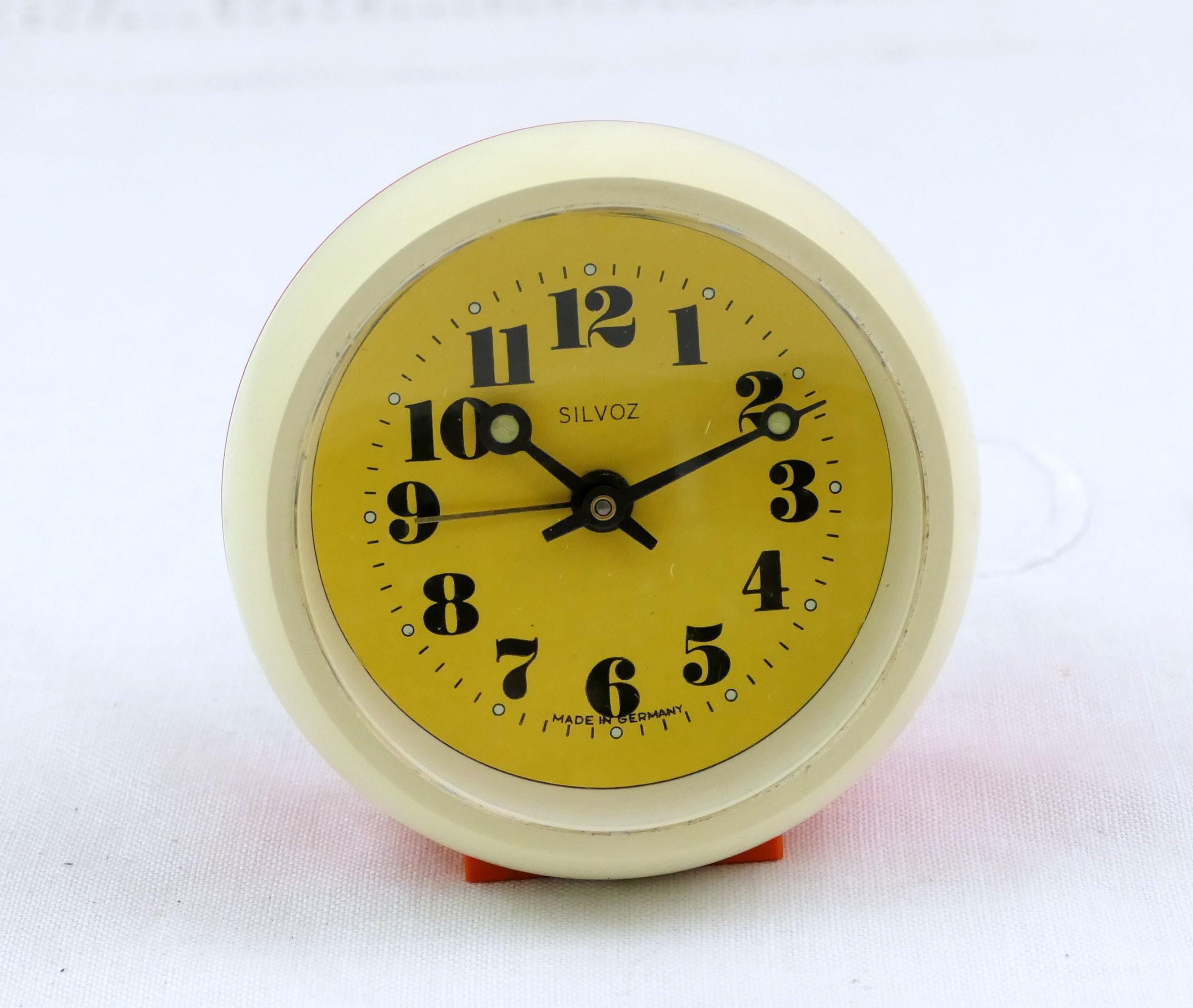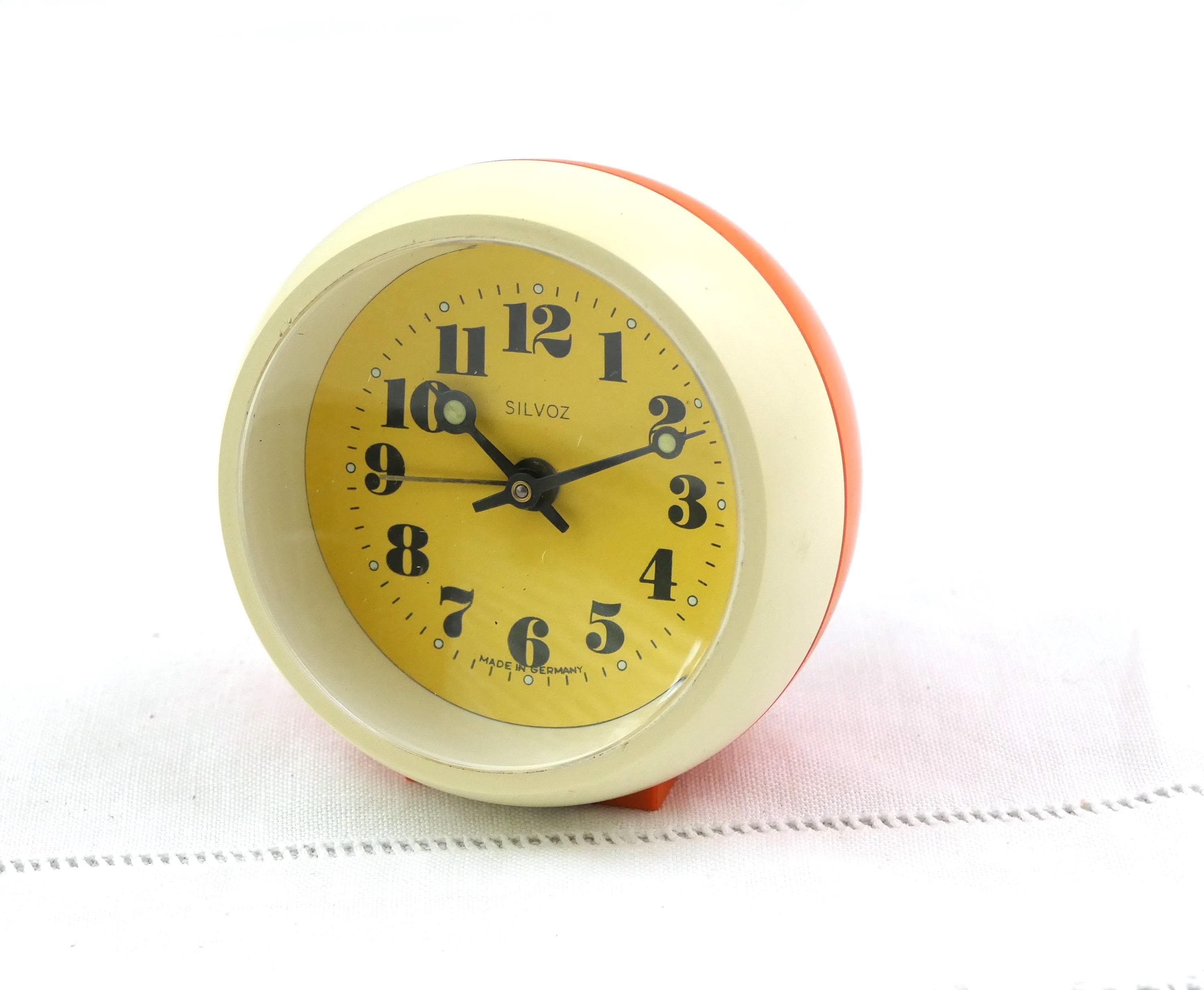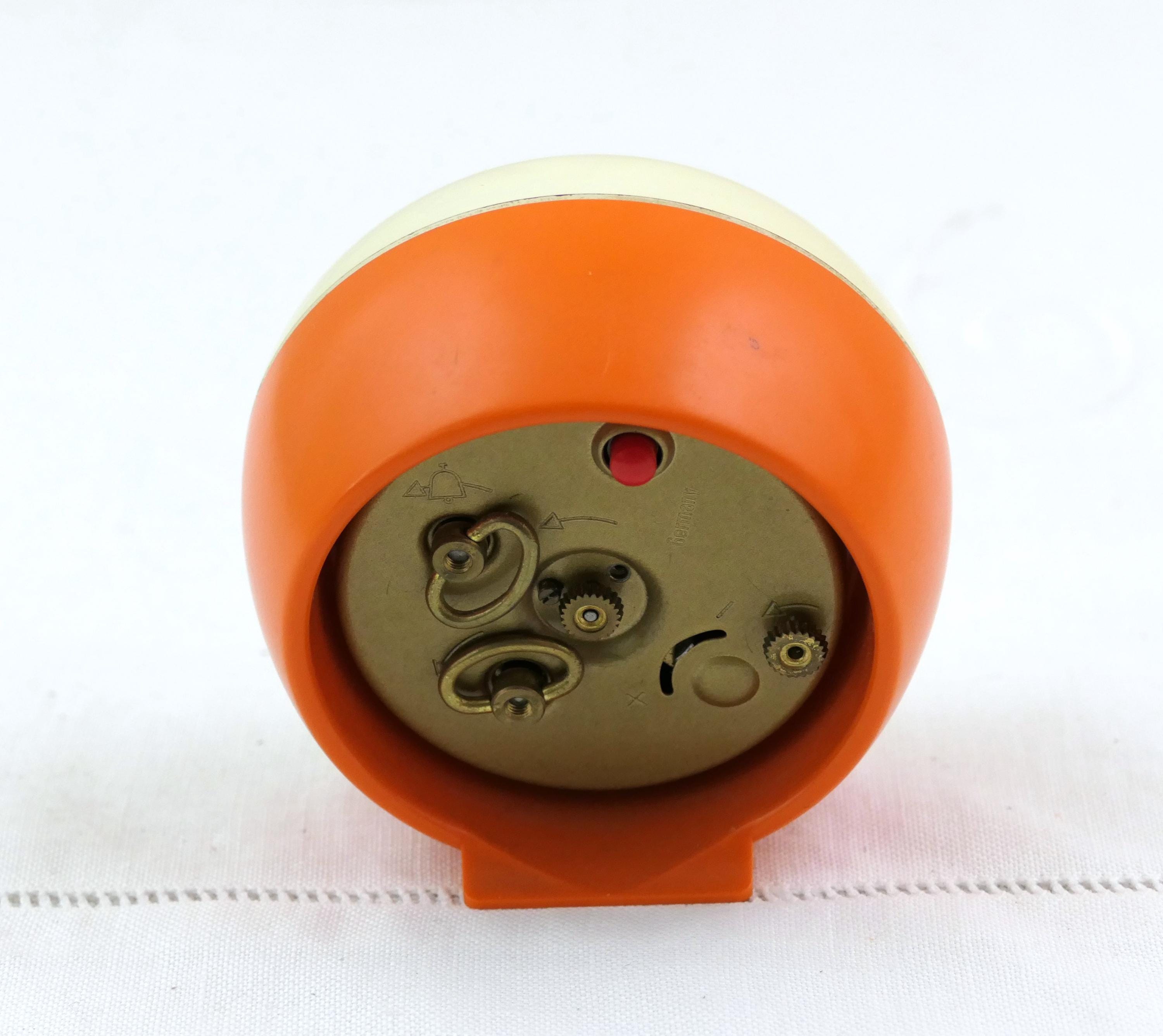 Small vintage orange and off white mechanical alarm clock. Made in Germany by Silvoz of orange plastic. Clock and alarm are in working condition, faint ticking, needs winding every 24 hours. Ca 1960s / 1970s.