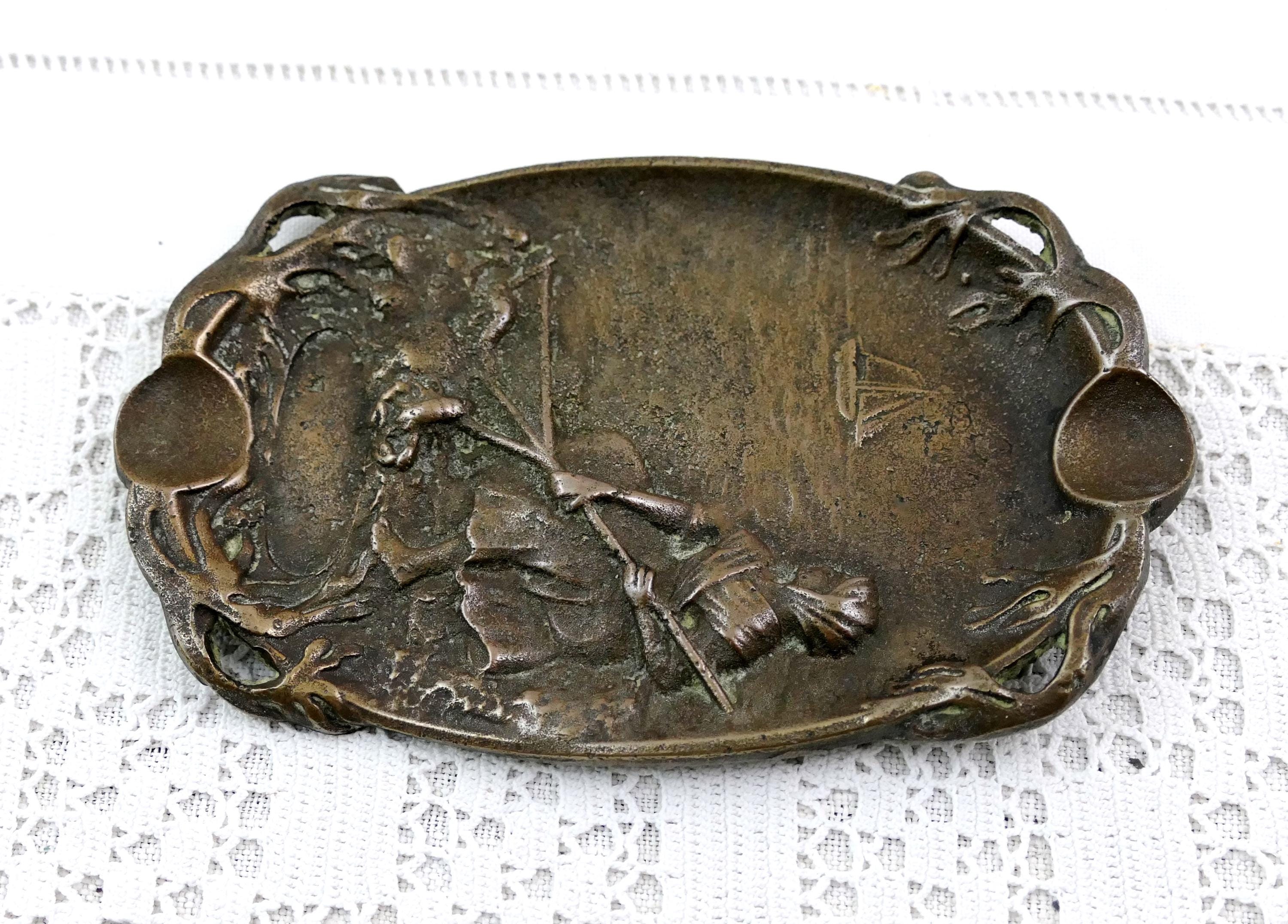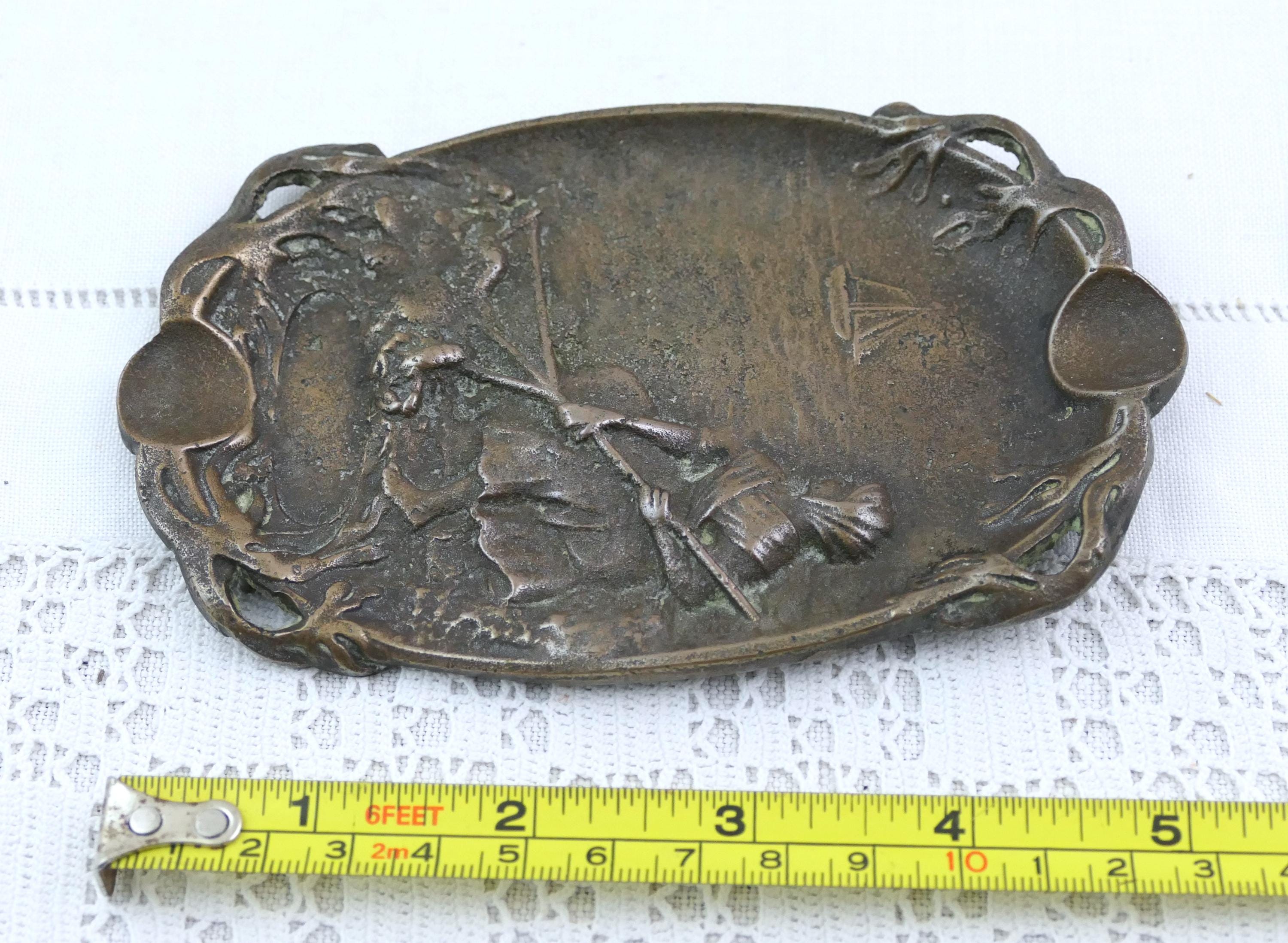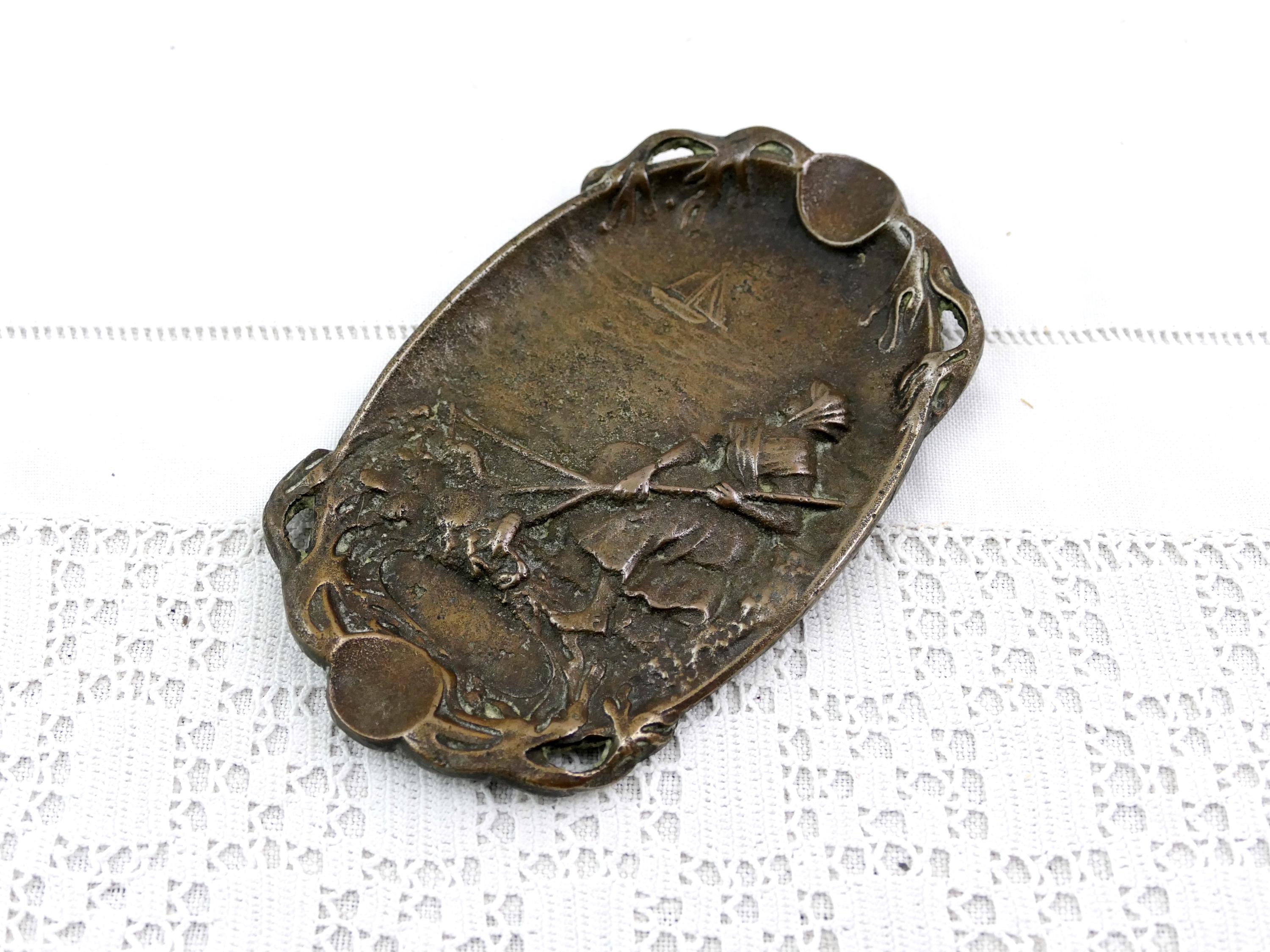 Antique French Art Nouveau ashtray with fisherwoman catching a crab. Made of cast bronze metal. Ca late 1800s.