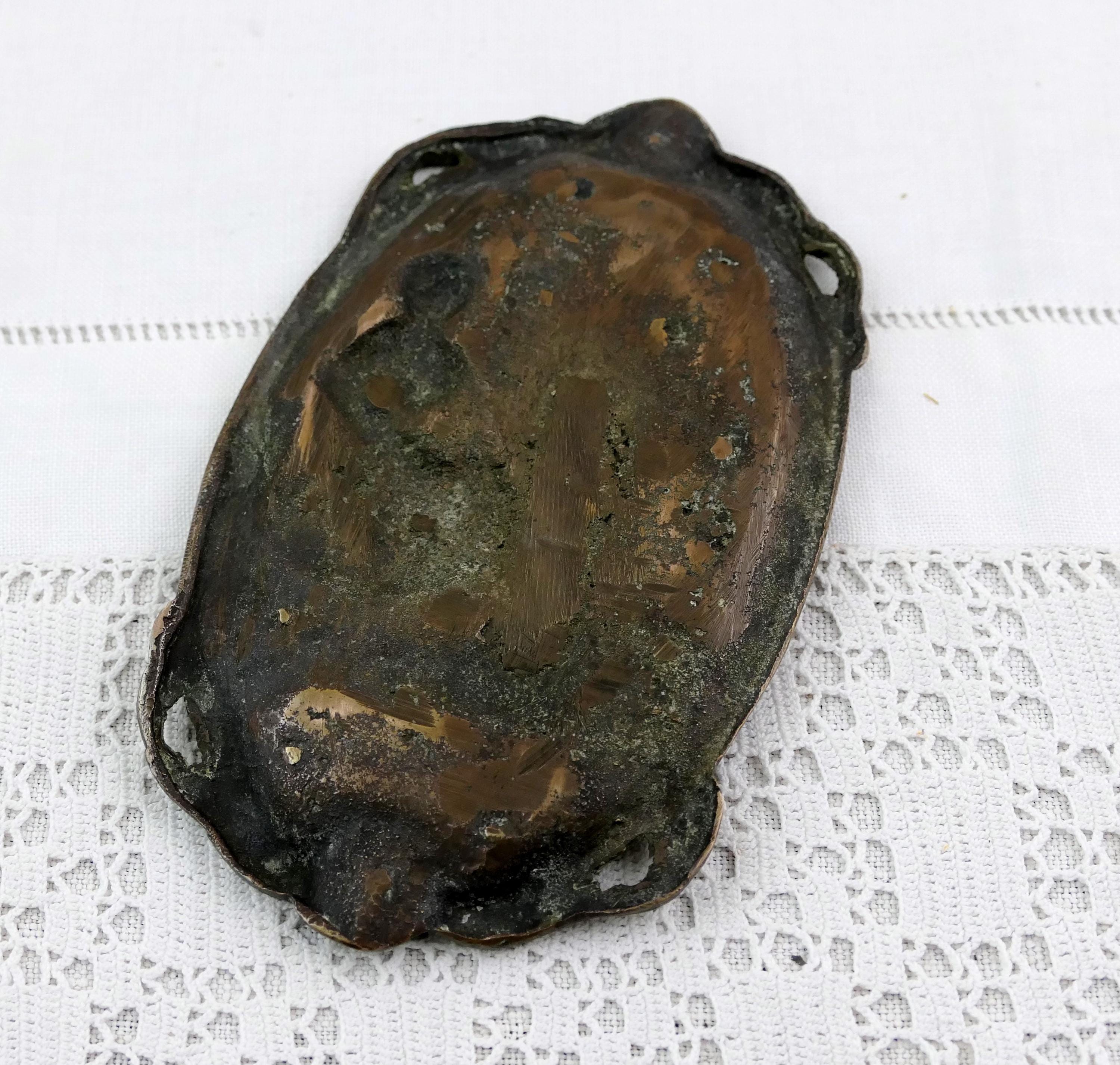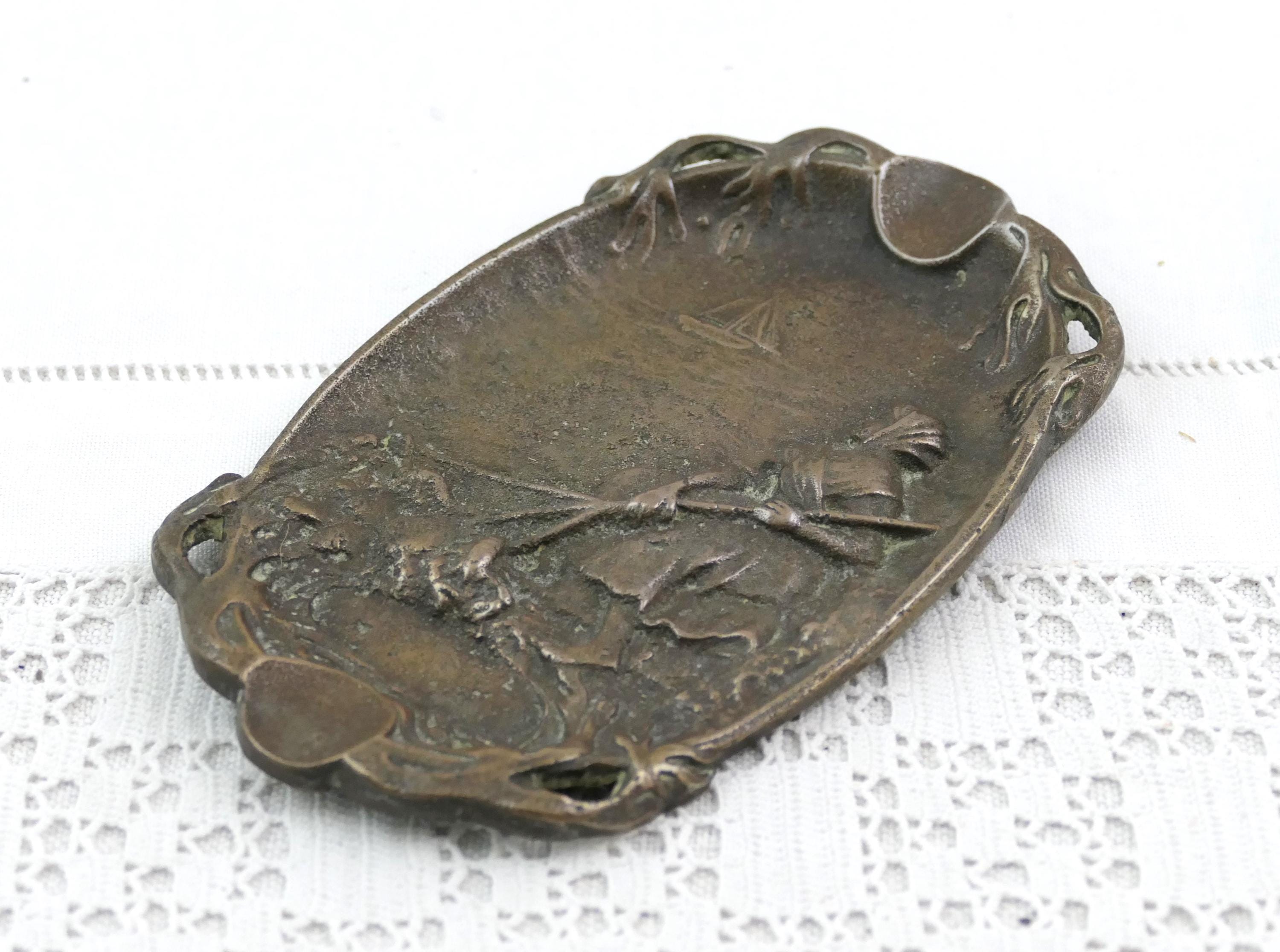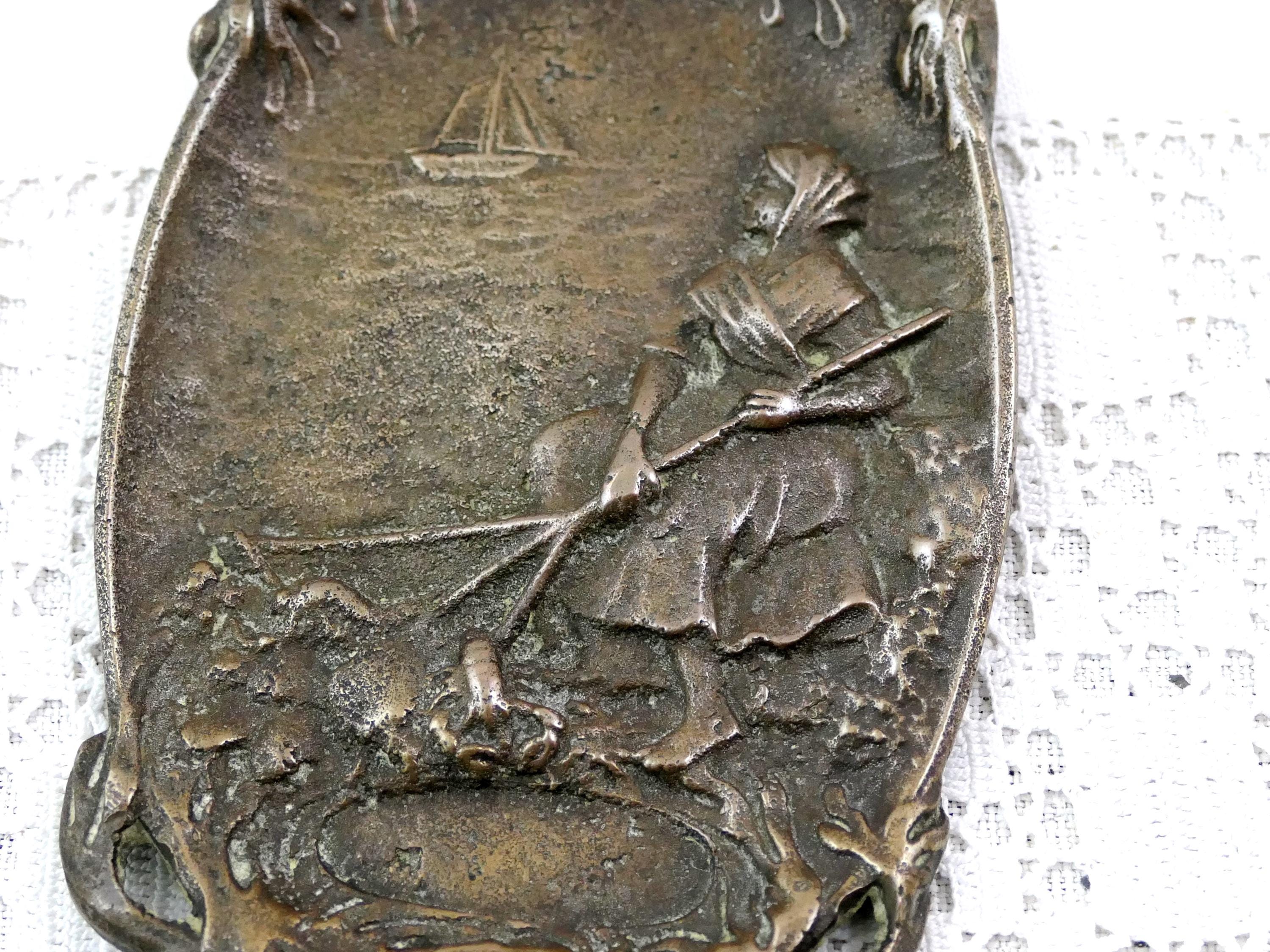 Antique French Art Nouveau ashtray with fisherwoman catching a crab. Made of cast bronze metal. Ca late 1800s.