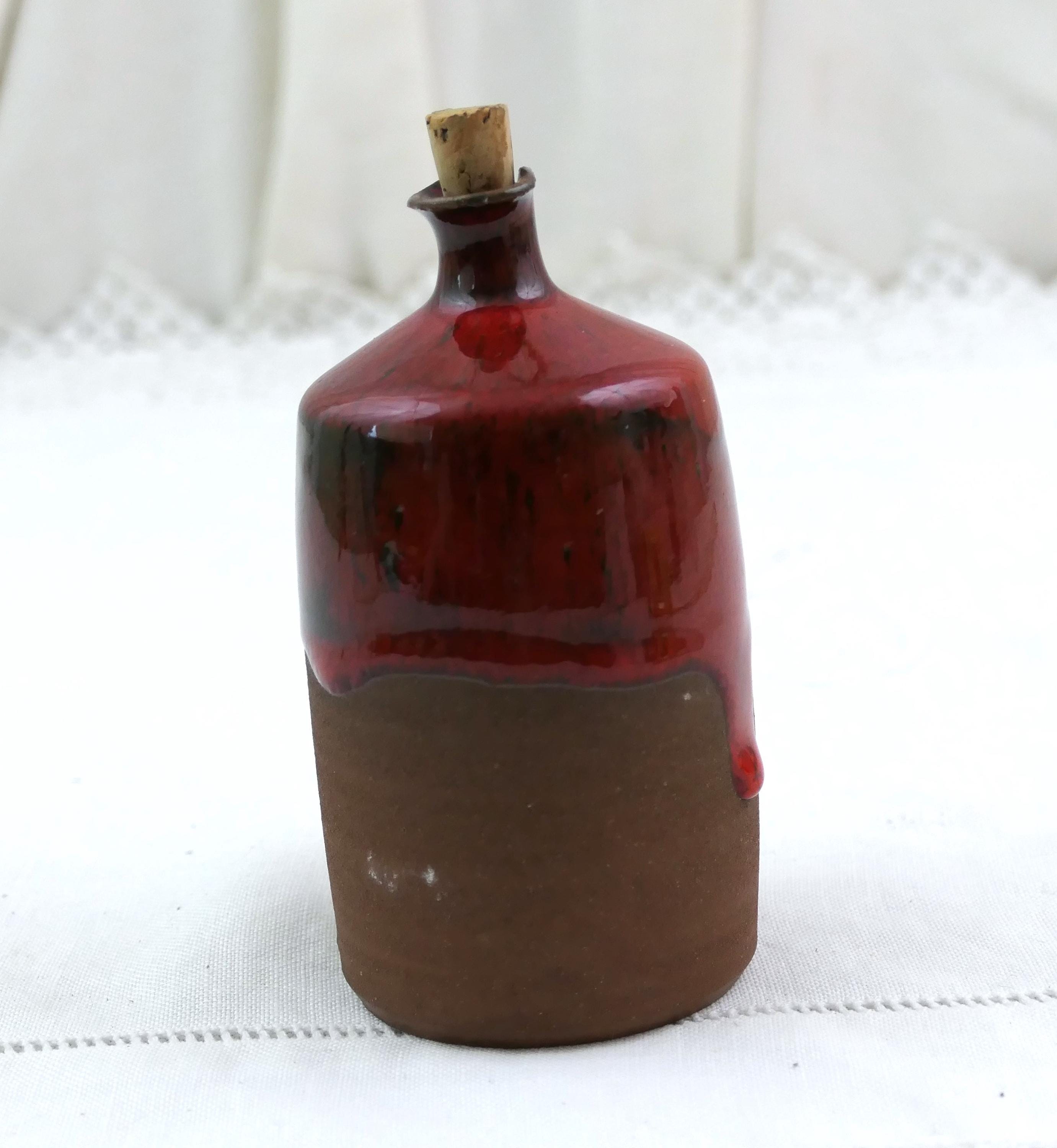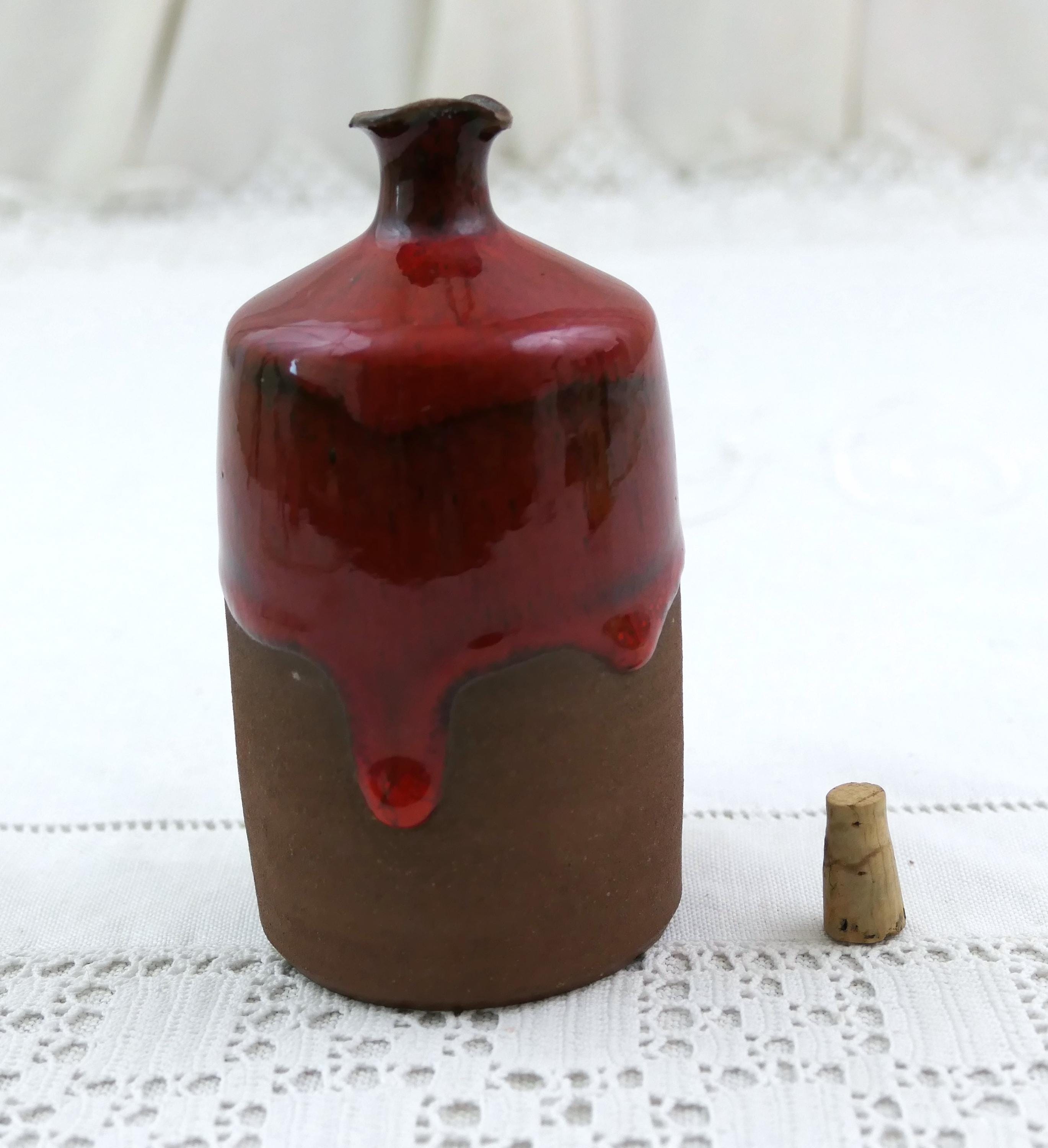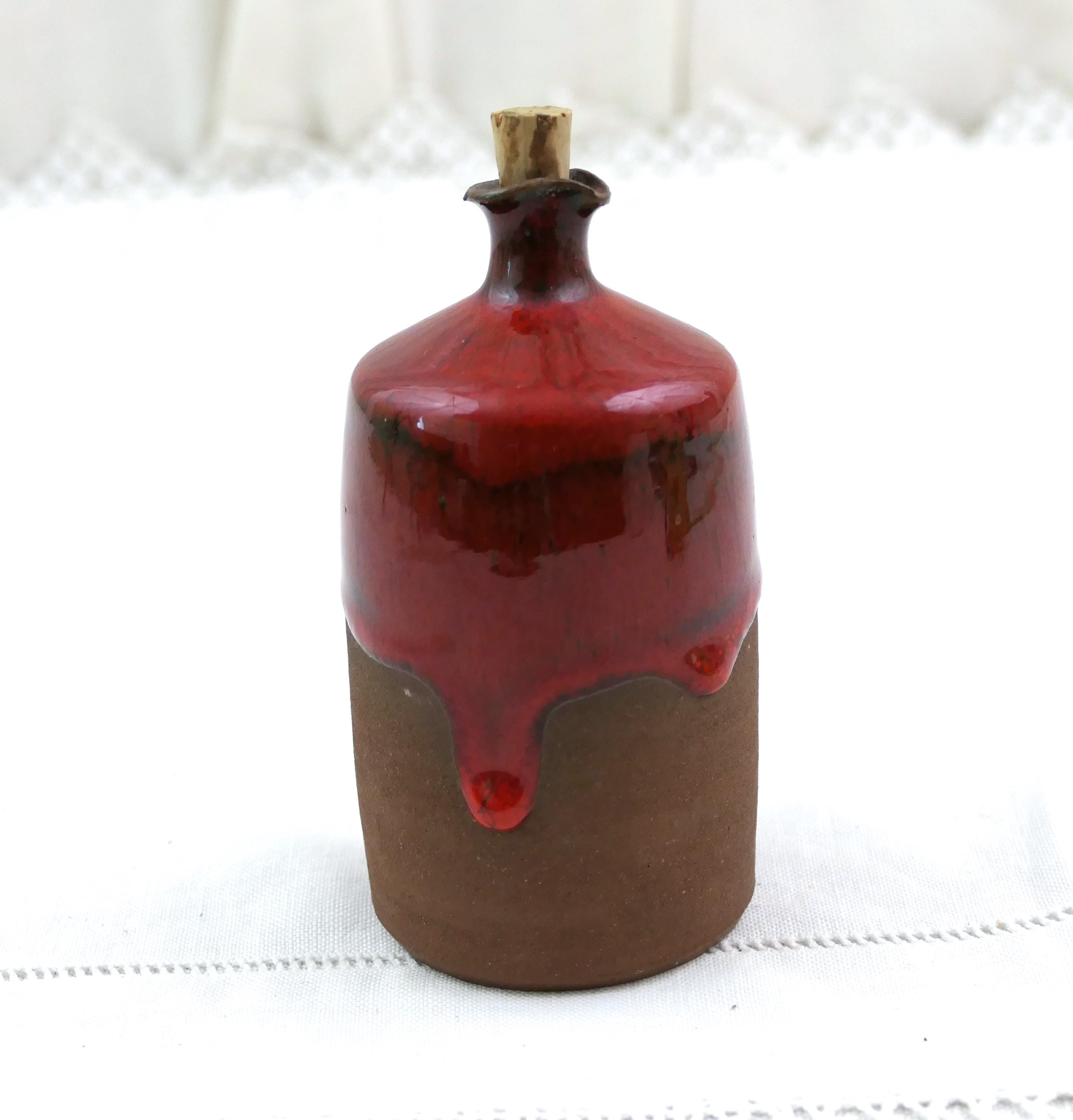 Small vintage studio pottery bottle. Made of earthenware with thick red glaze. Ca mid 1900.s