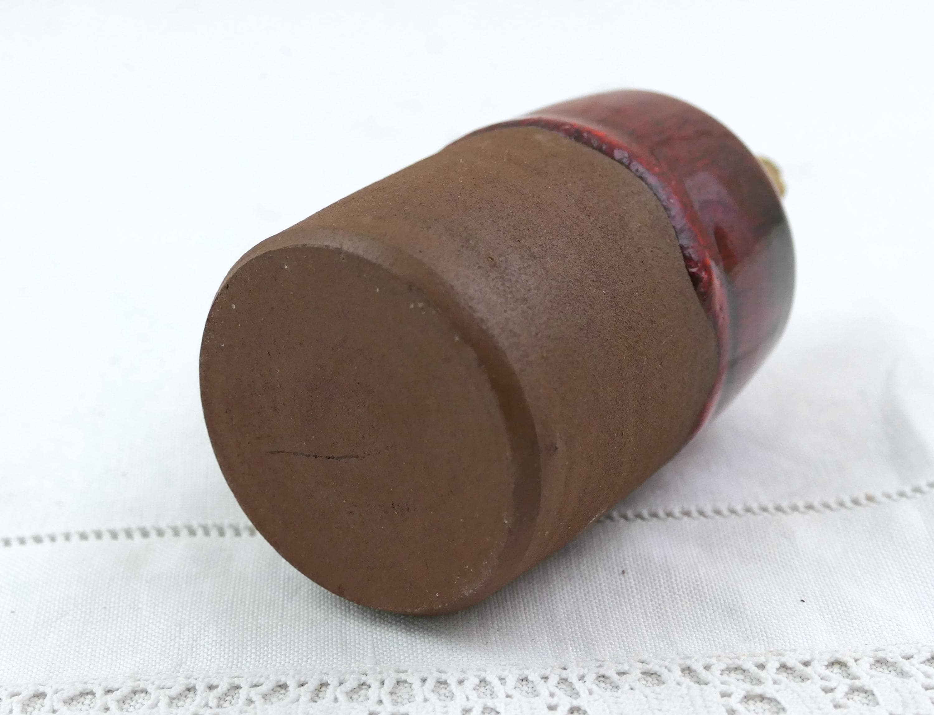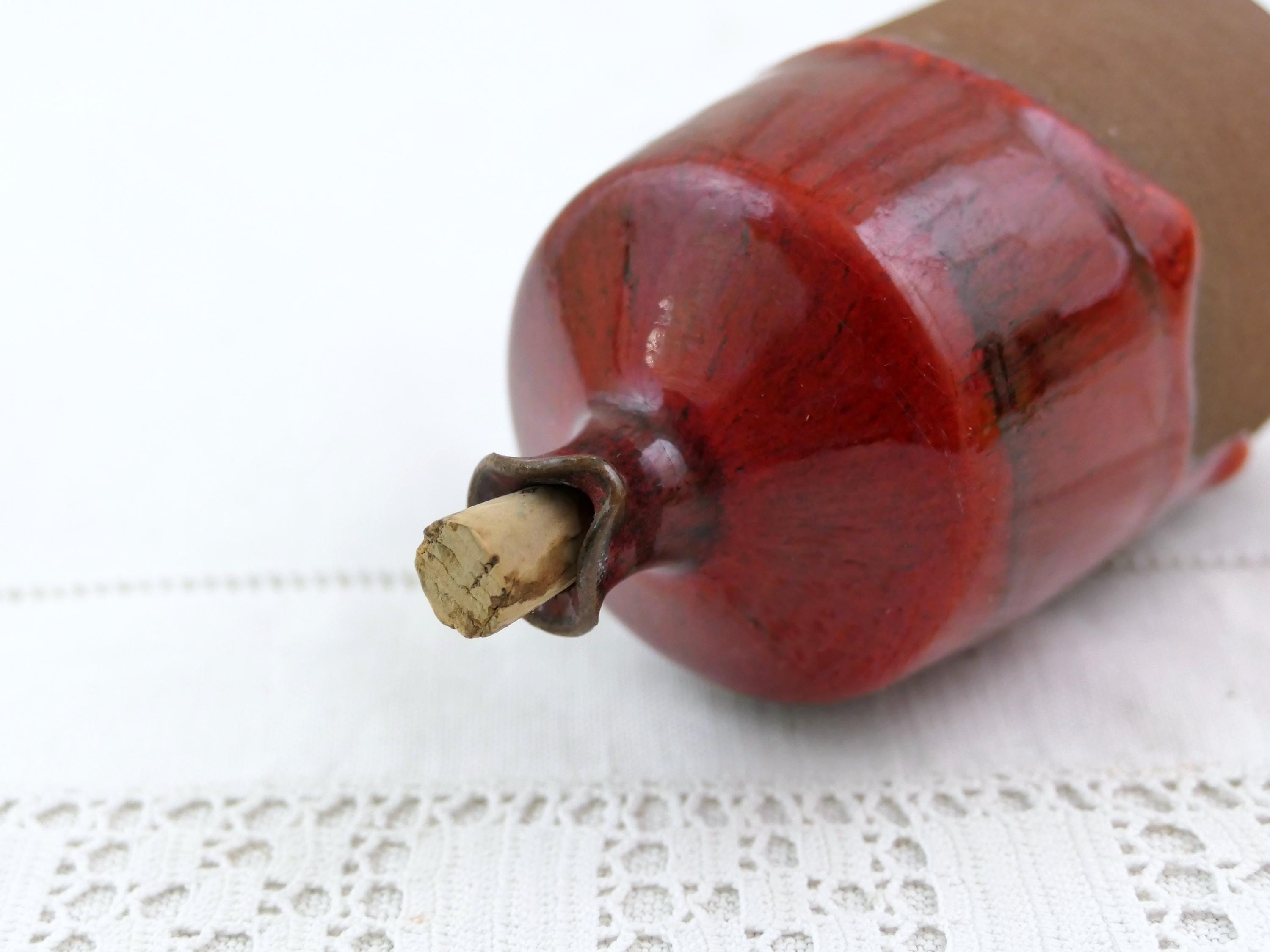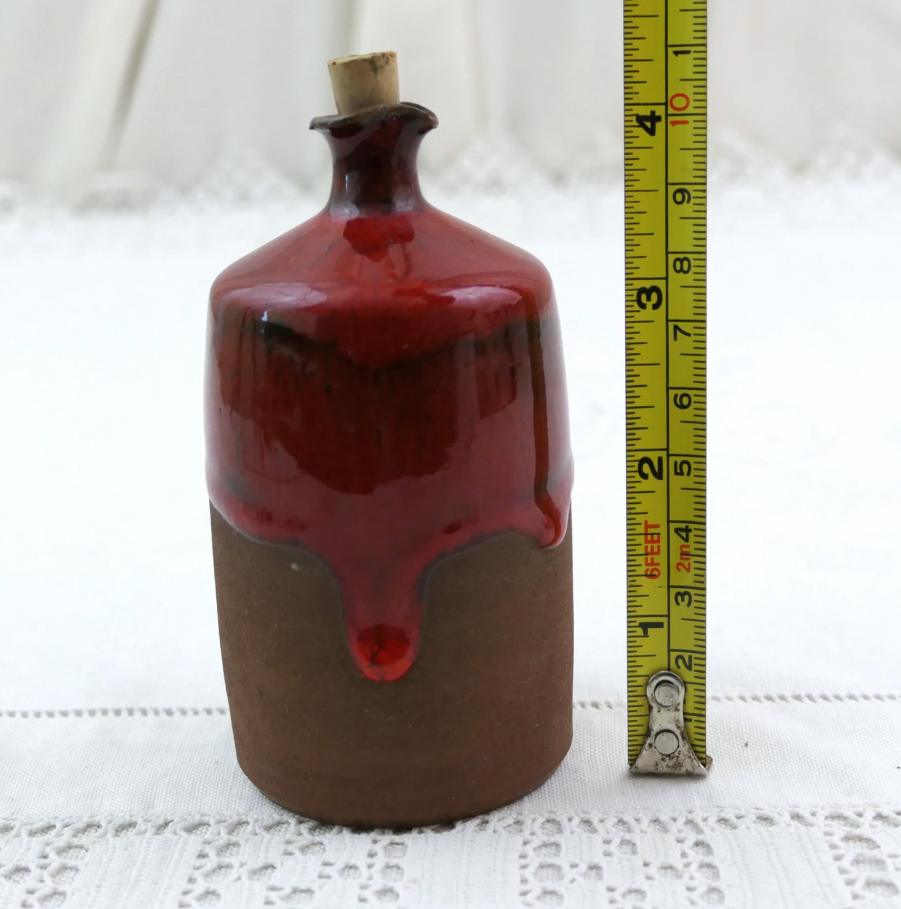 Small vintage studio pottery bottle. Made of earthenware with thick red glaze. Ca mid 1900.s