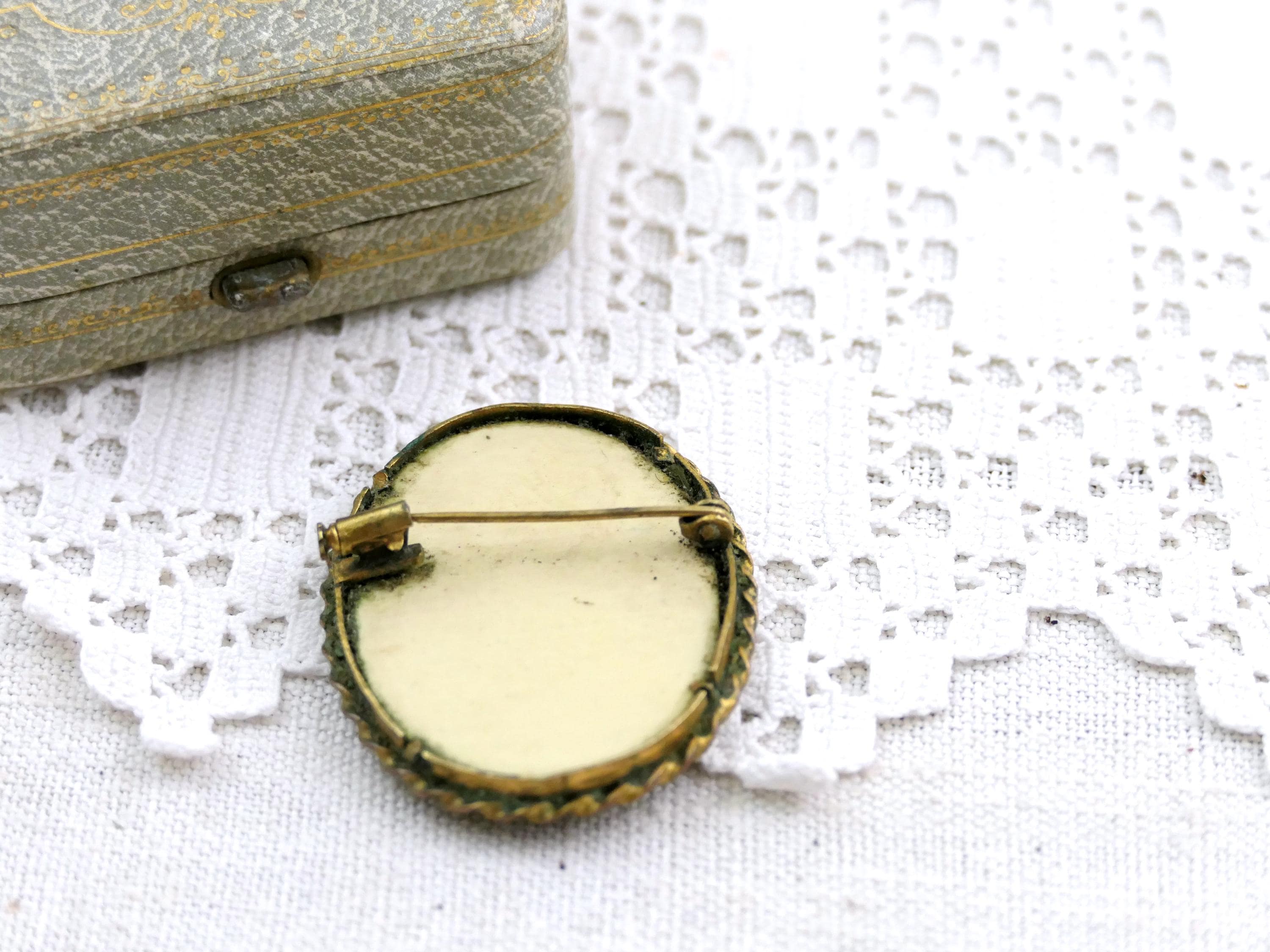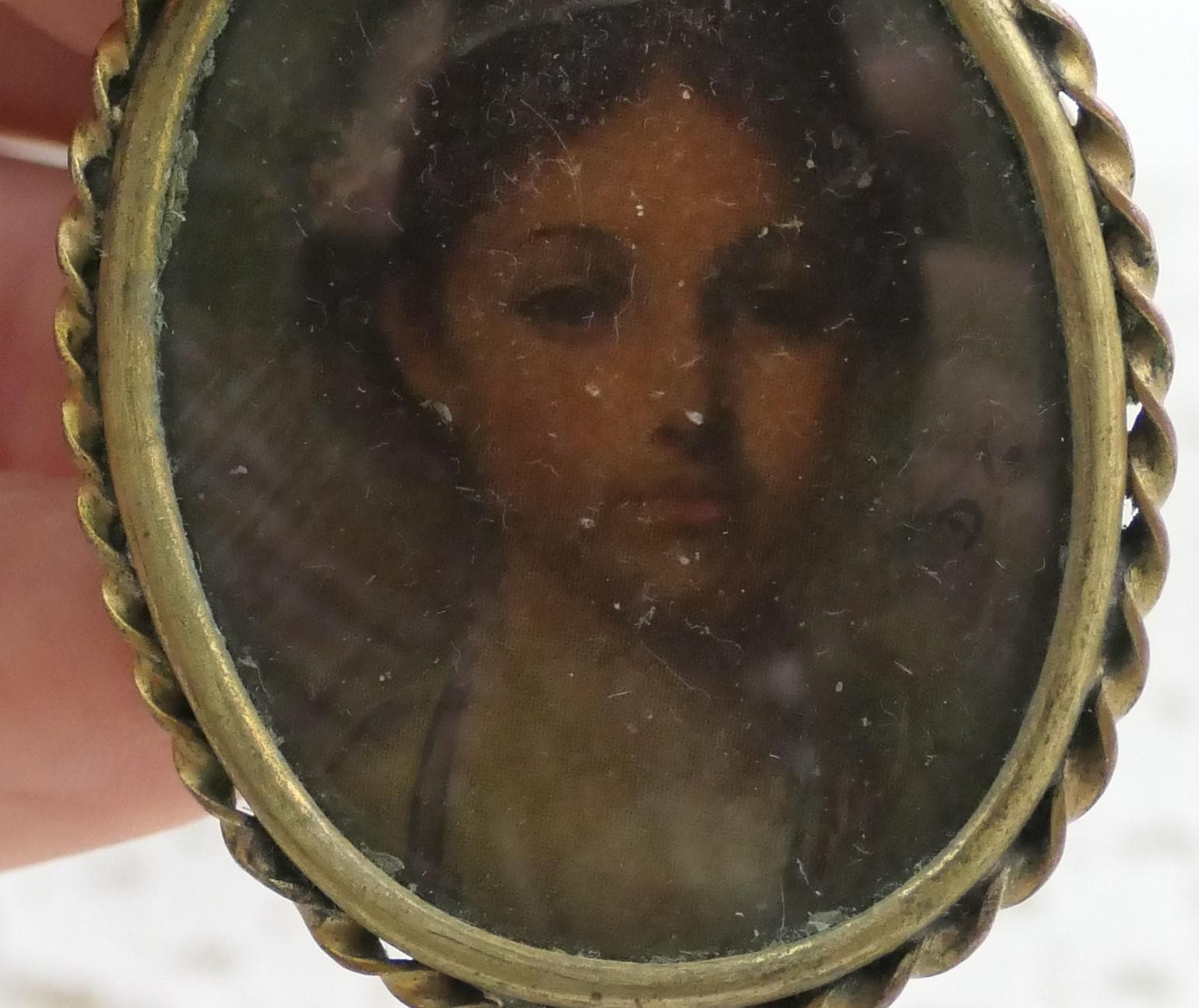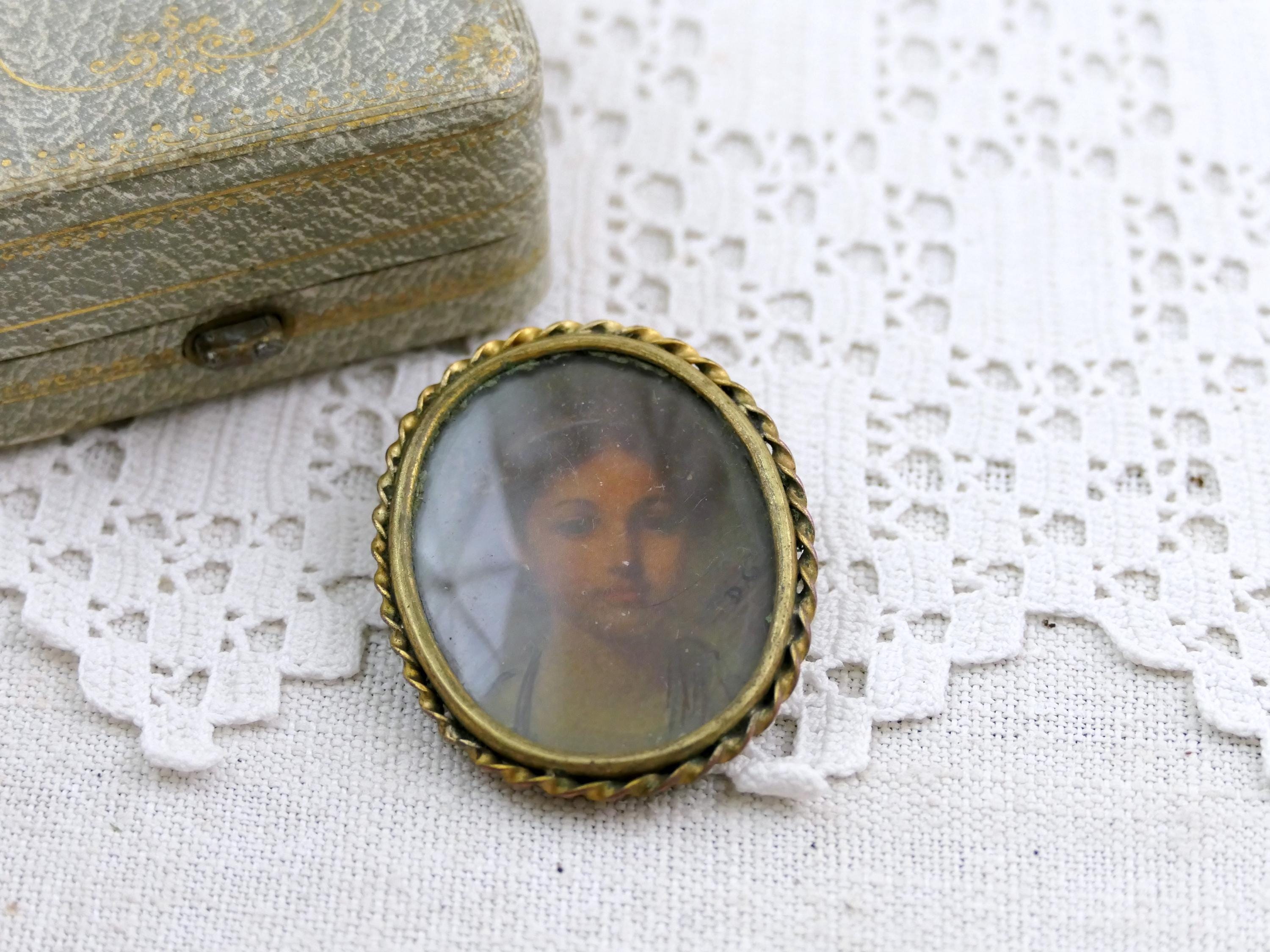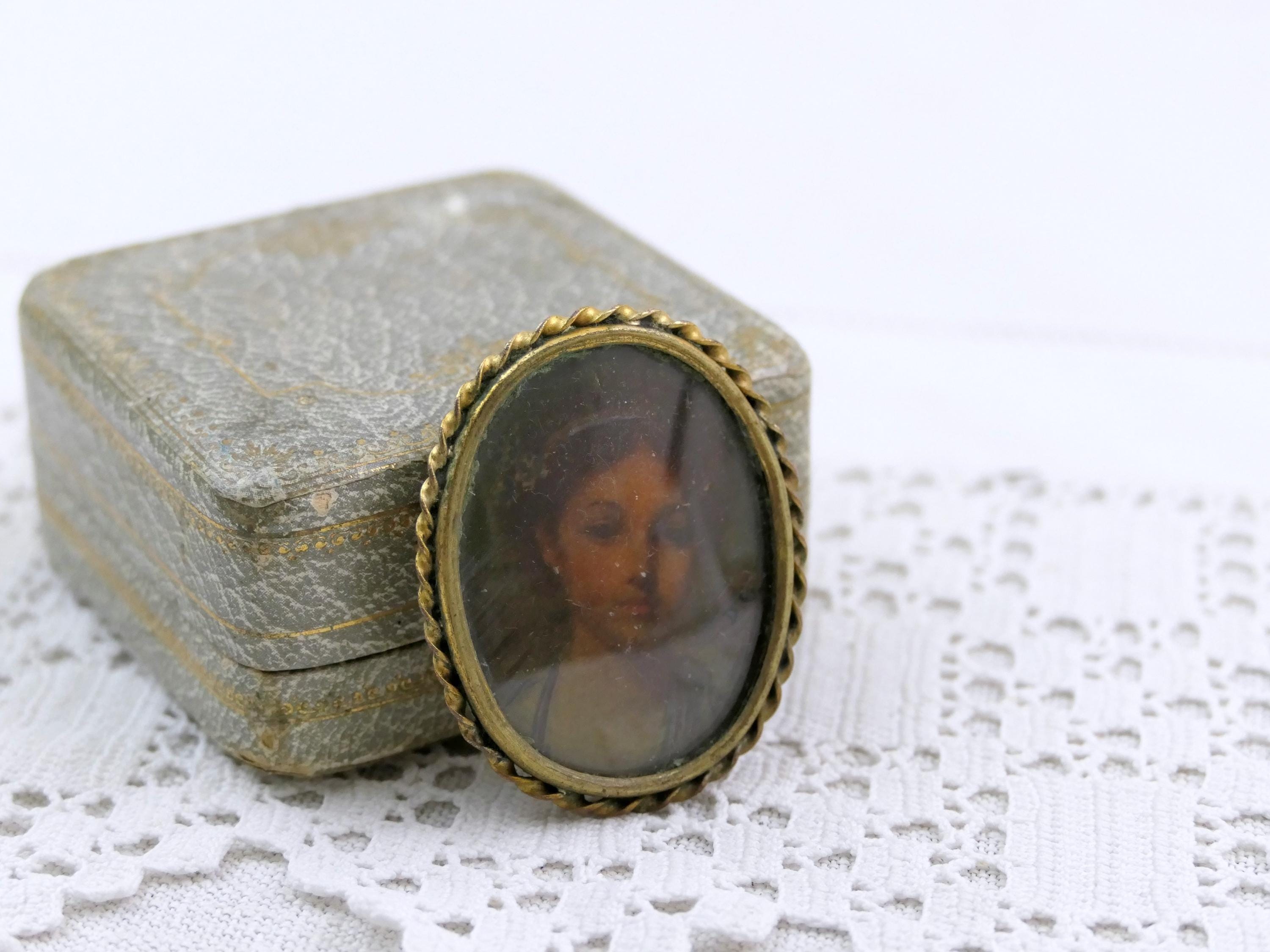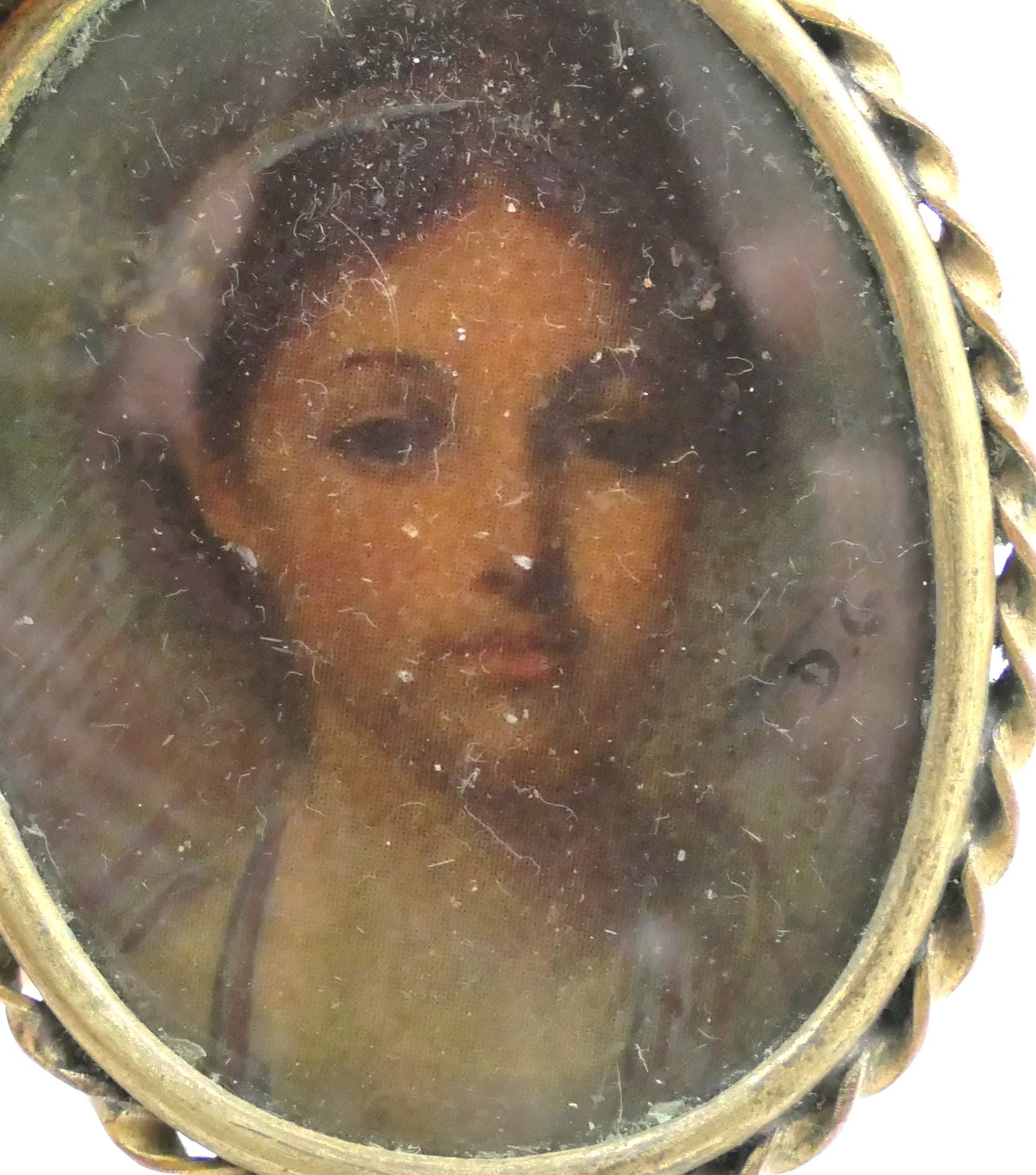 Antique oval brooch with hand painted portrait of a young girl. Made of celluloid framed with twisted gold tone metal. Ca 1920s.