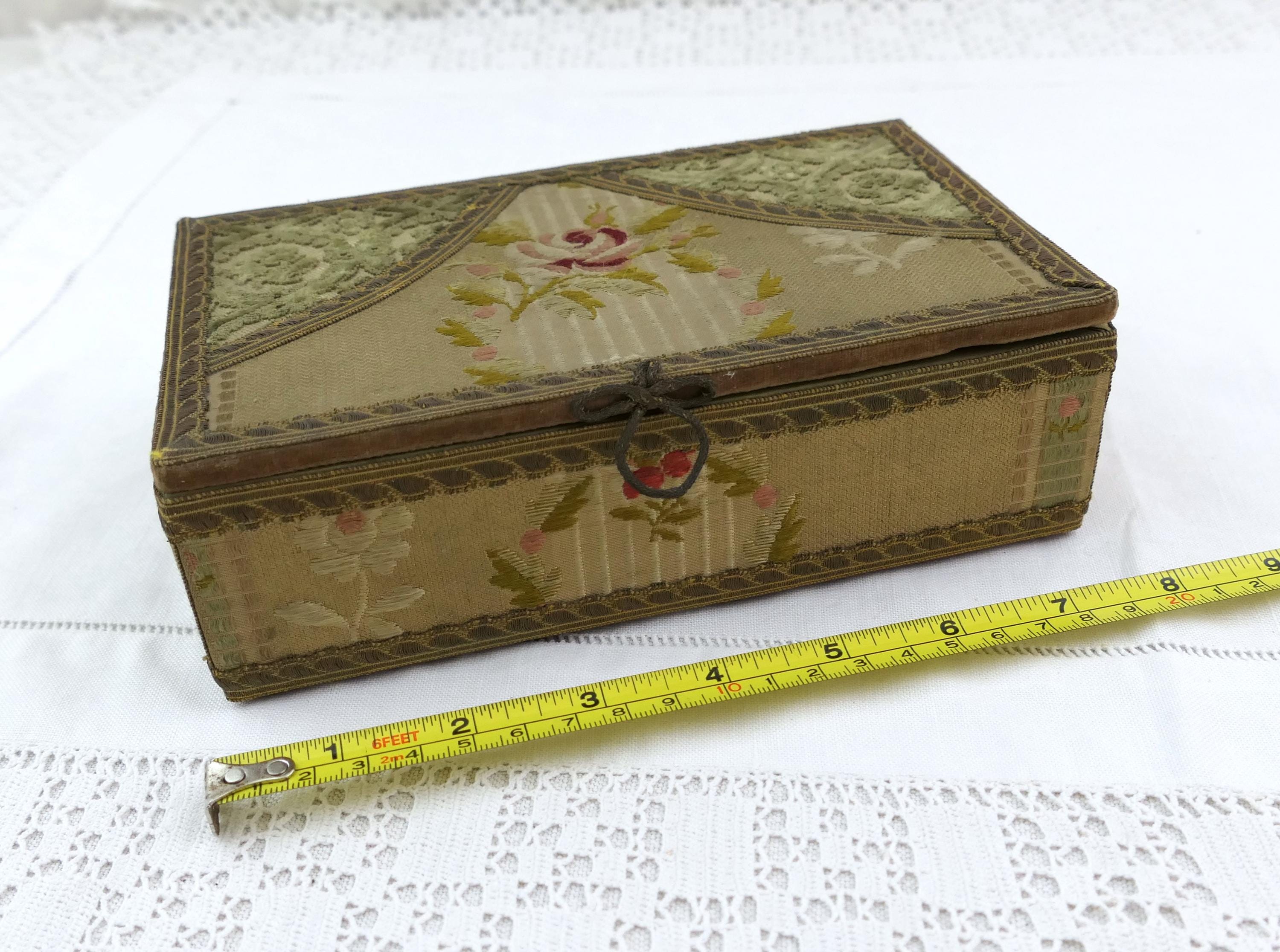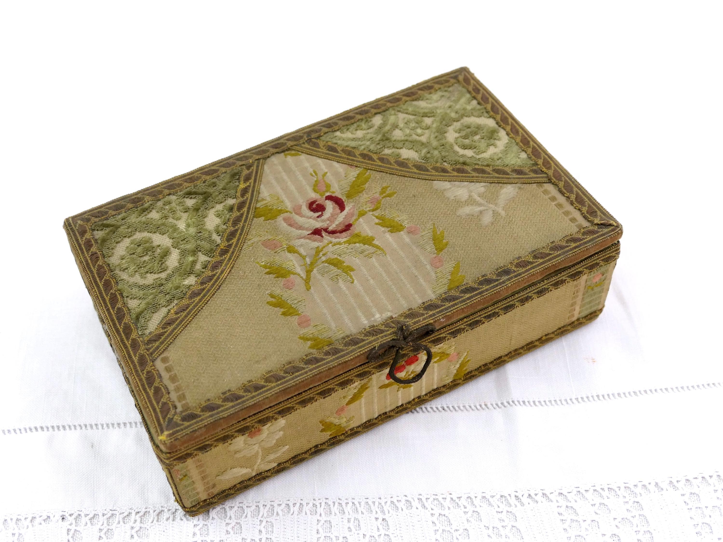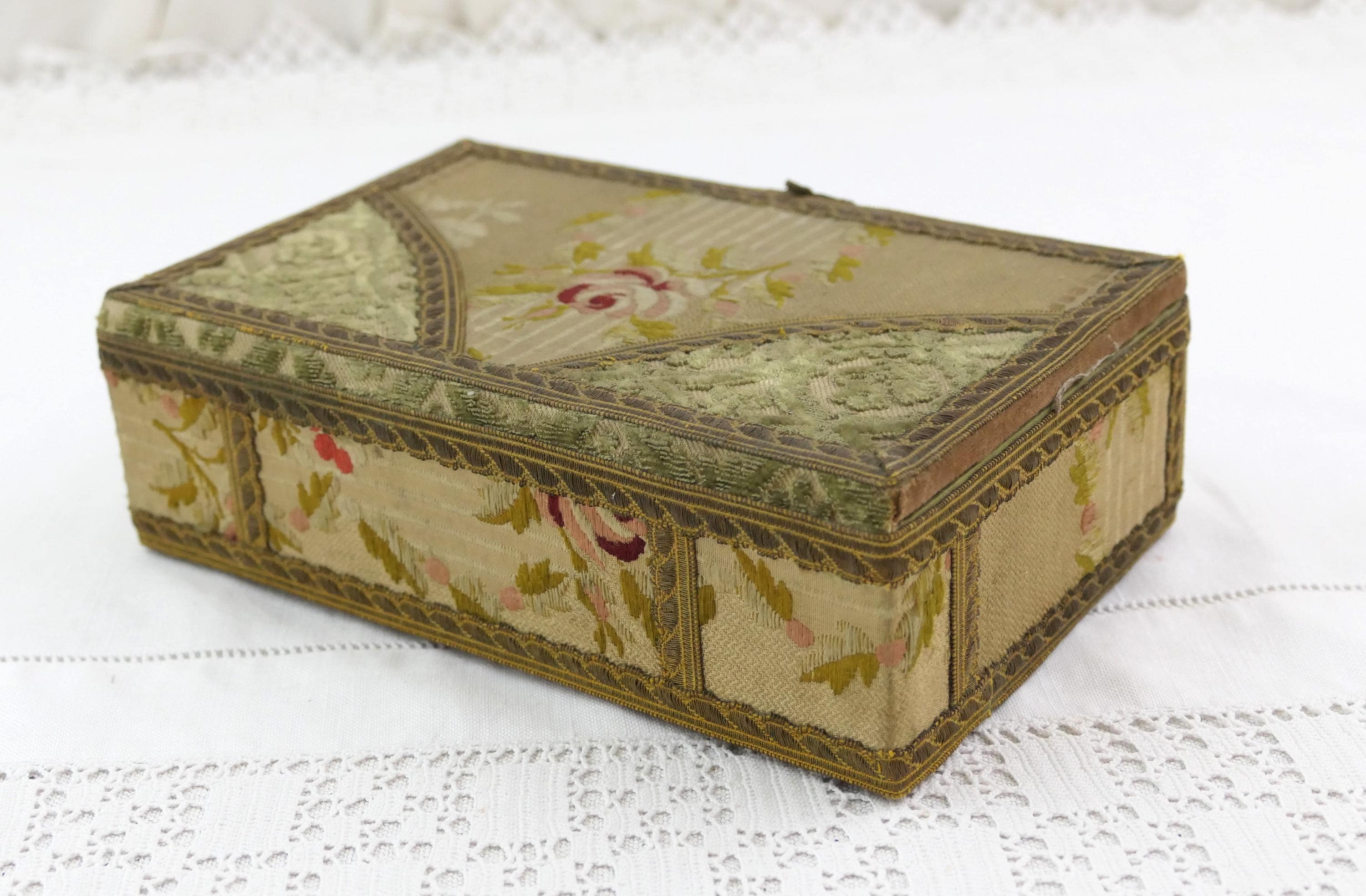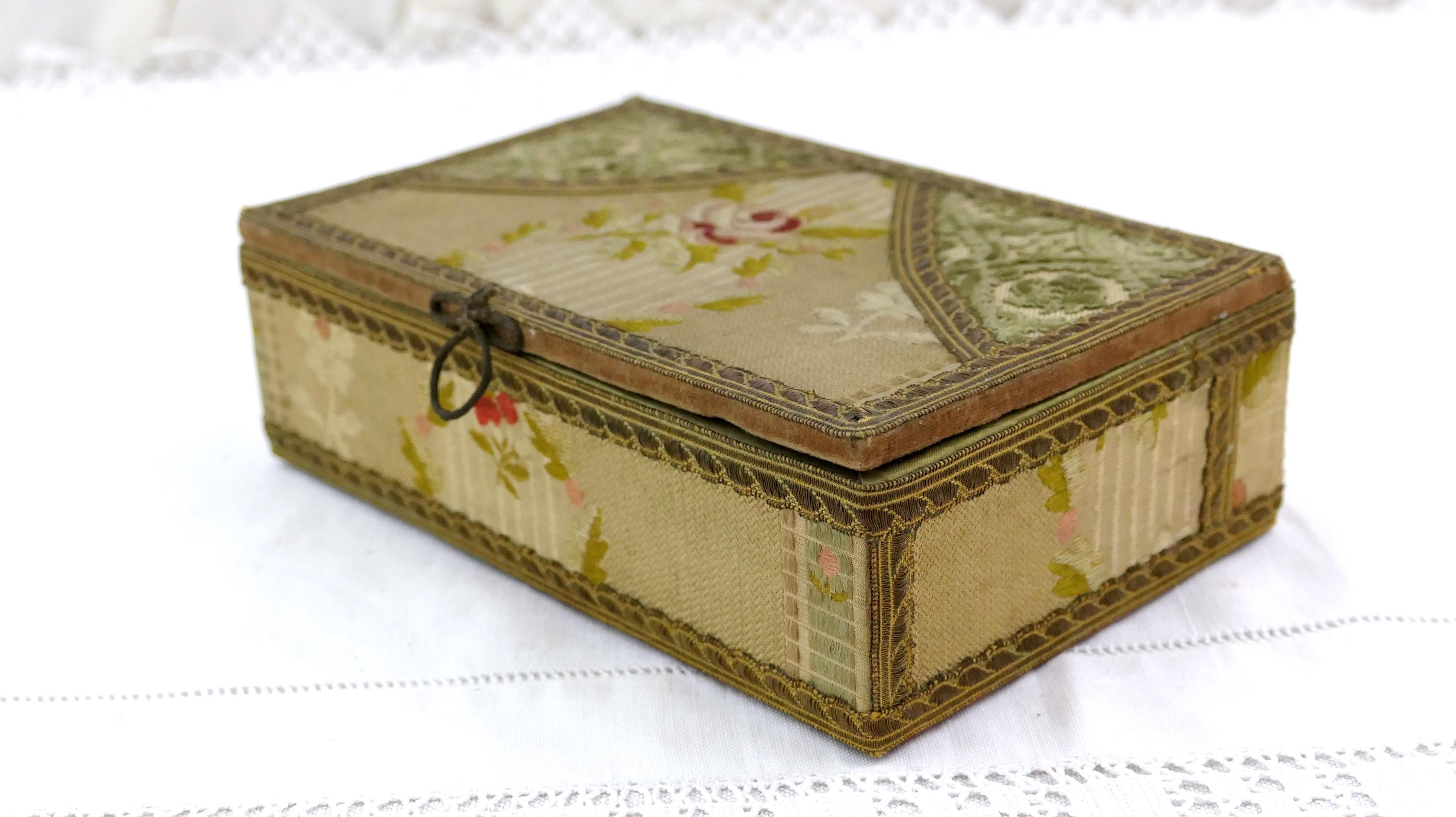 Antique 19th Century French ornate fabric covered wooden box. Made of wood with material. Ca early to mid 1800s.