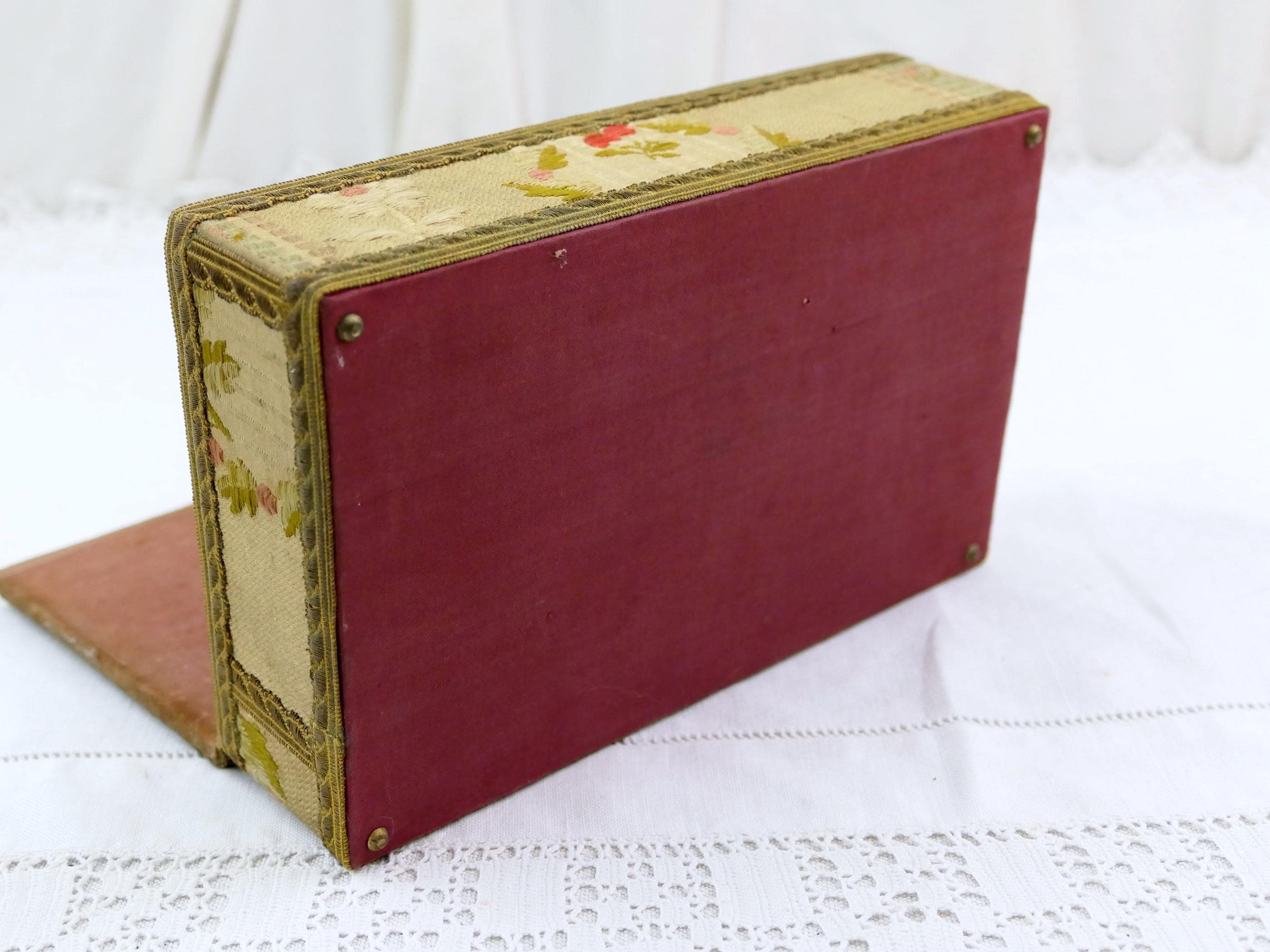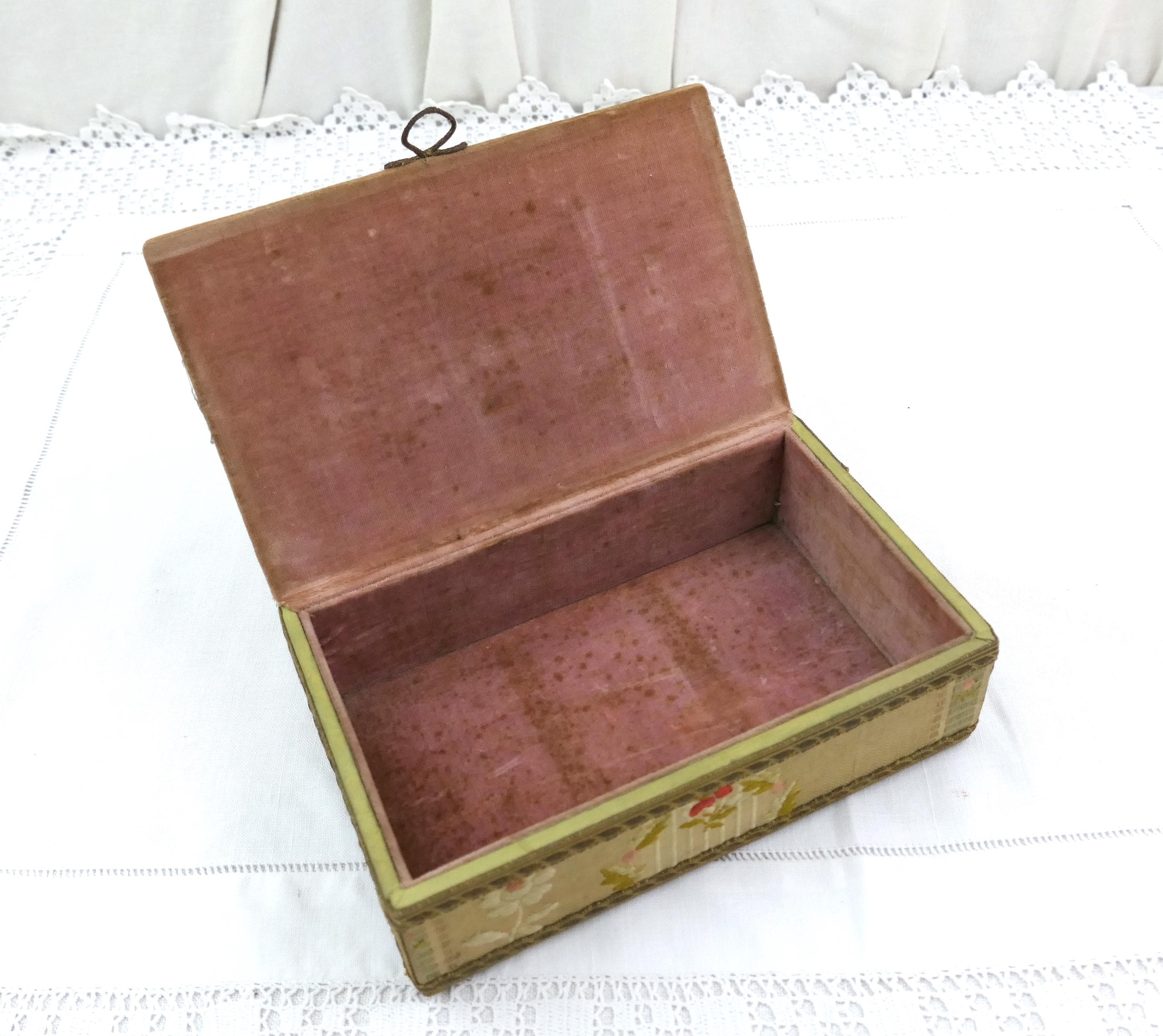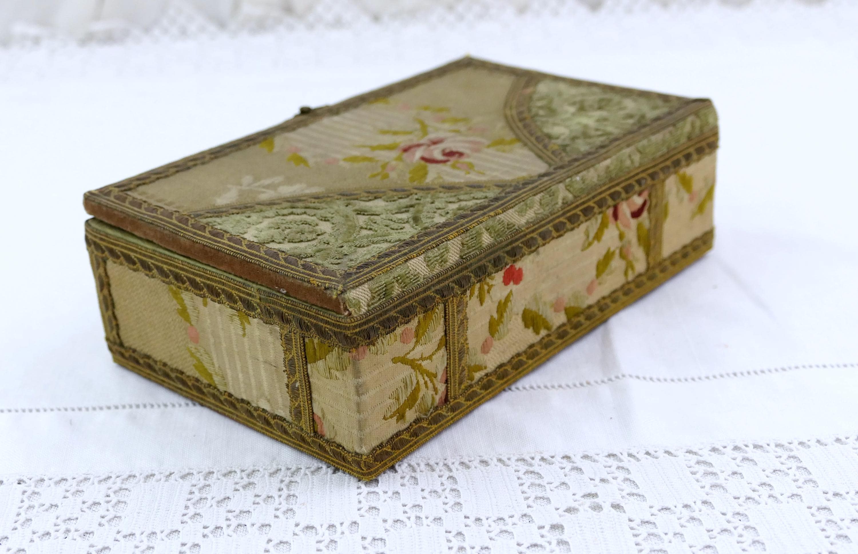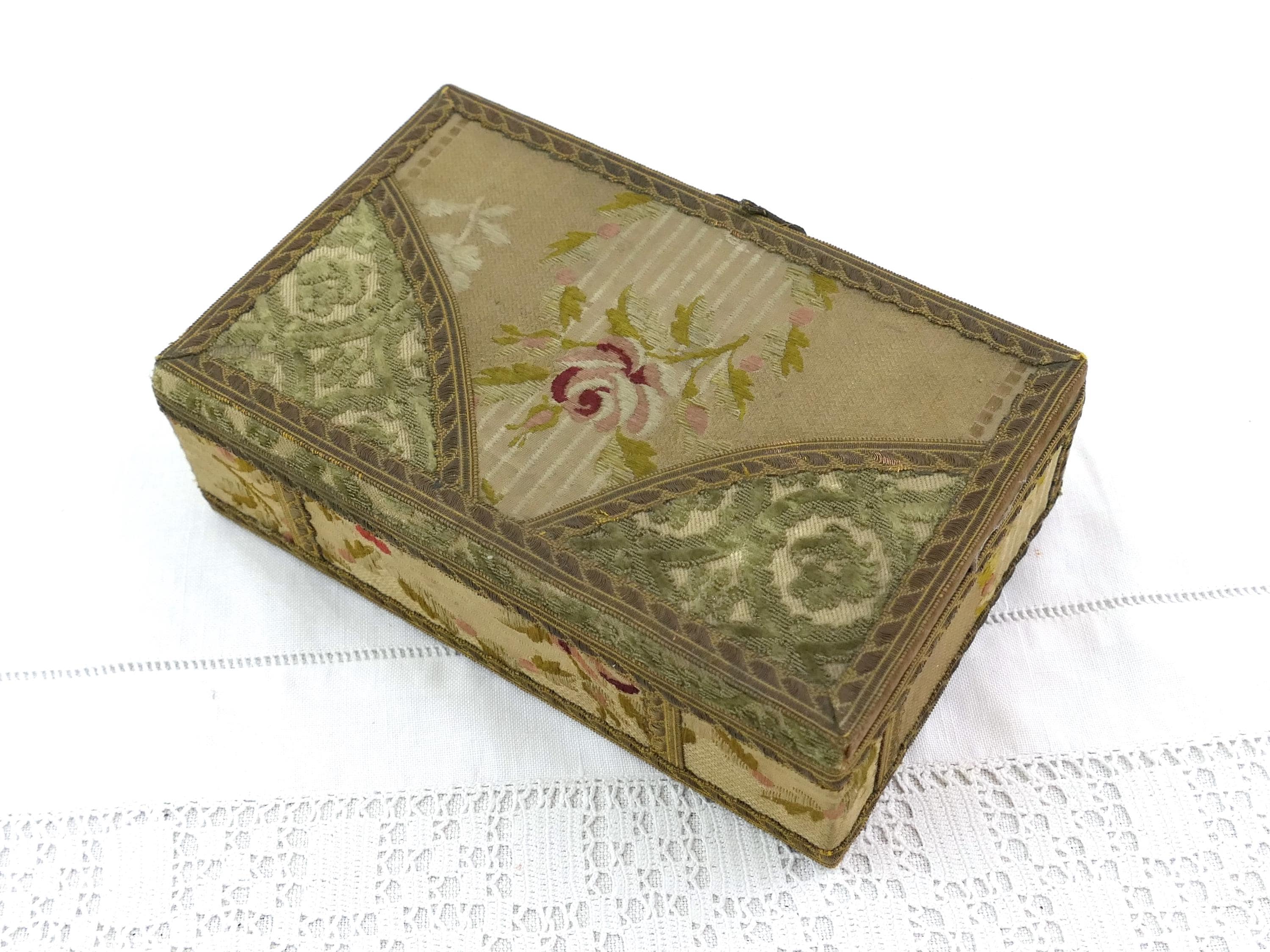 Antique 19th Century French ornate fabric covered wooden box. Made of wood with material. Ca early to mid 1800s.