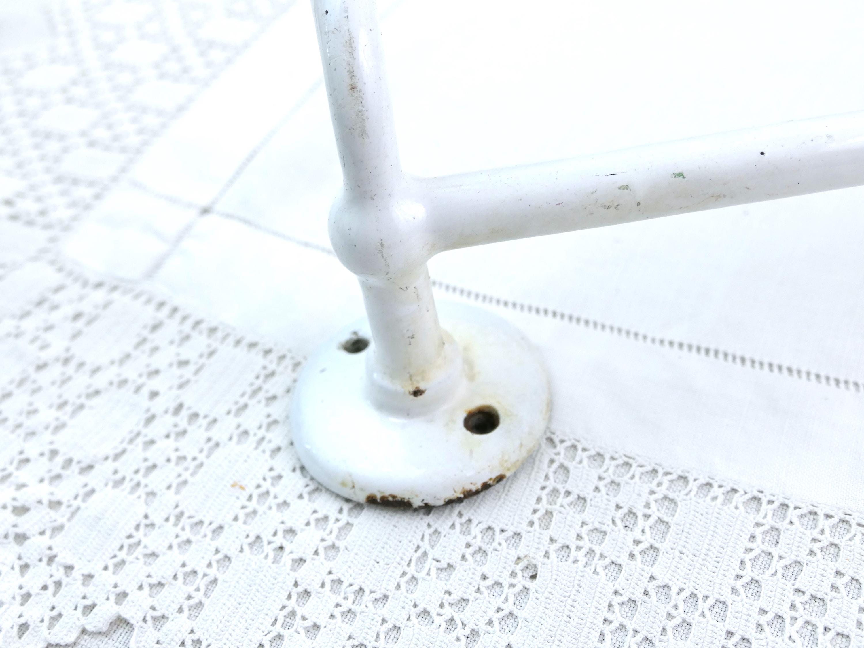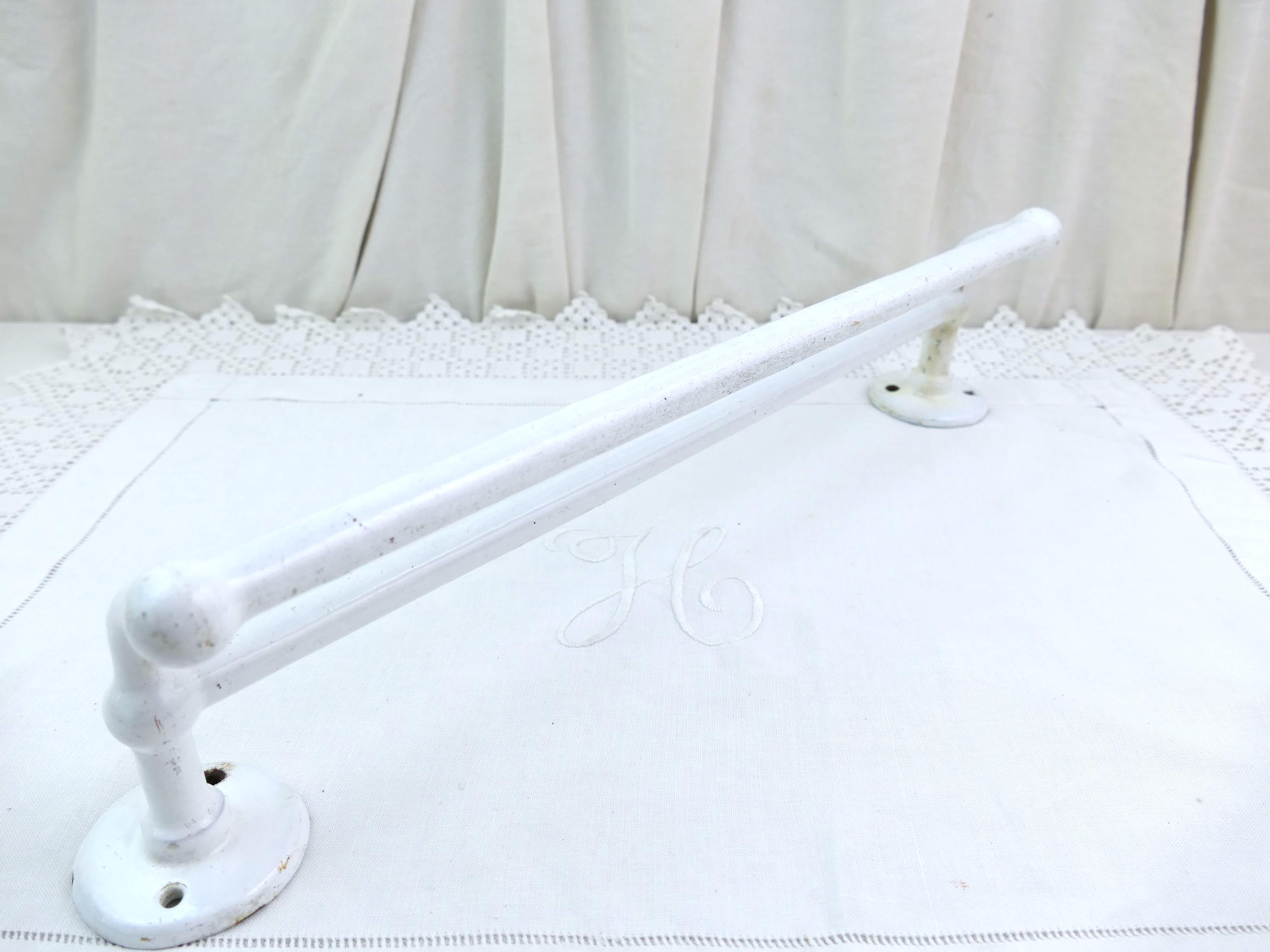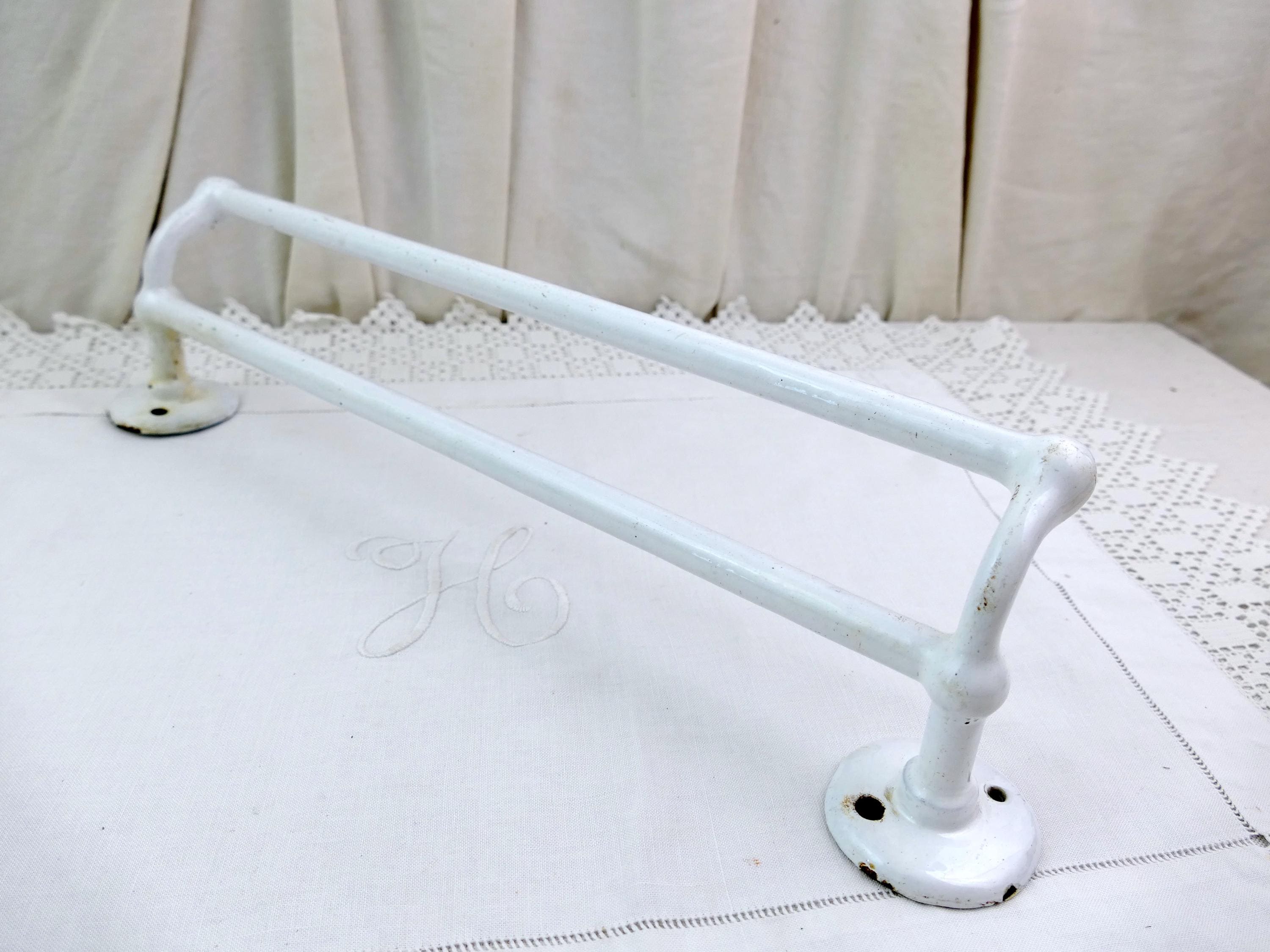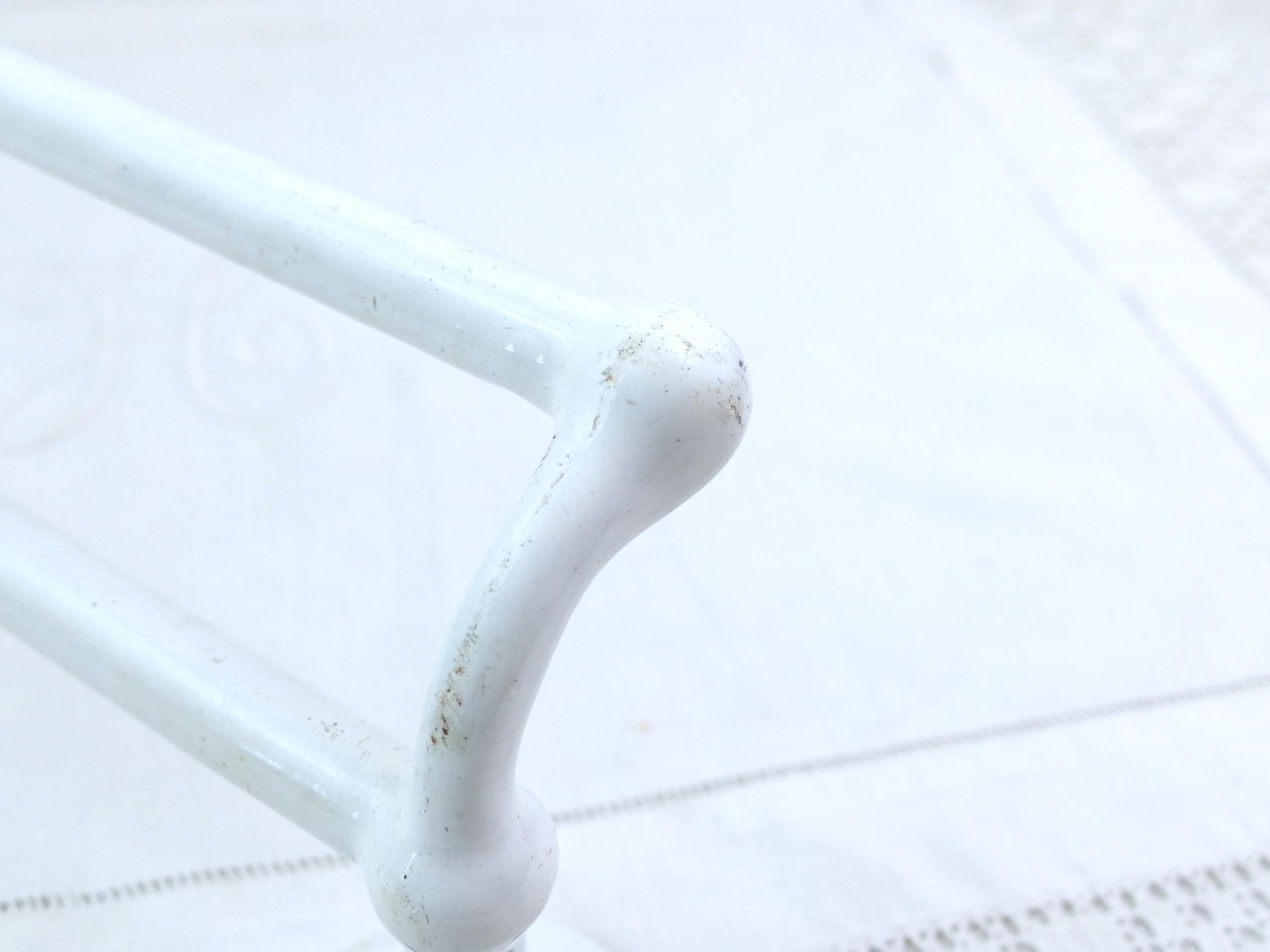 Antique e French double towel rack. Made of white porcelain enameled cast metal. Ca early 1900s.