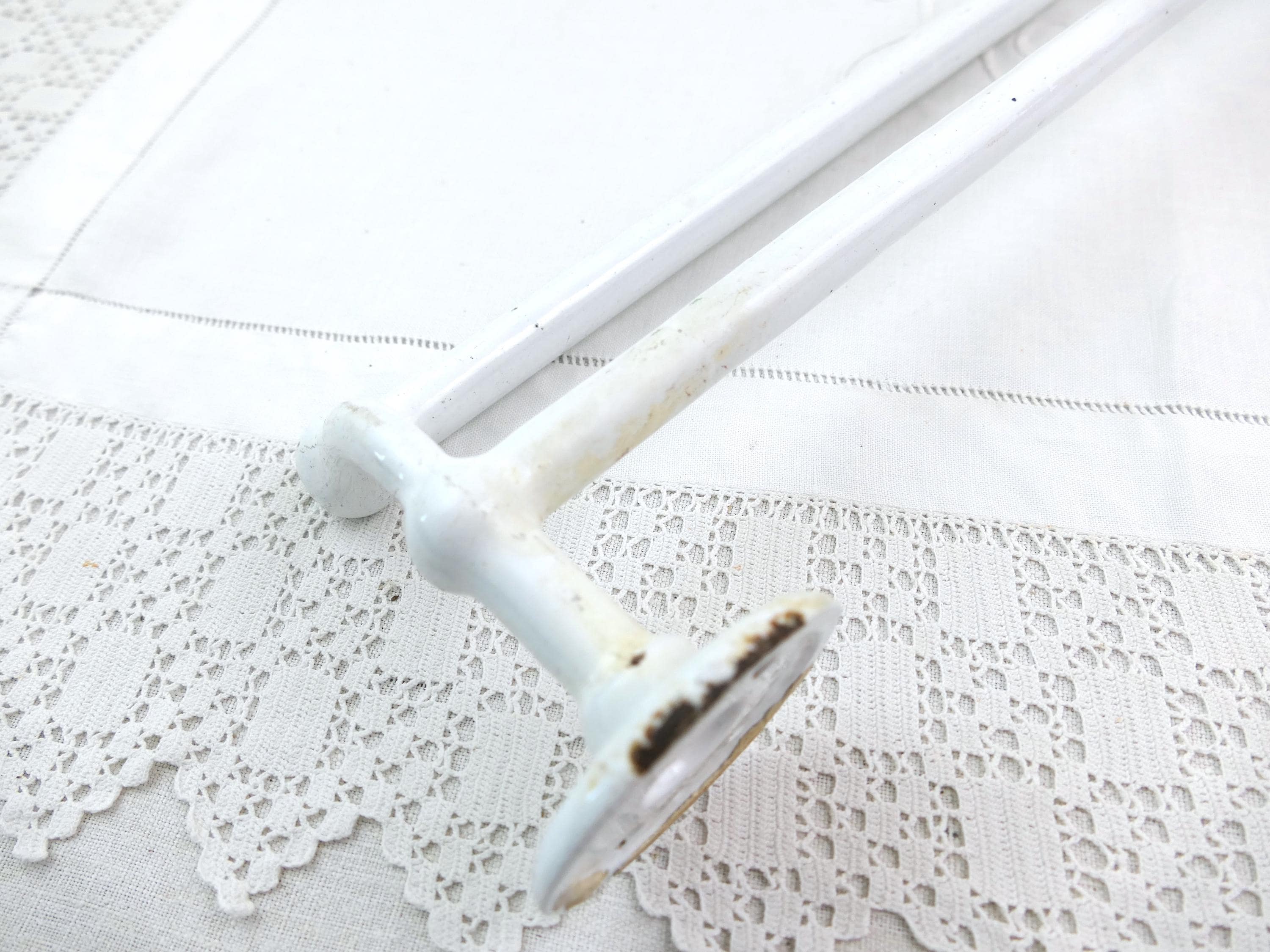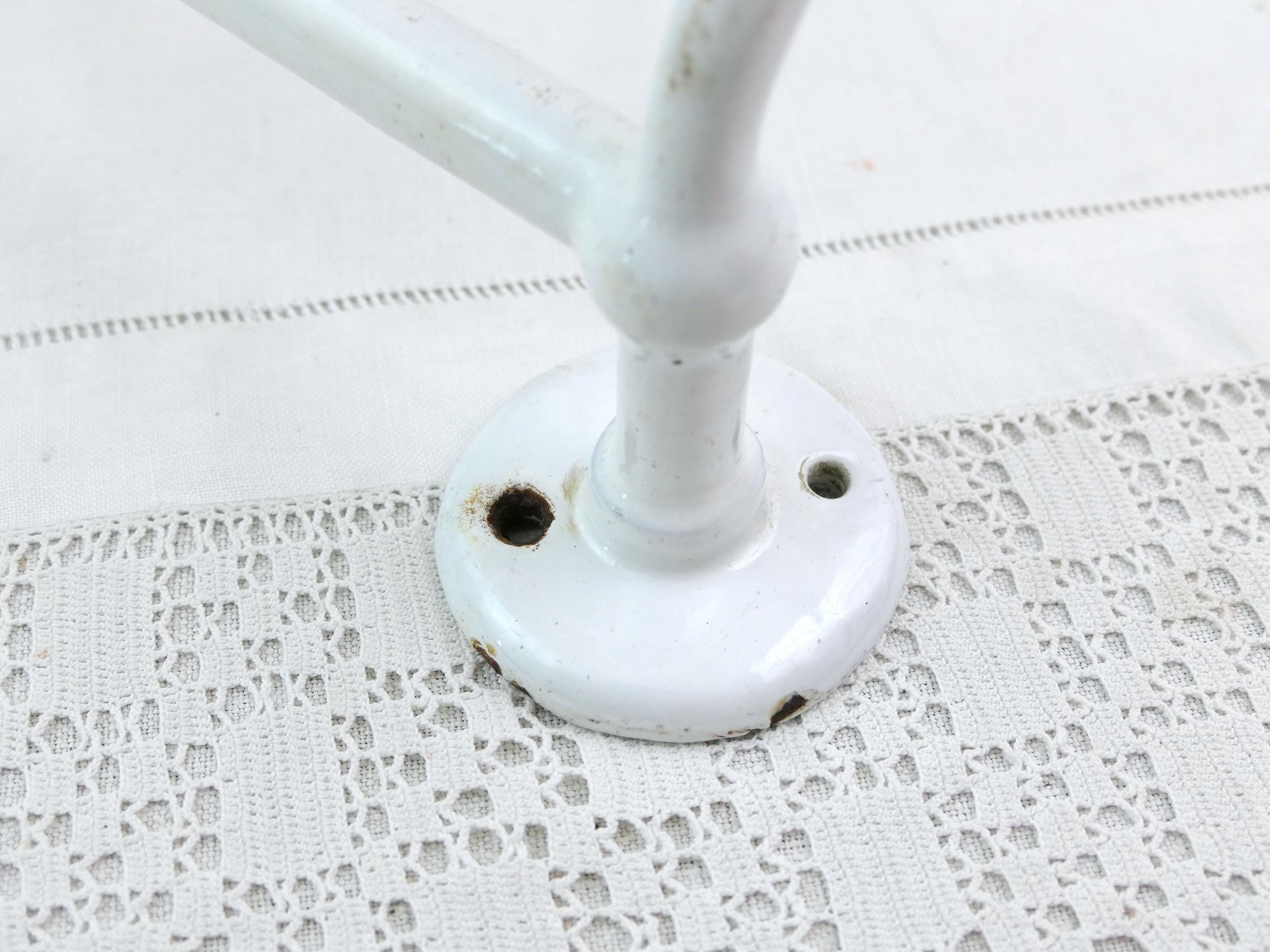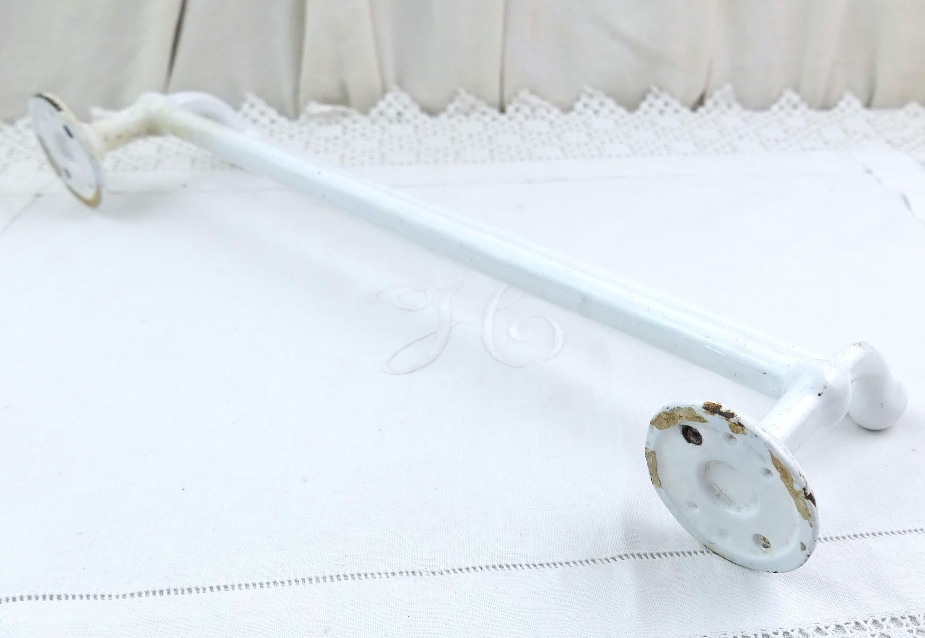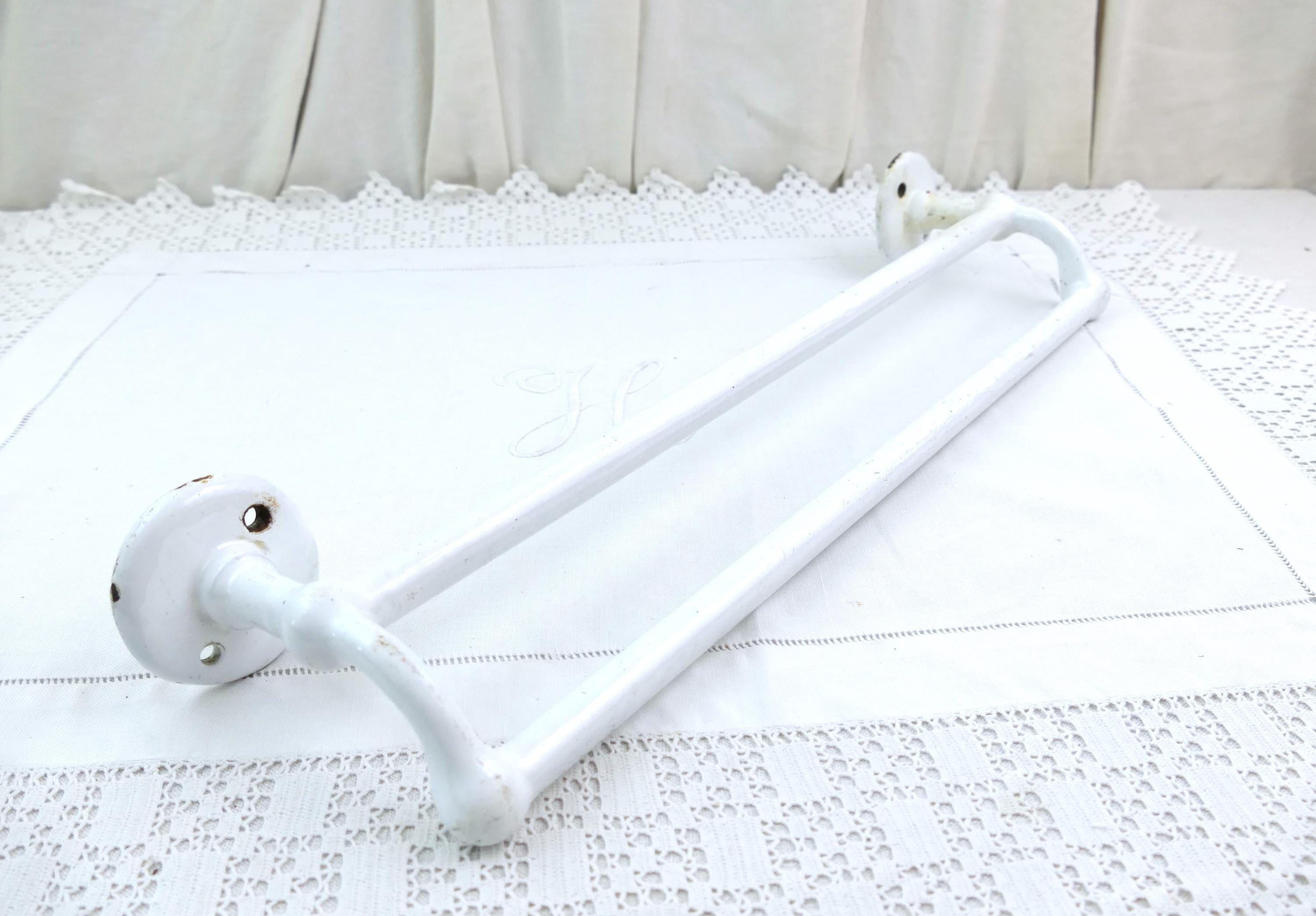 Antique e French double towel rack. Made of white porcelain enameled cast metal. Ca early 1900s.