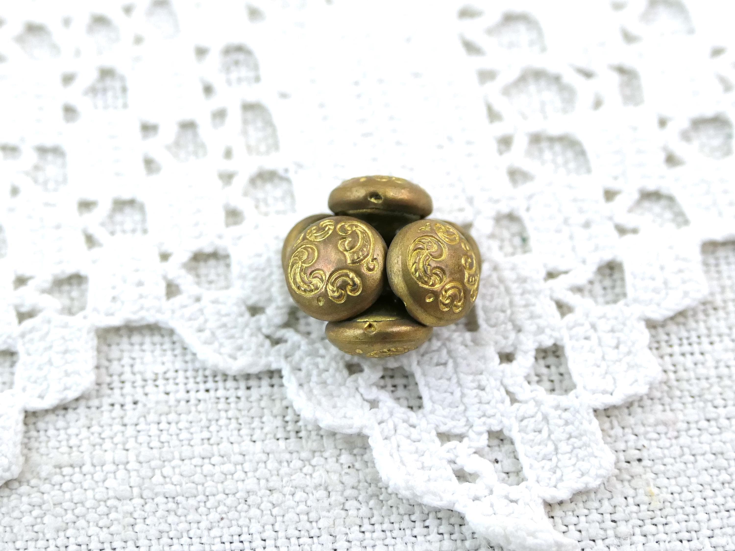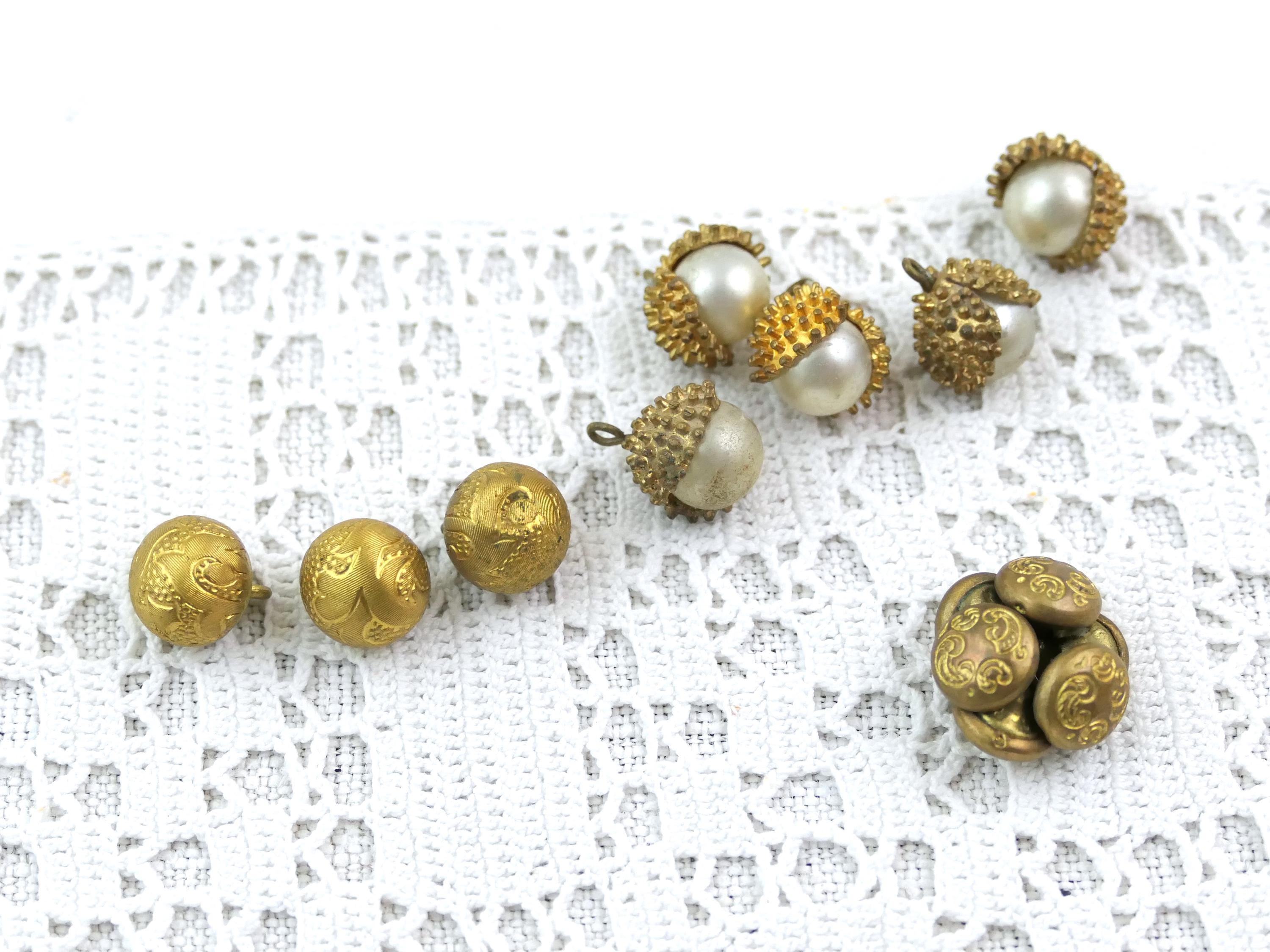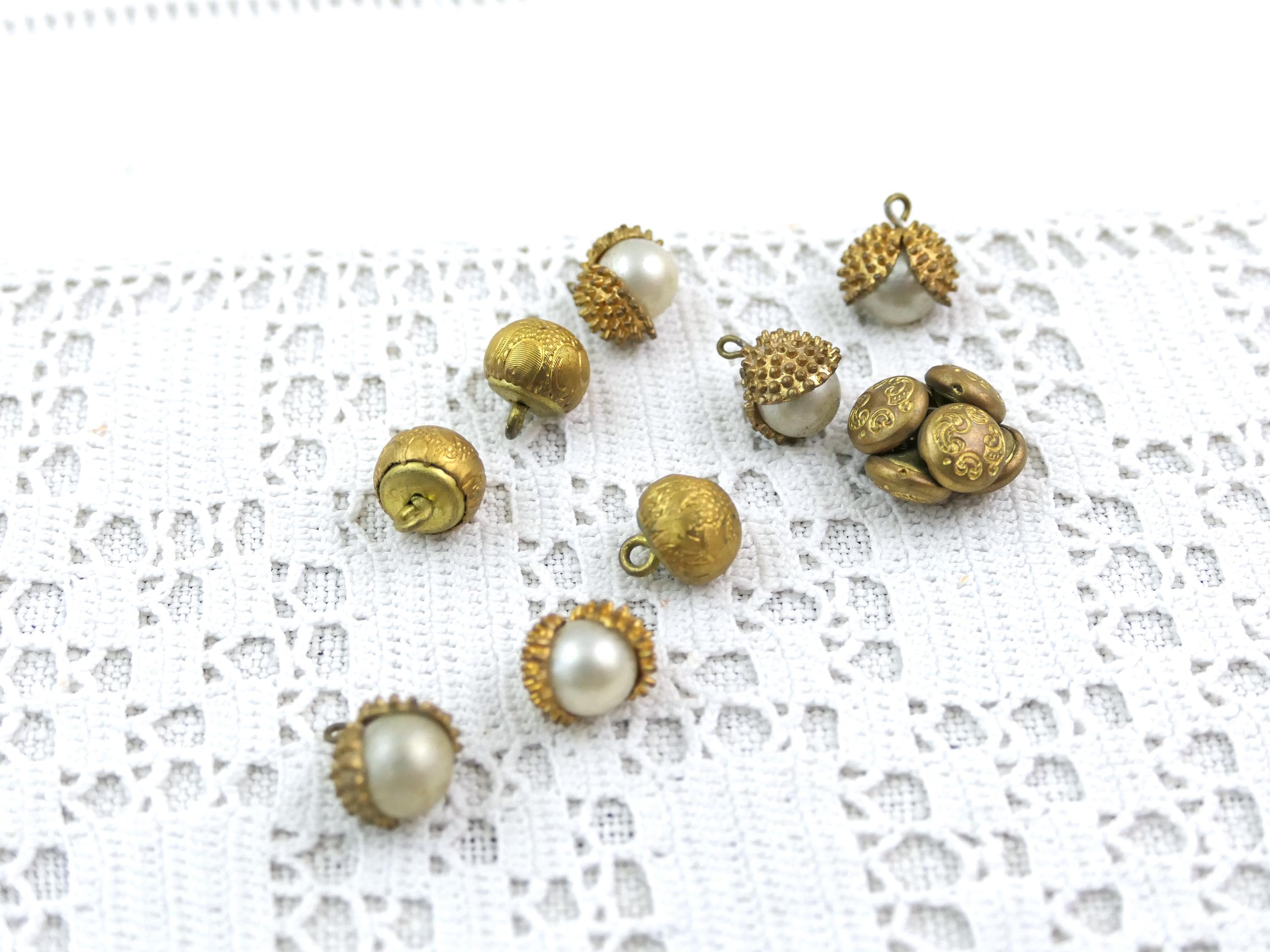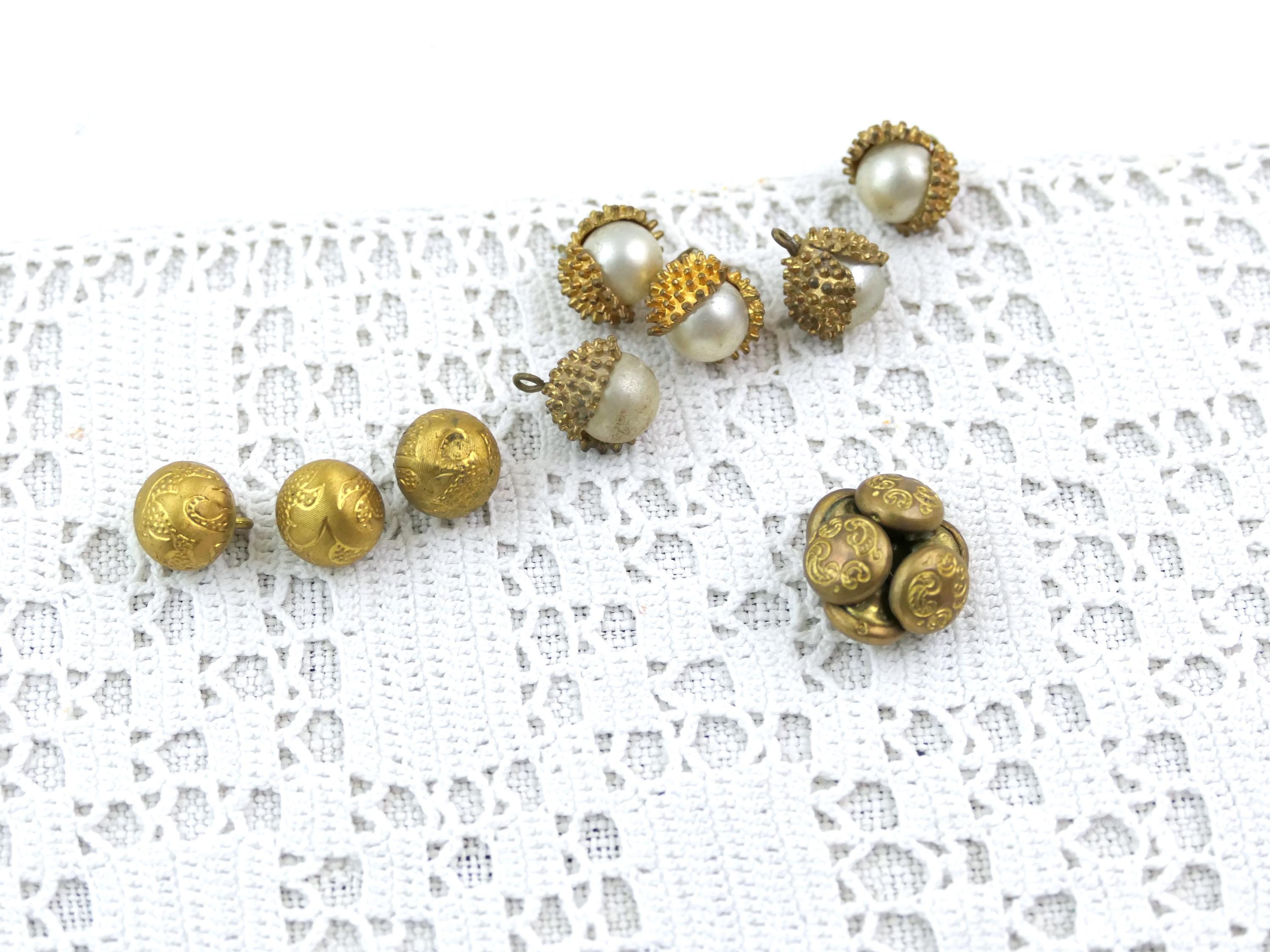 Assorted lot of 14 vintage buttons. Made of gold tone metal with faux pearls. Ca 1940s- 1960s.