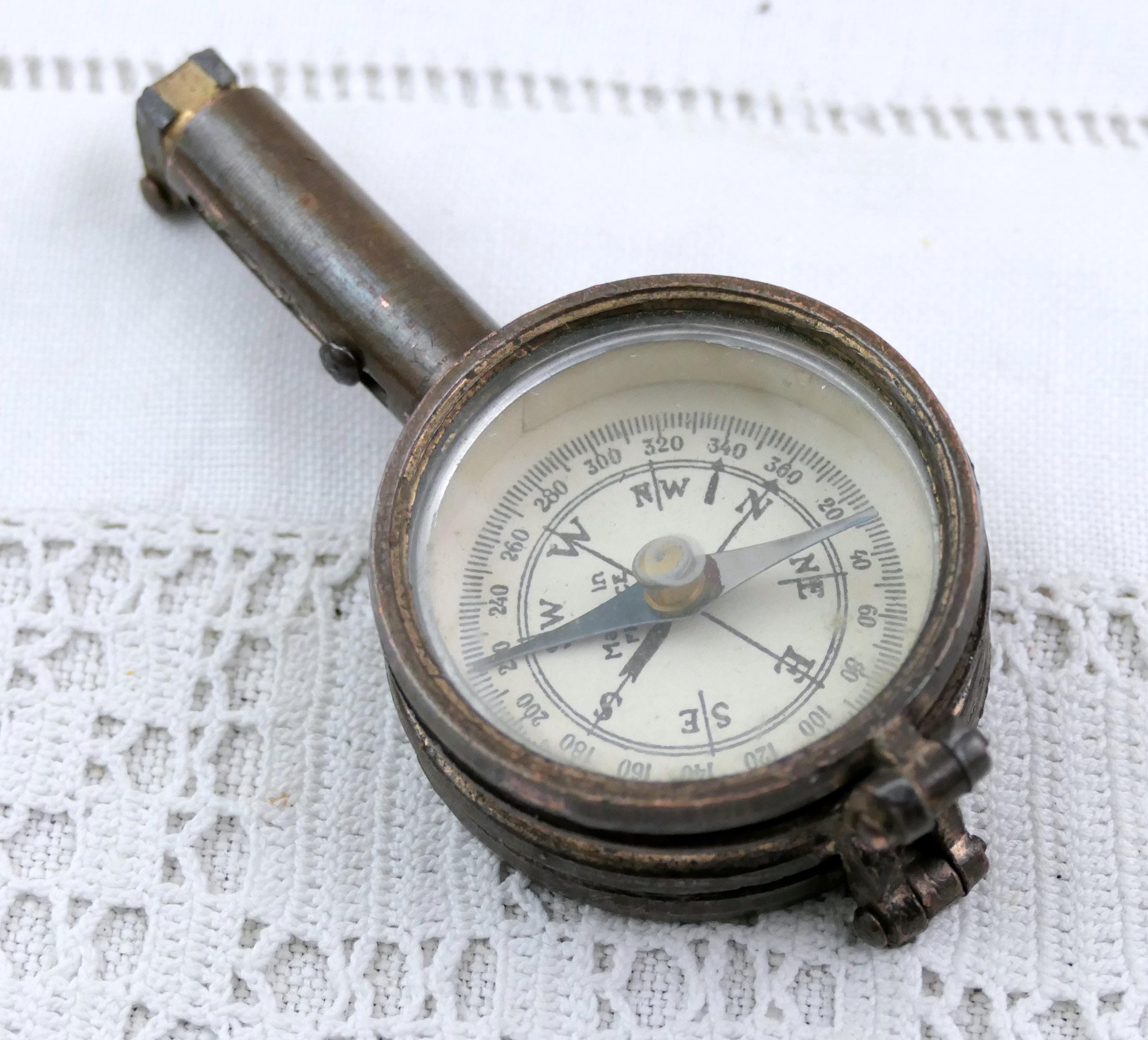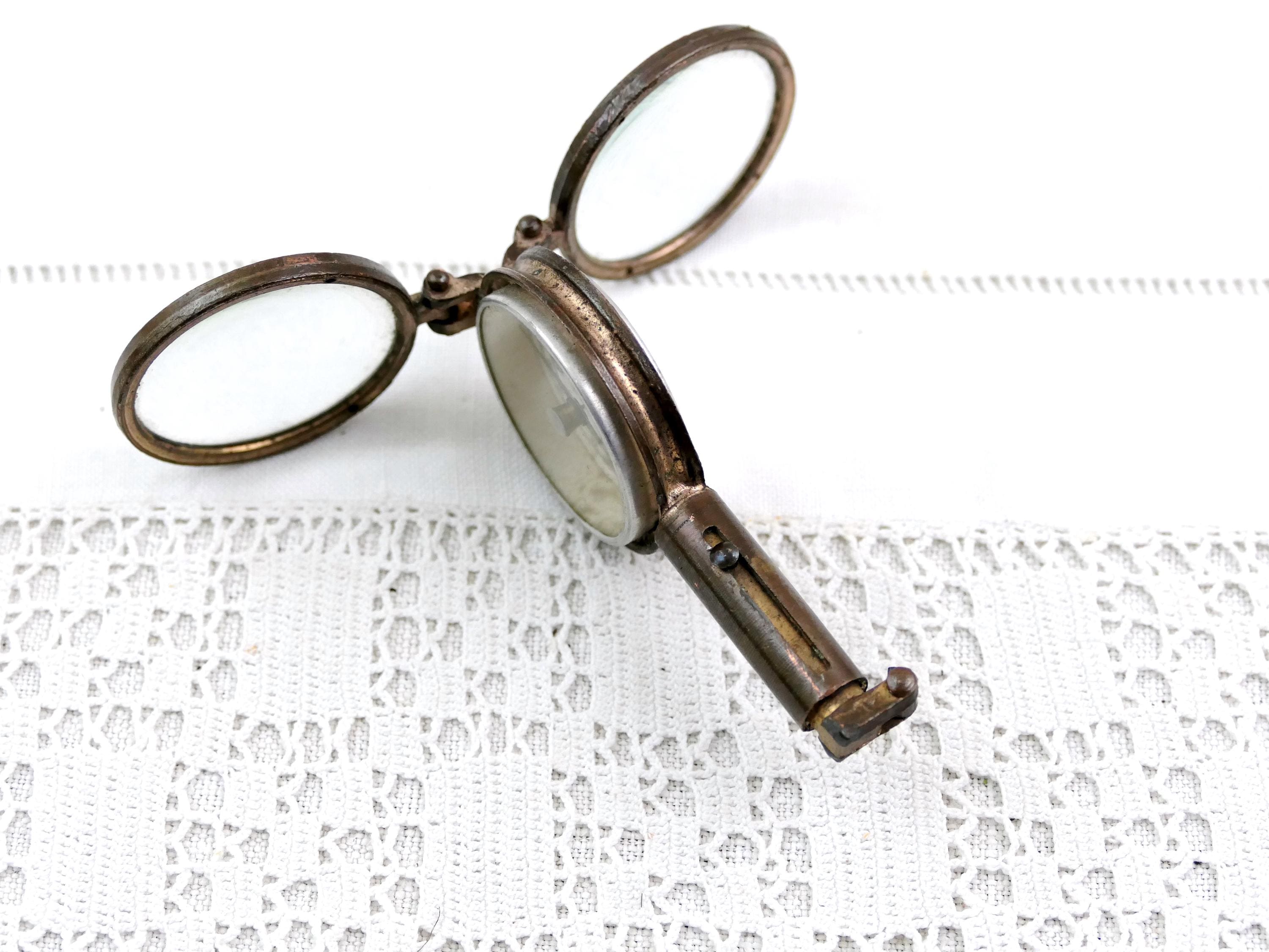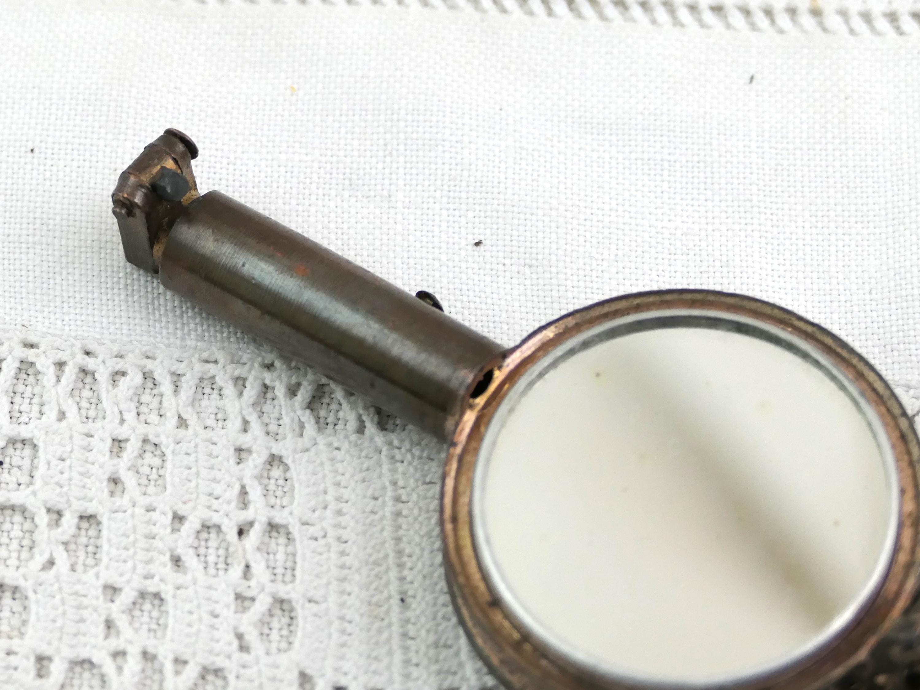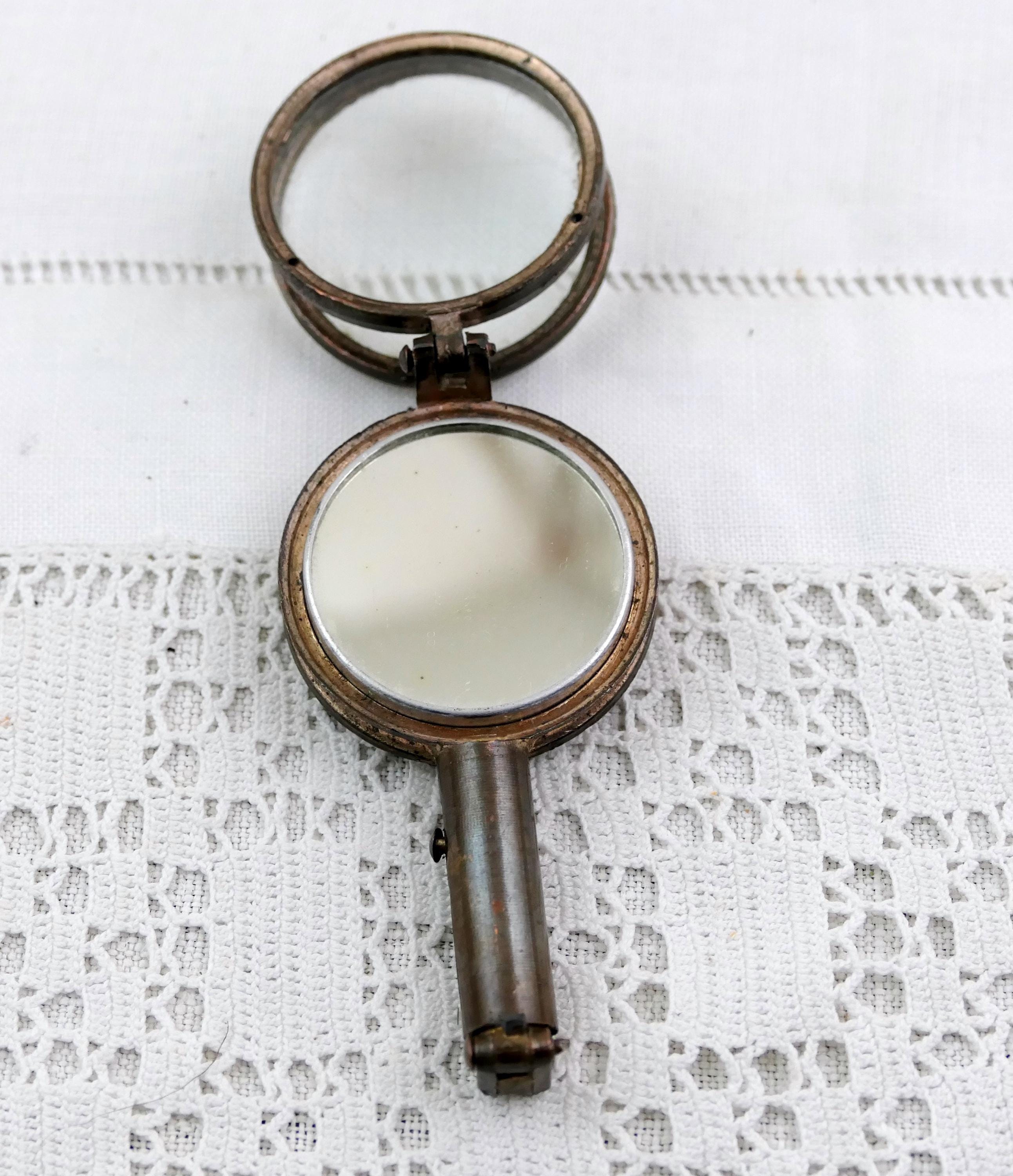 Antique French opera glasses, compass, mirror, magnifying glass all in one. This is a bit like a Swiss army knife, it has numerous functions. It has the compass on one side a small mirror on the other two magnifying lenses that were part of a pair of folding binoculars. Made of blacken metal with glass. Ca late 1800s early 1900s.