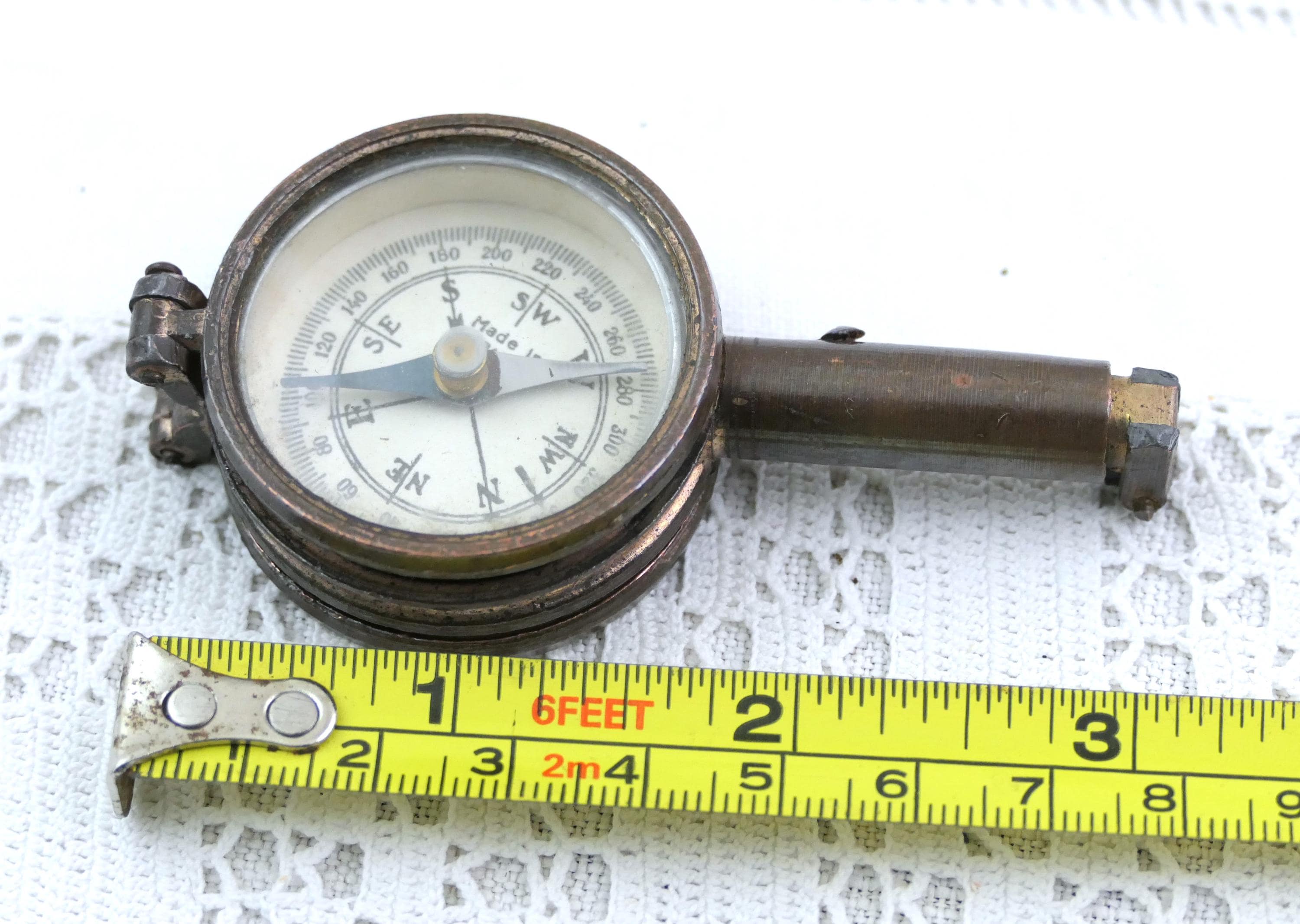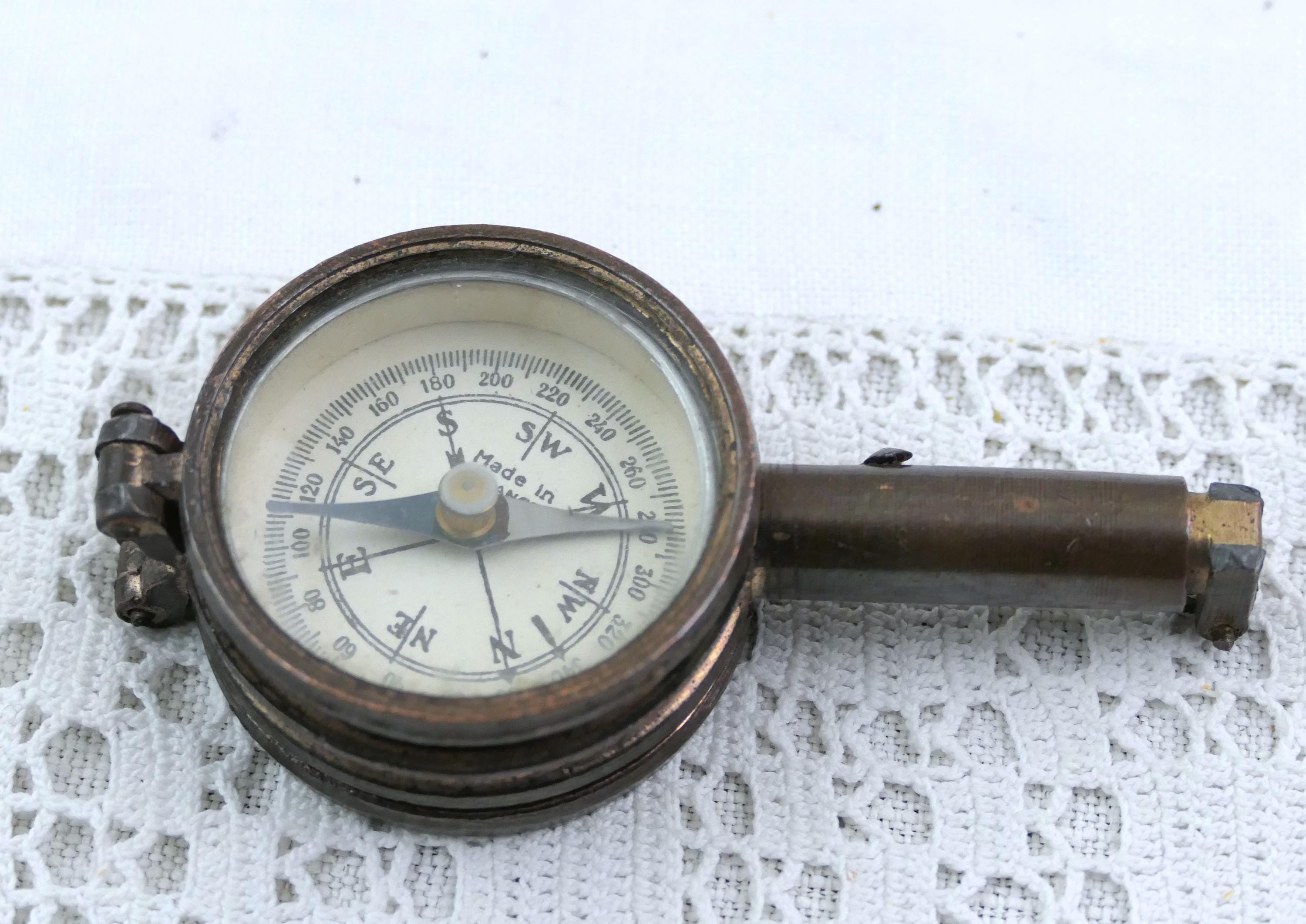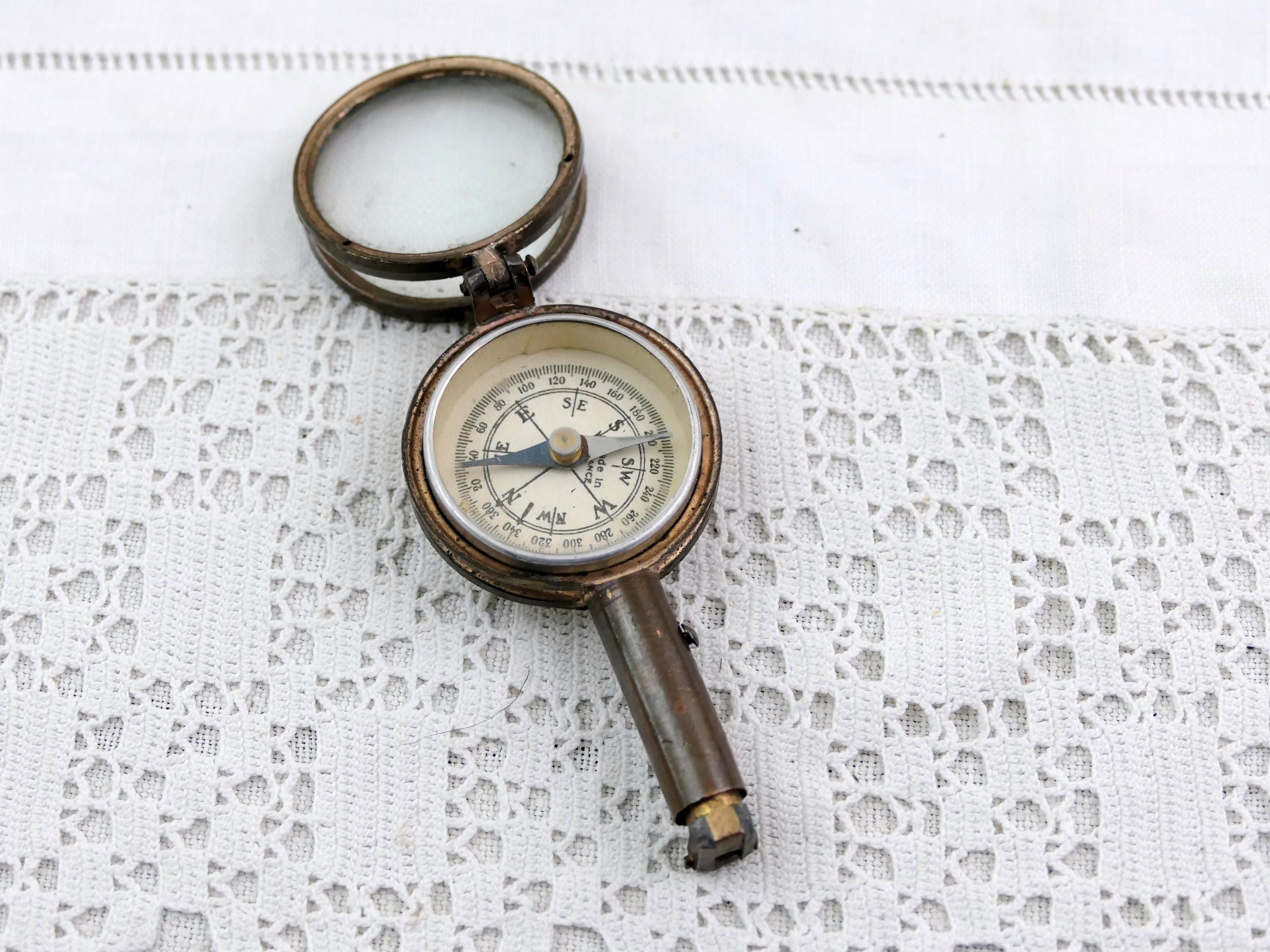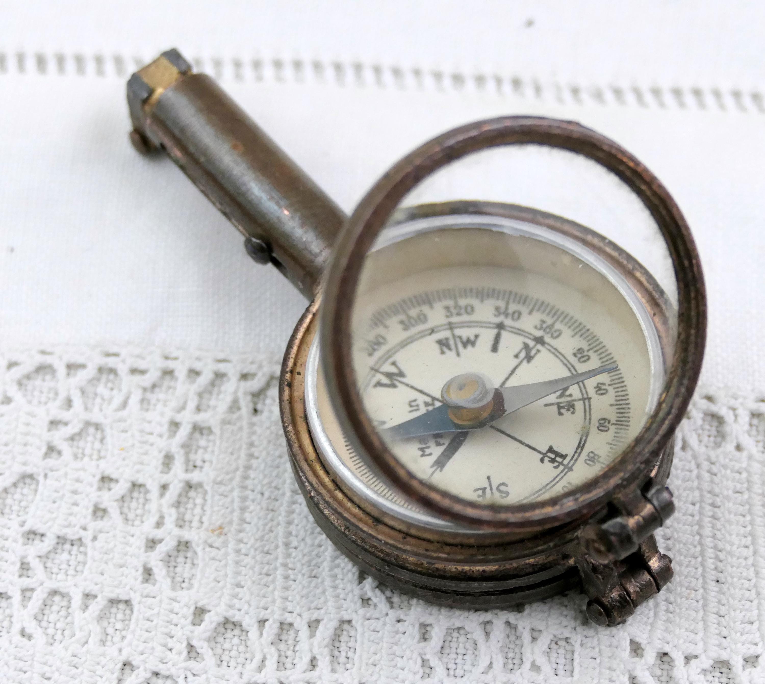 Antique French opera glasses, compass, mirror, magnifying glass all in one. This is a bit like a Swiss army knife, it has numerous functions. It has the compass on one side a small mirror on the other two magnifying lenses that were part of a pair of folding binoculars. Made of blacken metal with glass. Ca late 1800s early 1900s.