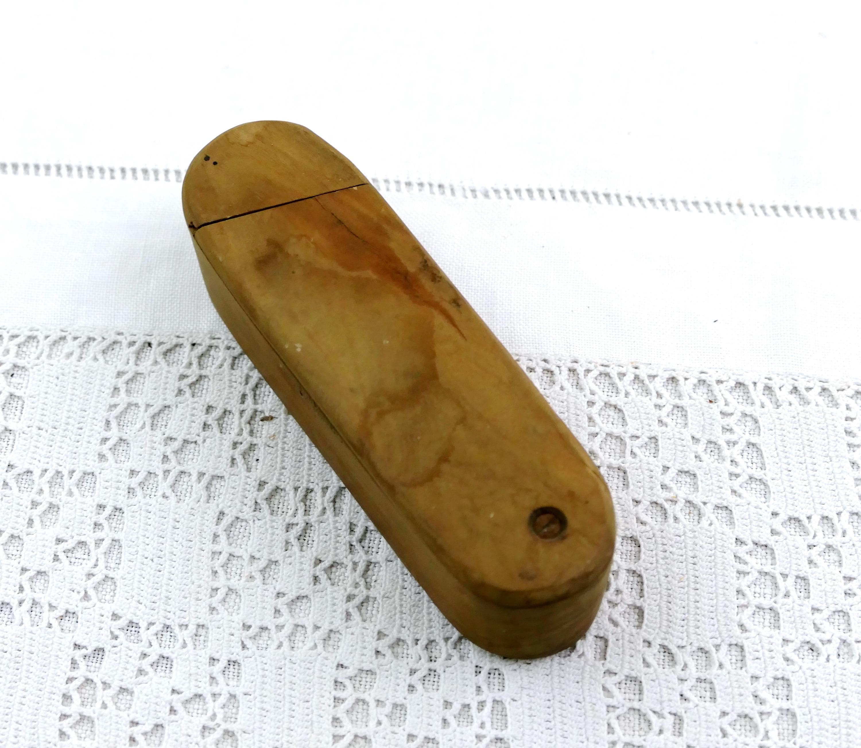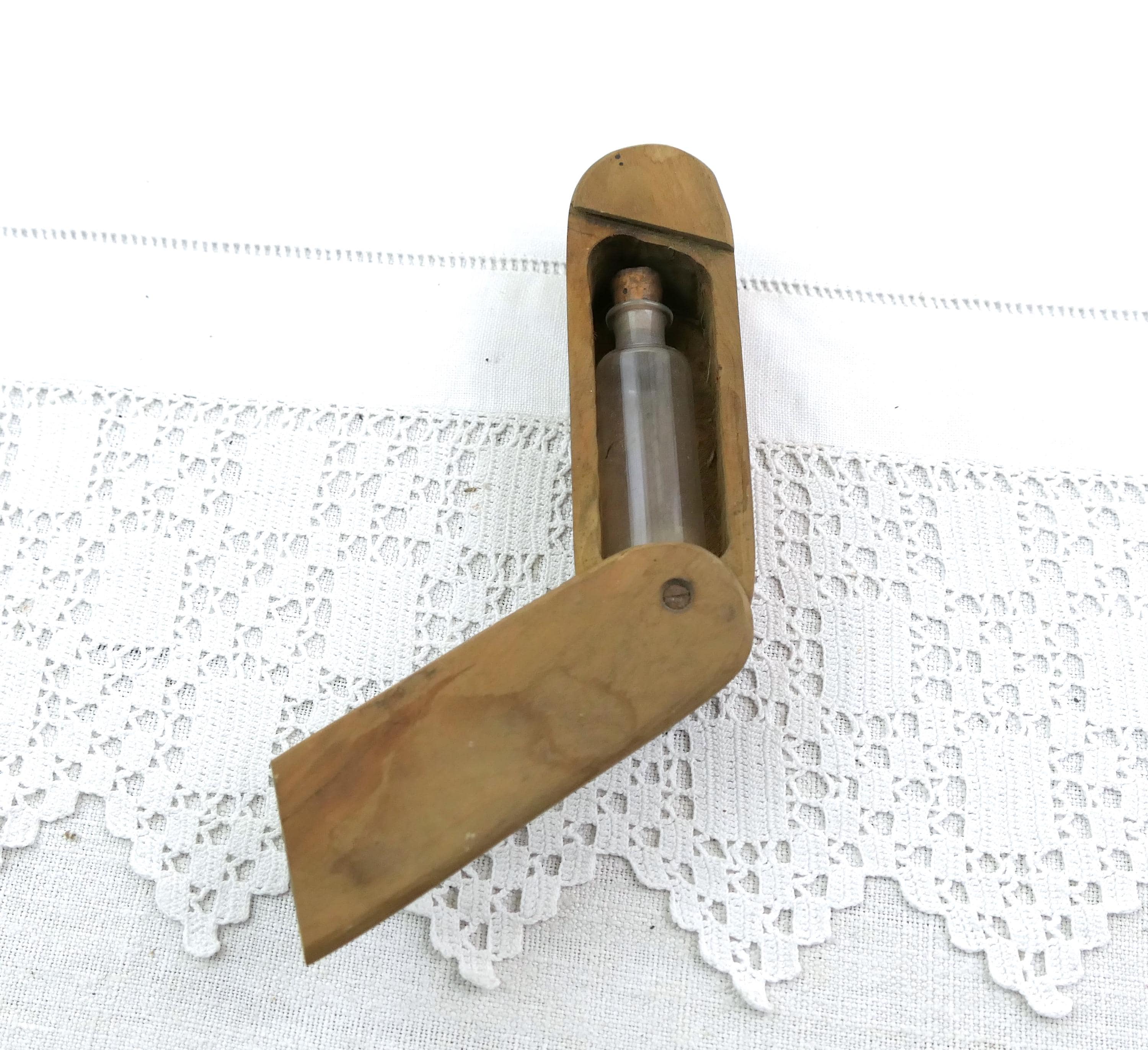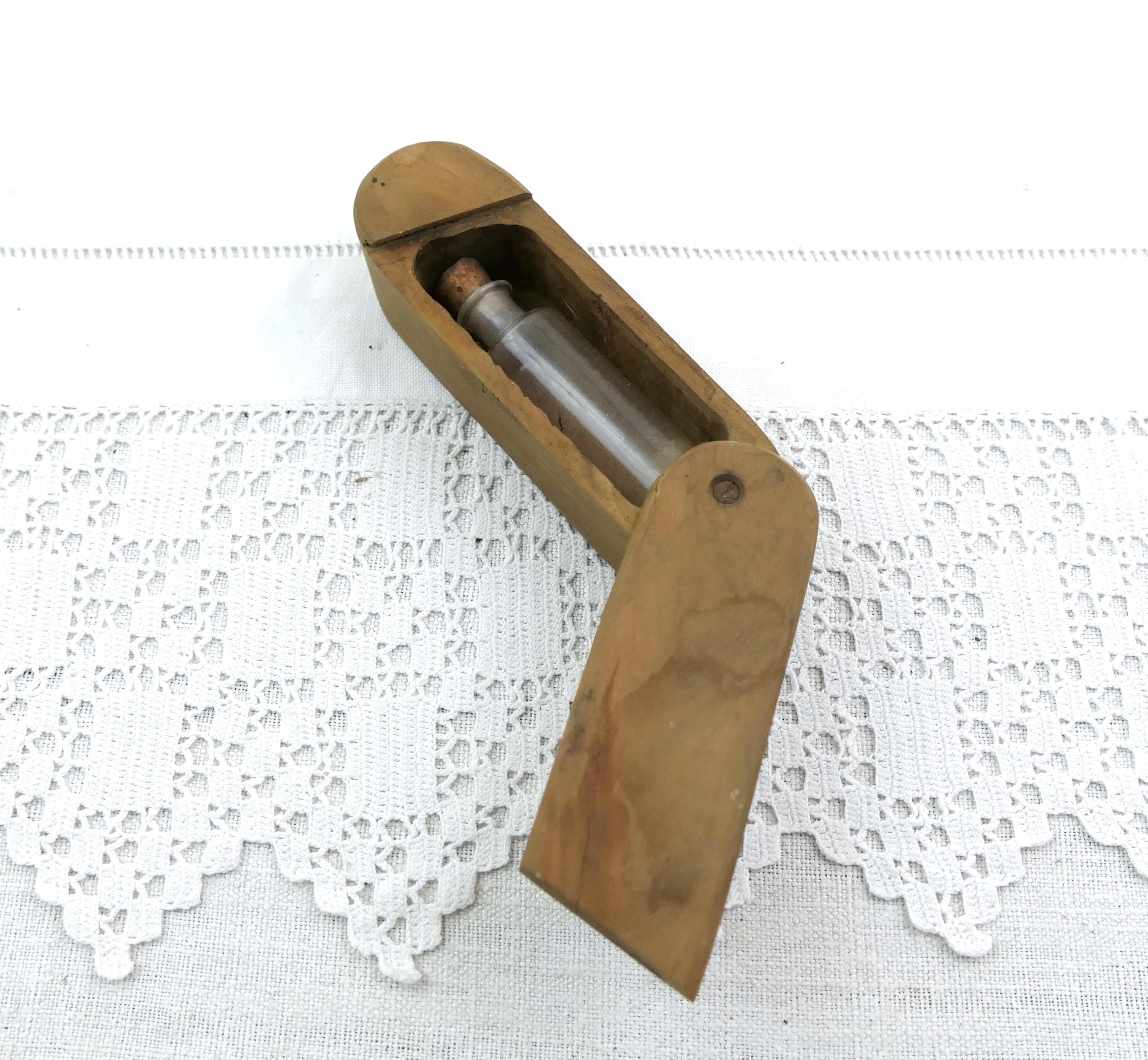 Small antique French glass bottle in a primitive wooden protective case. Made of wood with glass and cork. Ca late 1800s early 1900s