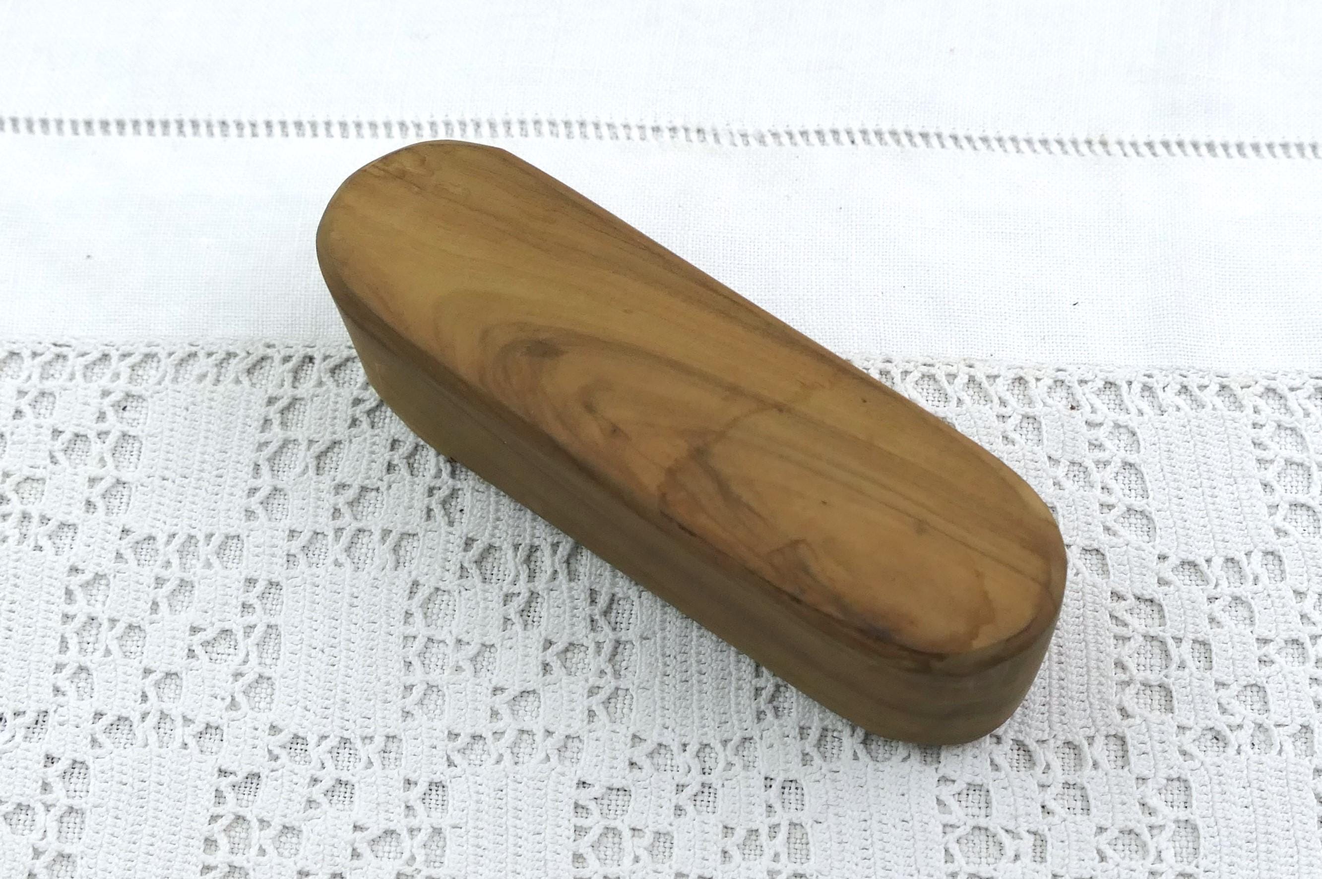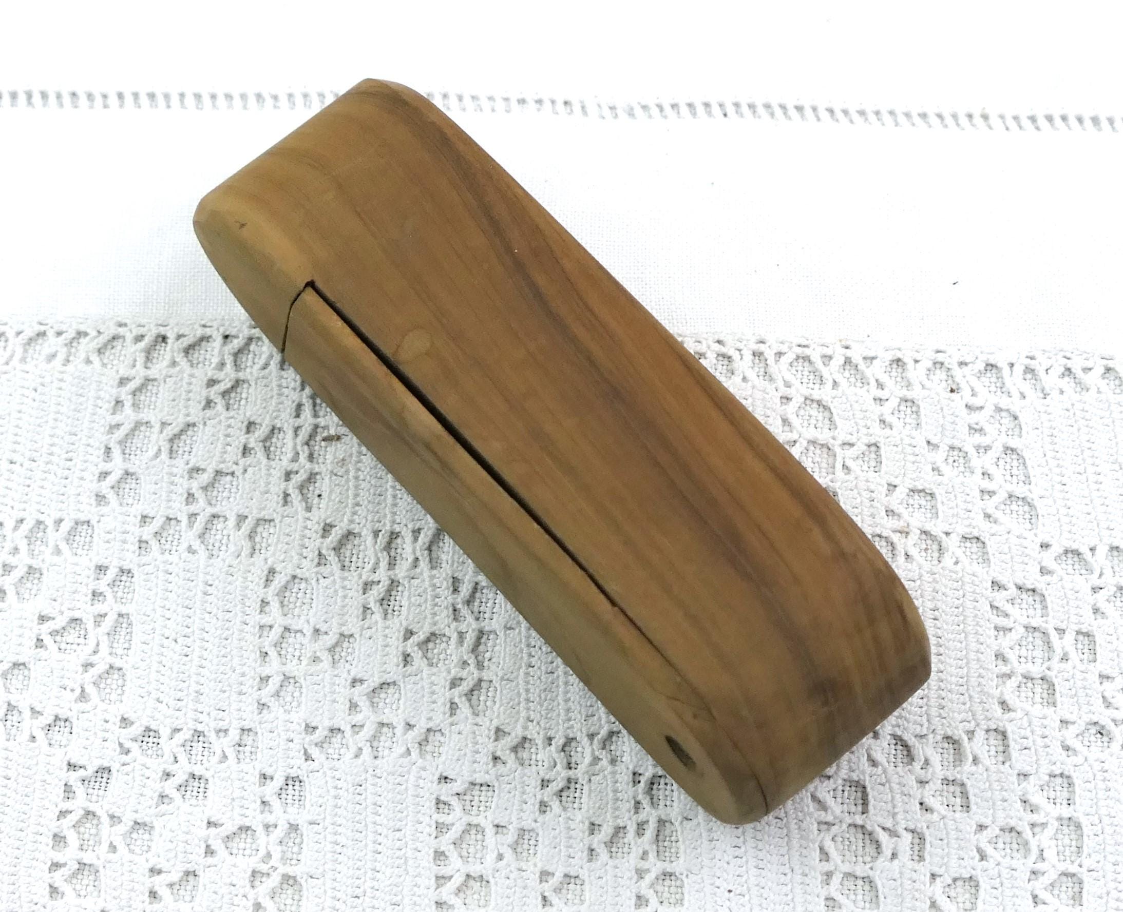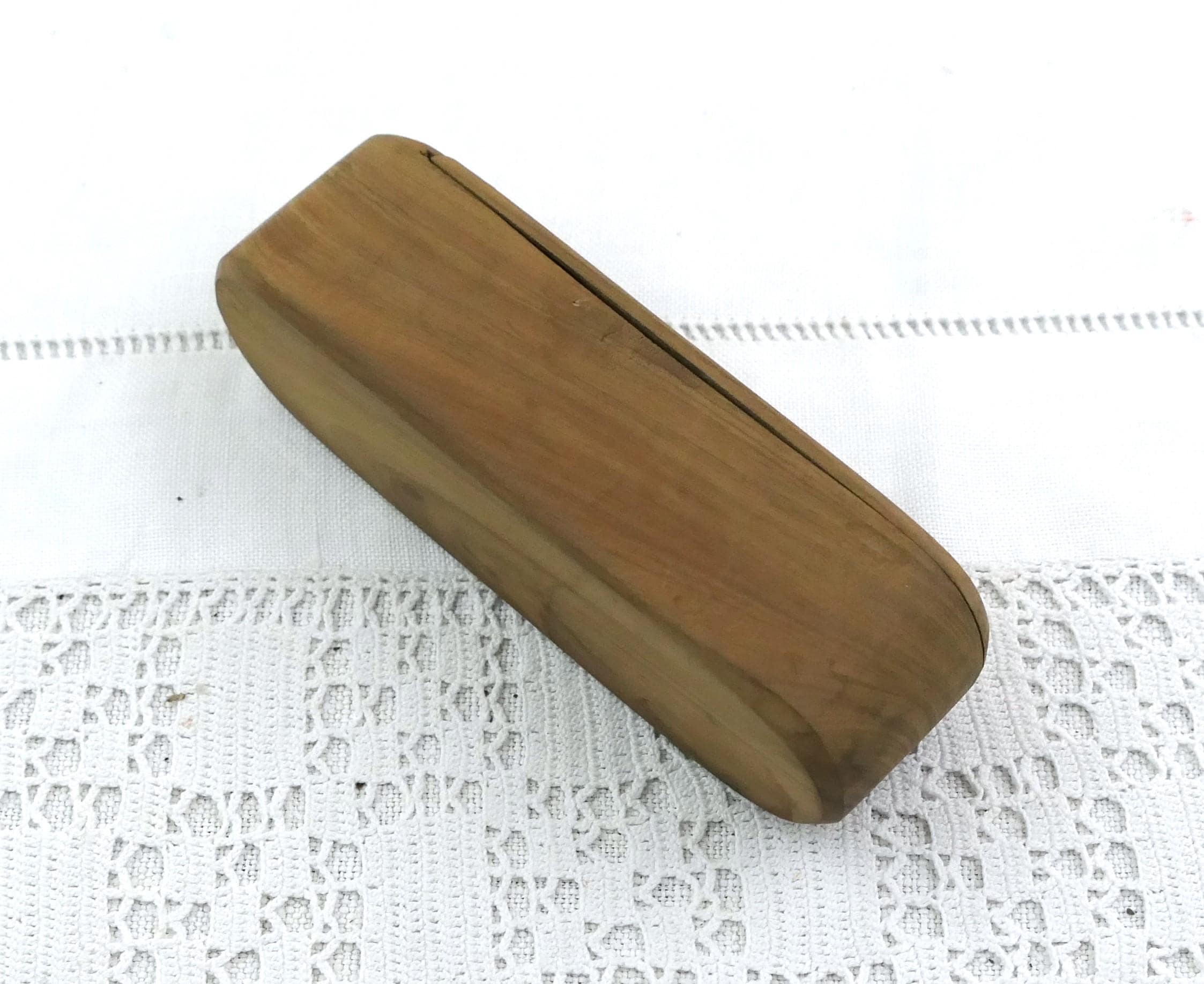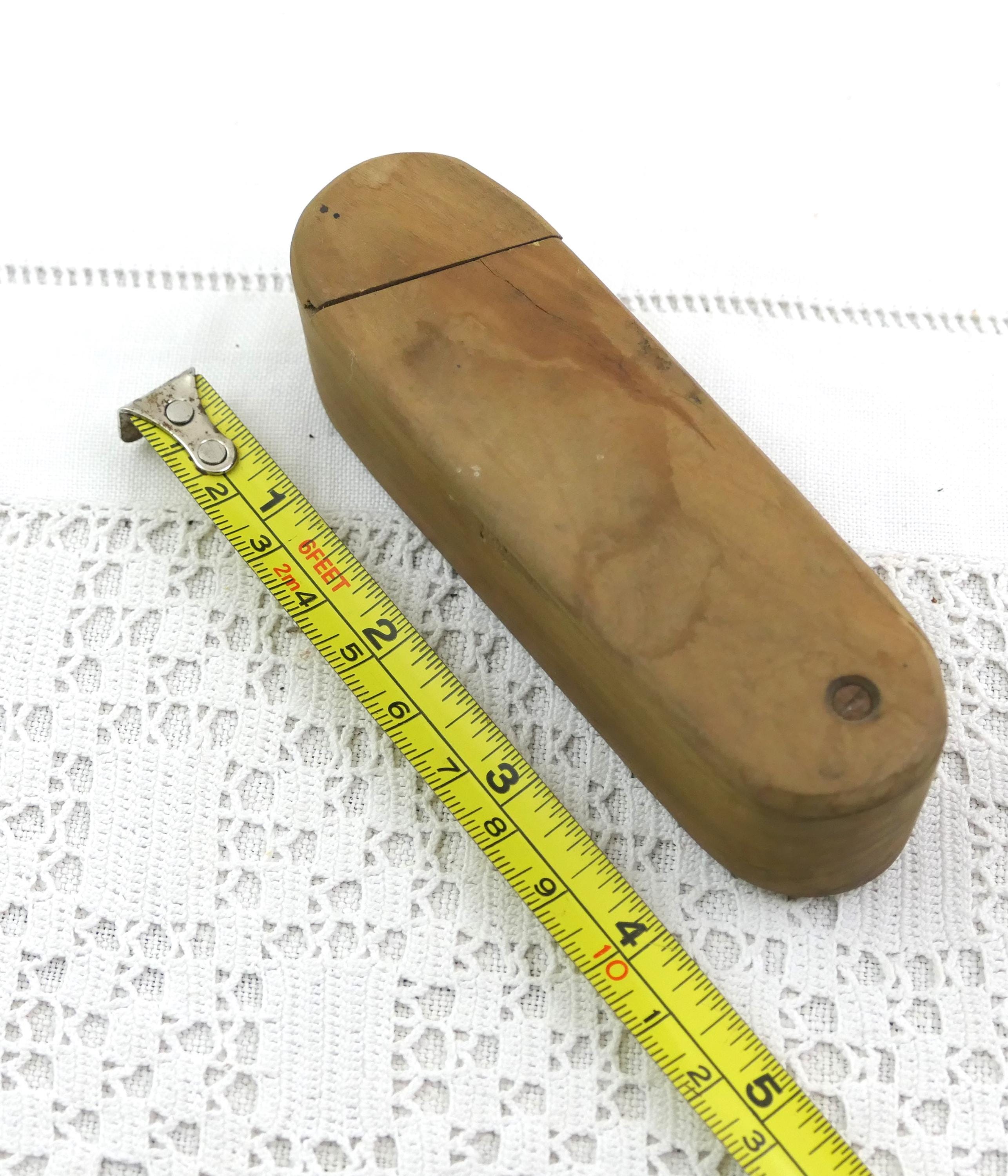 Small antique French glass bottle in a primitive wooden protective case. Made of wood with glass and cork. Ca late 1800s early 1900s