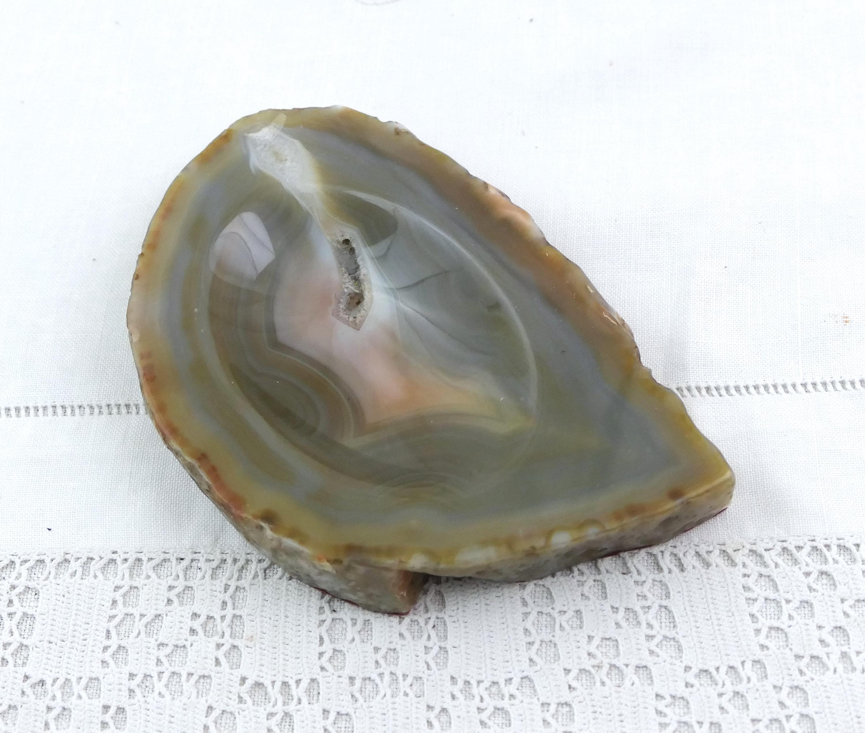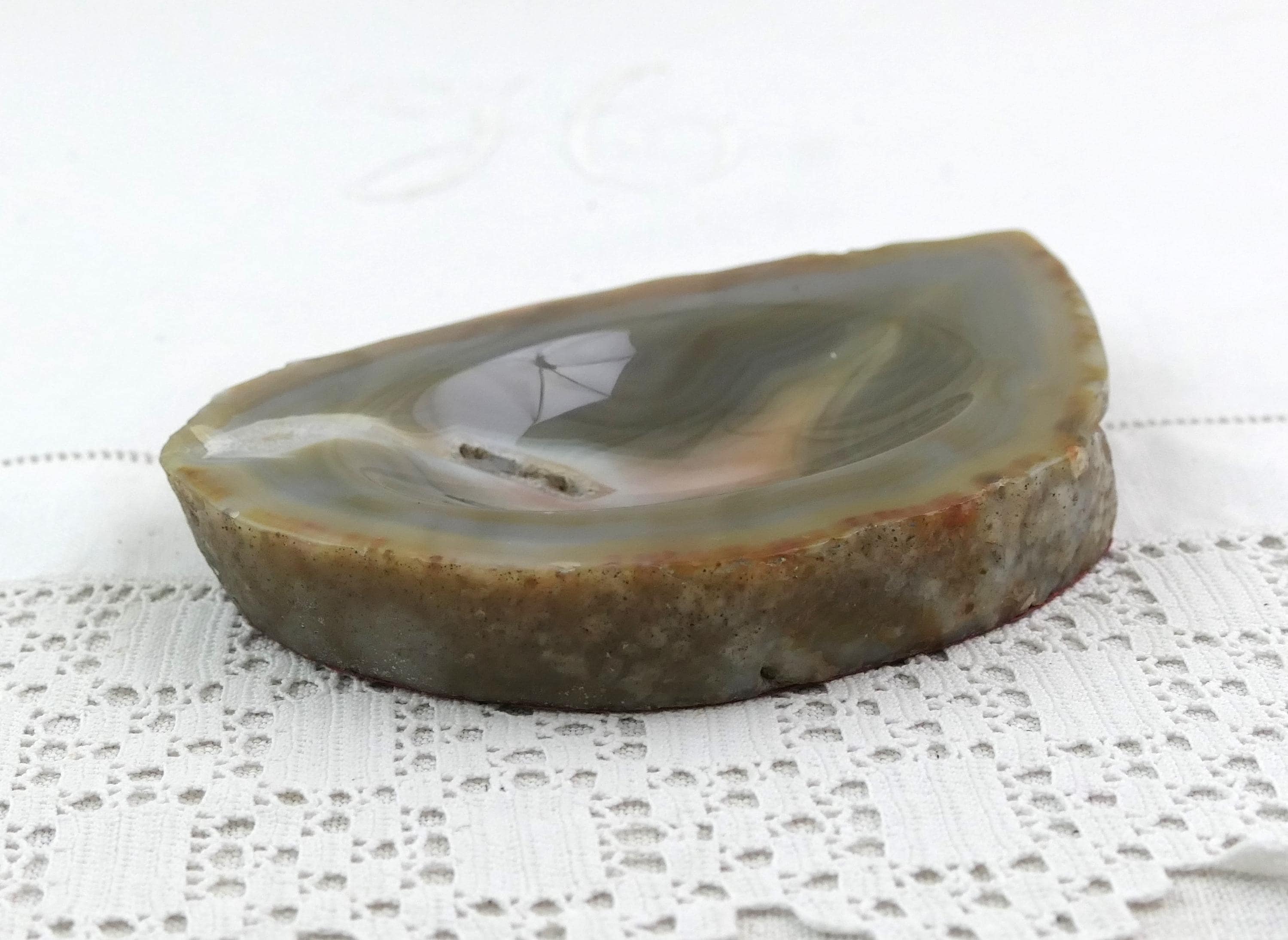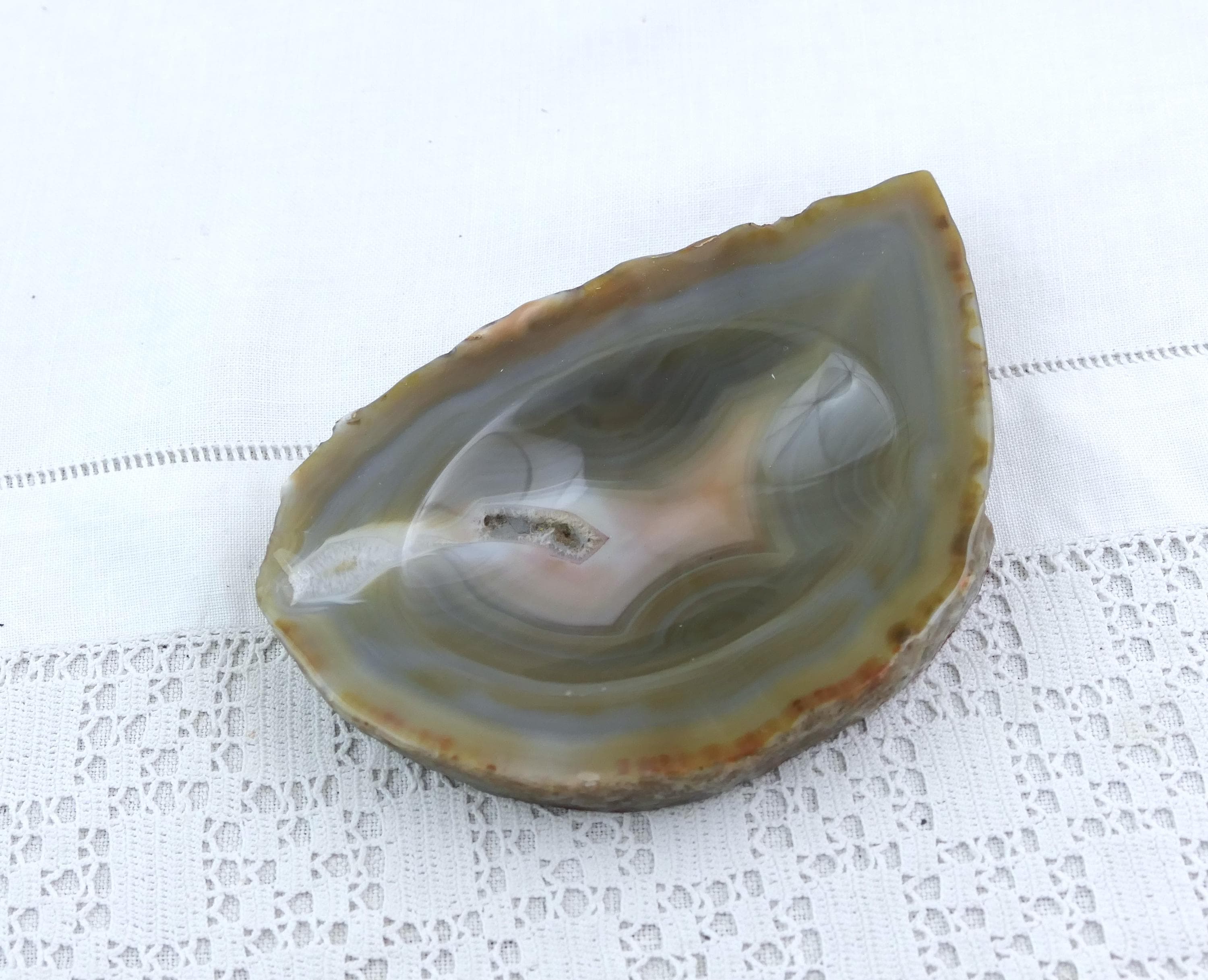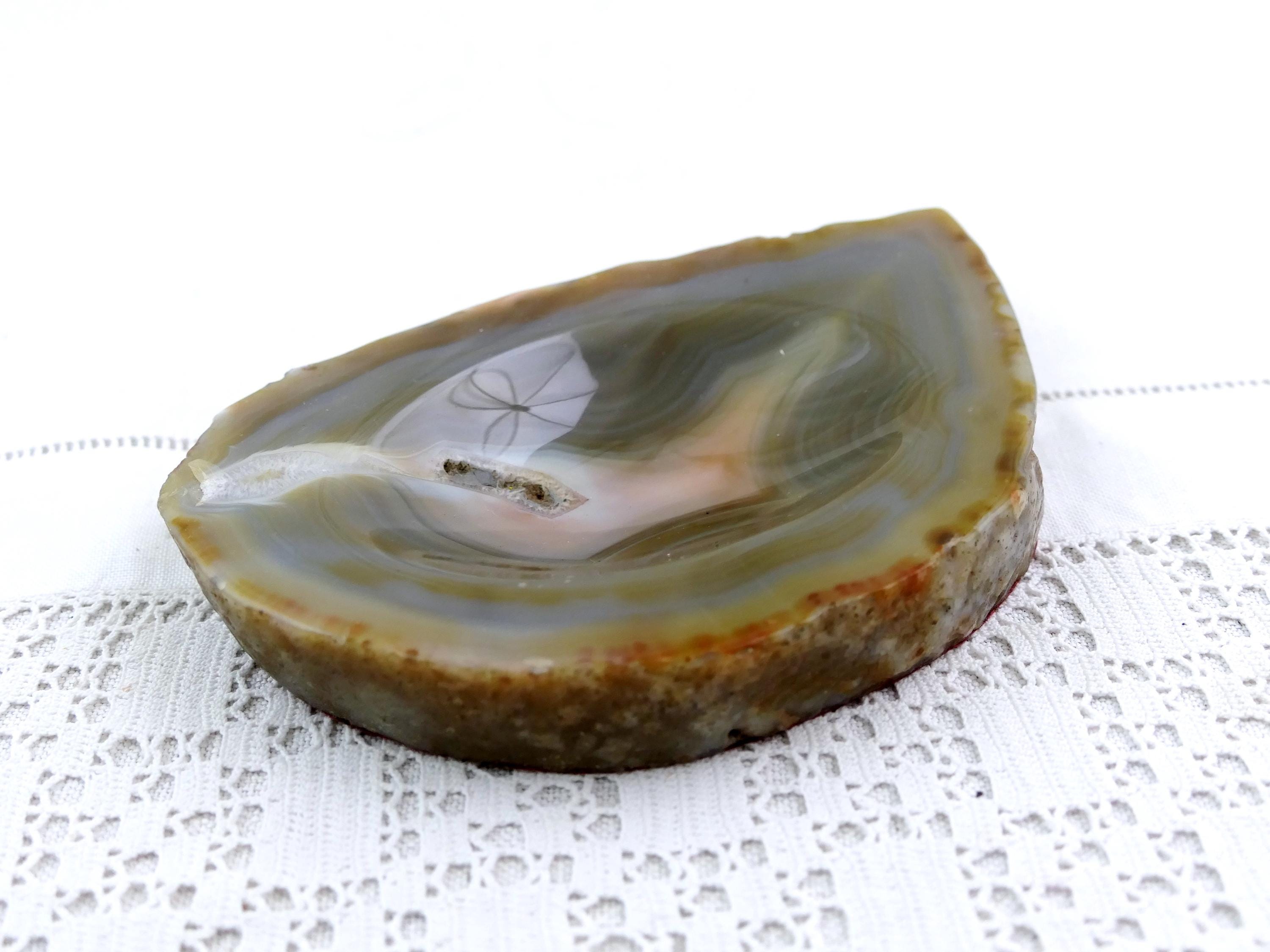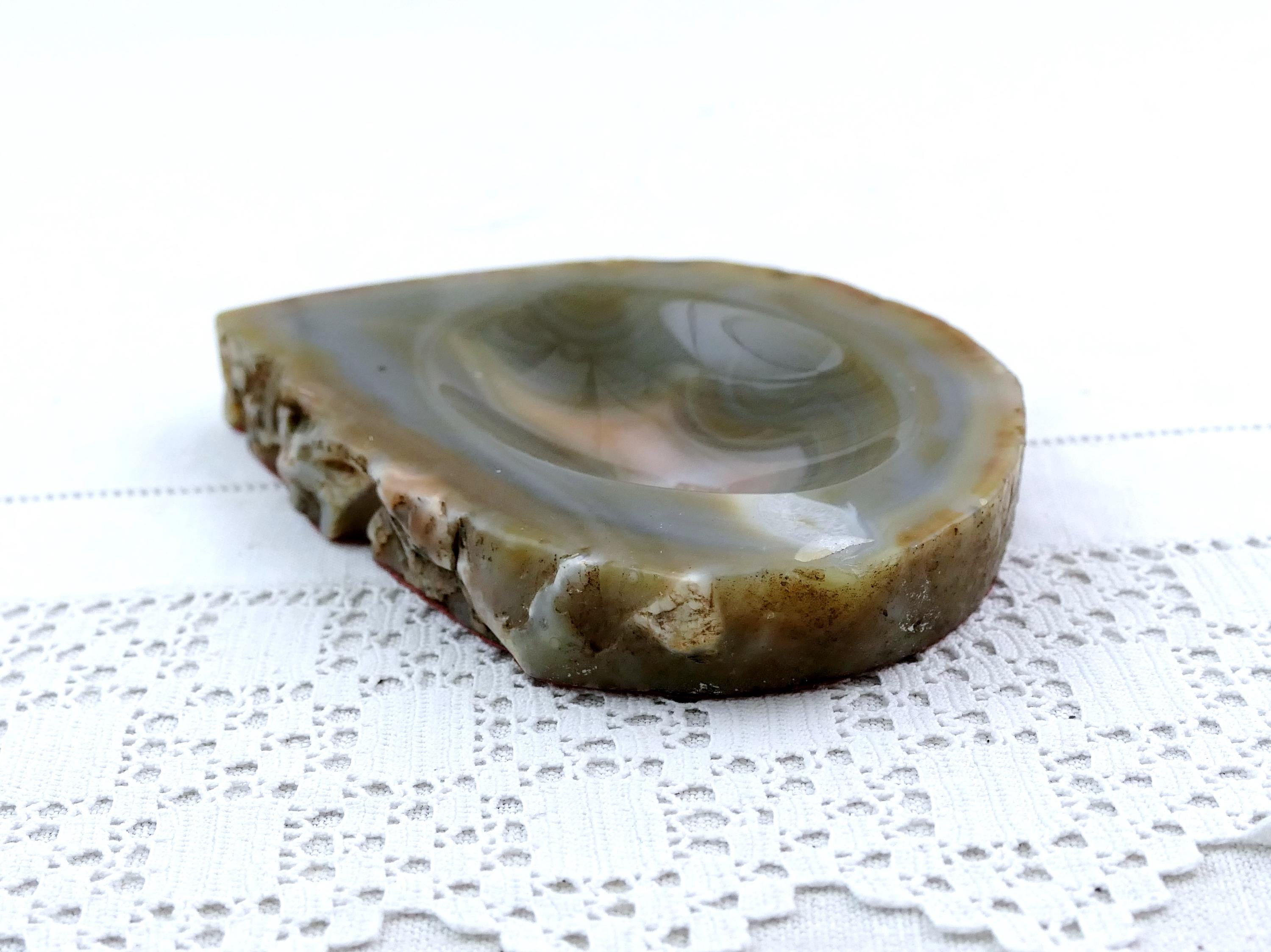 Vintage polished stone ashtray. Made from a slice of burnt blue gray agate nodule. Circa 1970s.