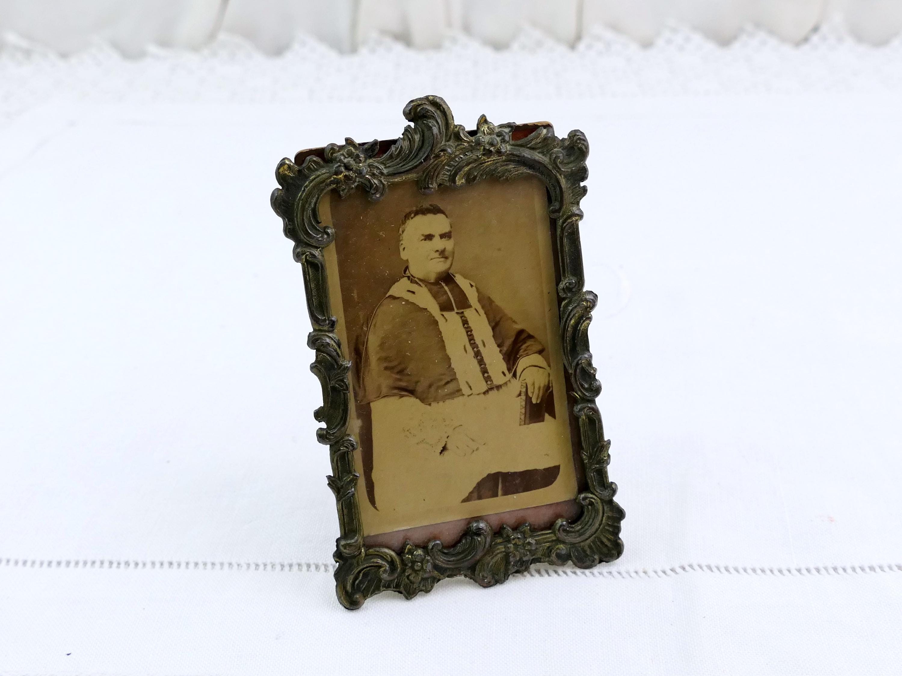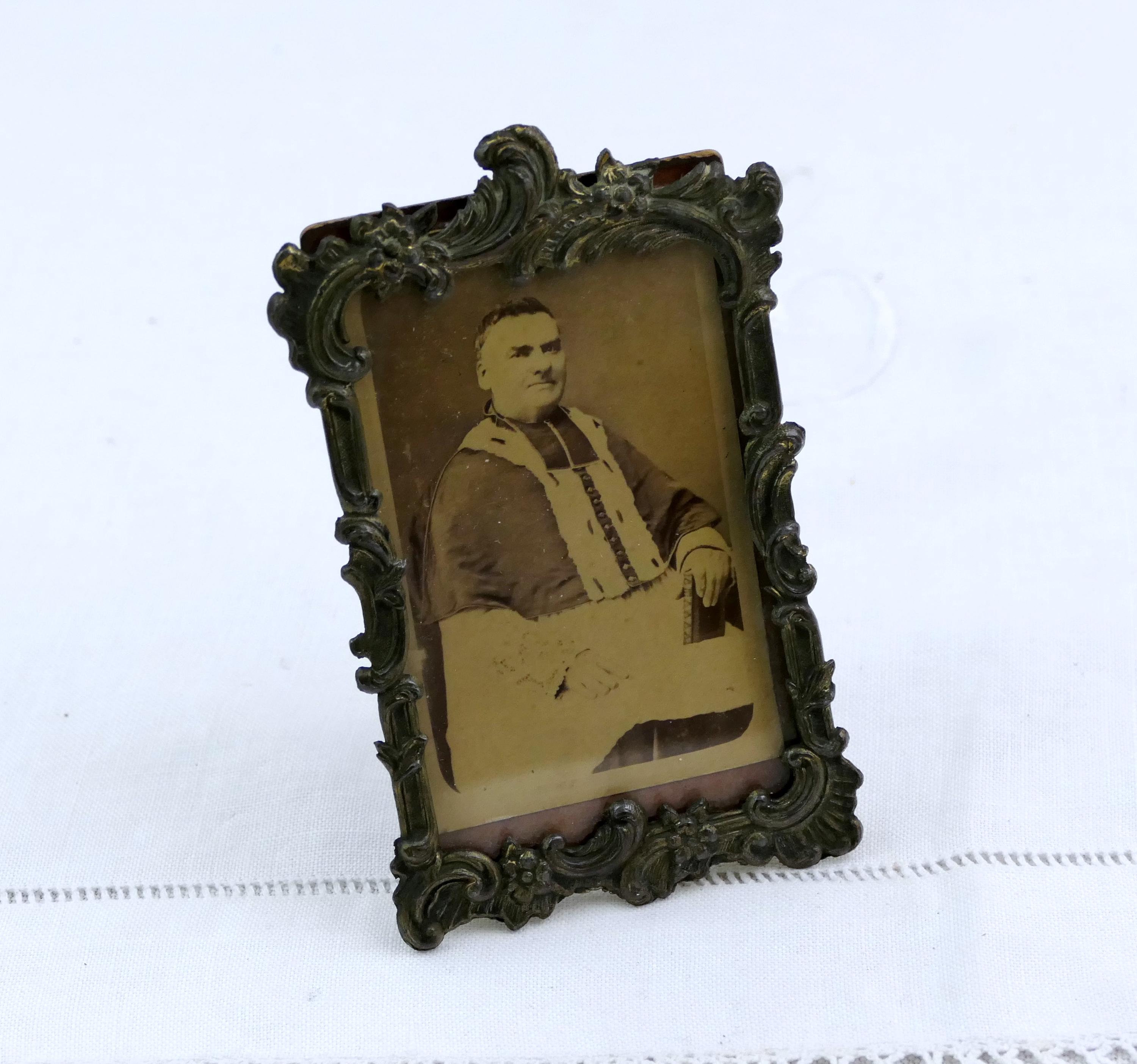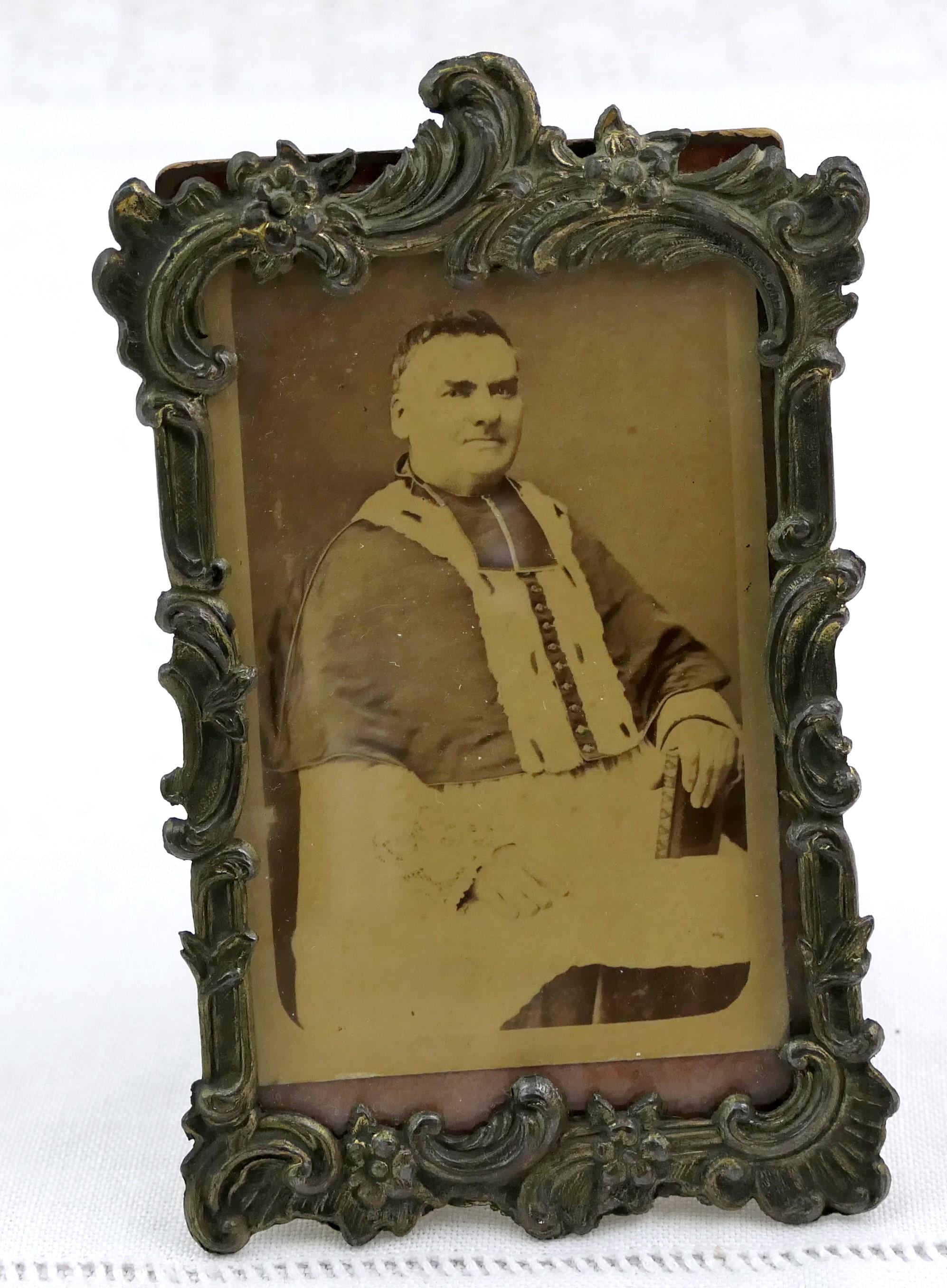 Antique ornate frame with photograph of catholic clergyman. Made of embossed metal with glass. Ca 1800s.