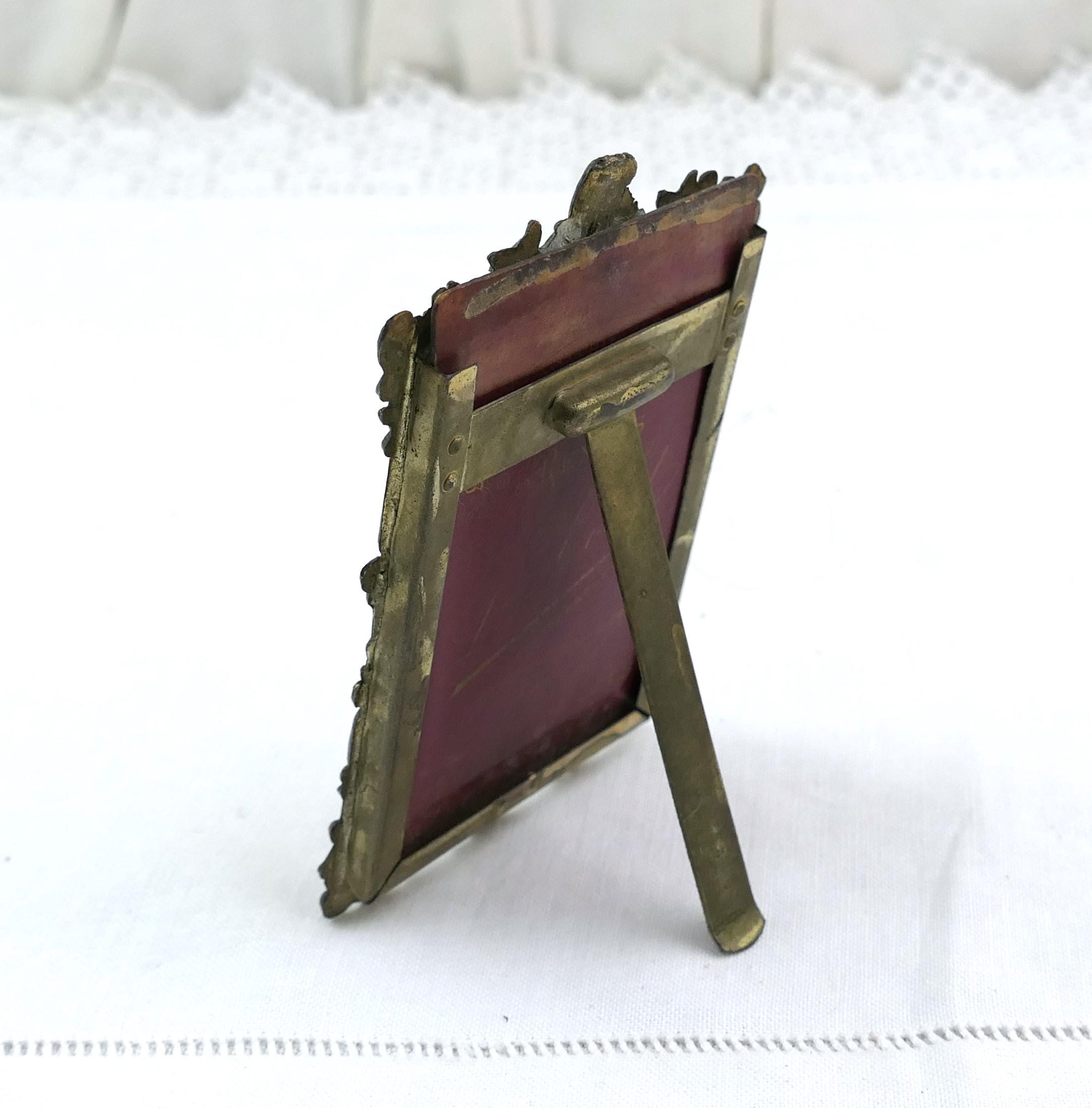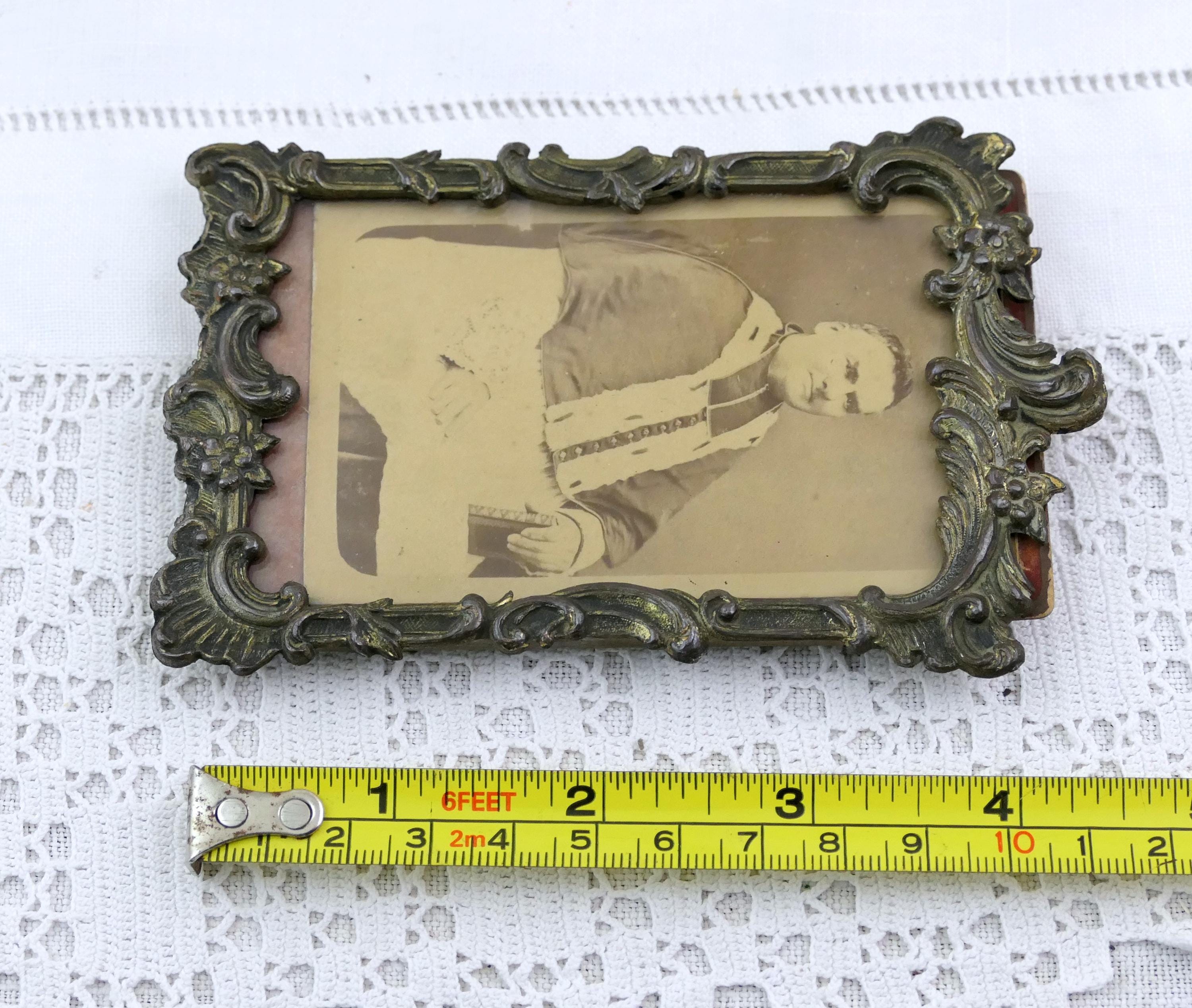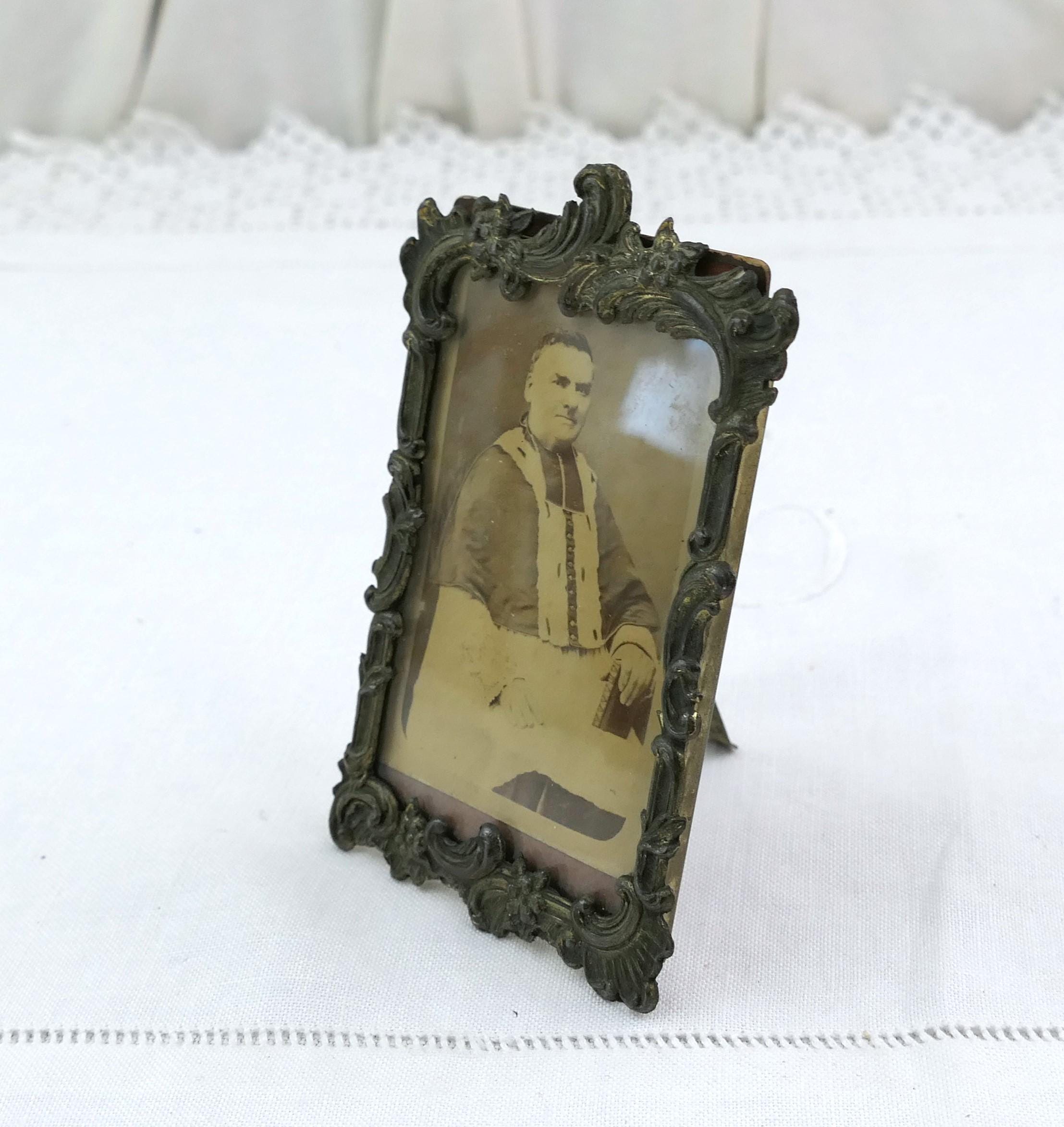 Antique ornate frame with photograph of catholic clergyman. Made of embossed metal with glass. Ca 1800s.