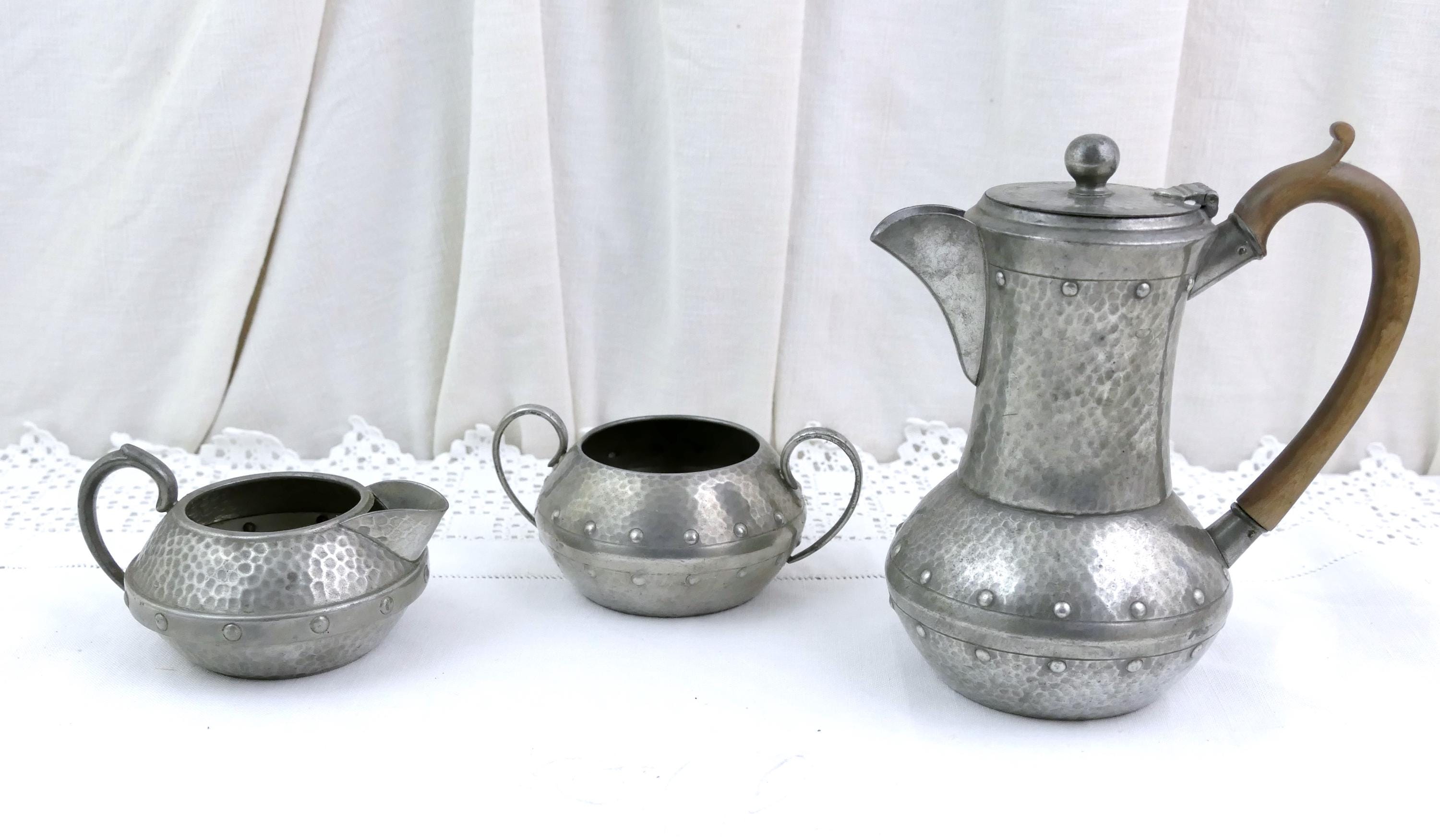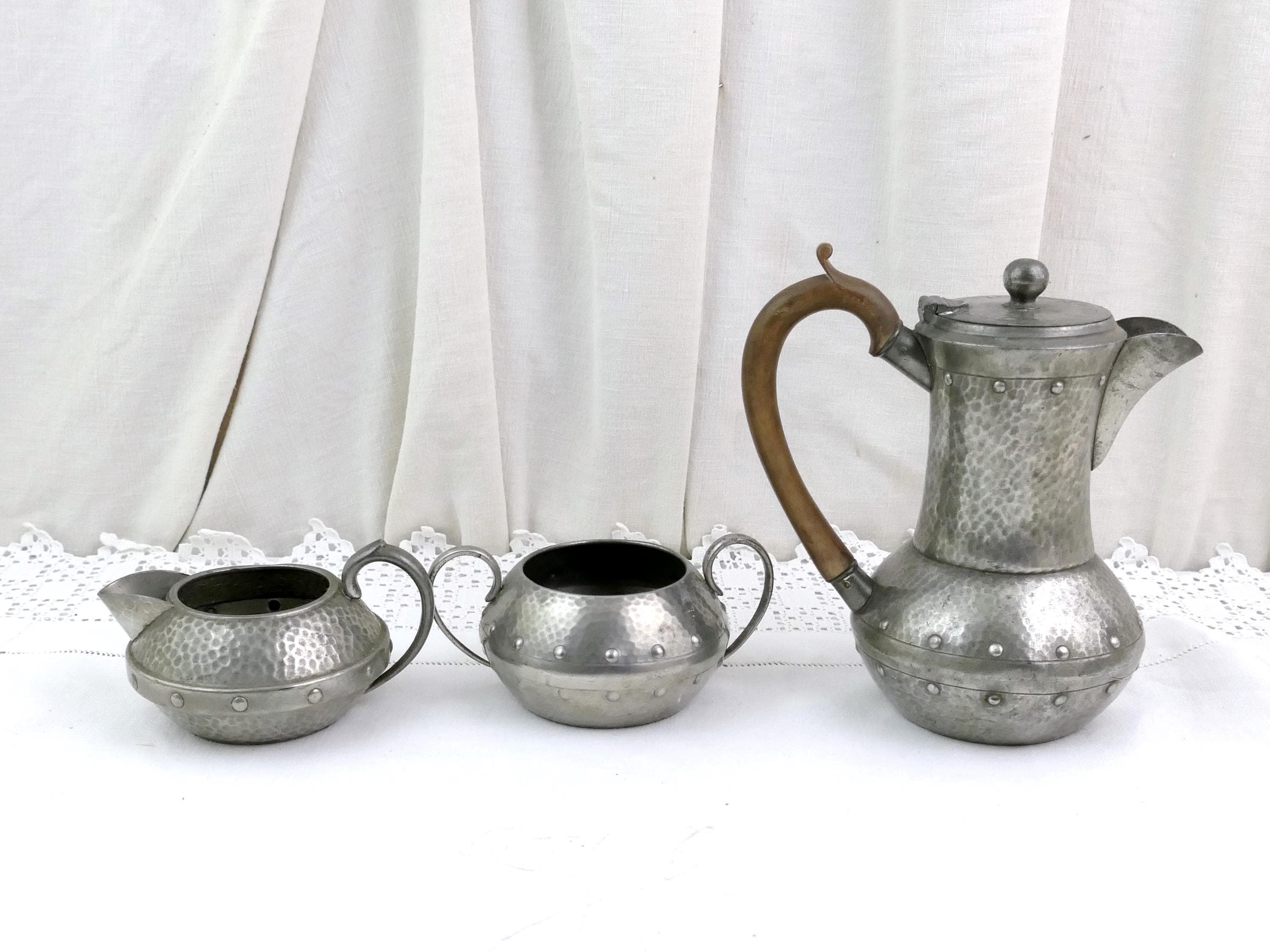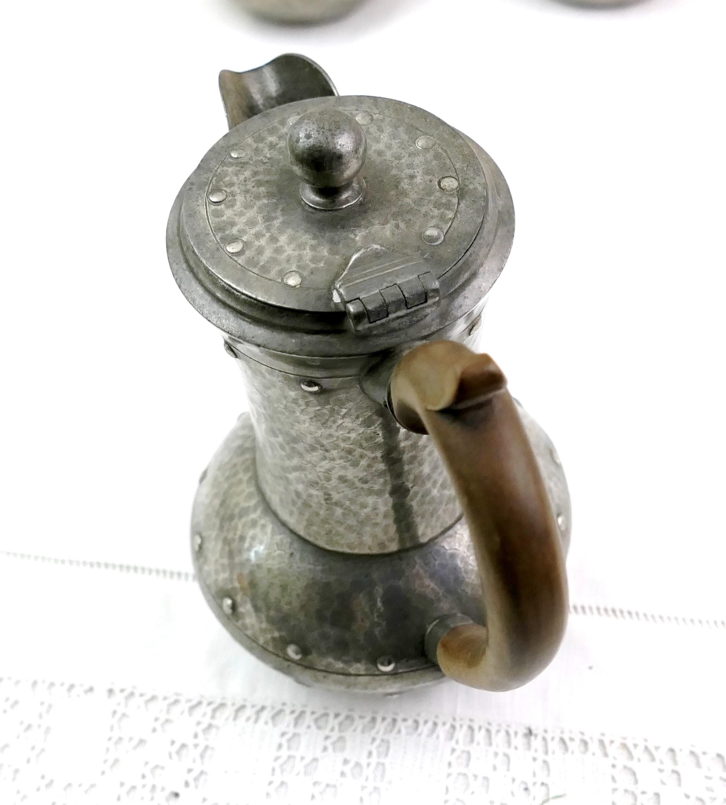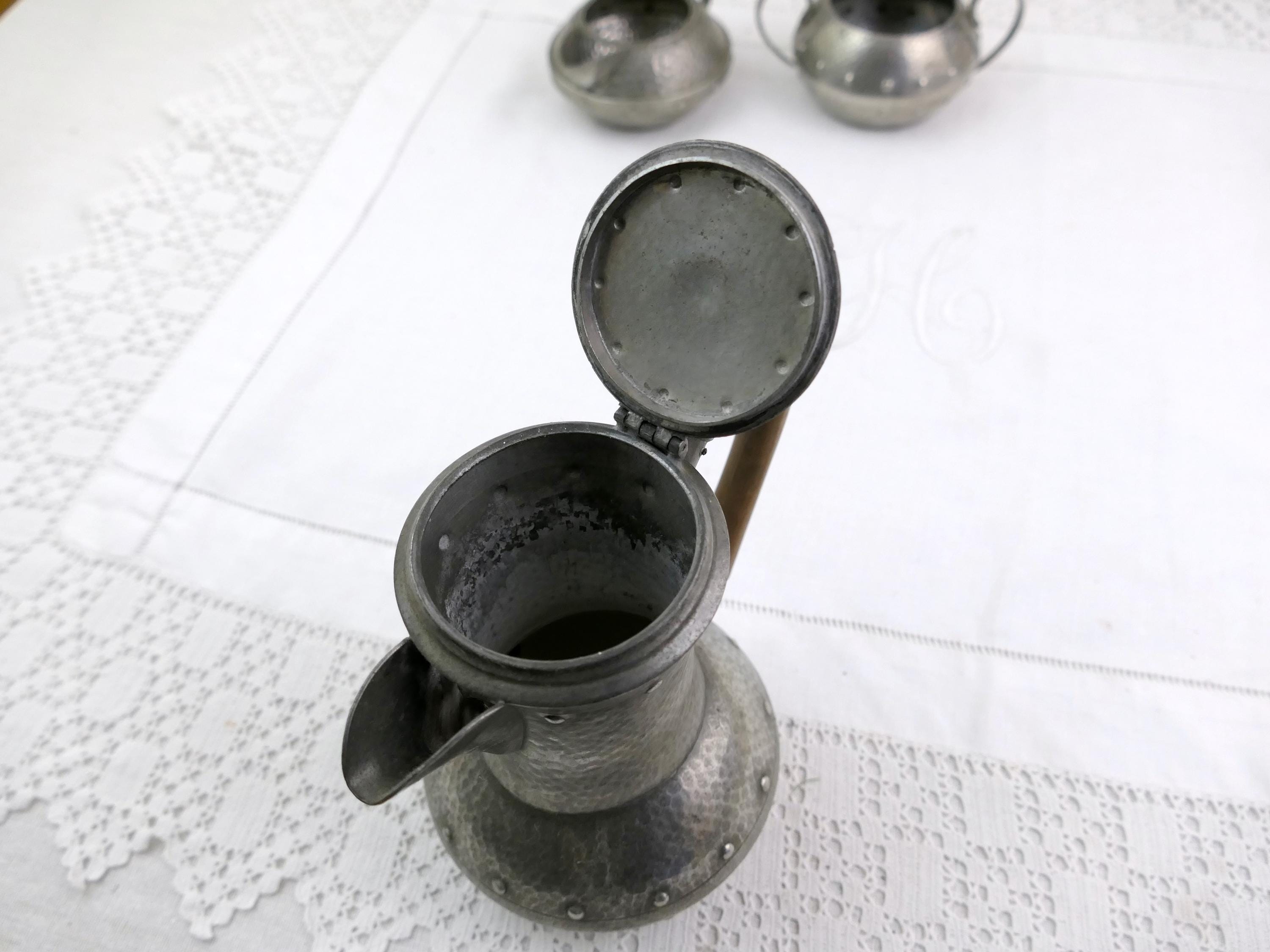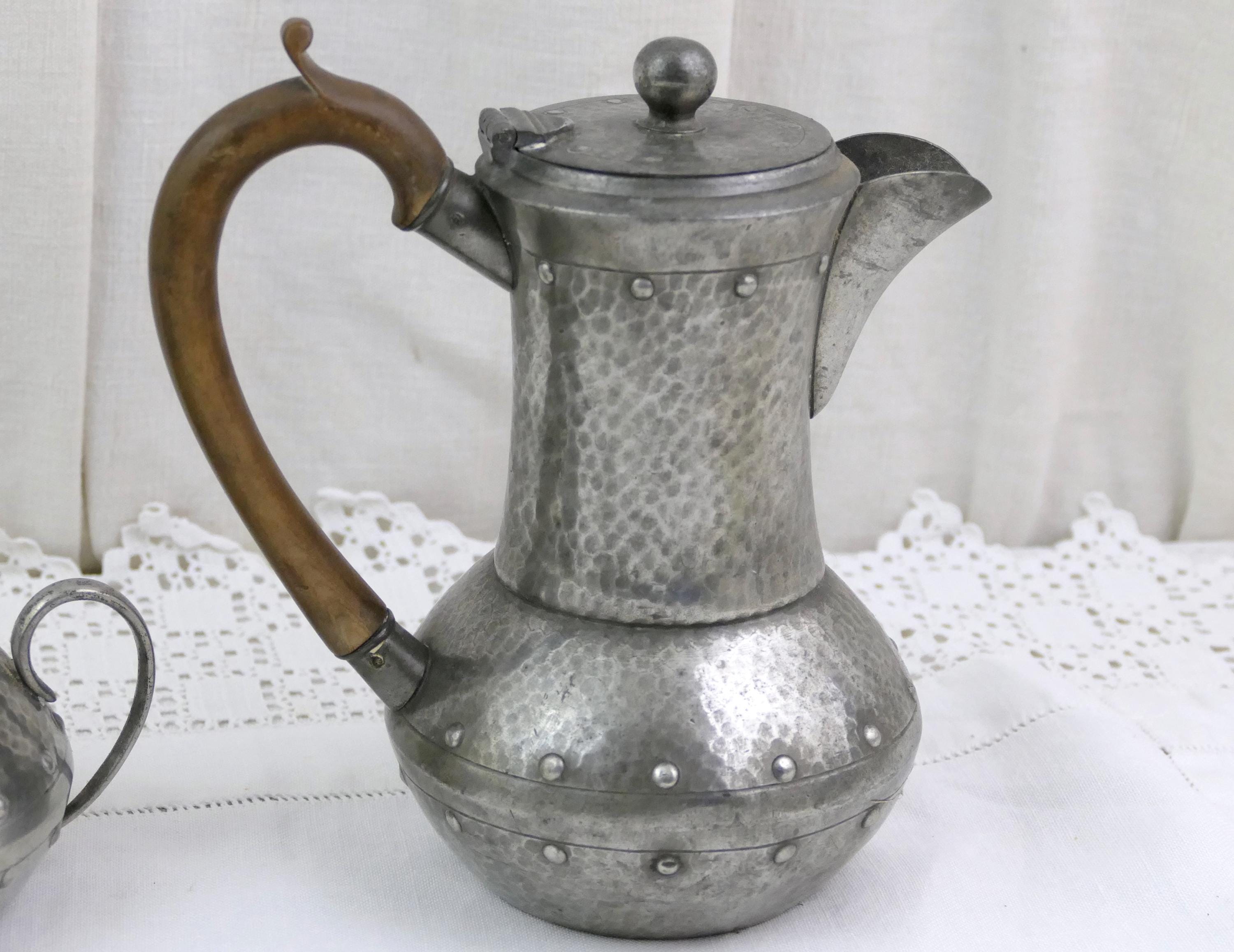 Antique Art sand Crafts style pewter coffee set with hand beaten surface. Made in England by W & Co of pewter metal. Ca late 1800s early 1900s.