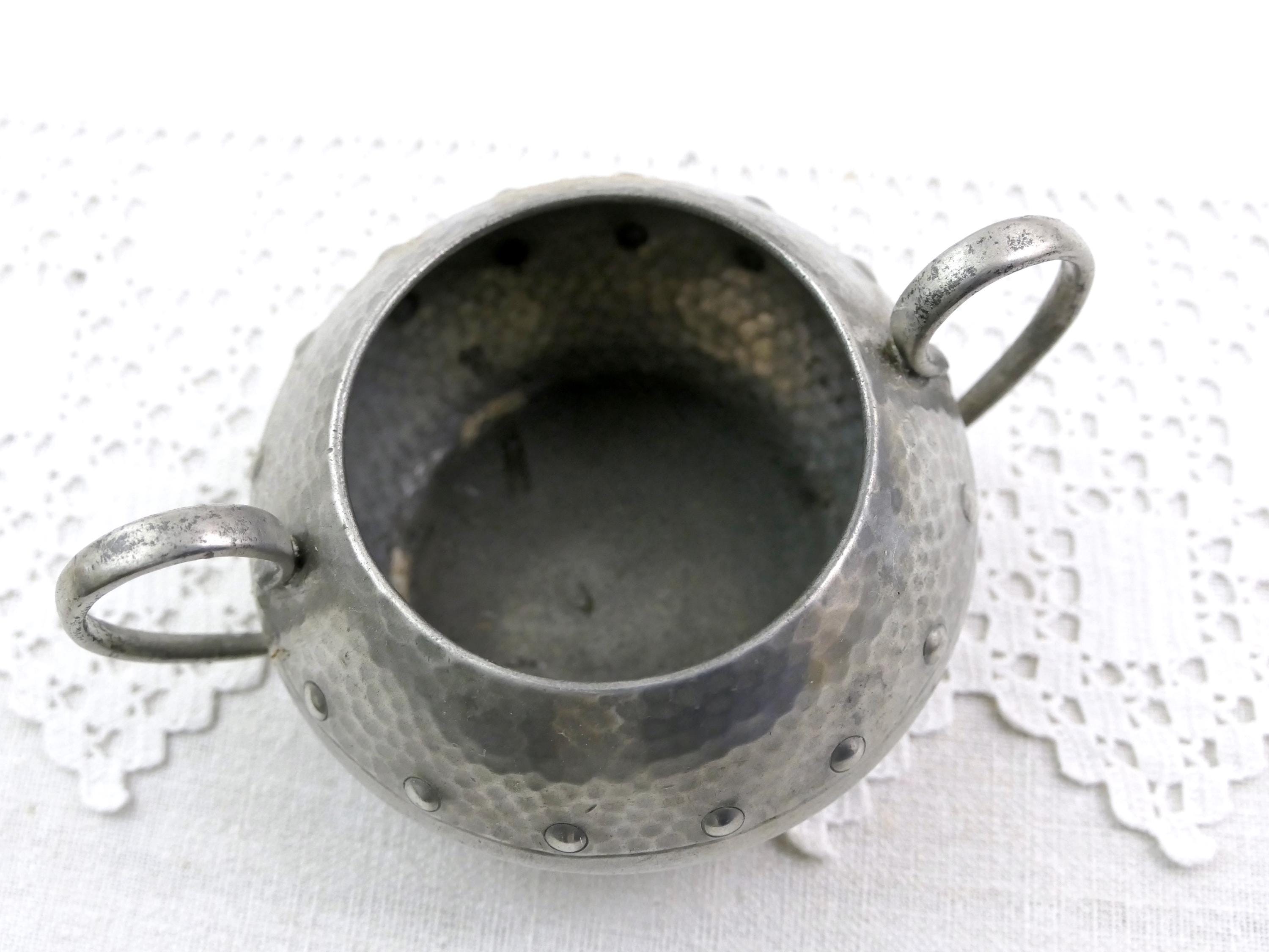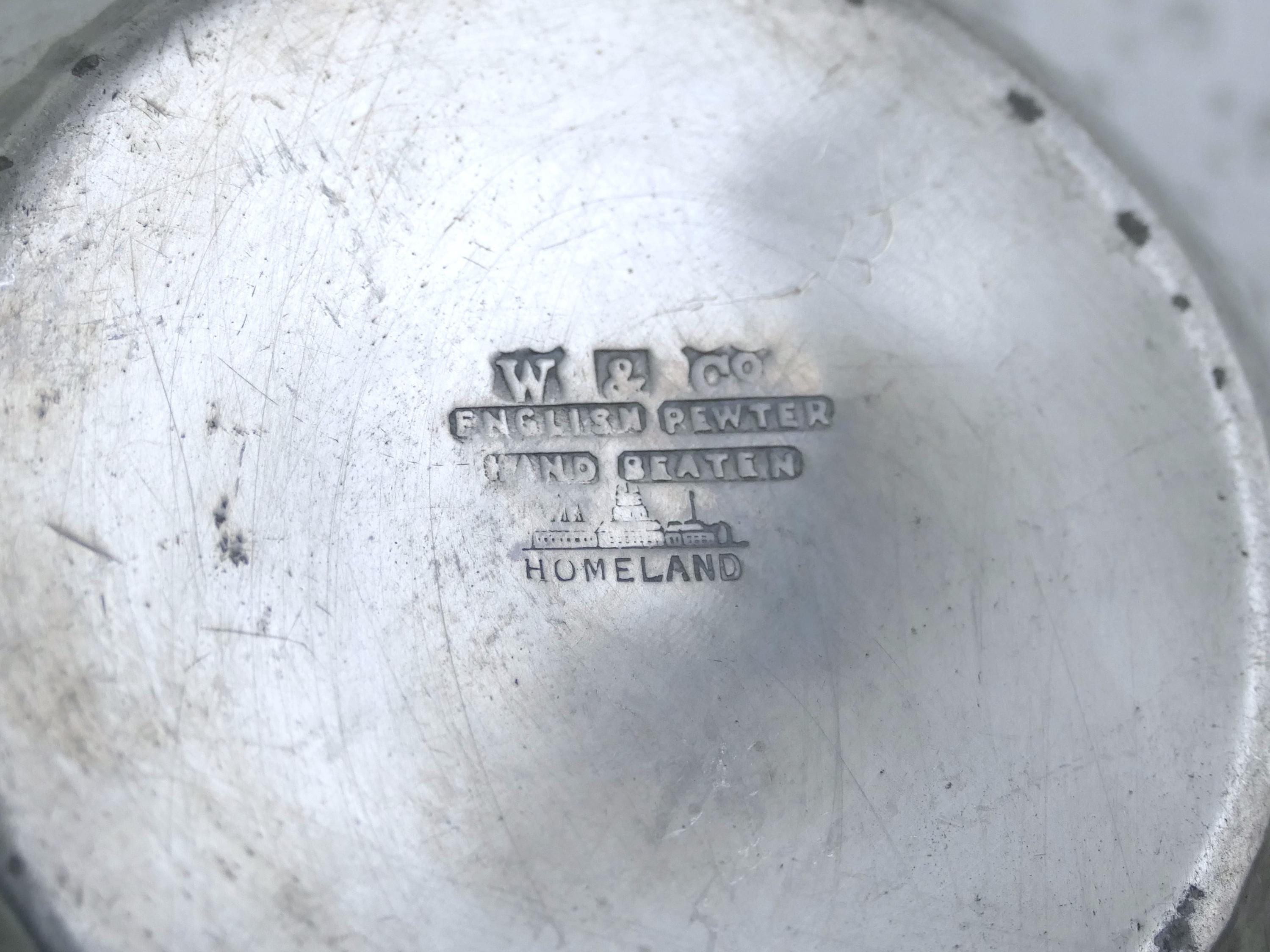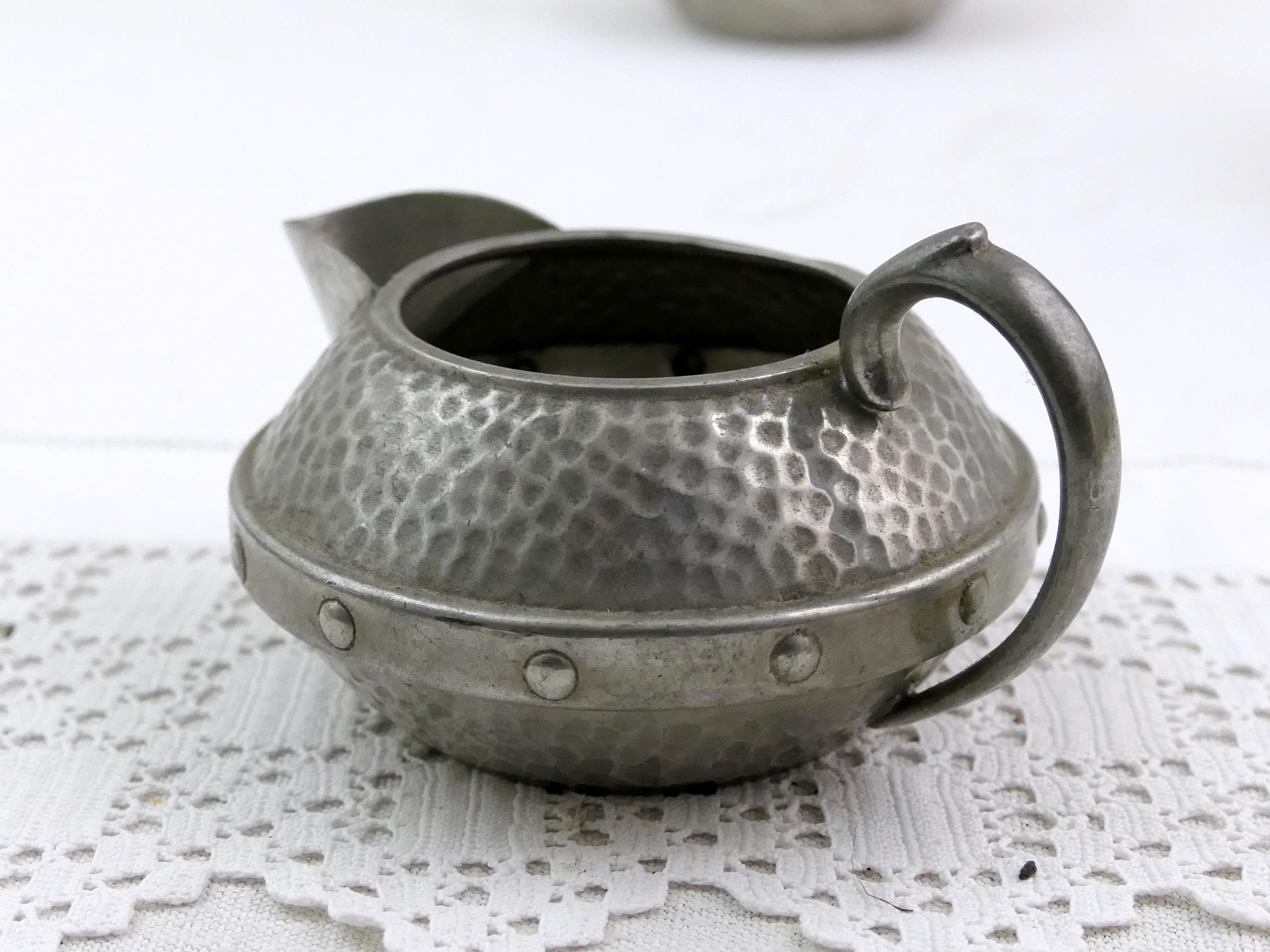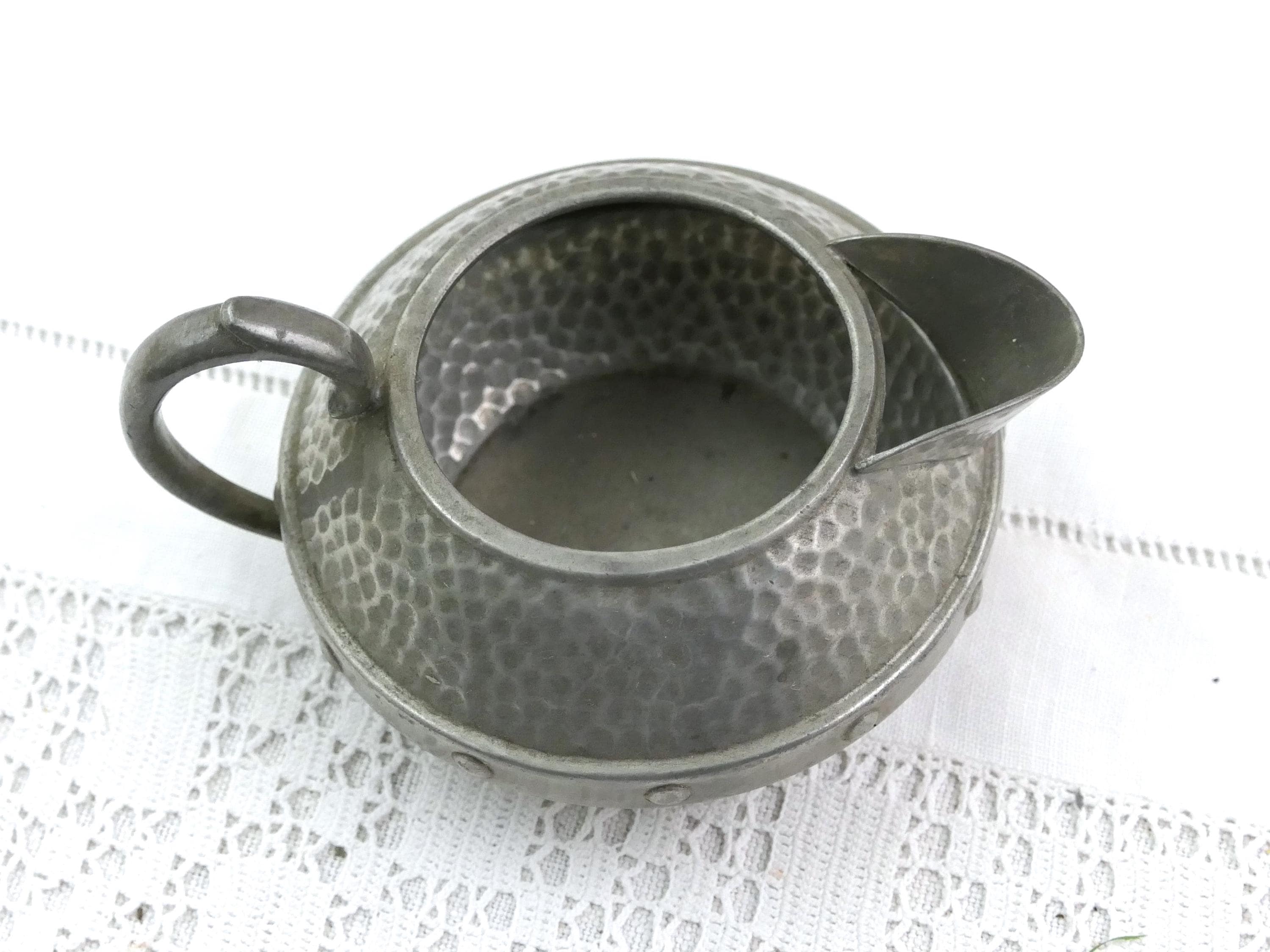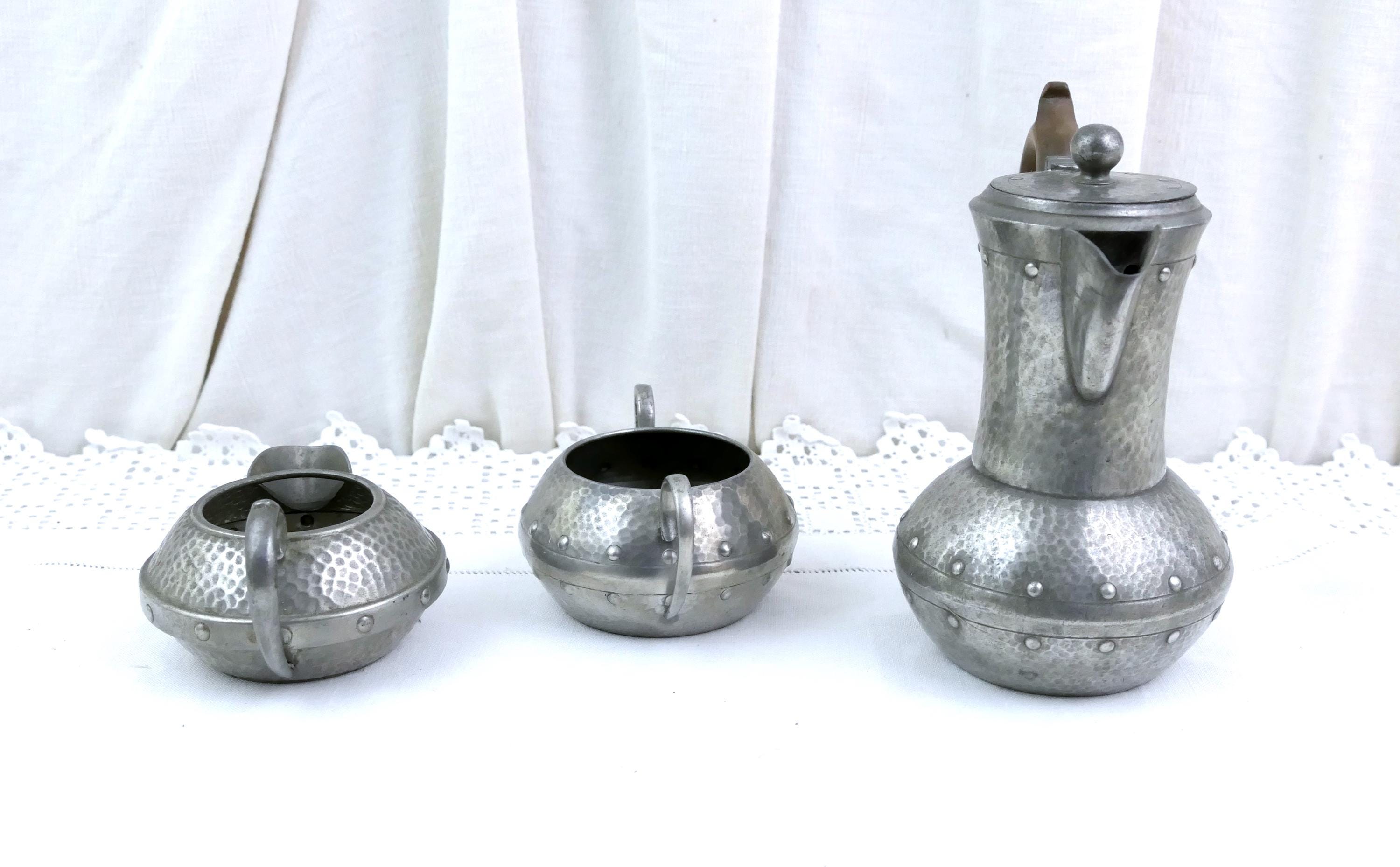 Antique Art sand Crafts style pewter coffee set with hand beaten surface. Made in England by W & Co of pewter metal. Ca late 1800s early 1900s.