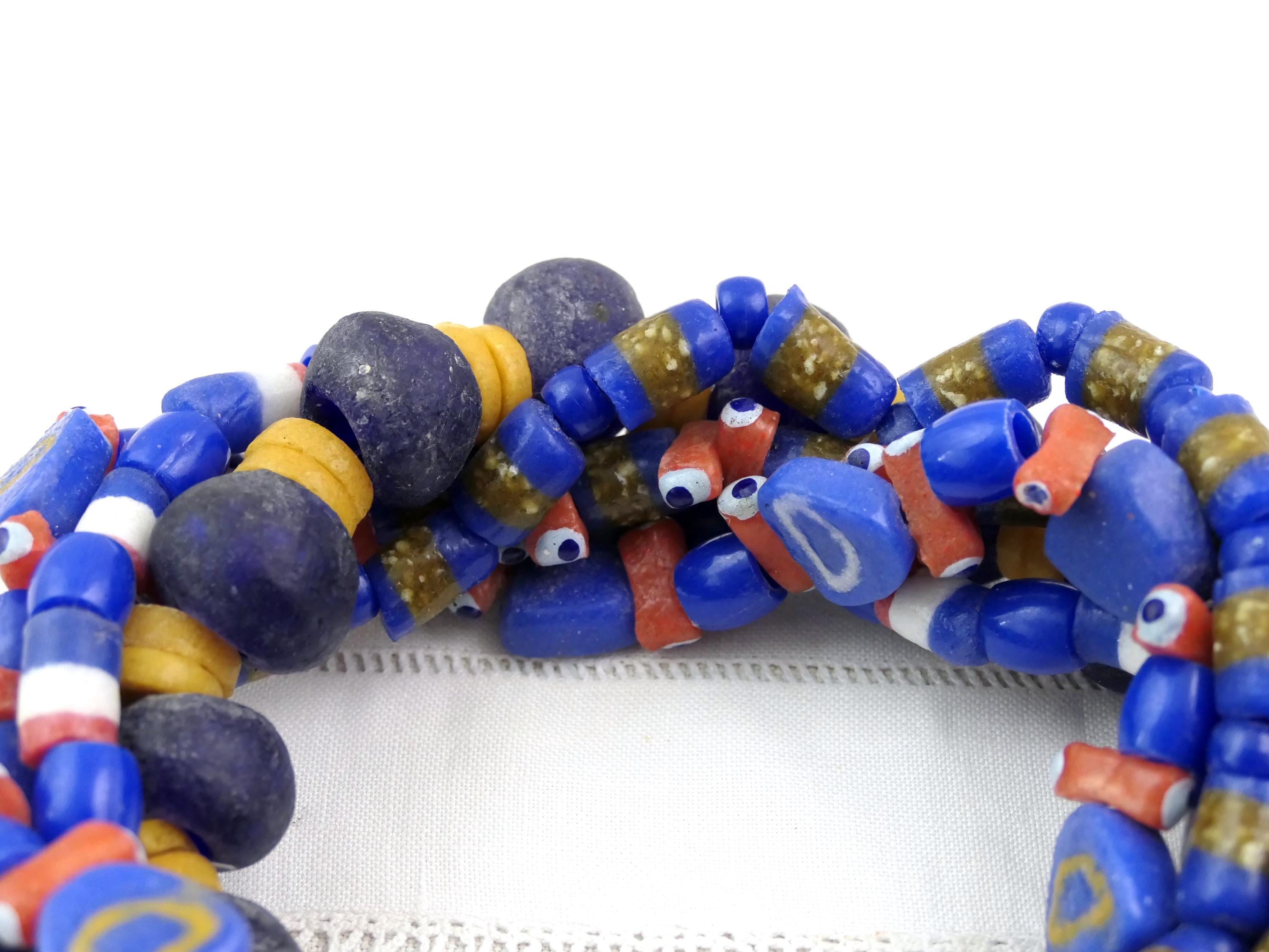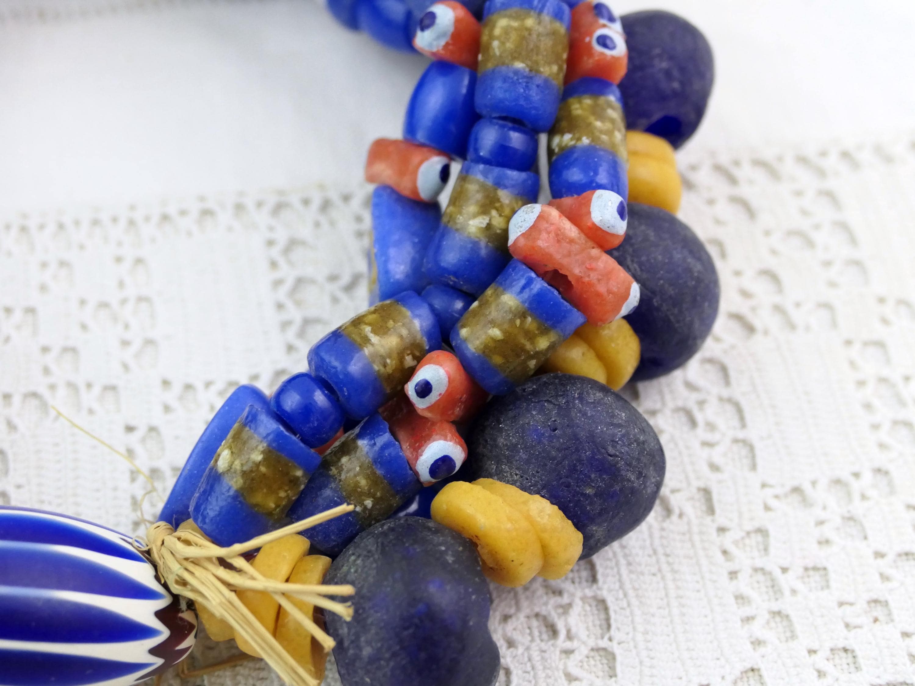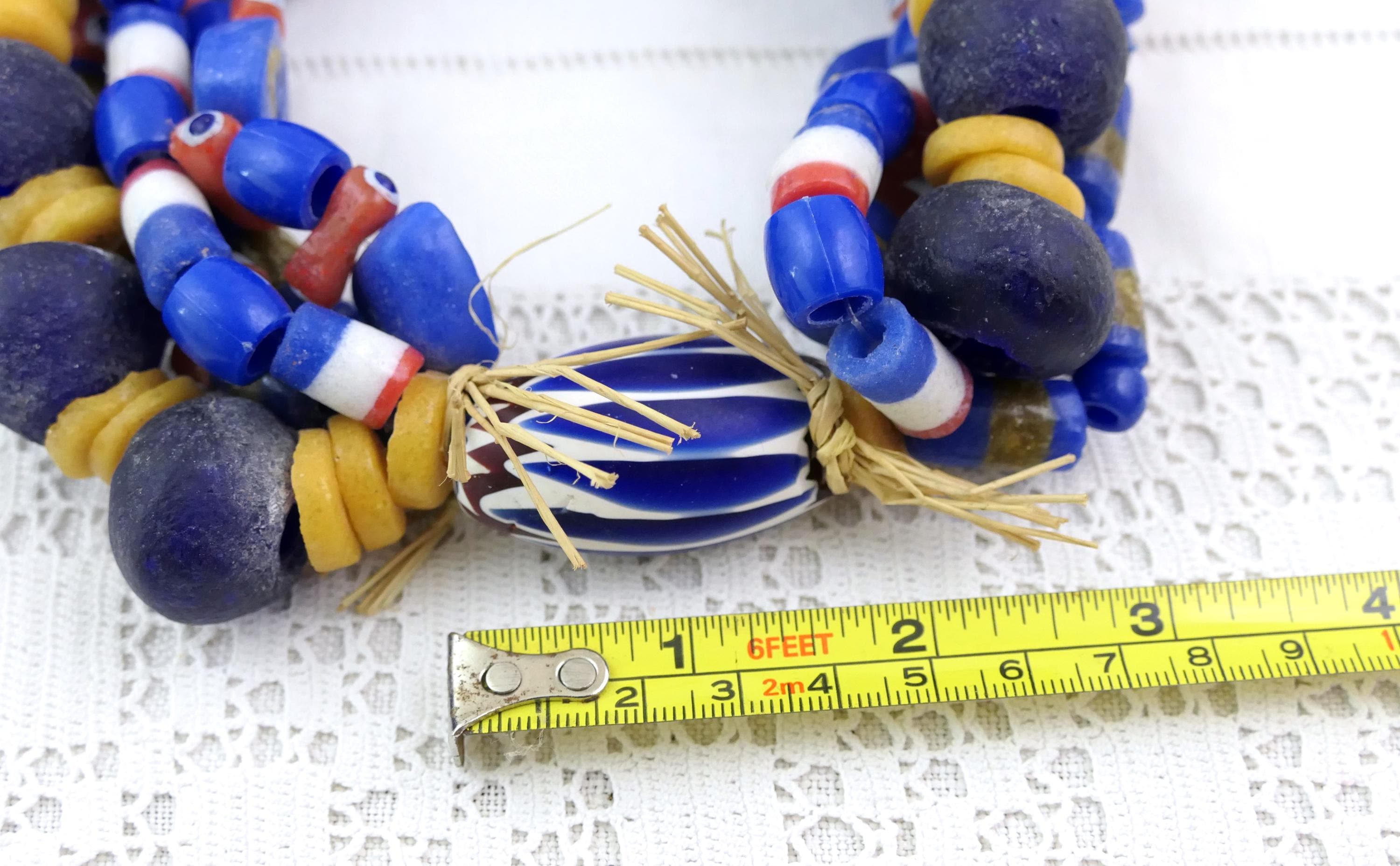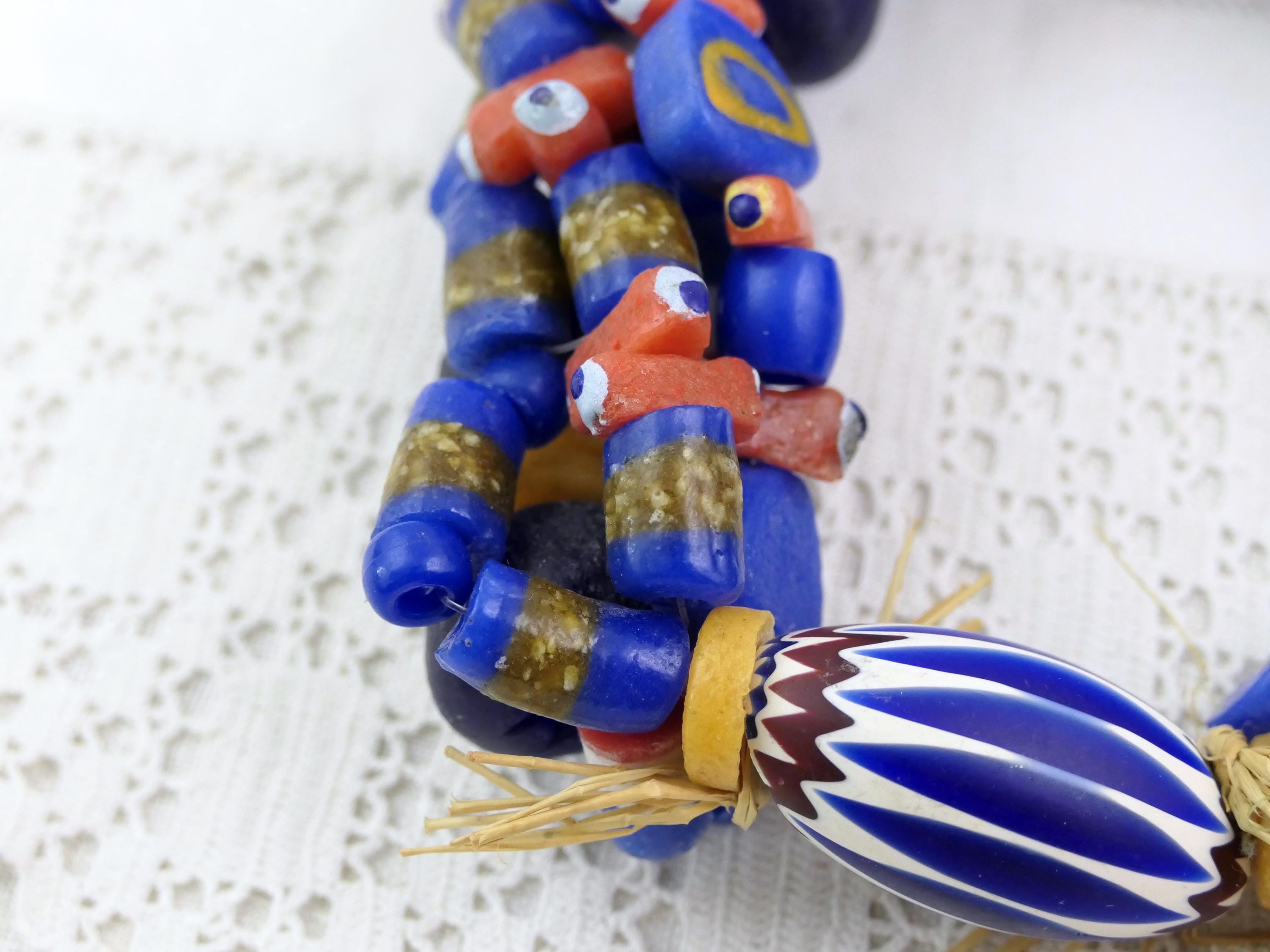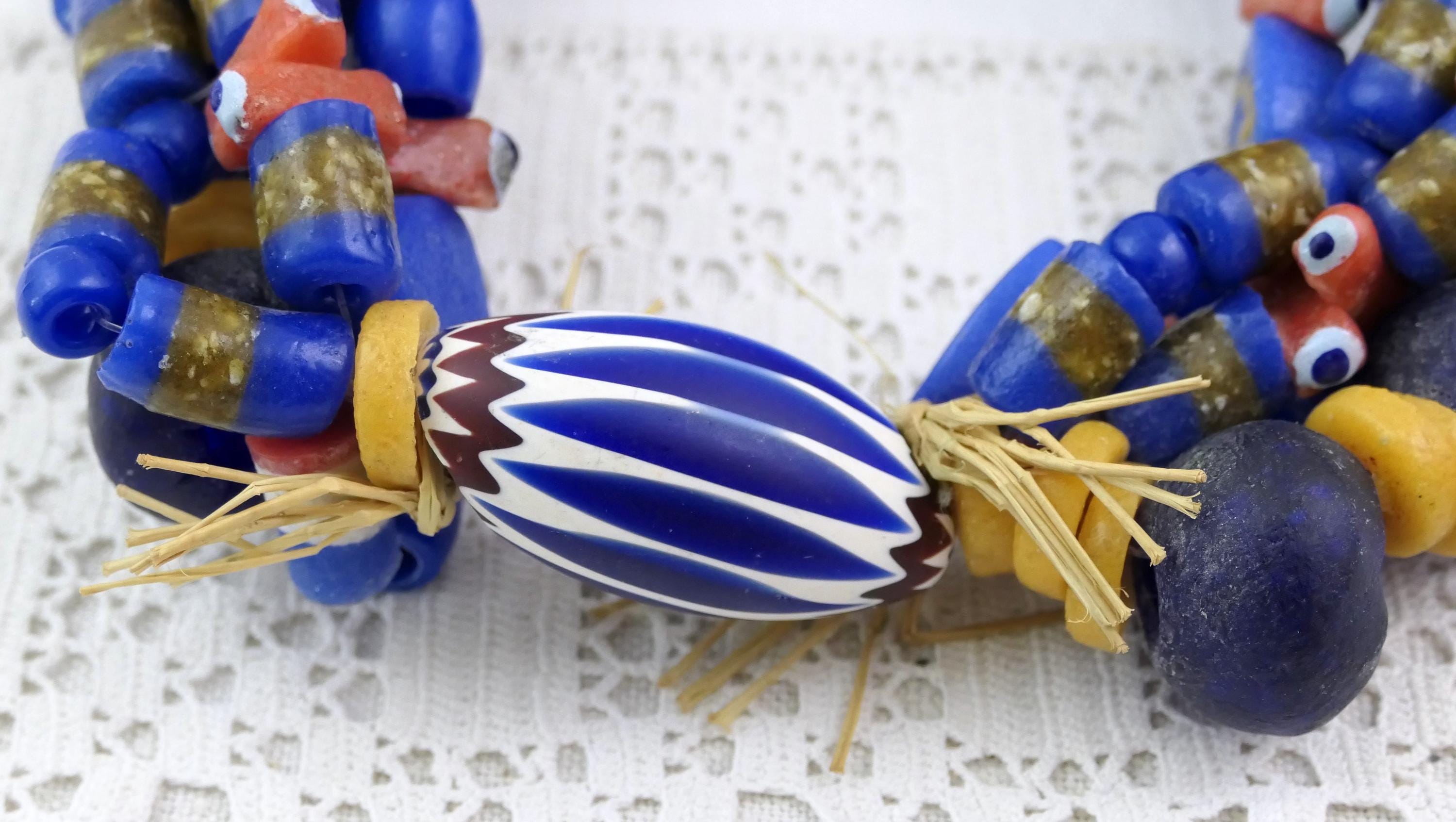 Vintage 5 strands of African trade beads with one large chevron bead in the center. Made of glass. Ca 1900s.