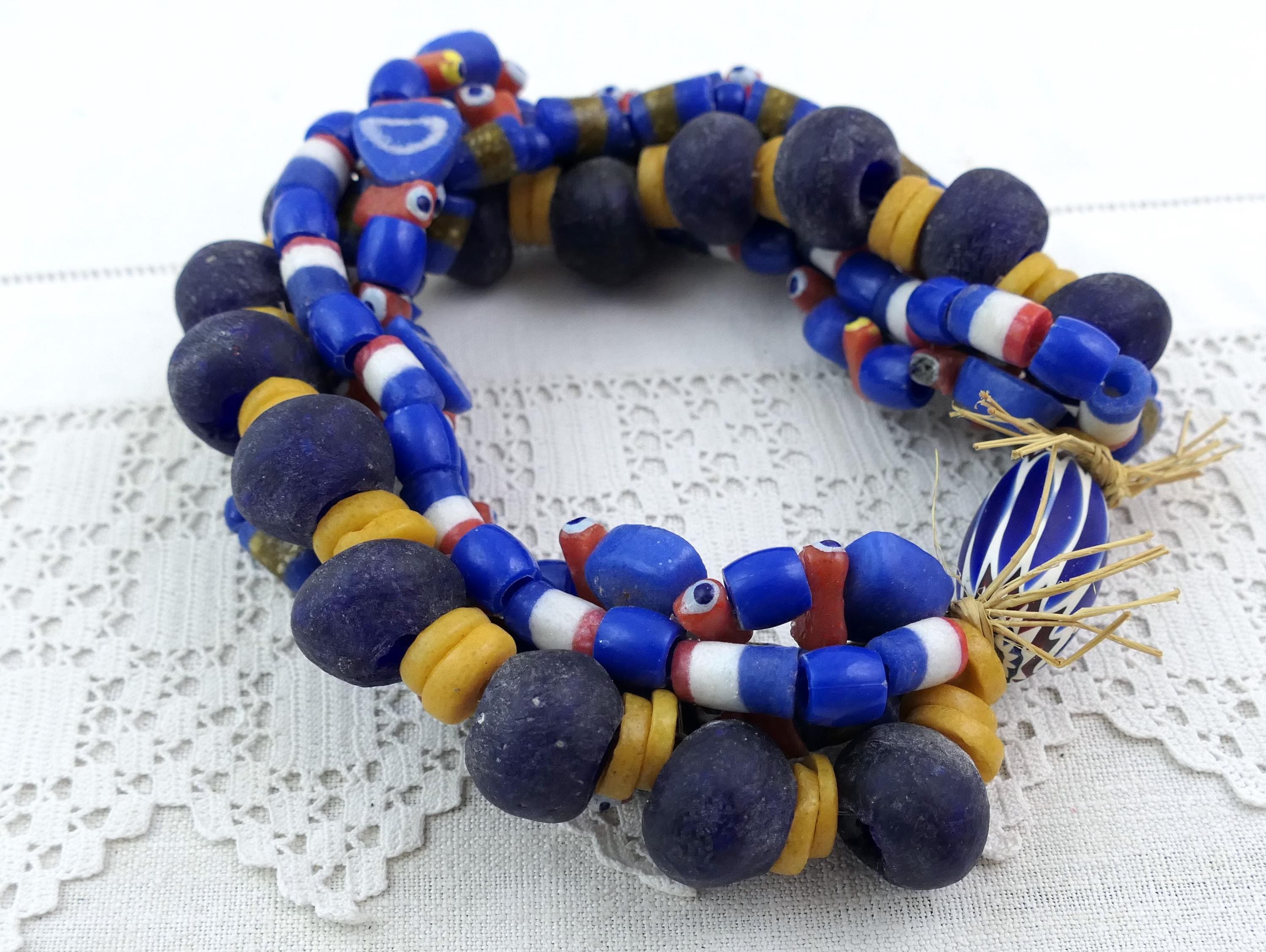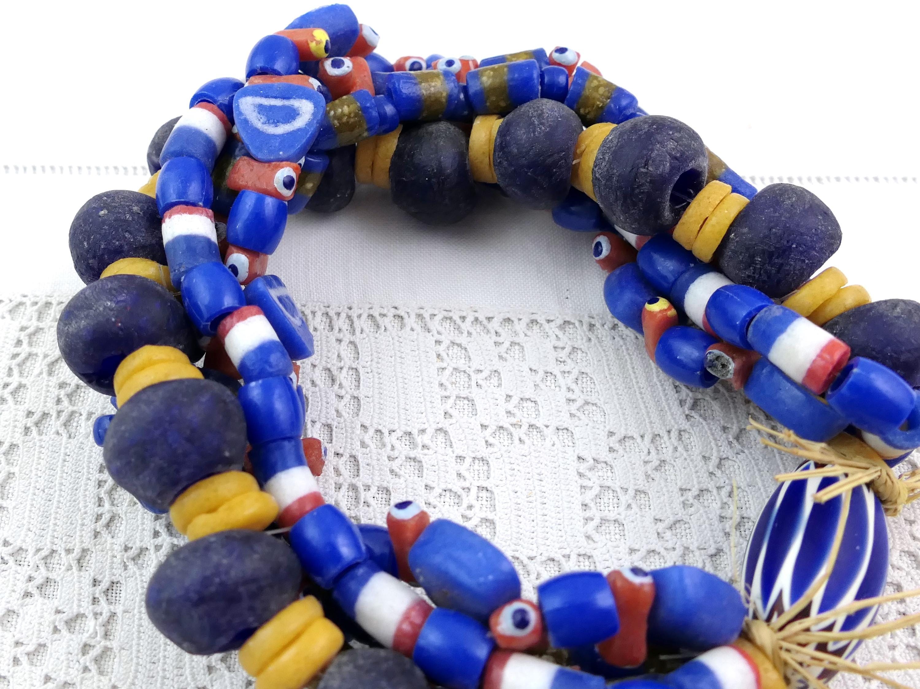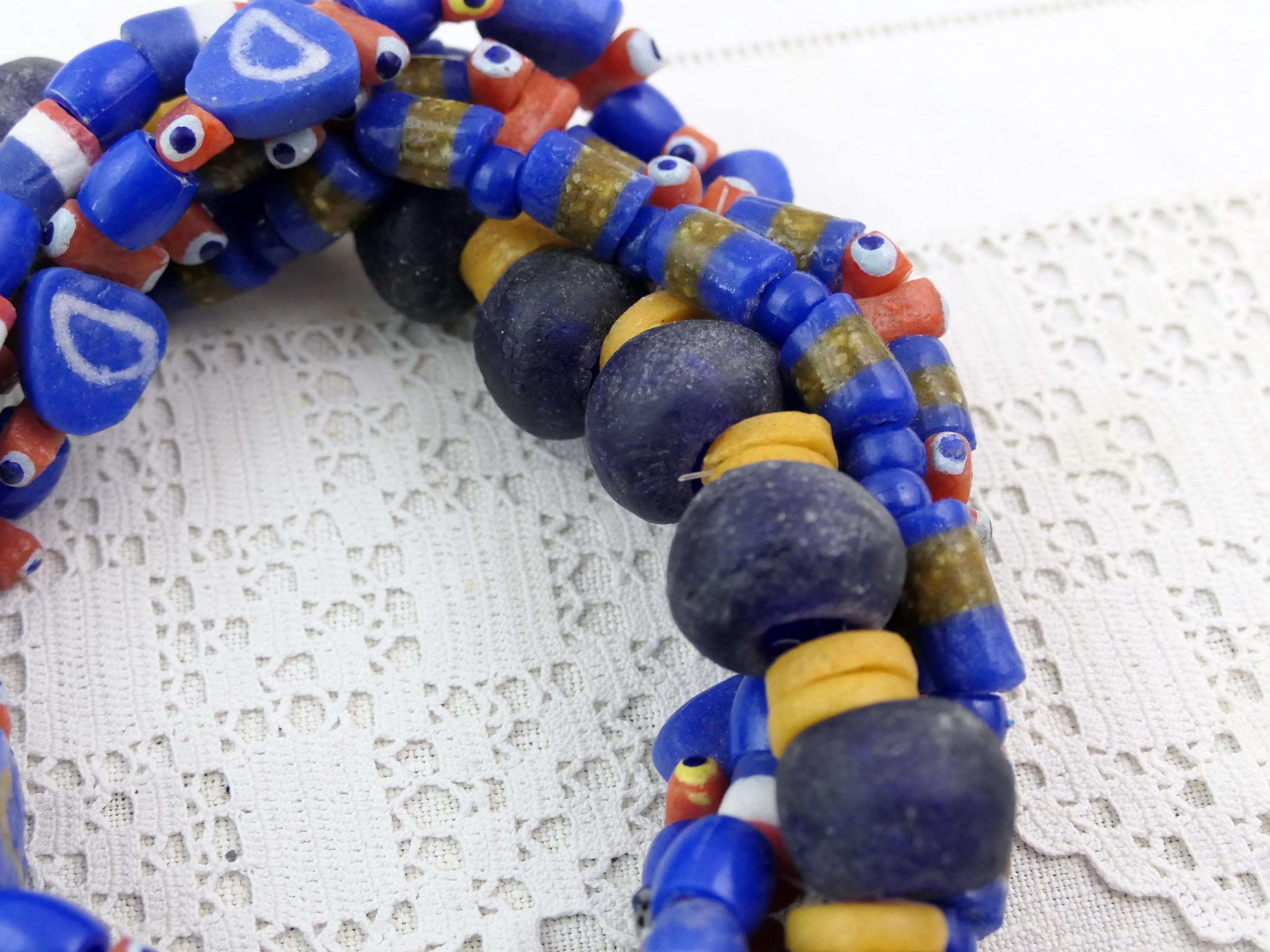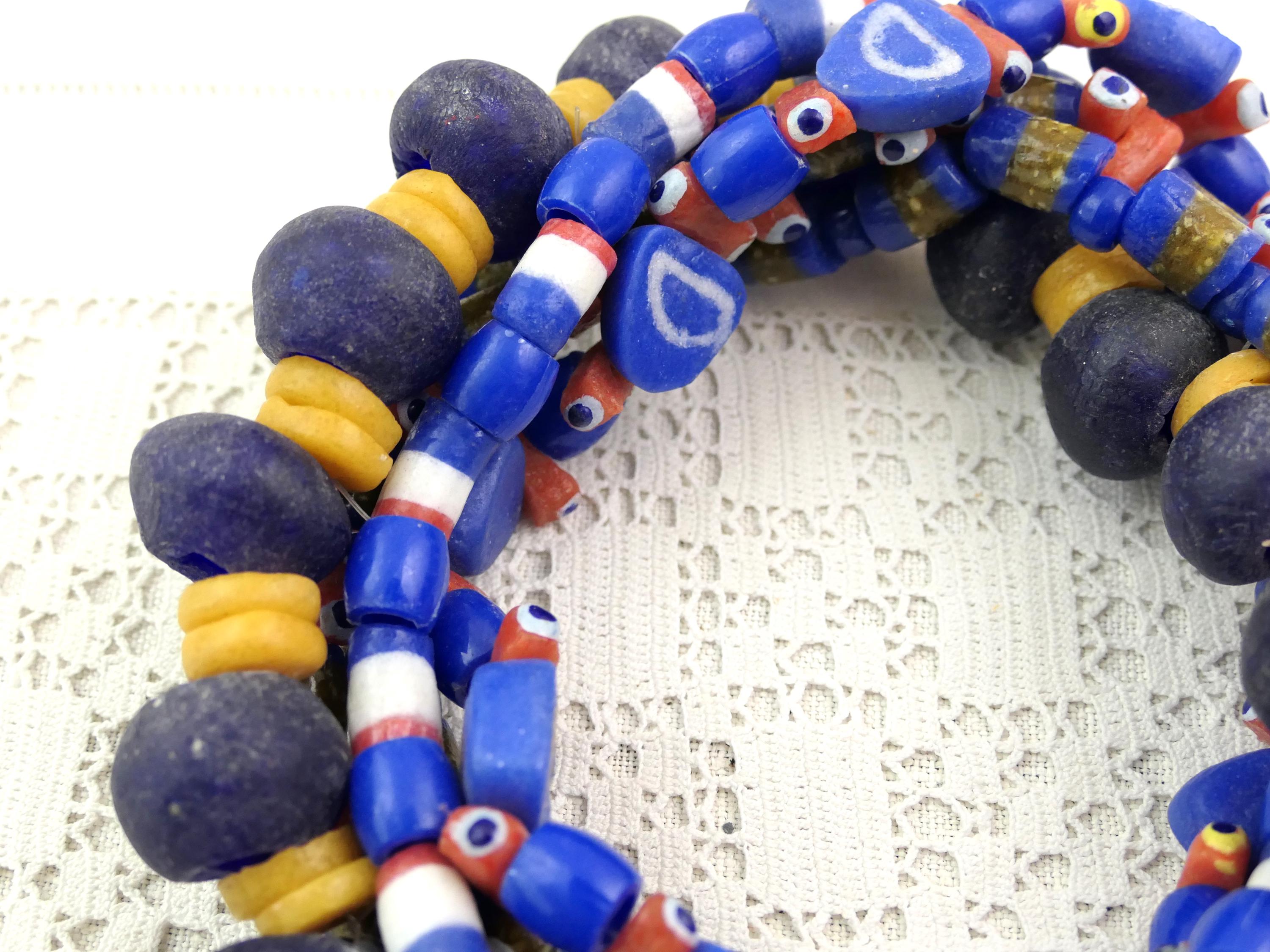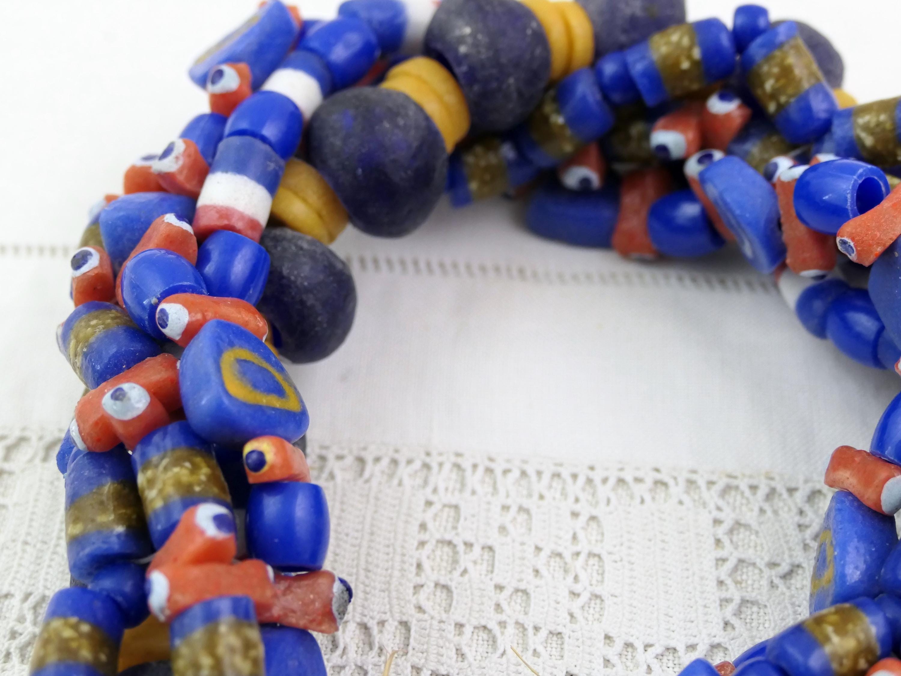 Vintage 5 strands of African trade beads with one large chevron bead in the center. Made of glass. Ca 1900s.