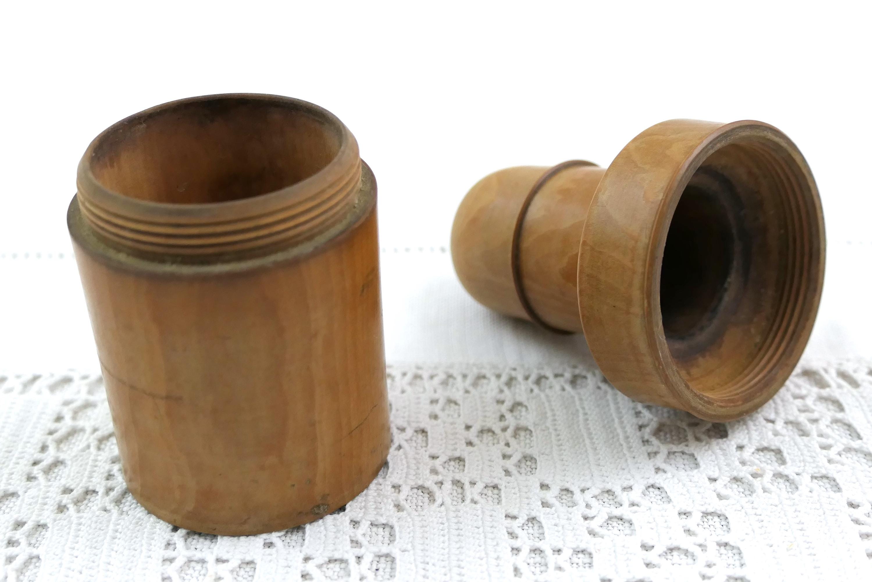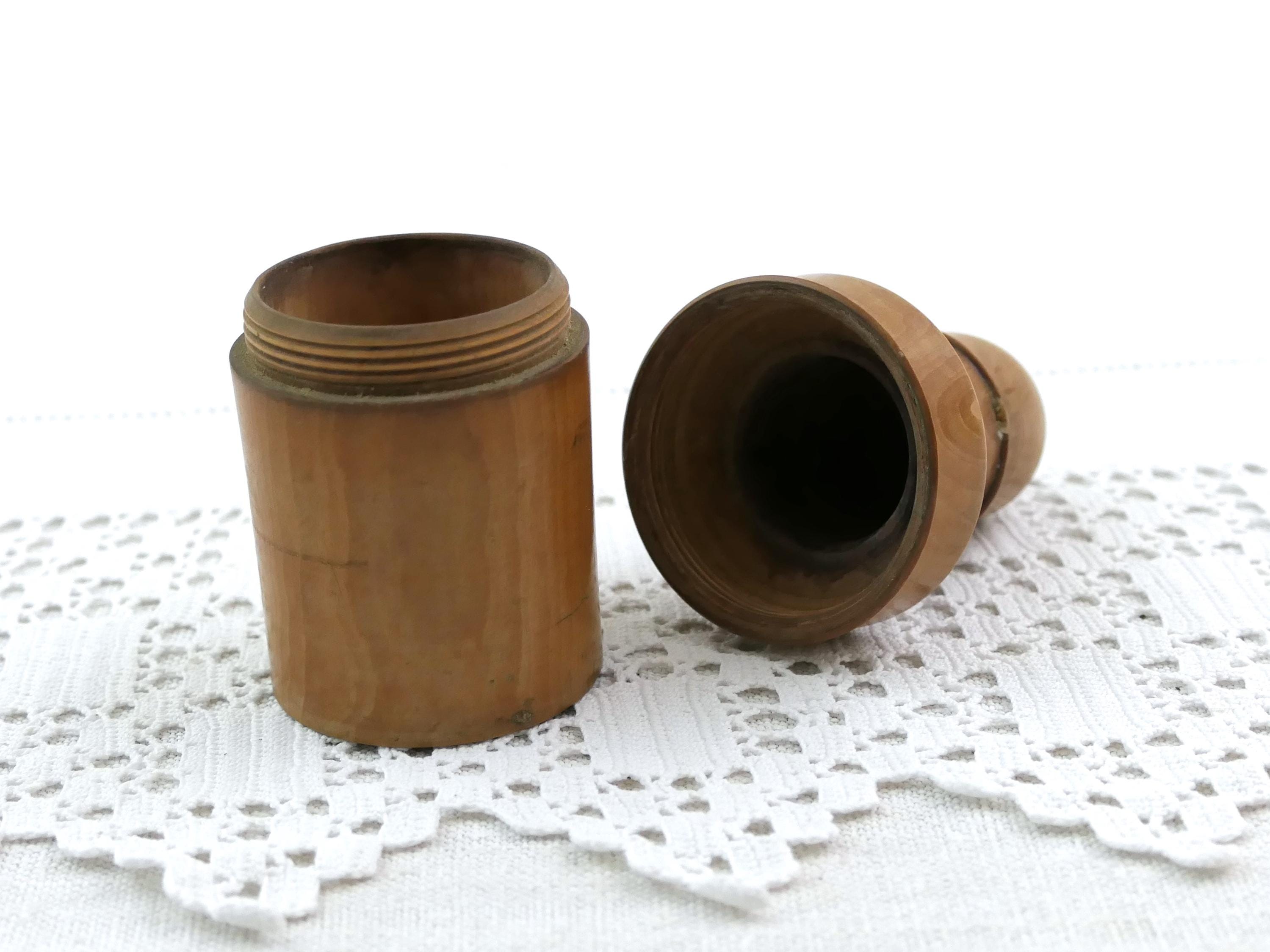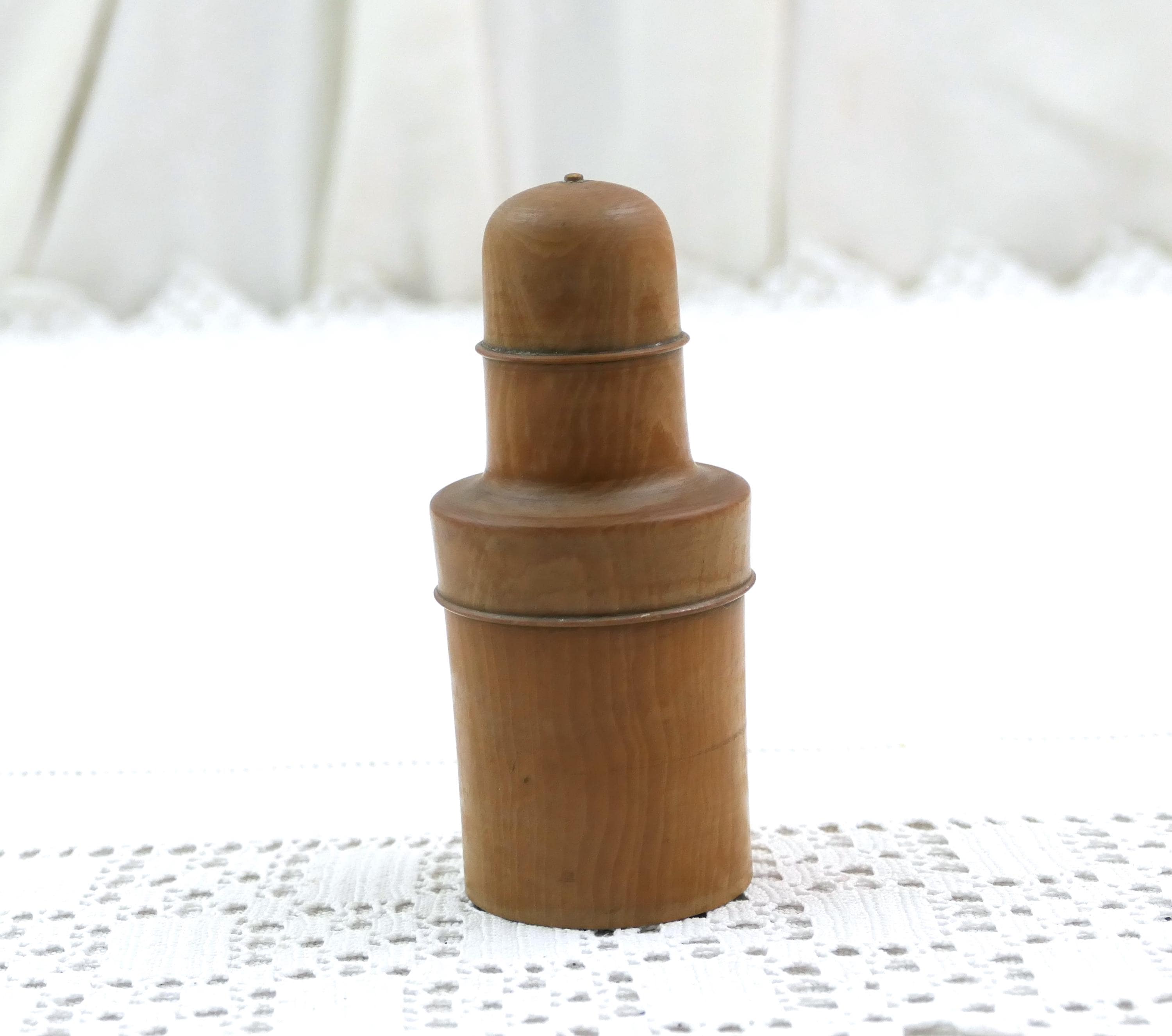 Small antique French wooden bottle holder. Made of turned box wood with a threaded lid. Ca 1800s.