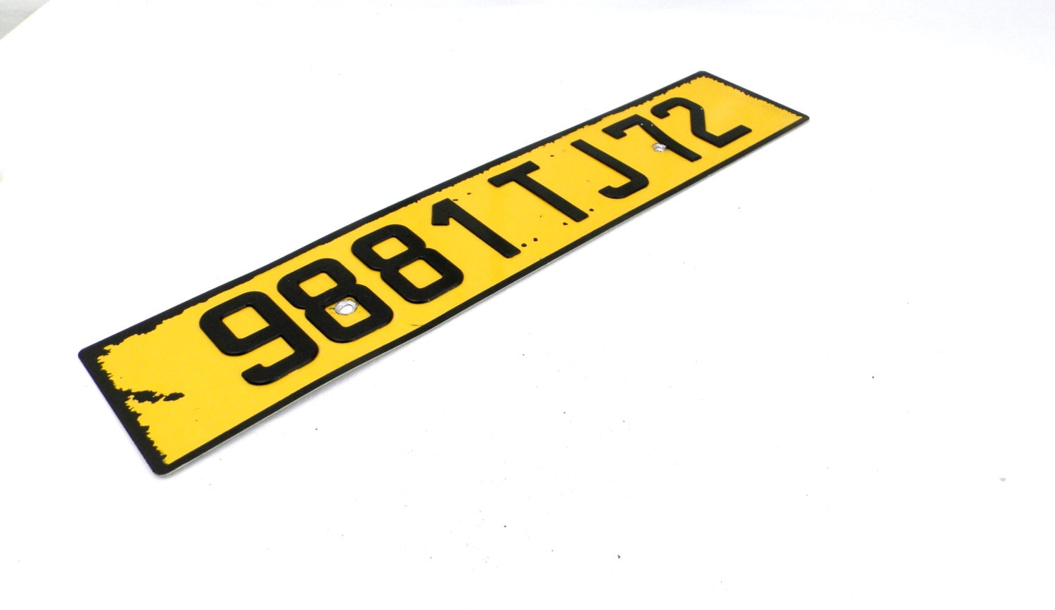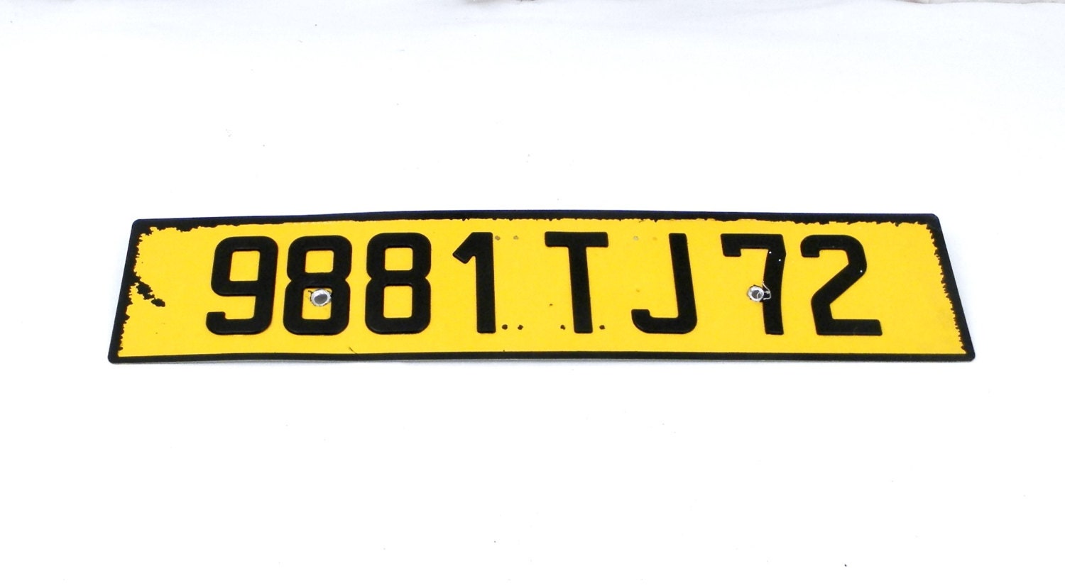 Aluminium plaque with a yellow background and black embossed plastic numbers and letters.