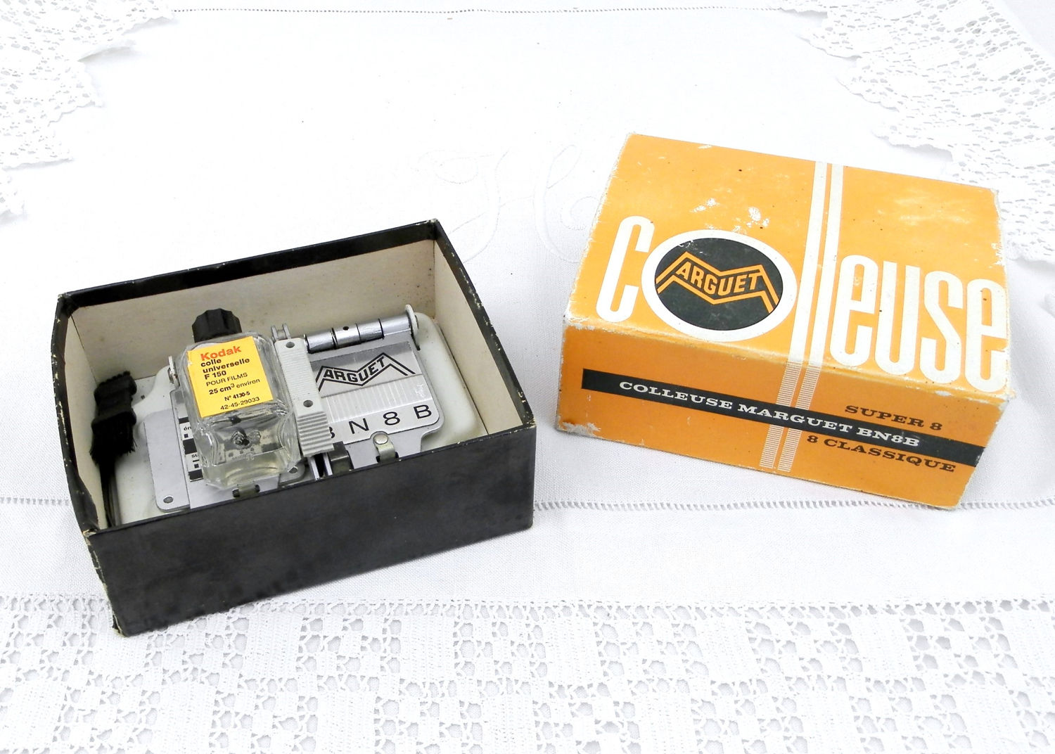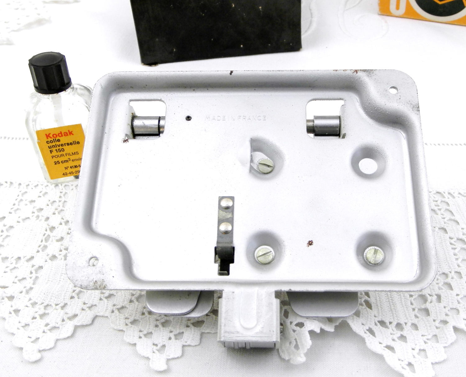 Complete with original box and partially used bottle of Kodak glue.