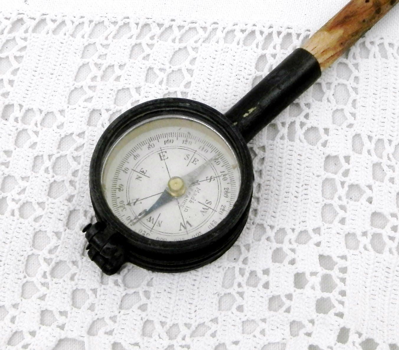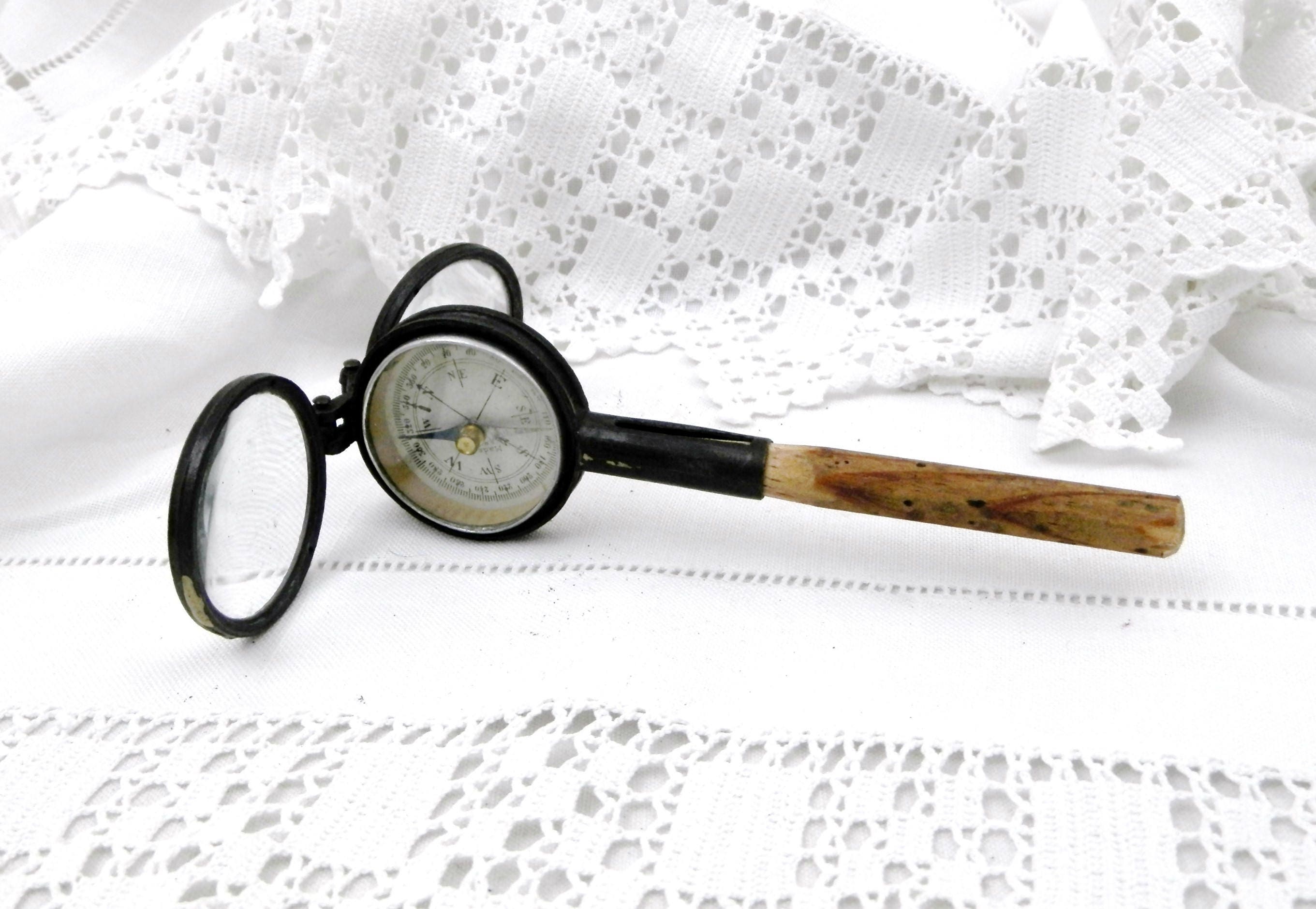 This compass is a bit like a Swiss army knife it has numerous functions. It has the compass on one side a small mirror on the other two magnifying lenses that were part of a pair of folding binoculars ( see the advertising photo 5) unfortunately the smaller lenses are missing bit it is still a lovely unusual piece.