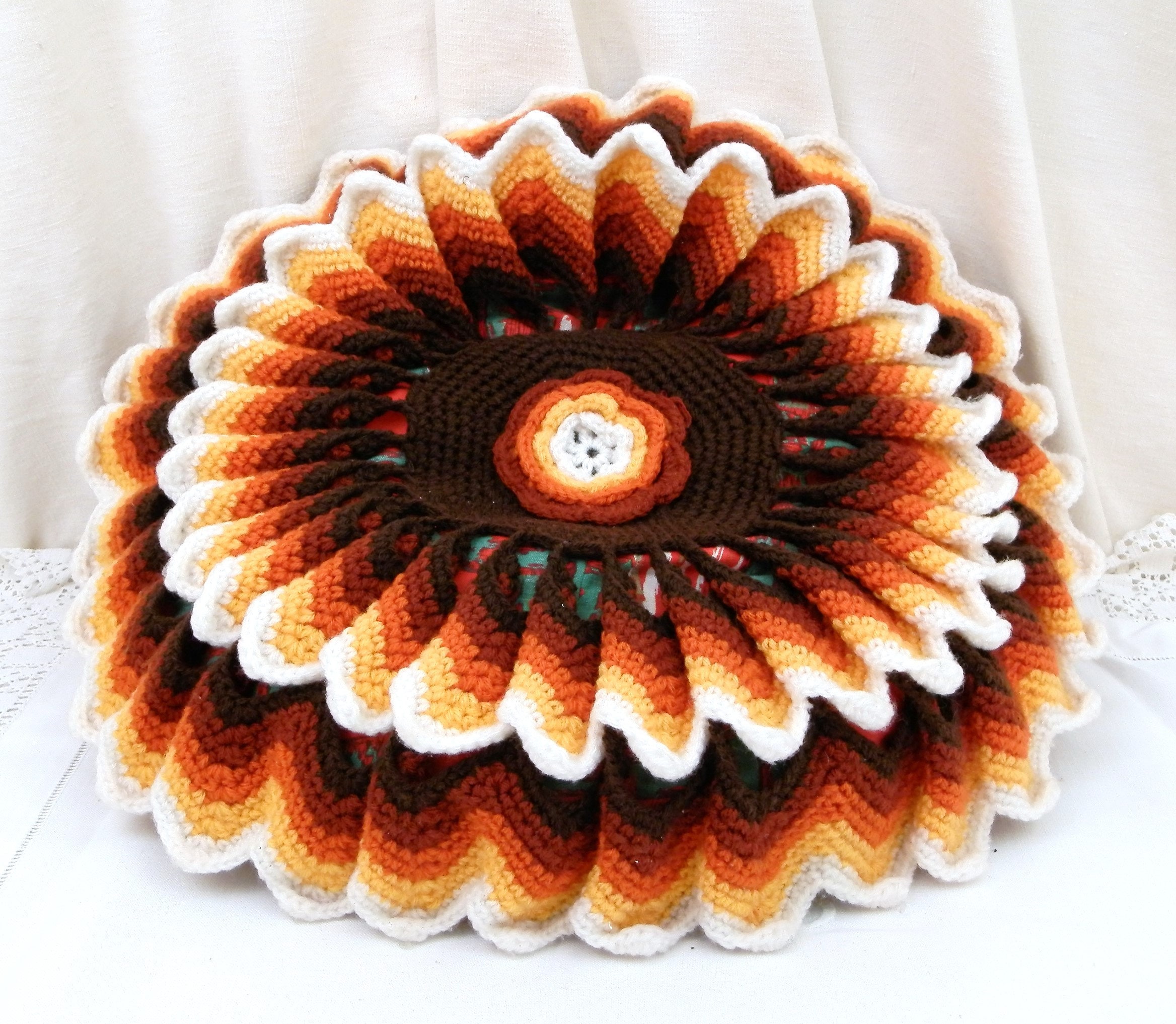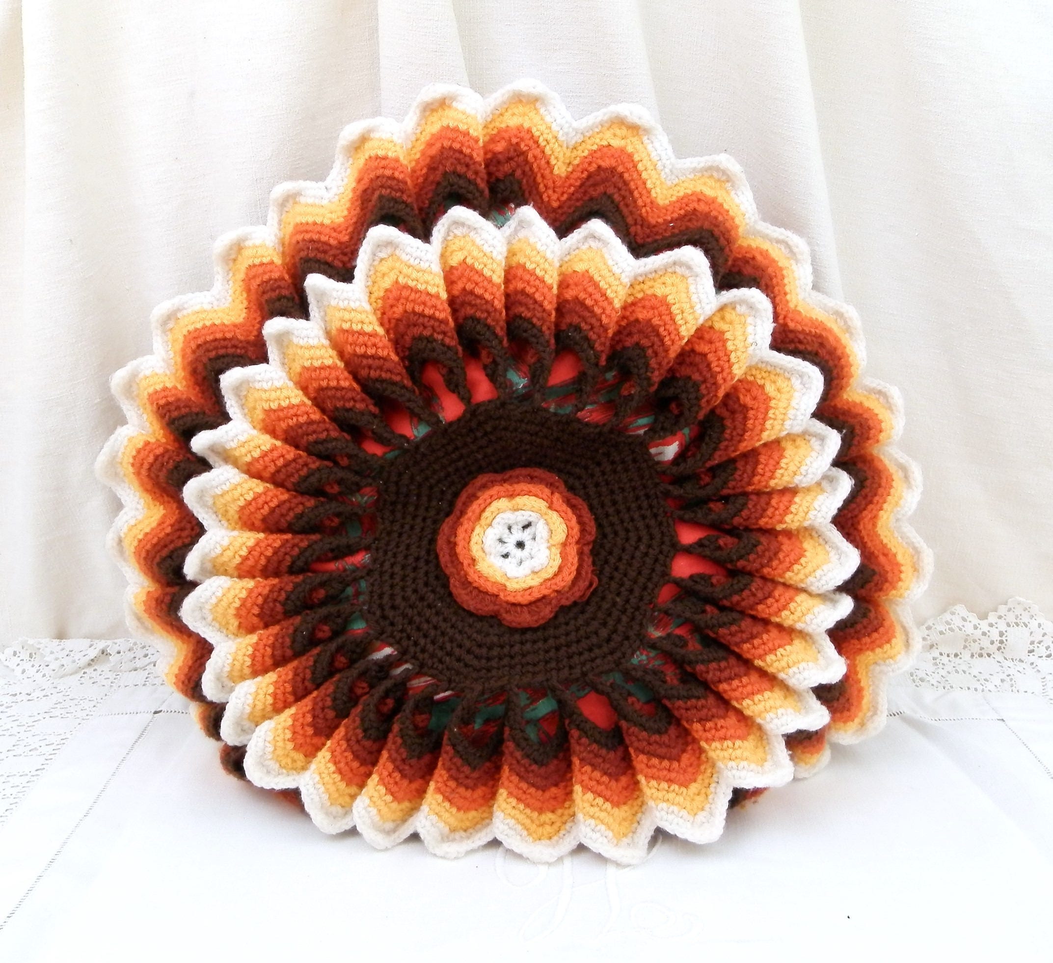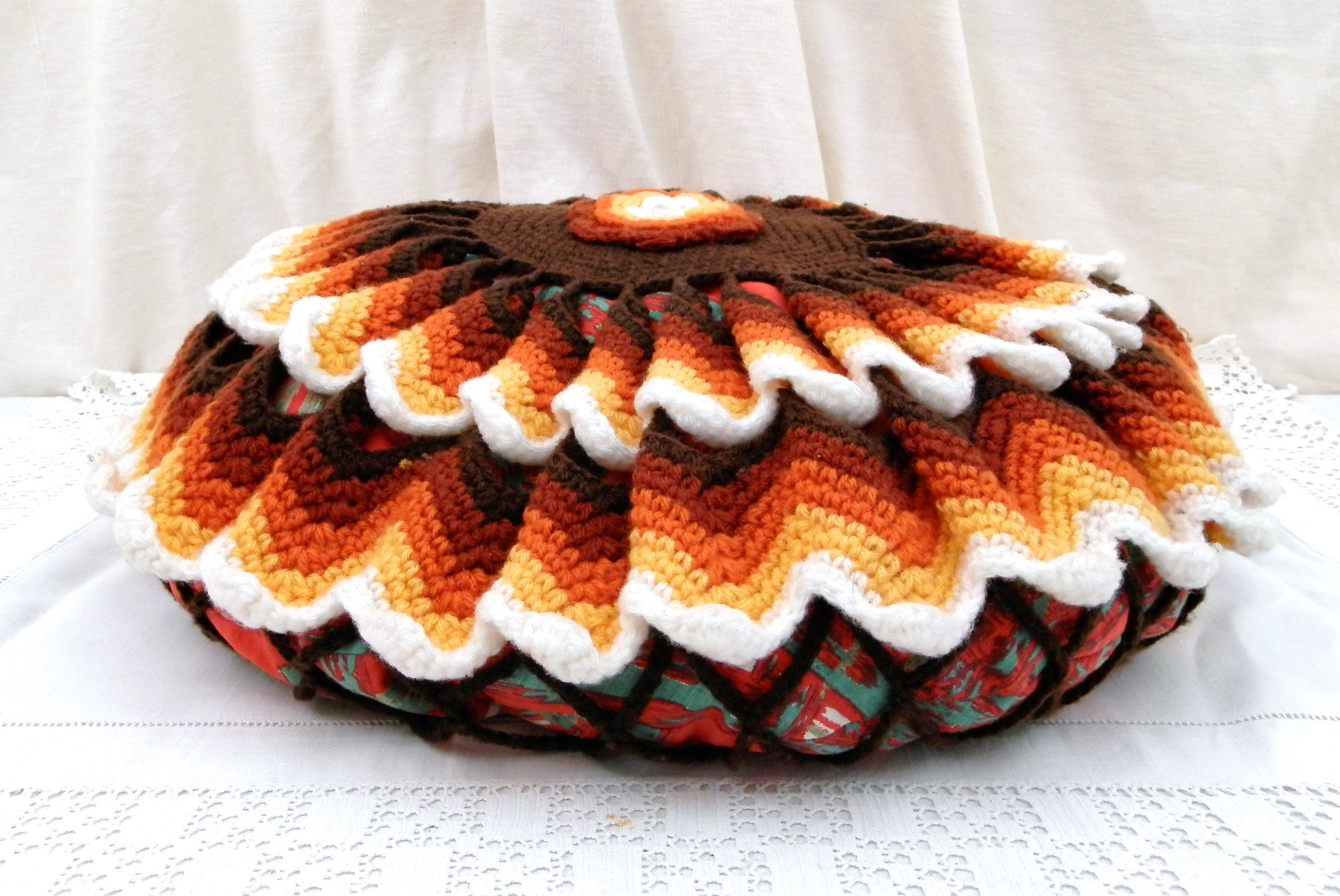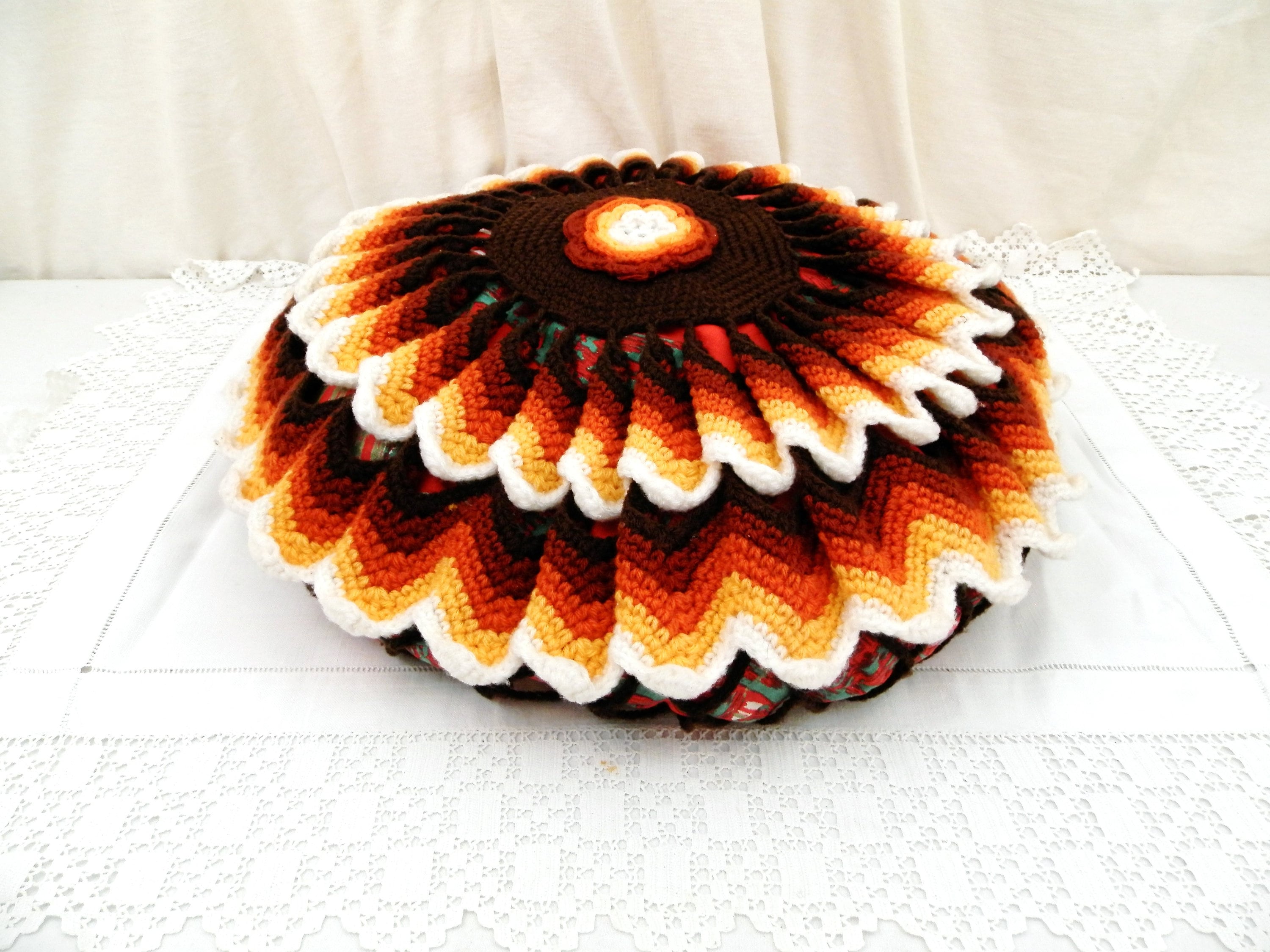 Vintage round crochet cushion cover. Made of brightly colored wool with black netting back and separate cotton pillow. A lovely soft squishy pillow.