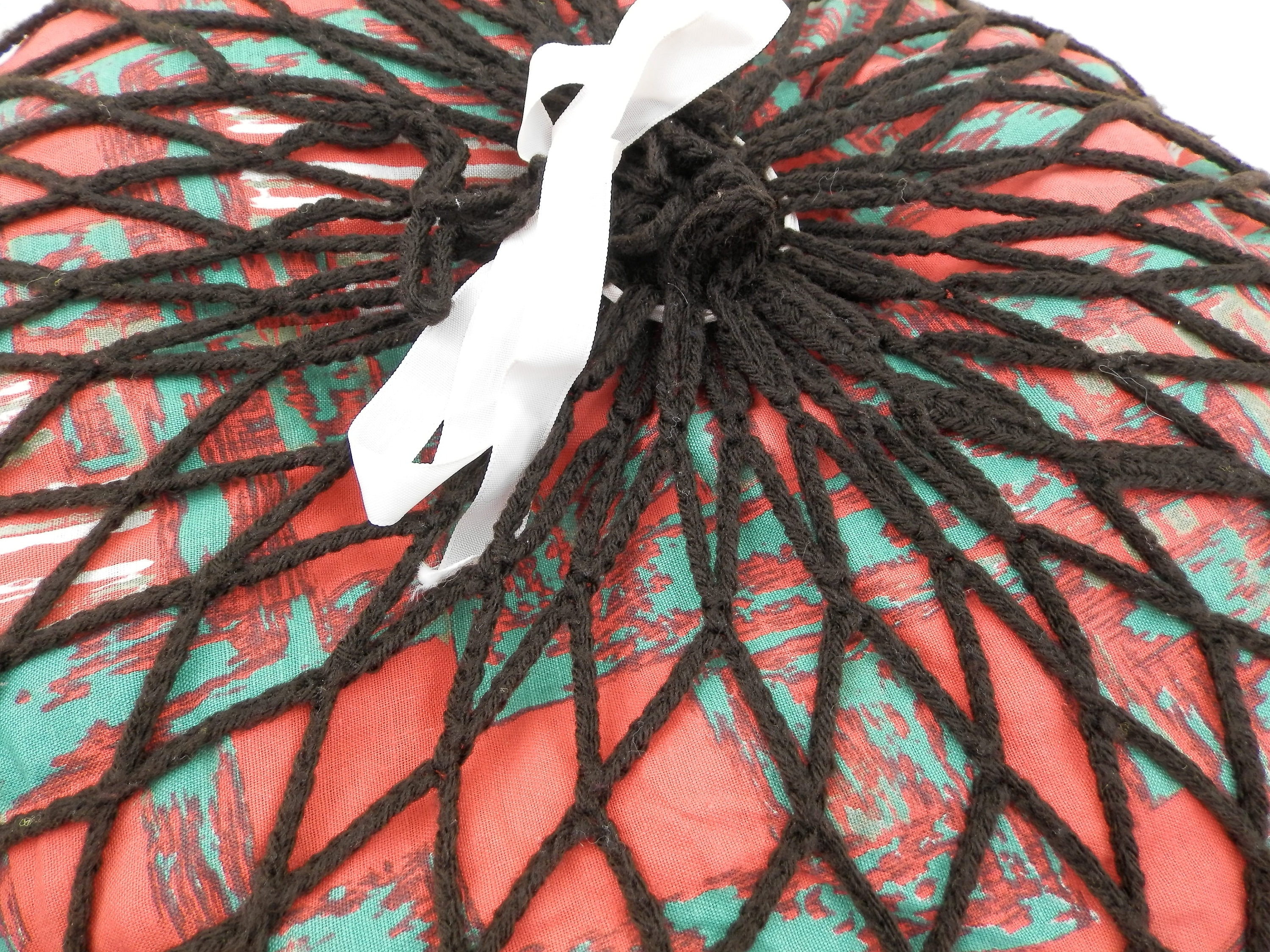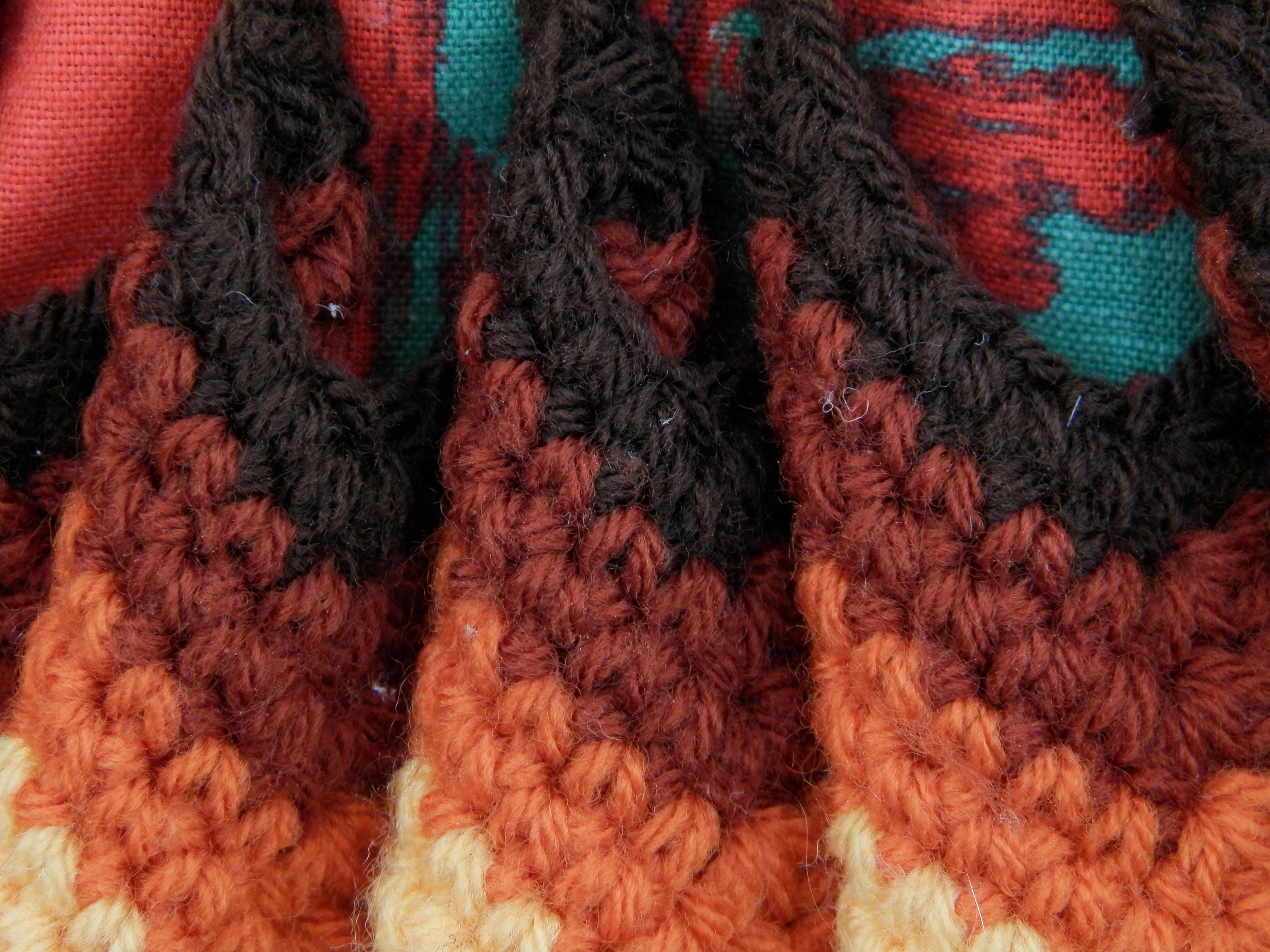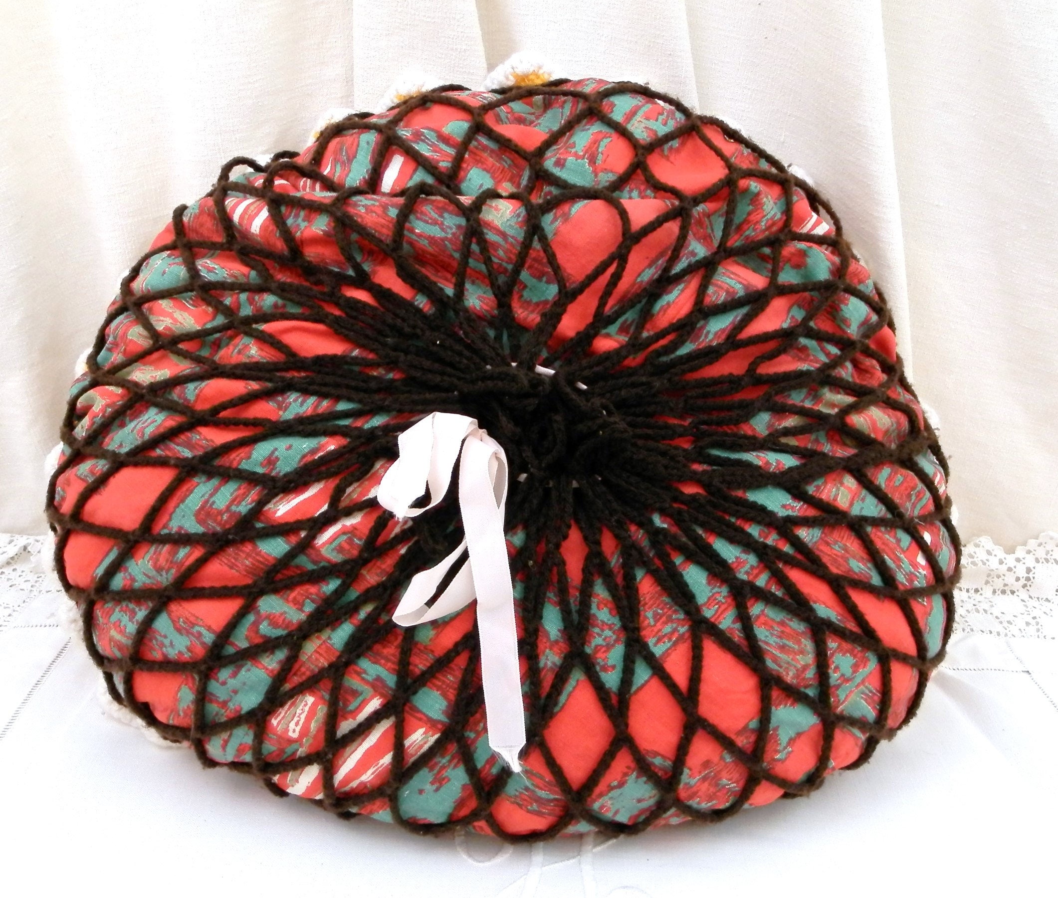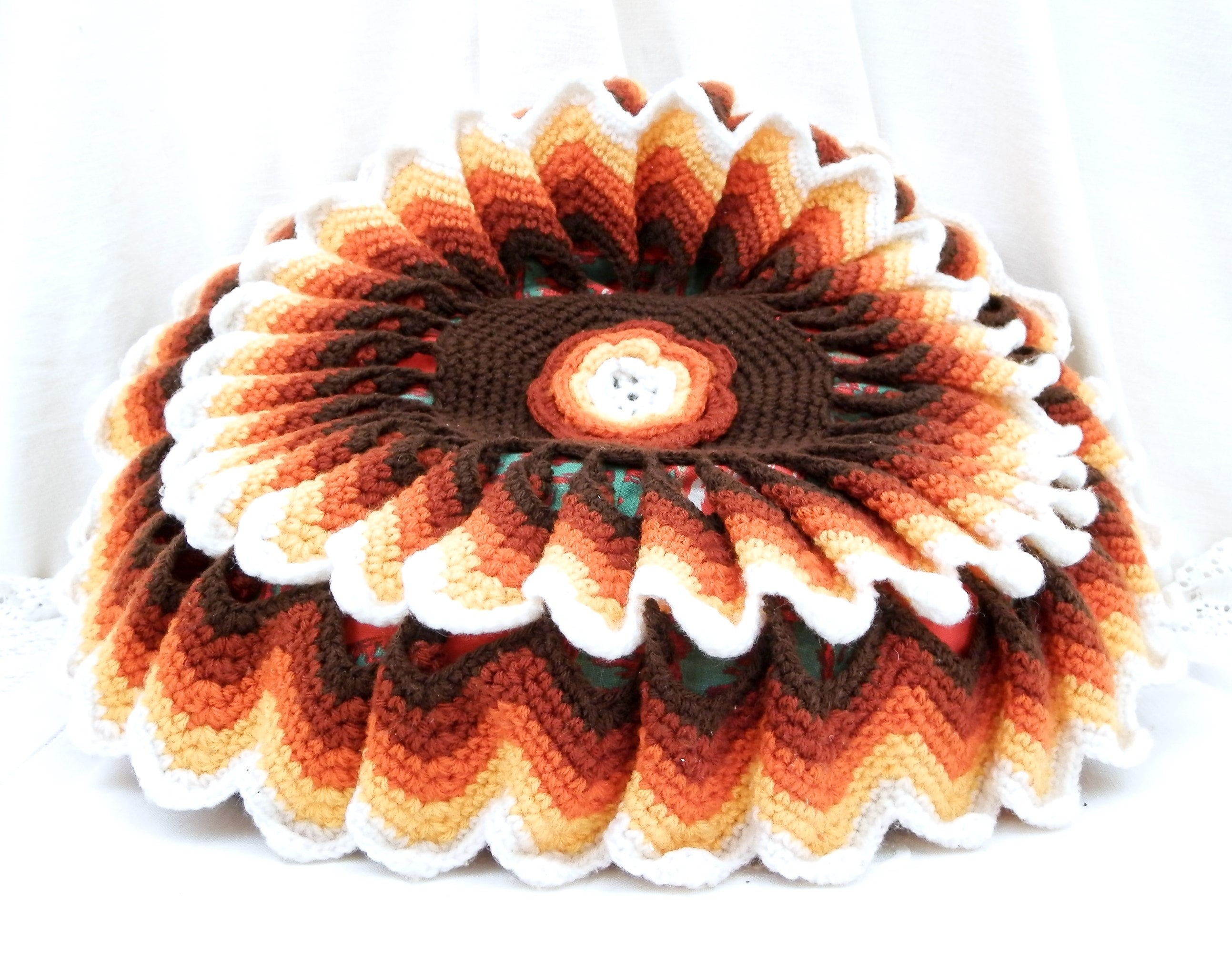 Vintage round crochet cushion cover. Made of brightly colored wool with black netting back and separate cotton pillow. A lovely soft squishy pillow.