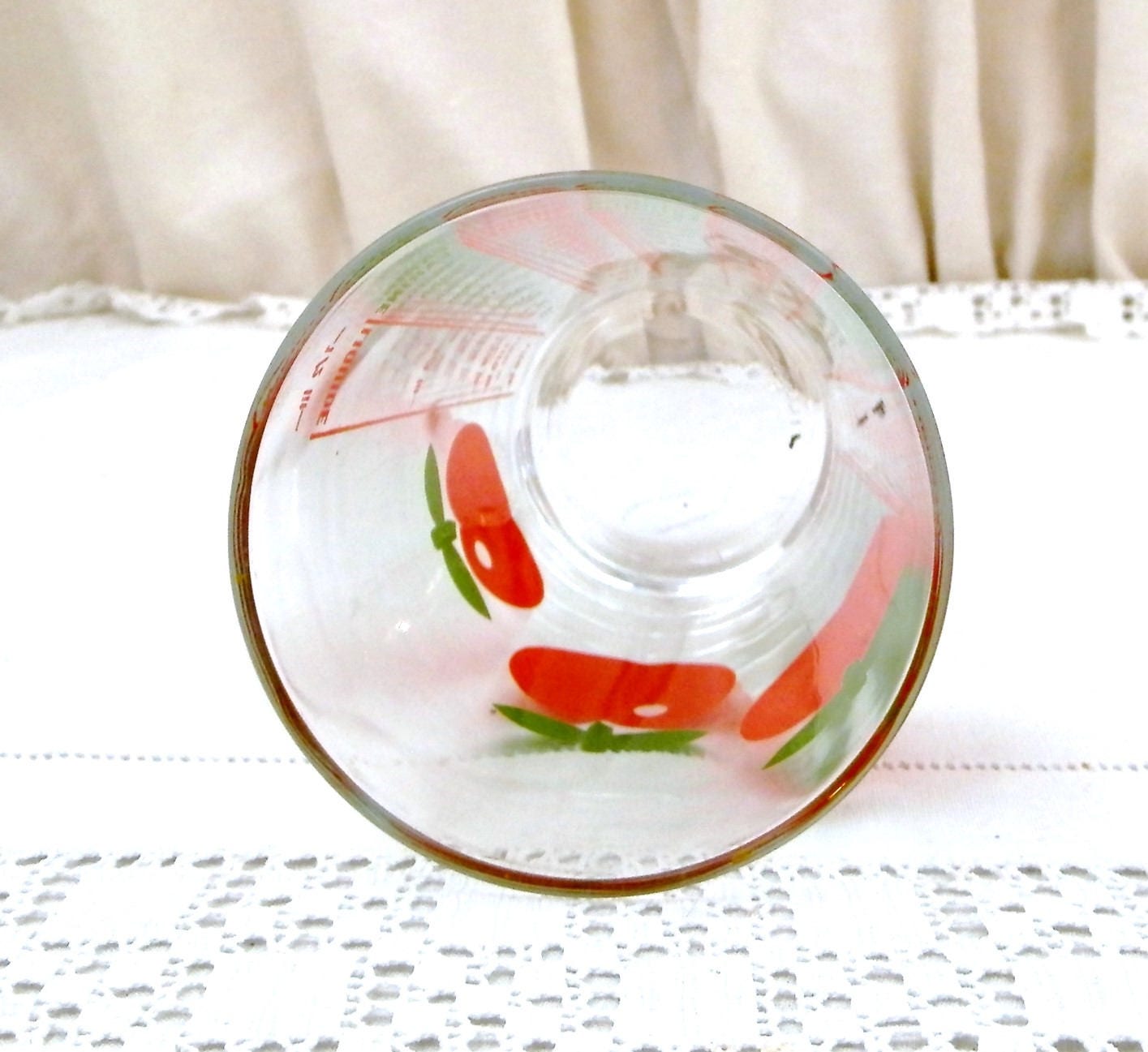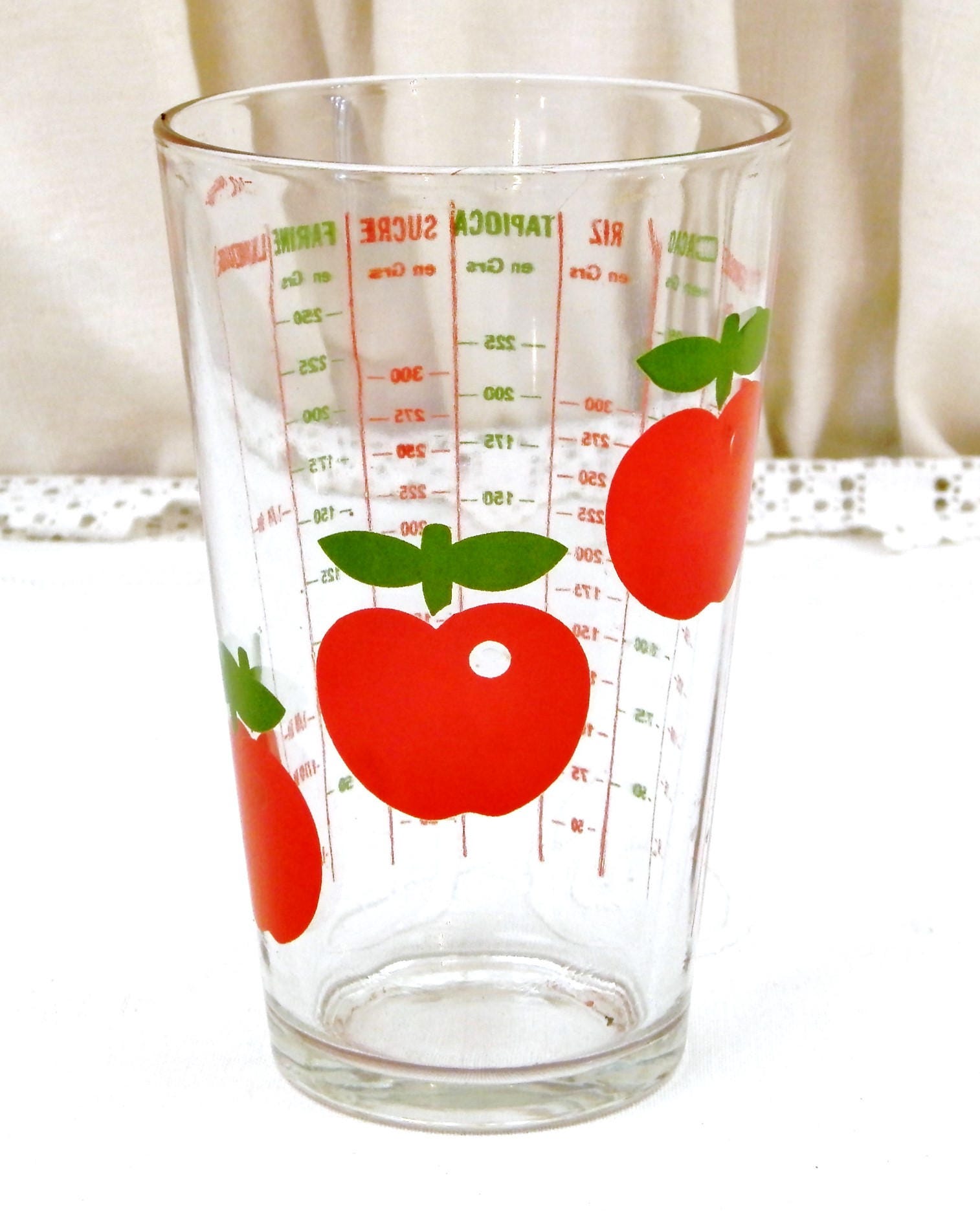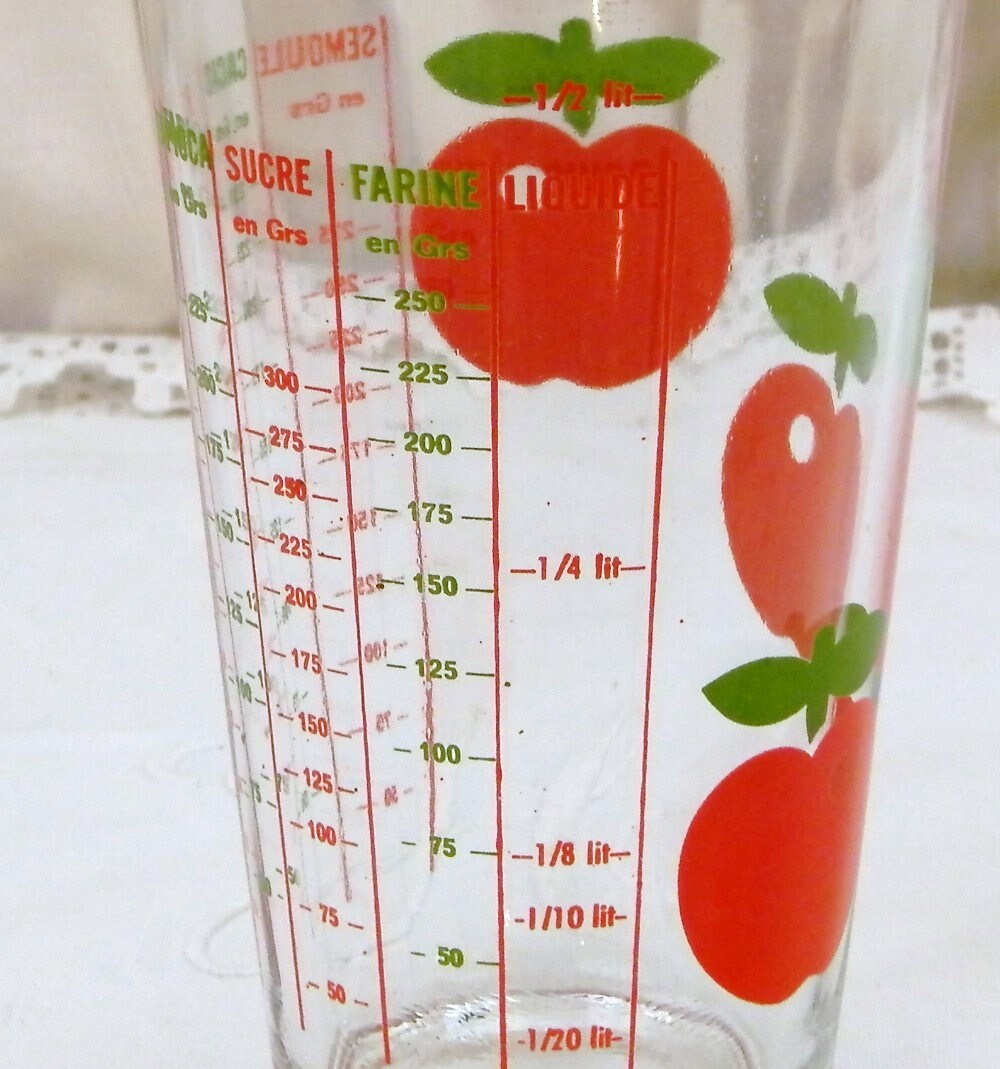 Vintage French 1960s / 1970s glass measuring cup. Made by Henkel with it's iconic red apple pattern. measurement in grammes for semolina, coco, rice, tapioca, sugar, flour, and liquids. capacity 1/2 liters.