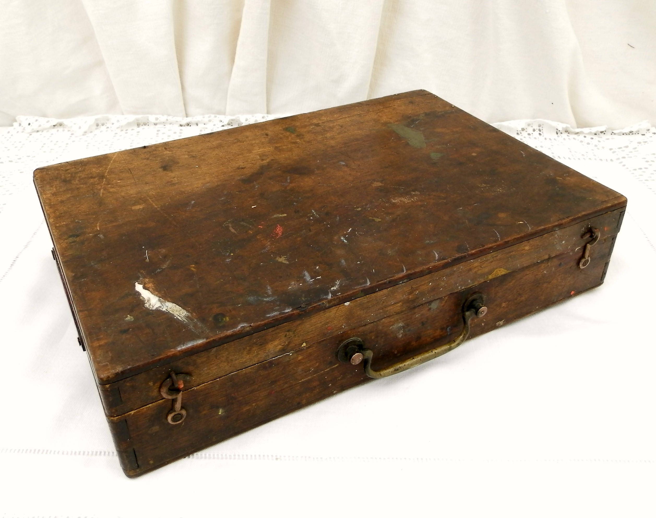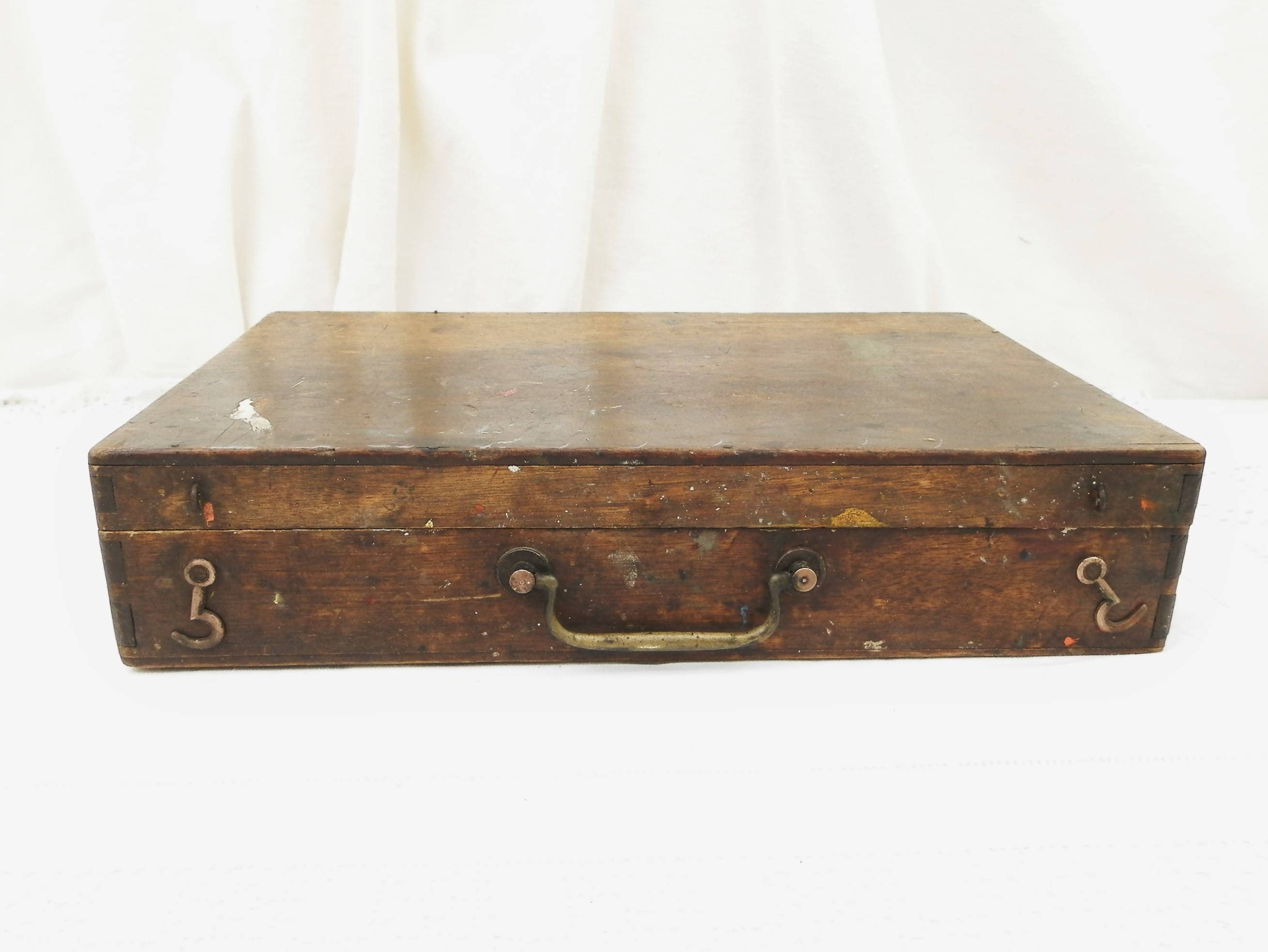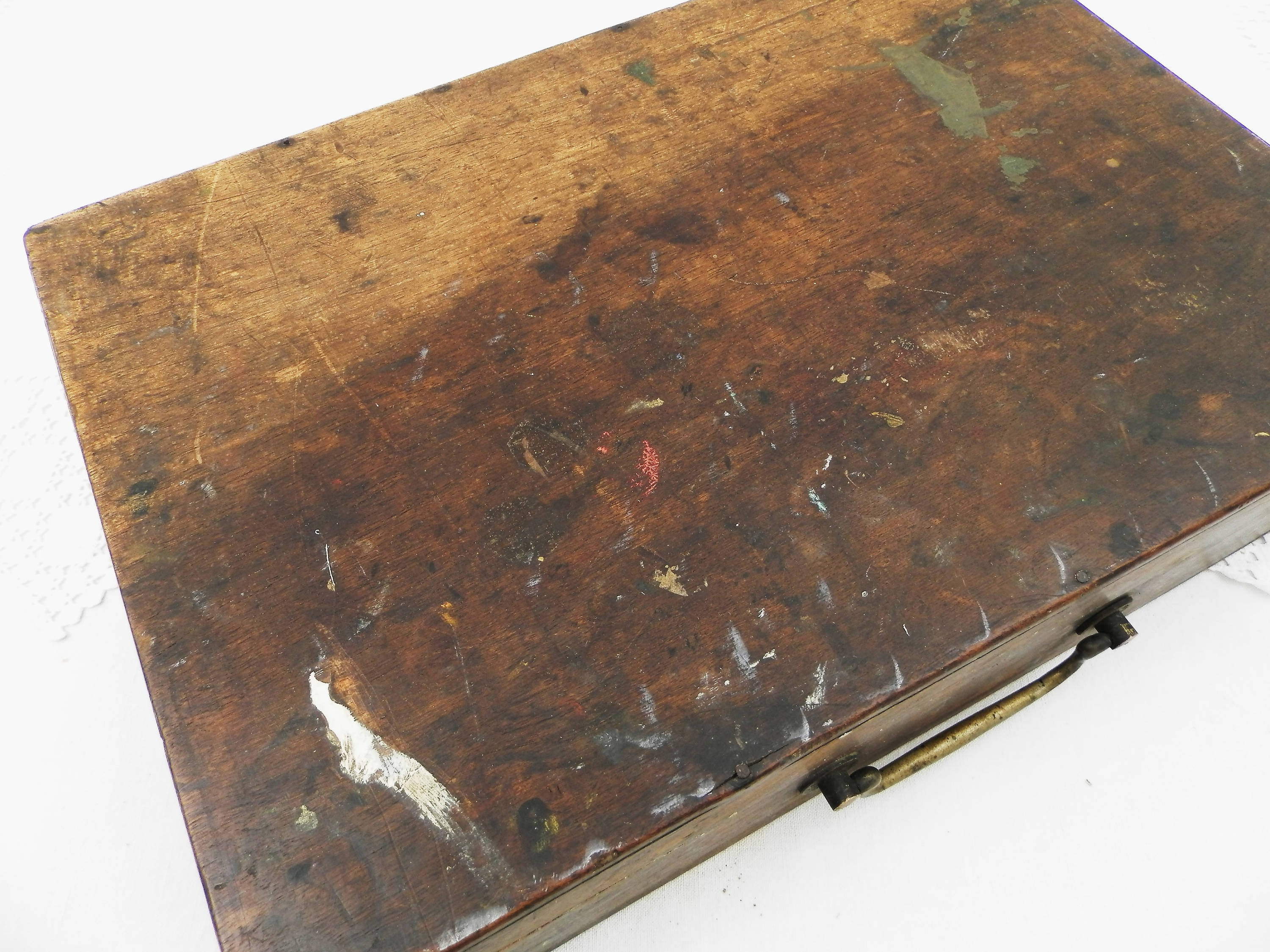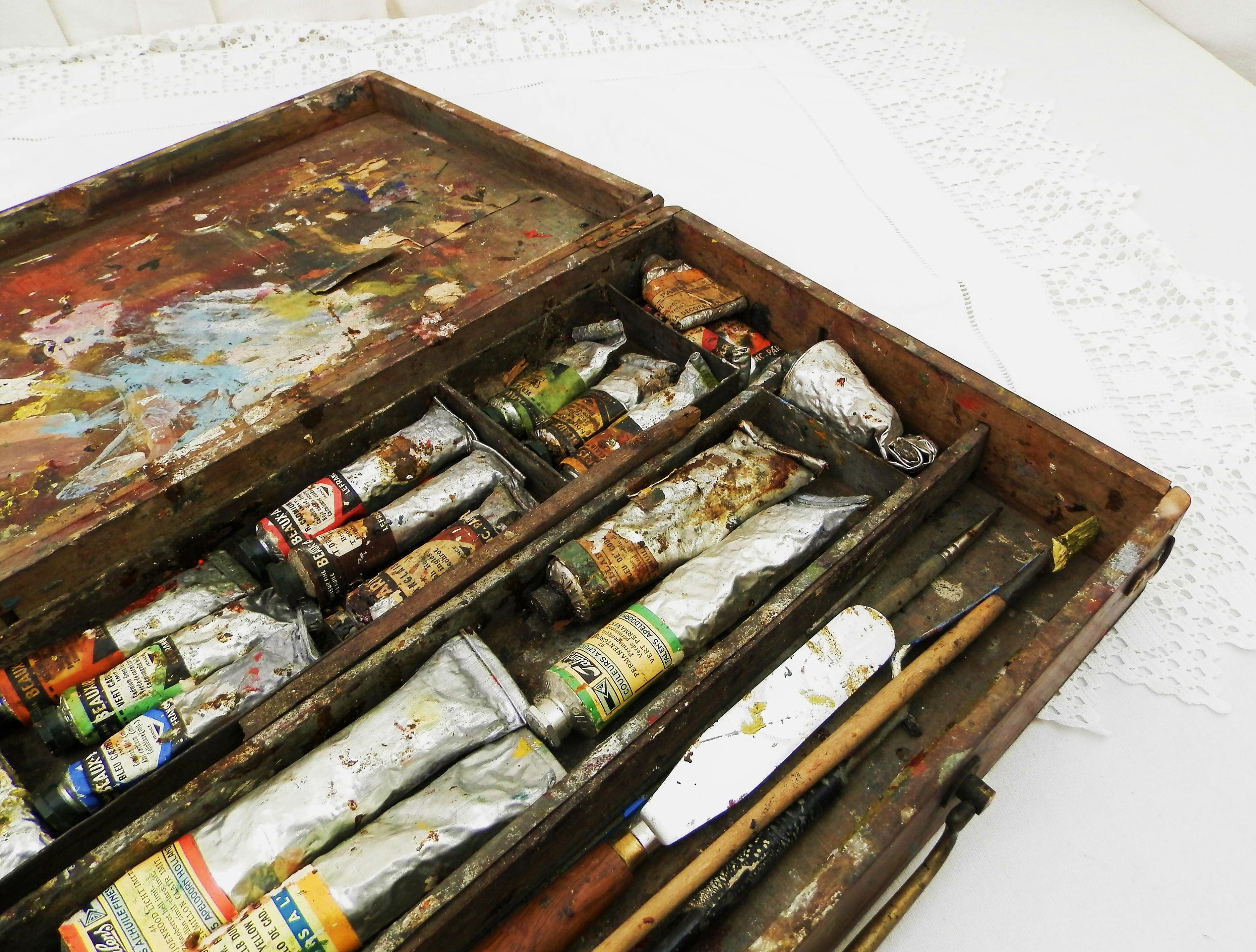 Antique French wooden artist paint box. Lined metal compartments on the inside. Made of oak with dovetail joints. Lovely patina, brass handle and catches. Box is sold with various different tubes of paint and palette knives etc- see photos.