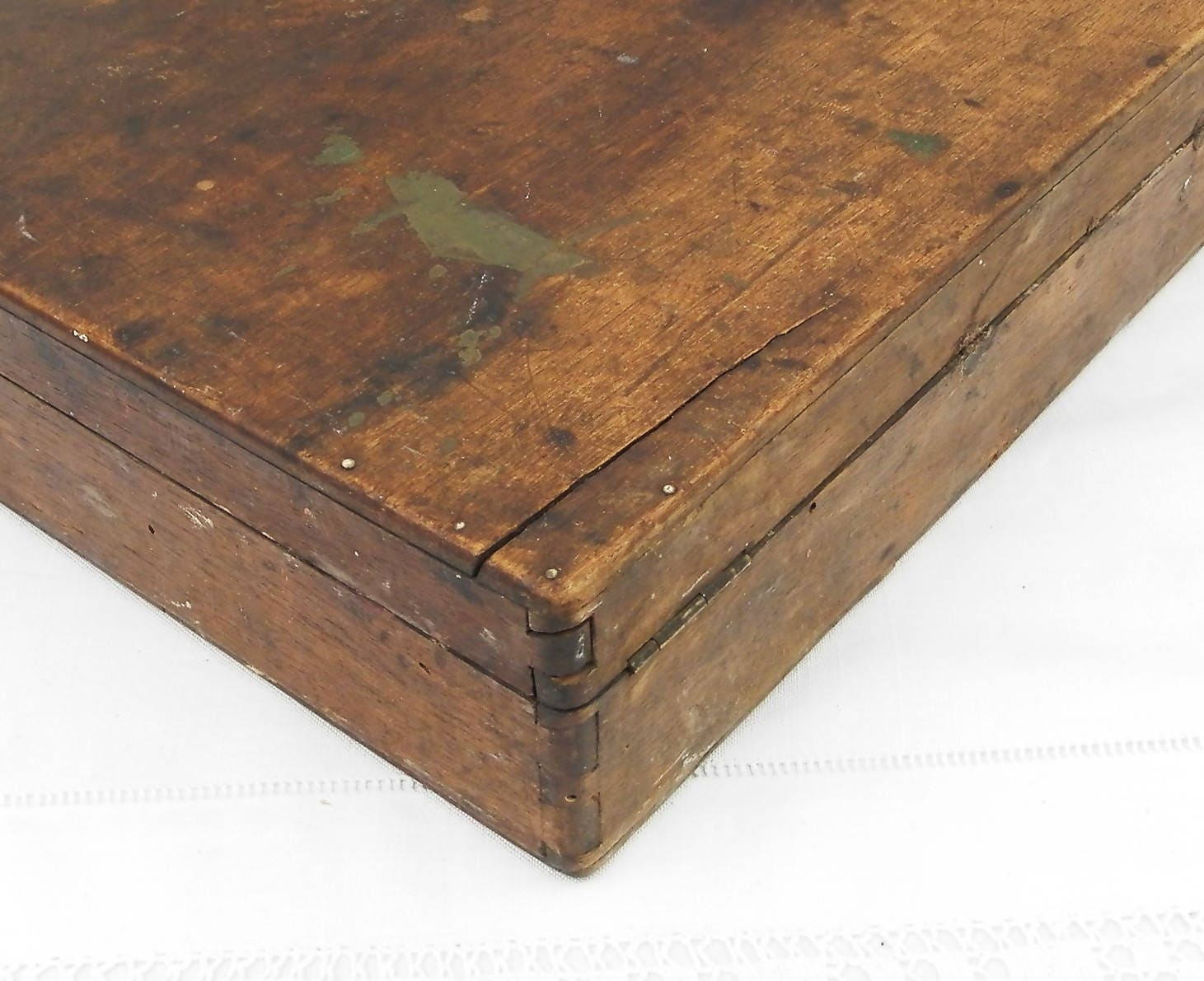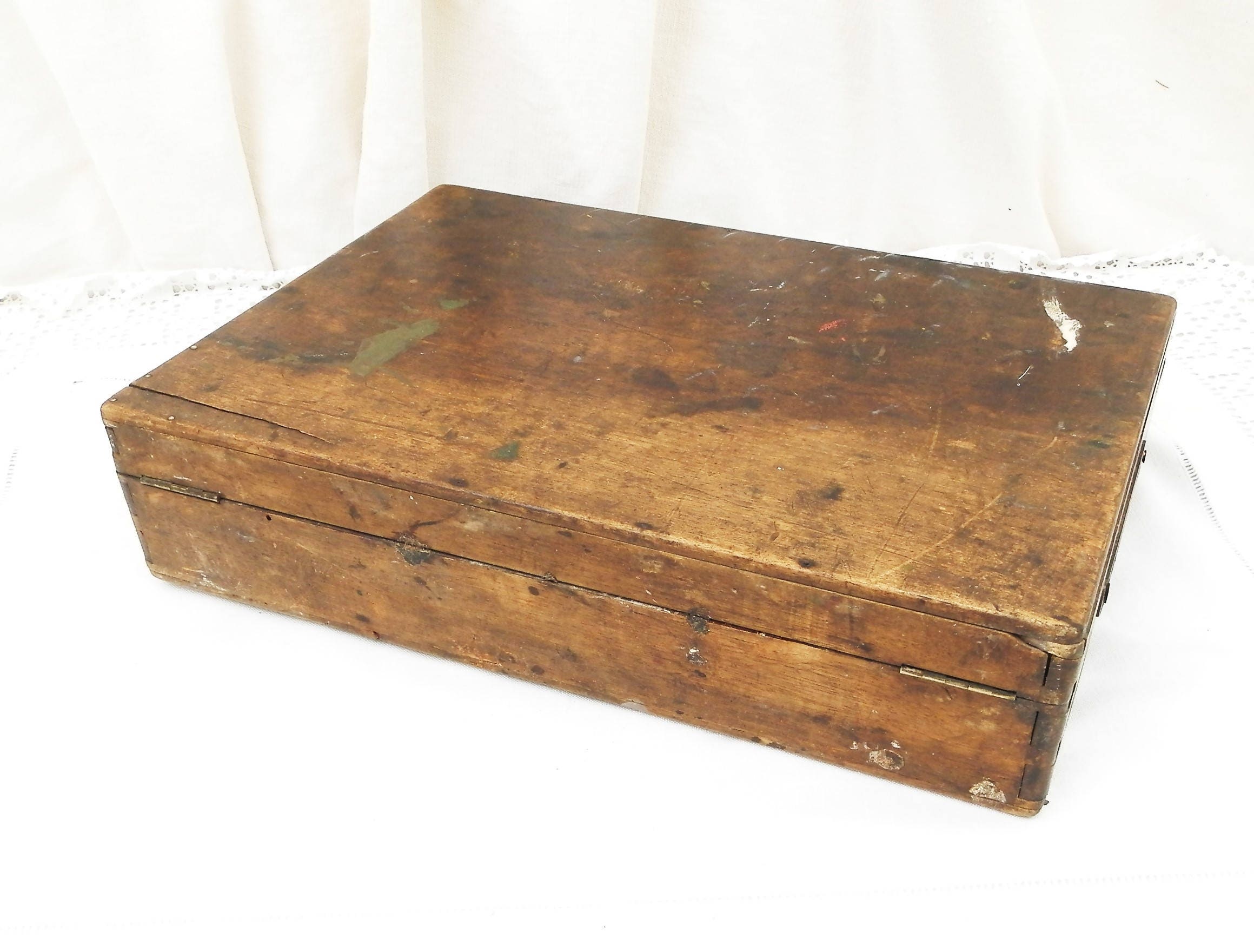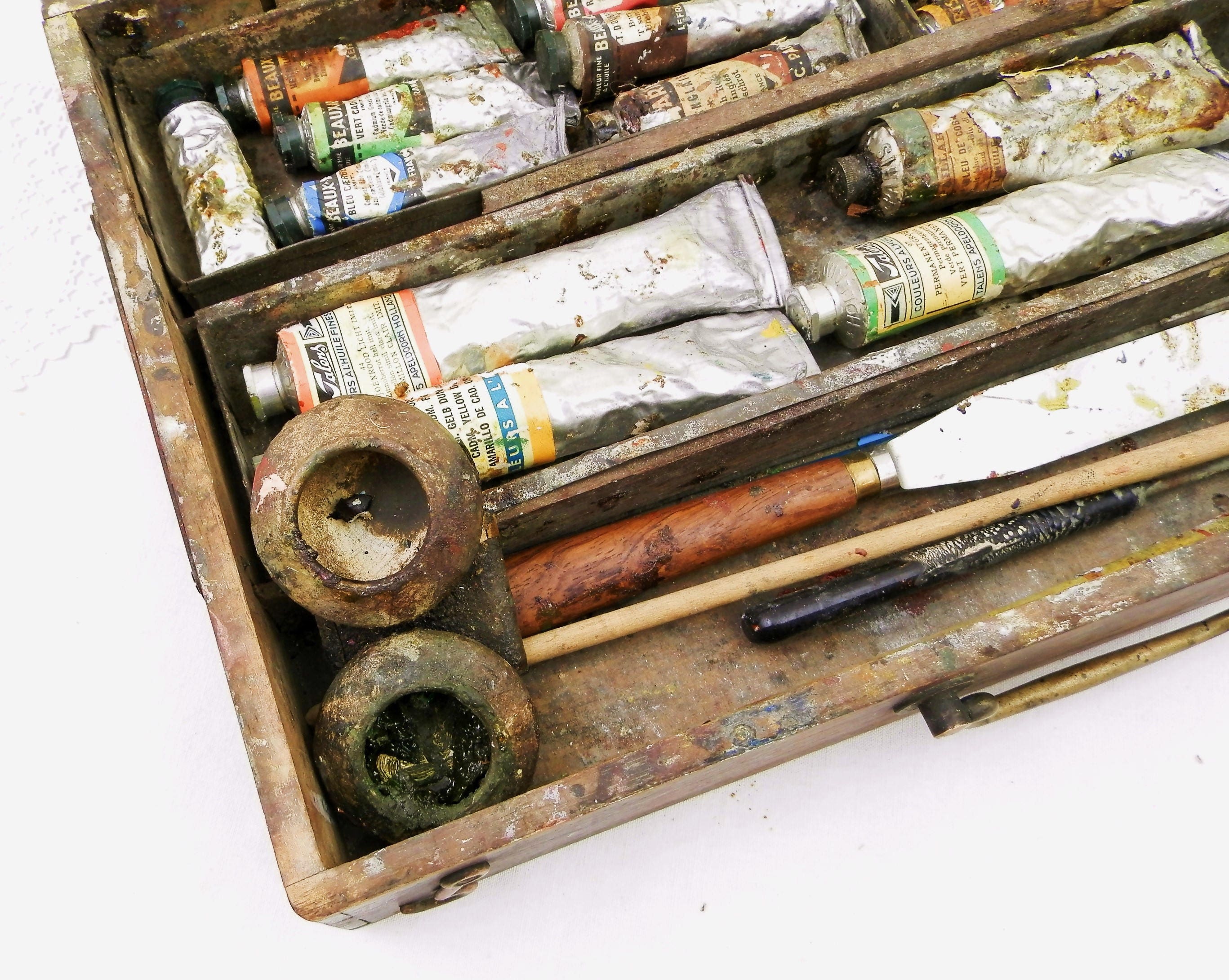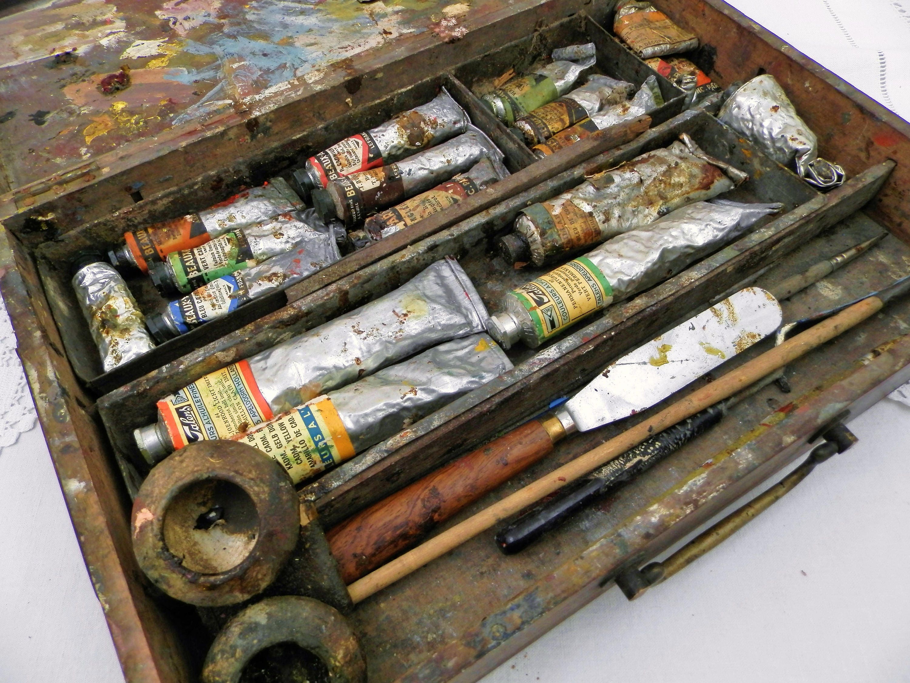 Antique French wooden artist paint box. Lined metal compartments on the inside. Made of oak with dovetail joints. Lovely patina, brass handle and catches. Box is sold with various different tubes of paint and palette knives etc- see photos.