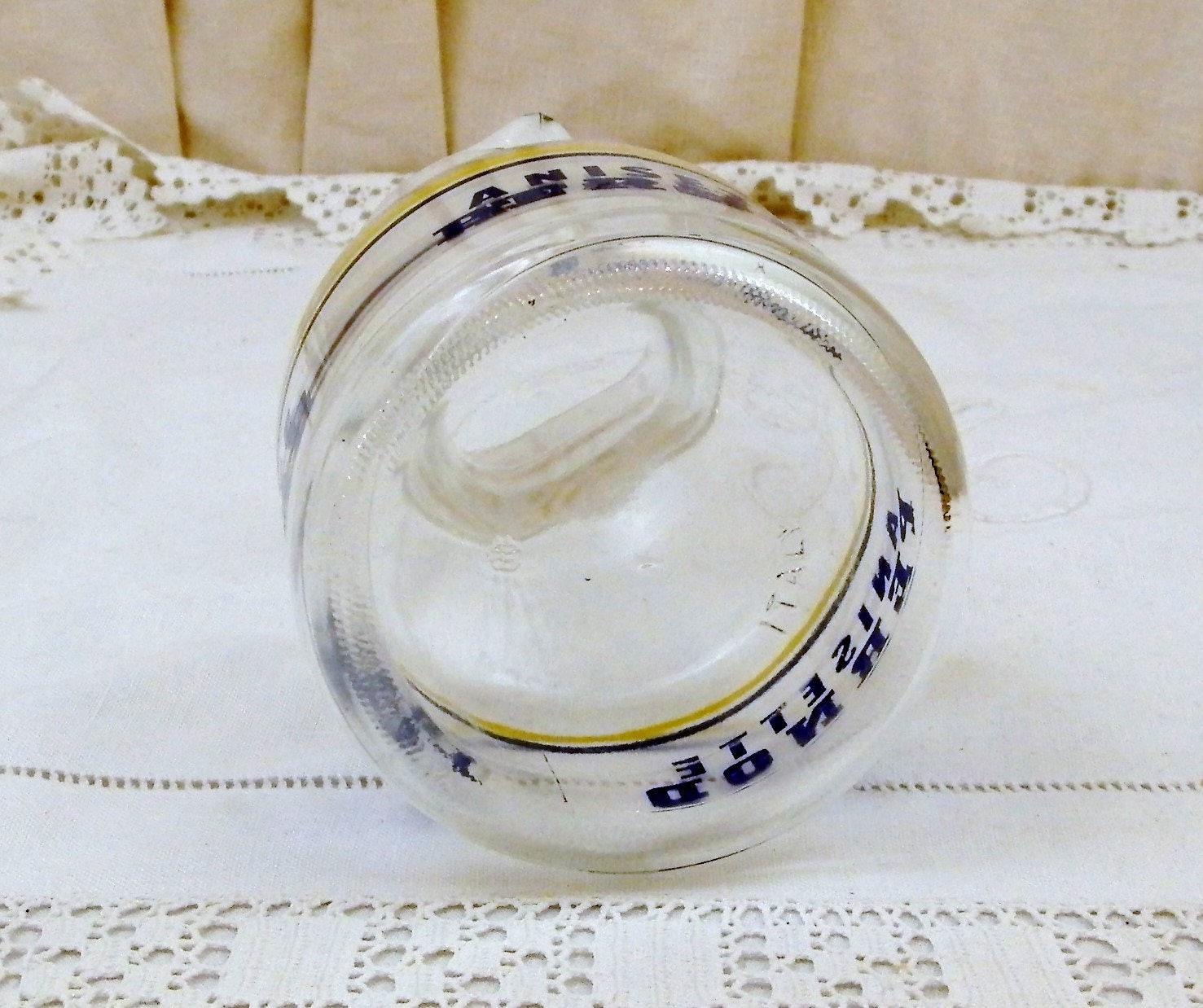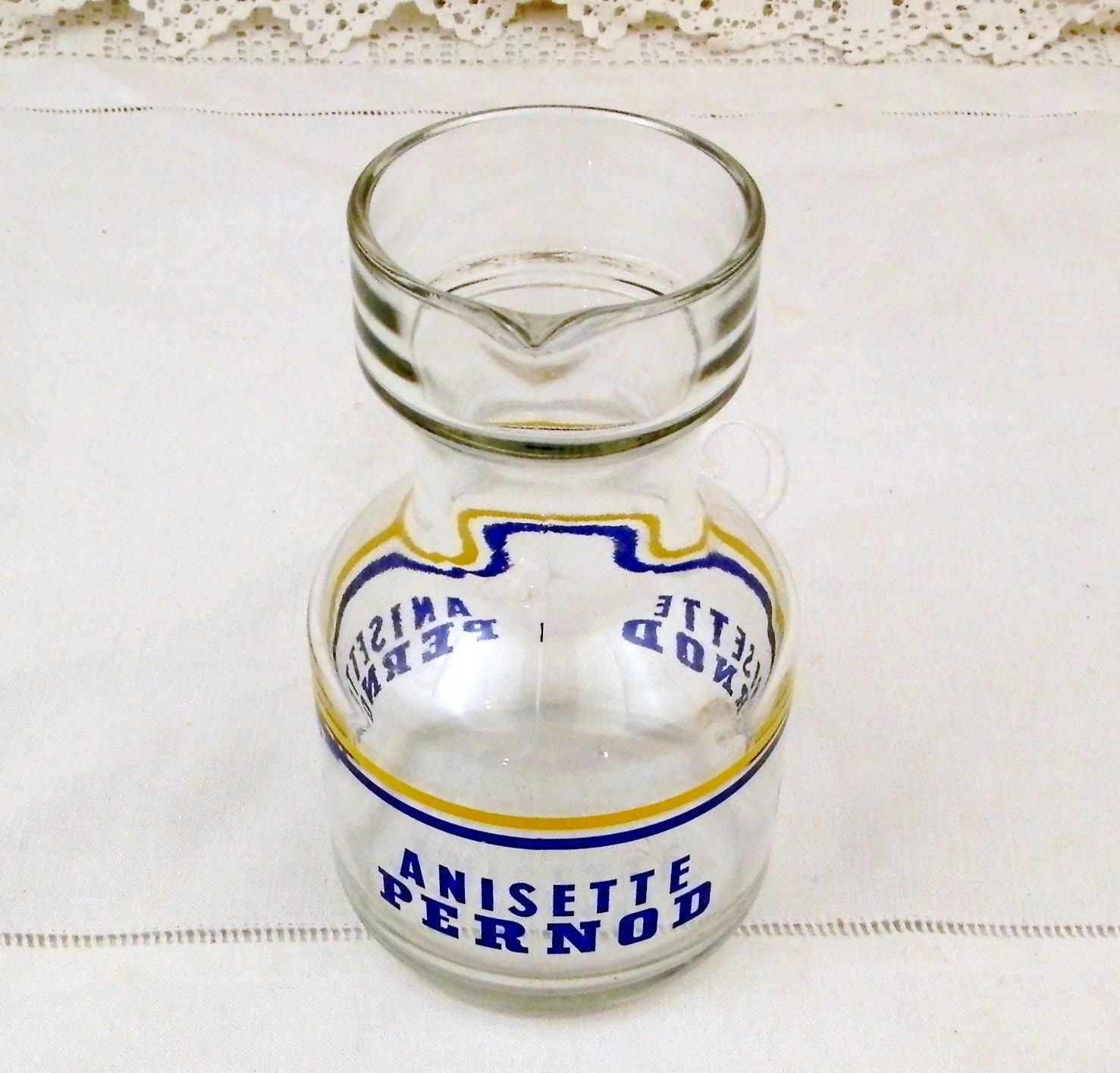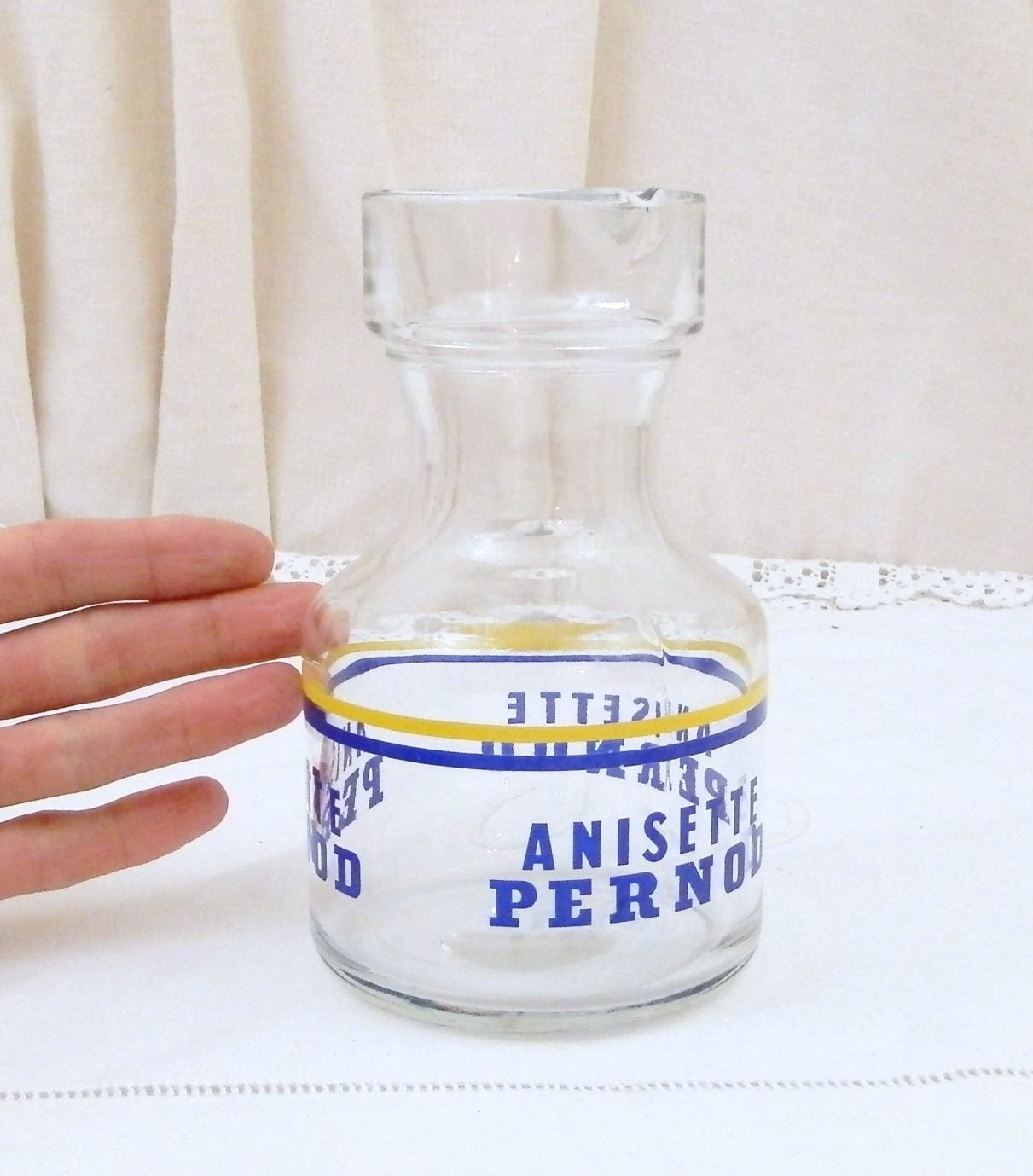 Vintage glass water carafe. Originally an advertising gift for French Cafés. Clear glass with blue and yellow graphics. Traditionally Pernod is from the south of France.
