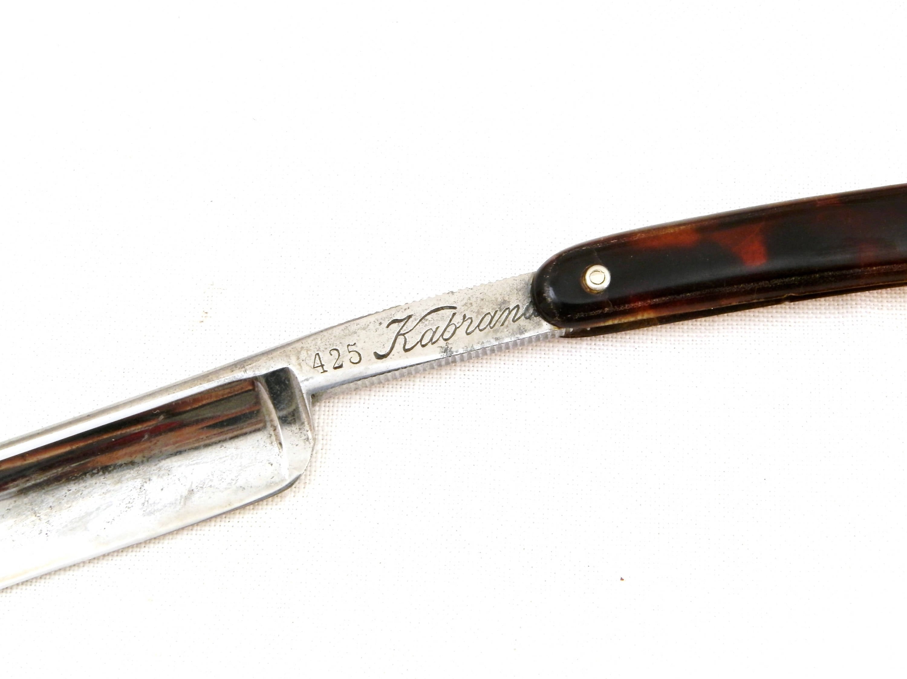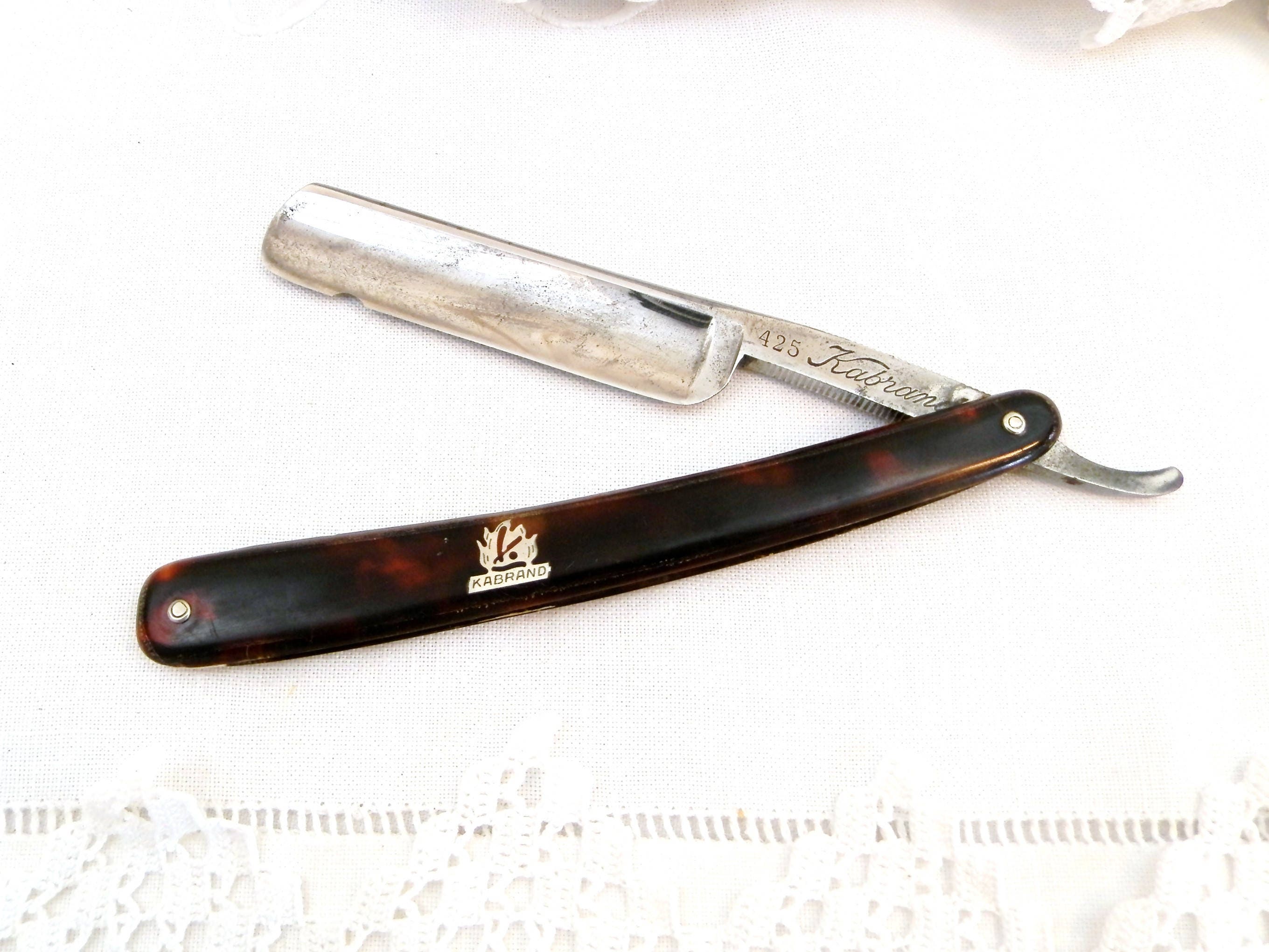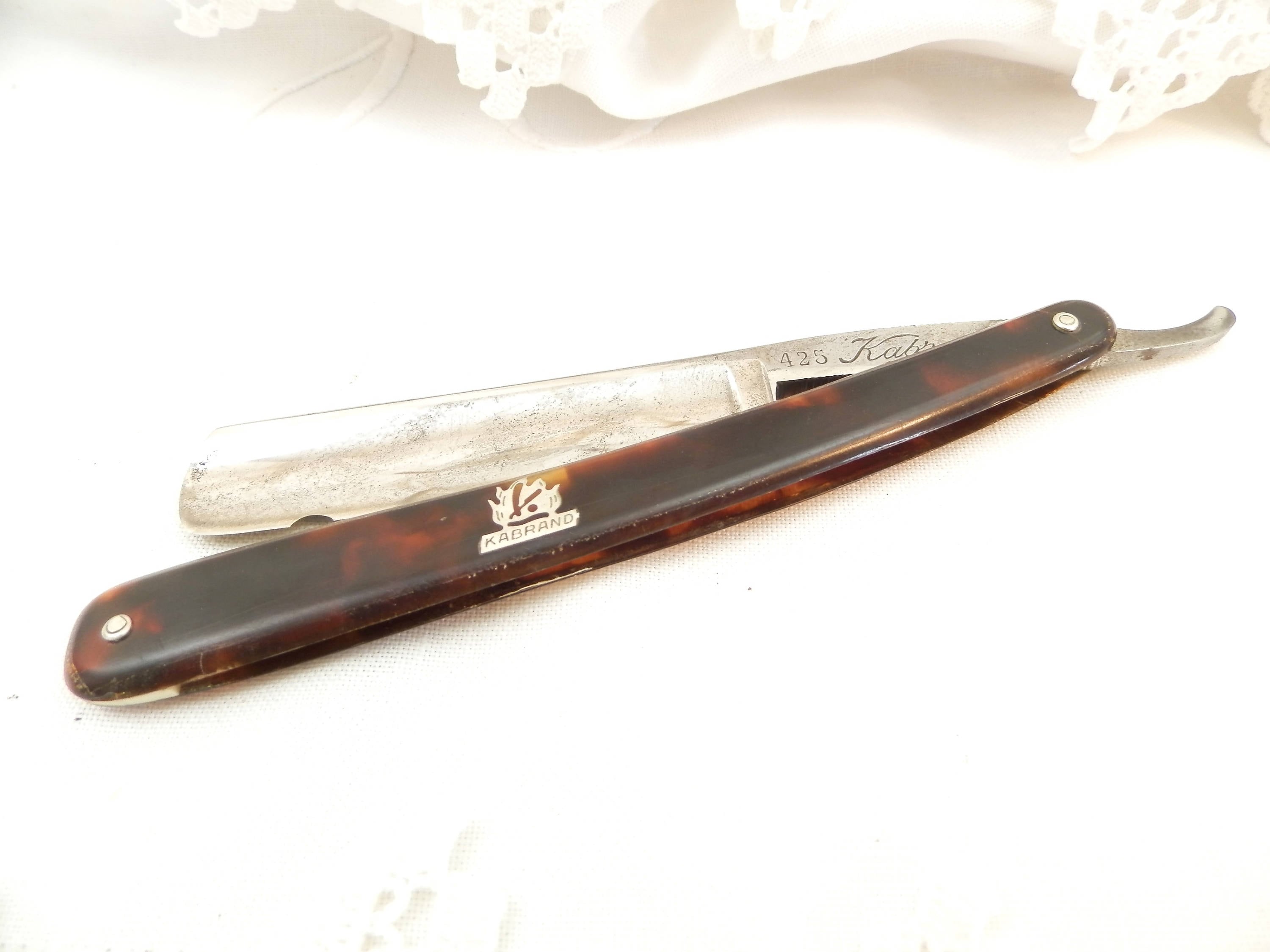 Antique French cut throat razor made by Kabrand. Kabrand is a French maker, the blade is inscribed in French and model number is 425. Faux tortoiseshell Lucite handle. Found at a French flea market.