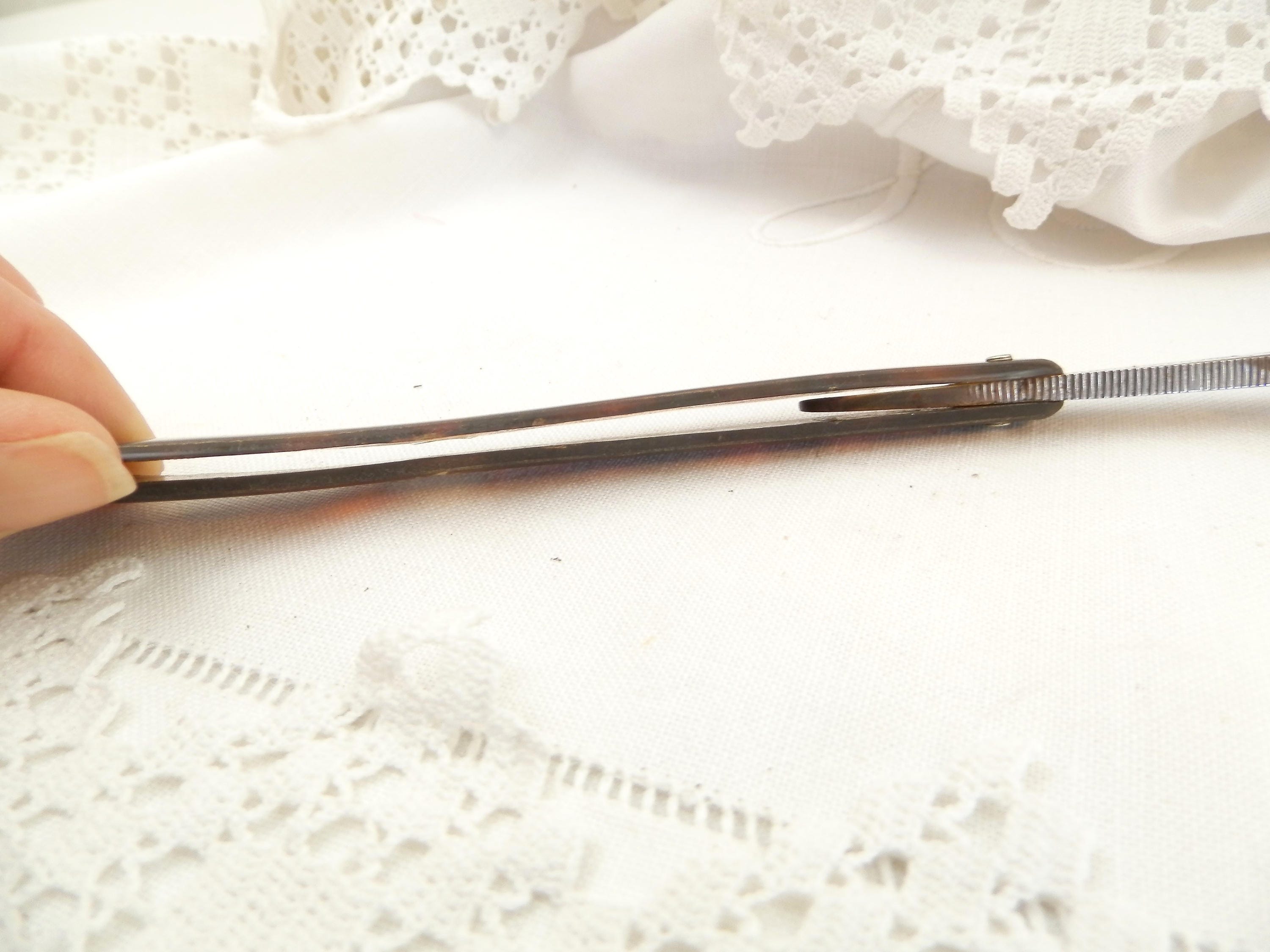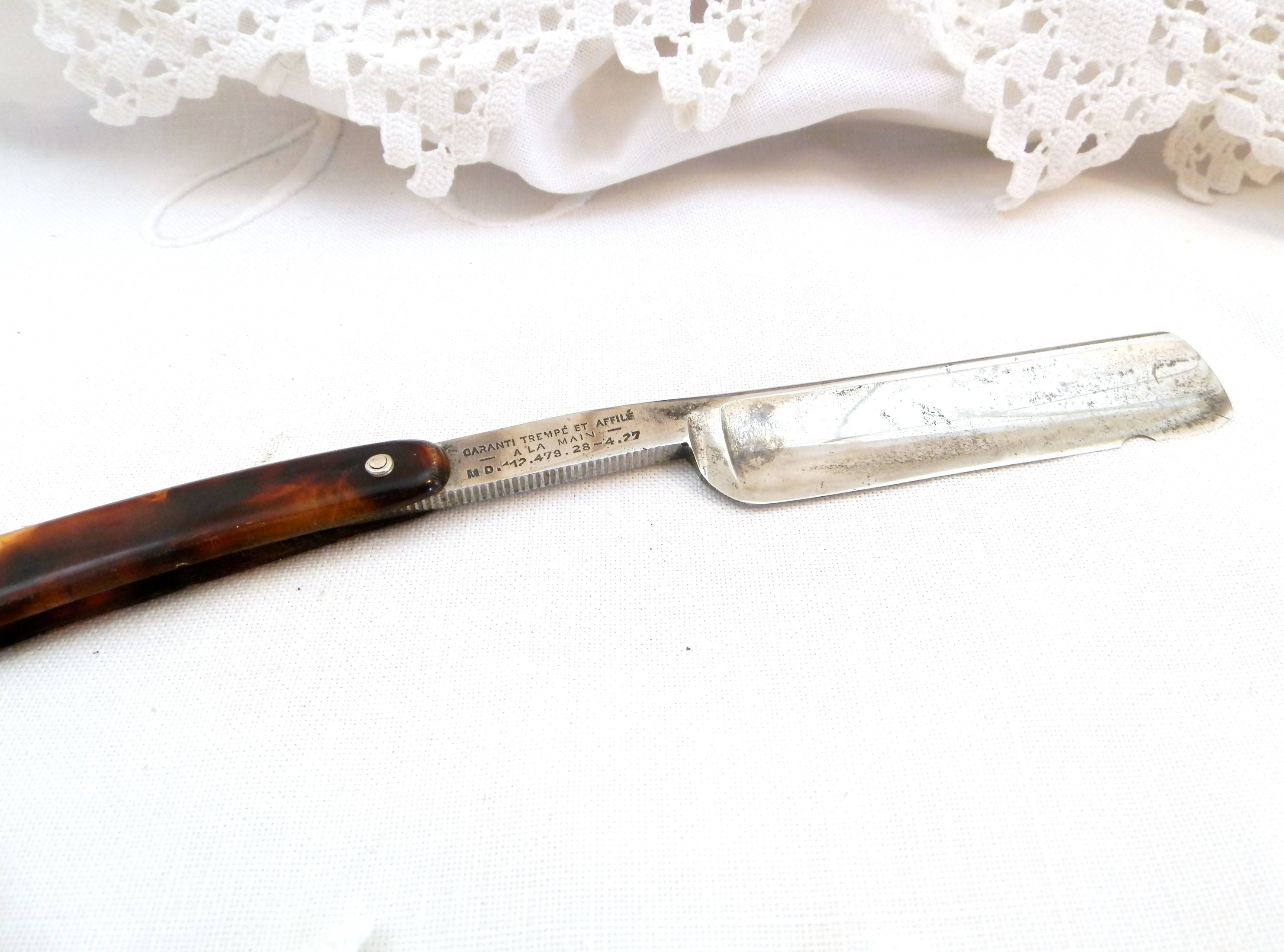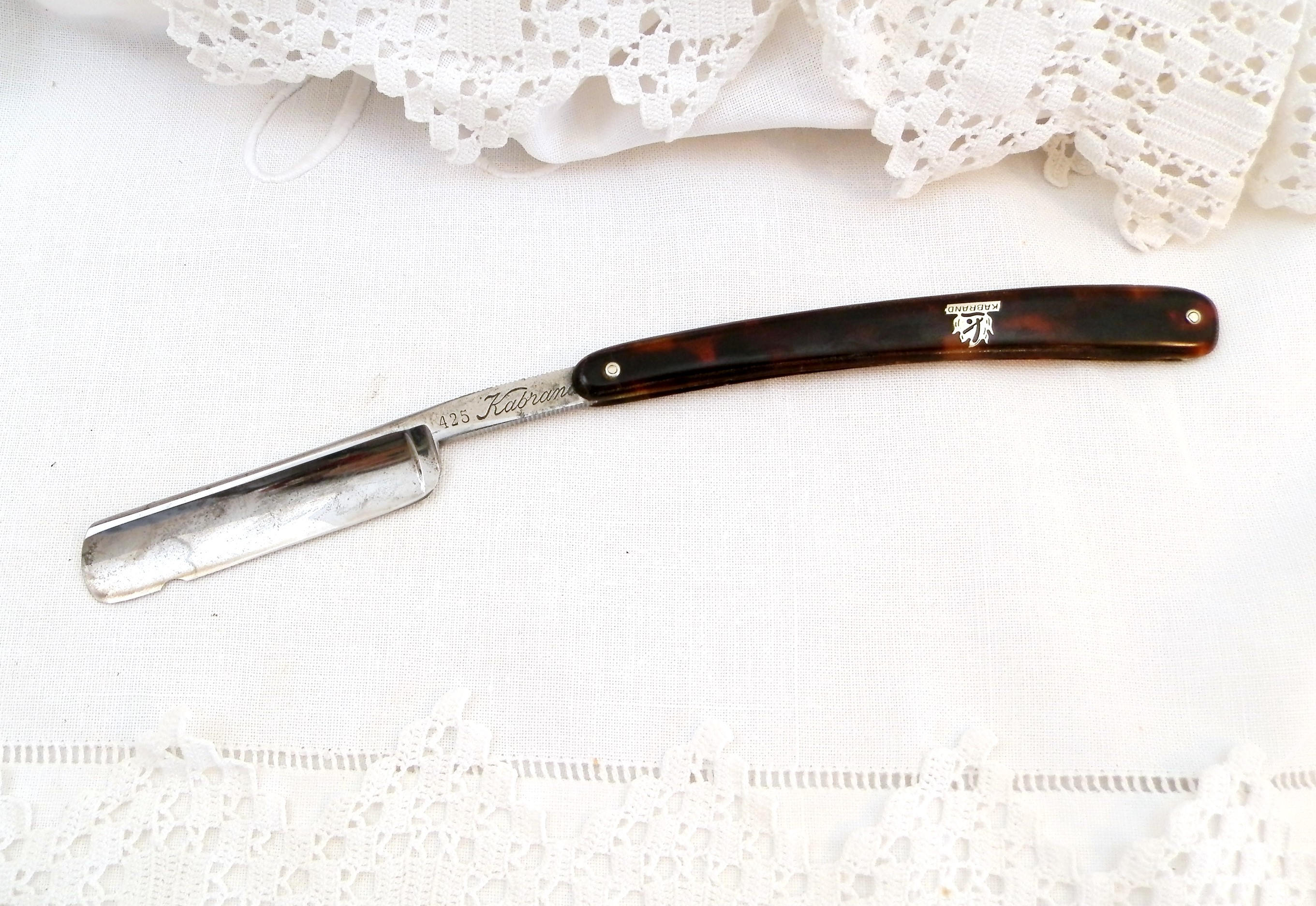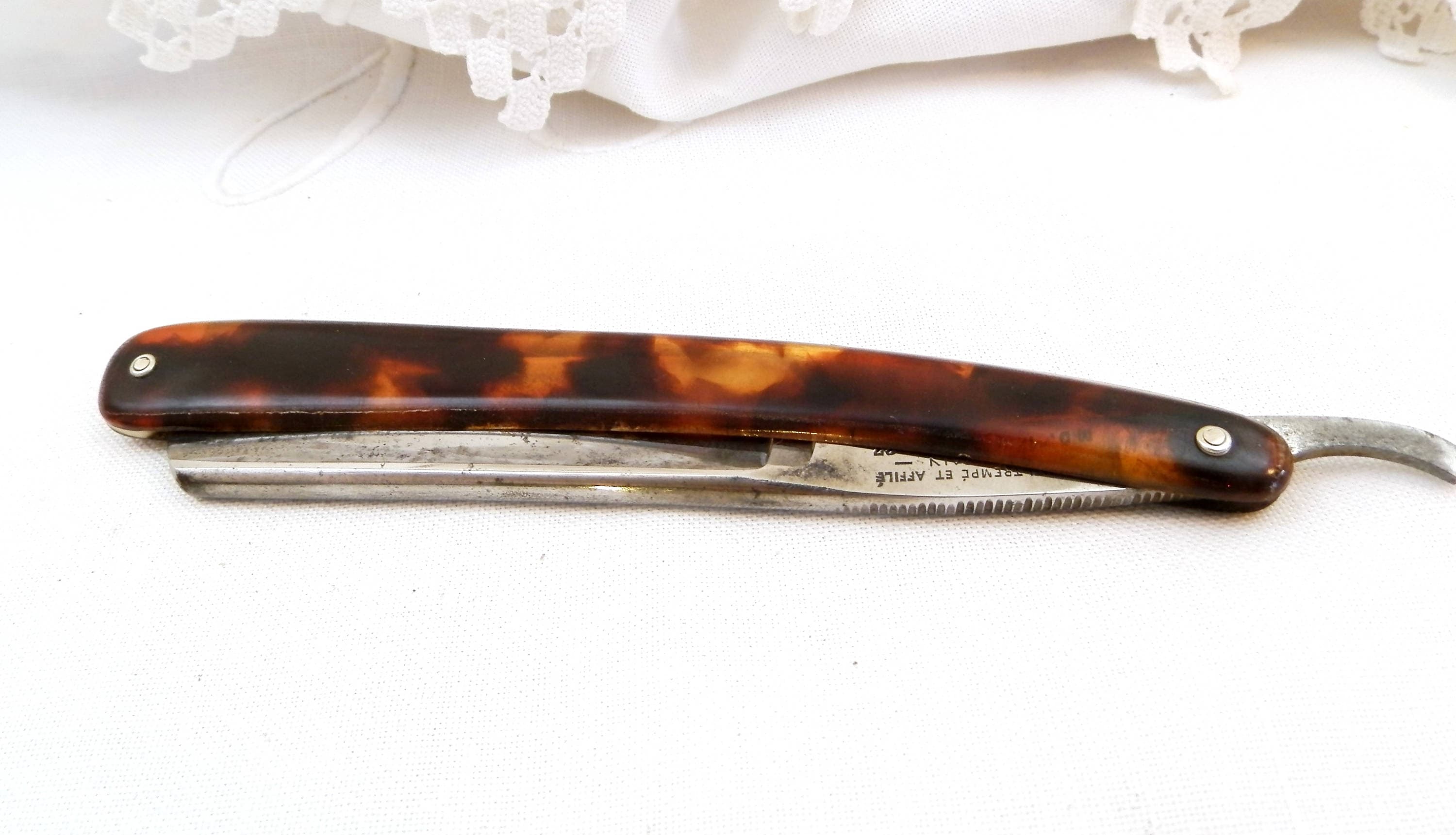 Antique French cut throat razor made by Kabrand. Kabrand is a French maker, the blade is inscribed in French and model number is 425. Faux tortoiseshell Lucite handle. Found at a French flea market.