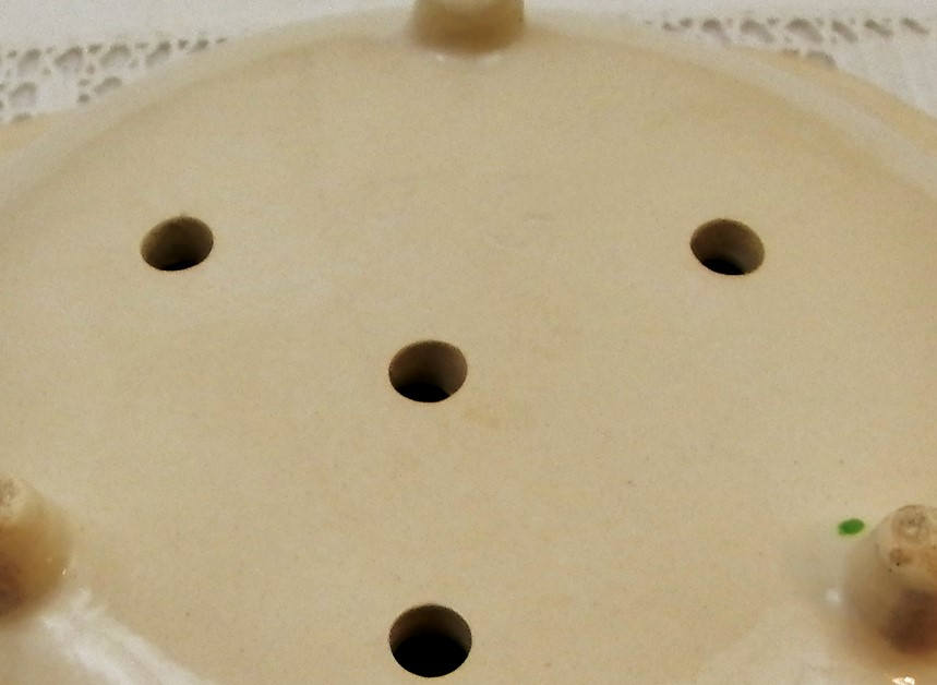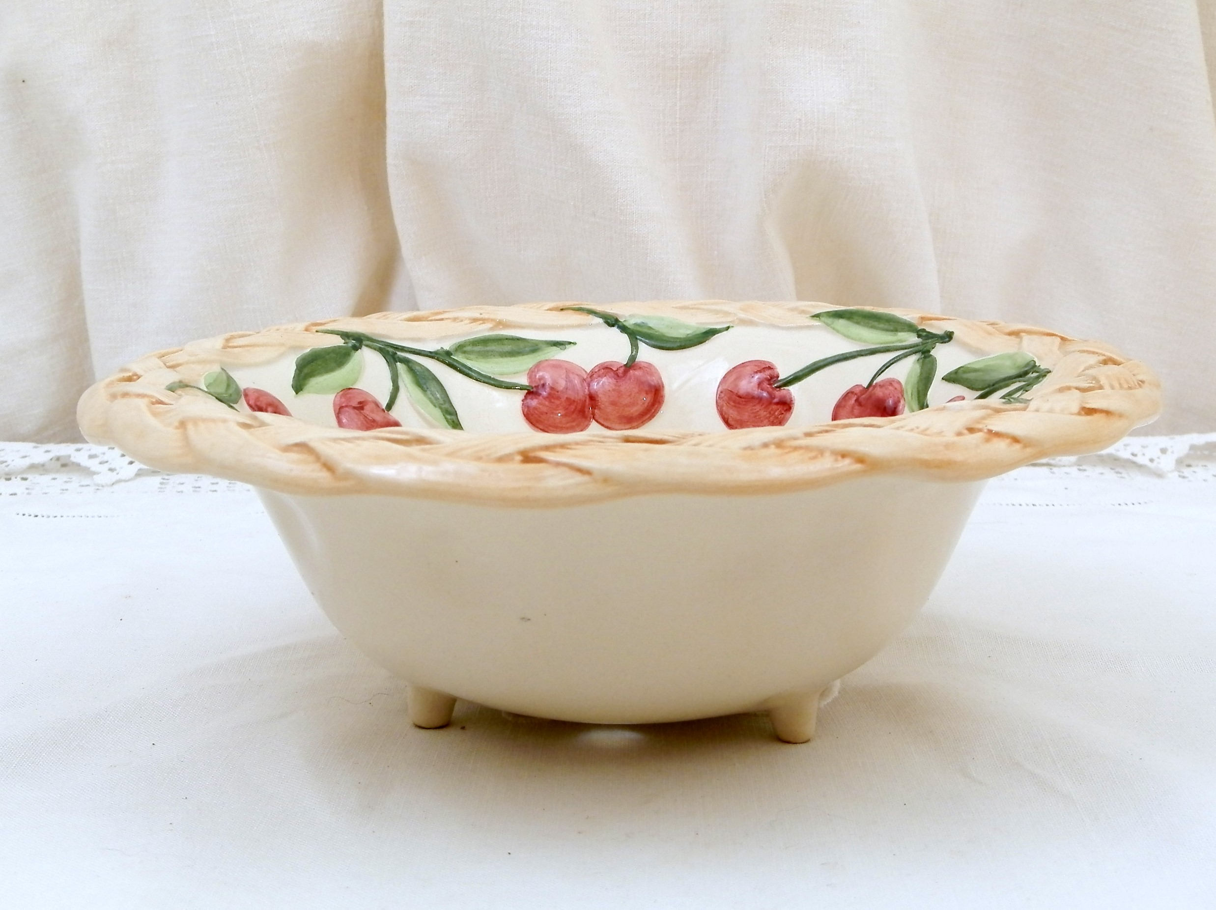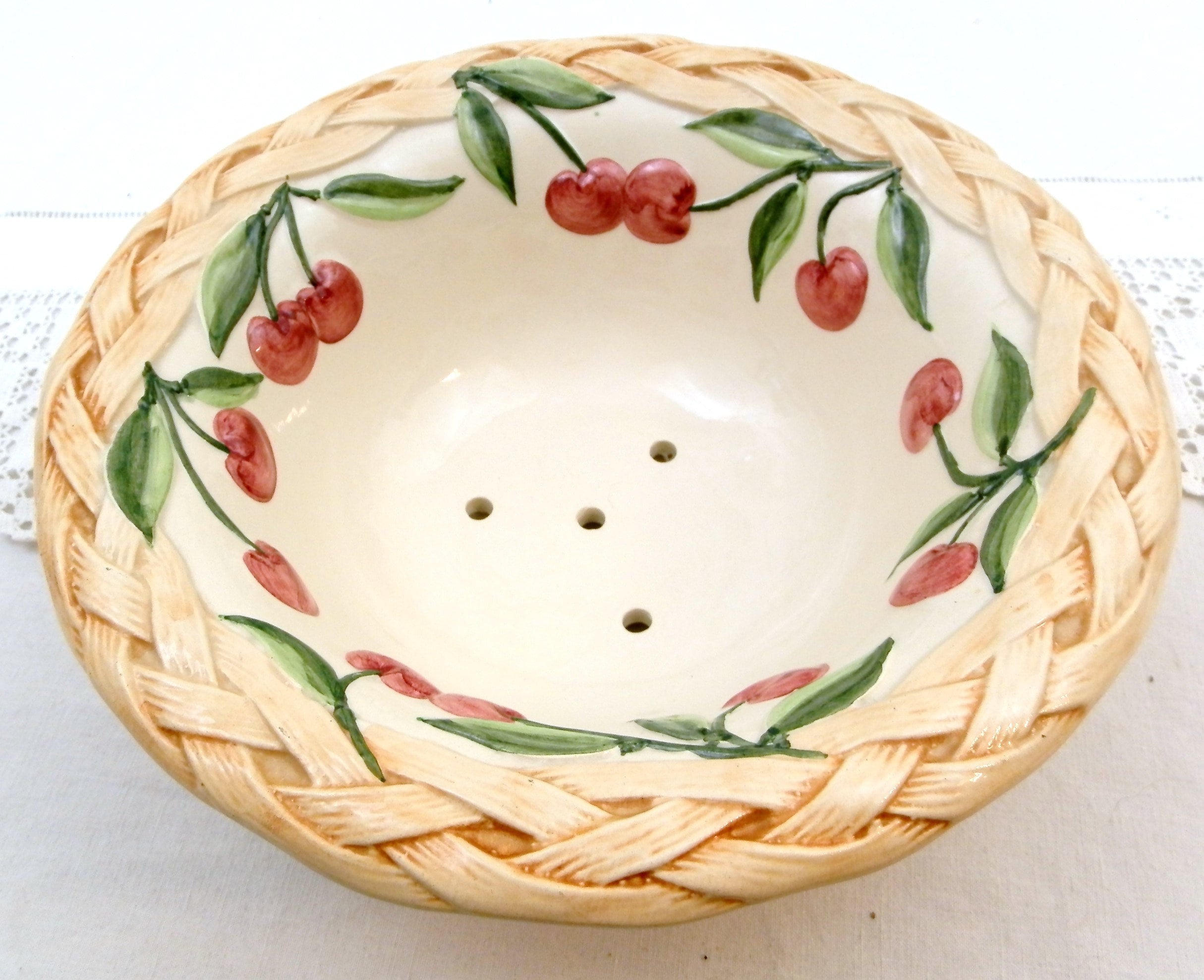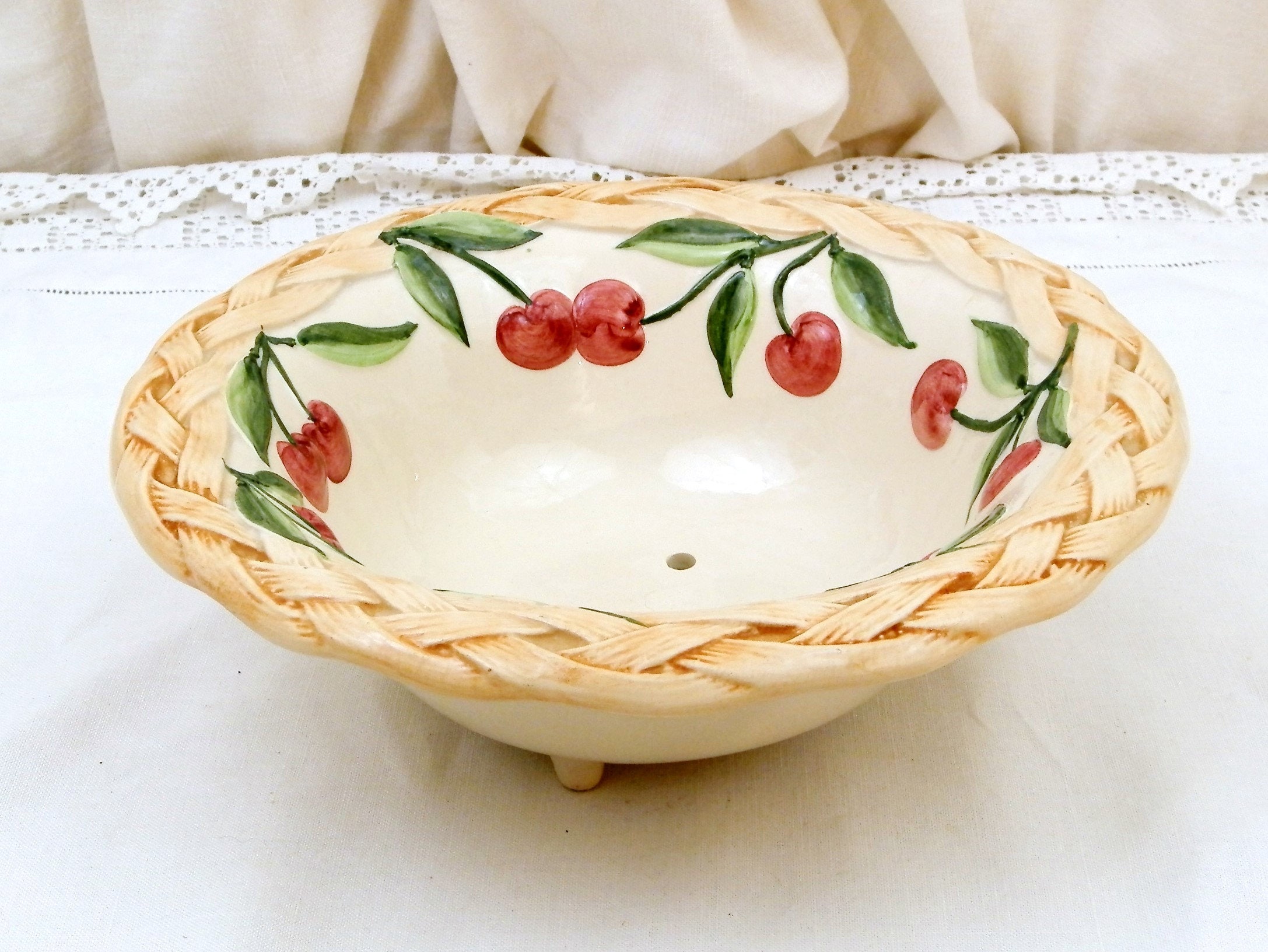 Vintage ceramic berry bowl. Stands on 3 small feet with 4 draining holes at the bottom, decorated with a colored raised cherry and woven basket pattern. Signed F.G on the underside.