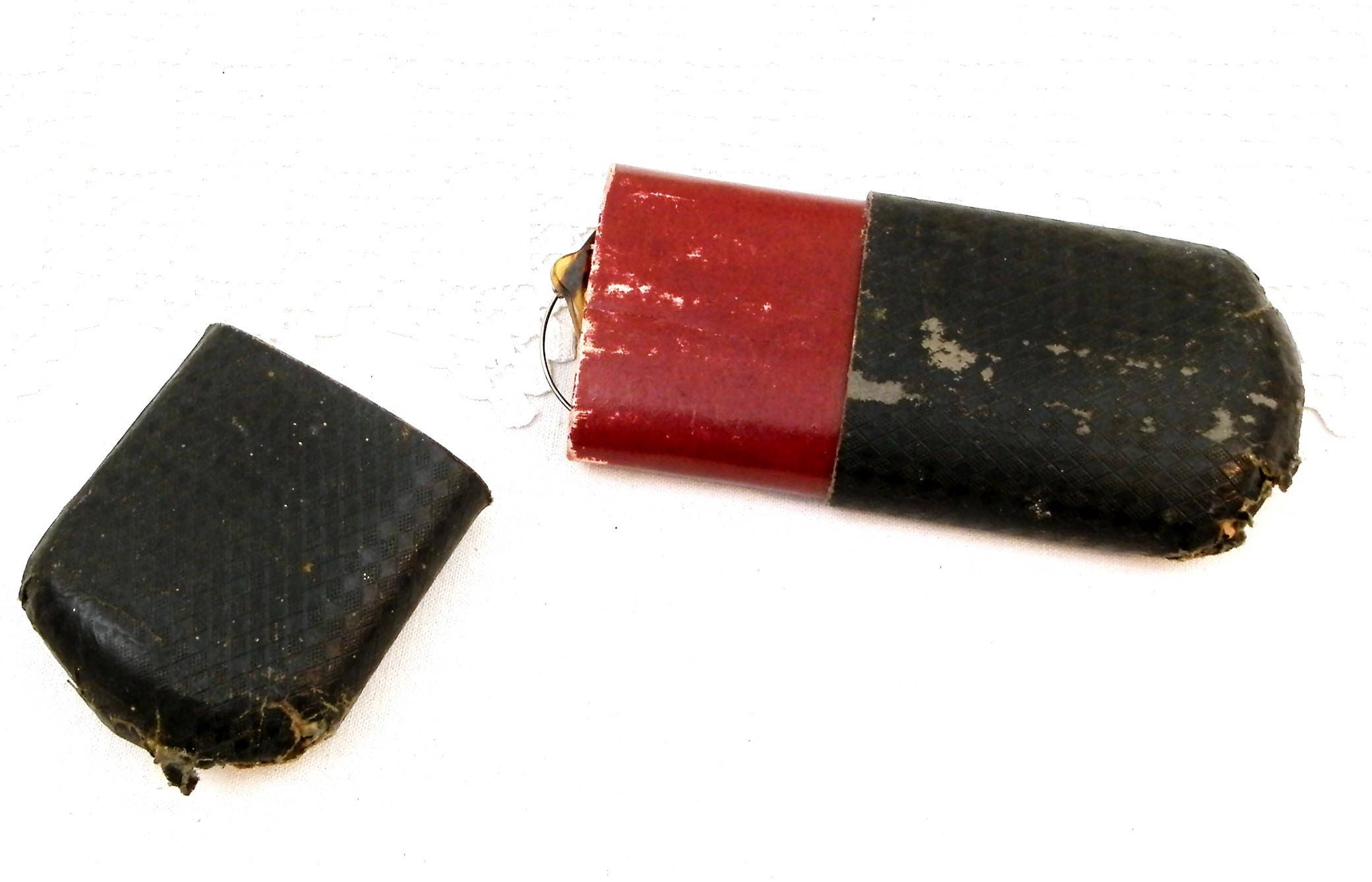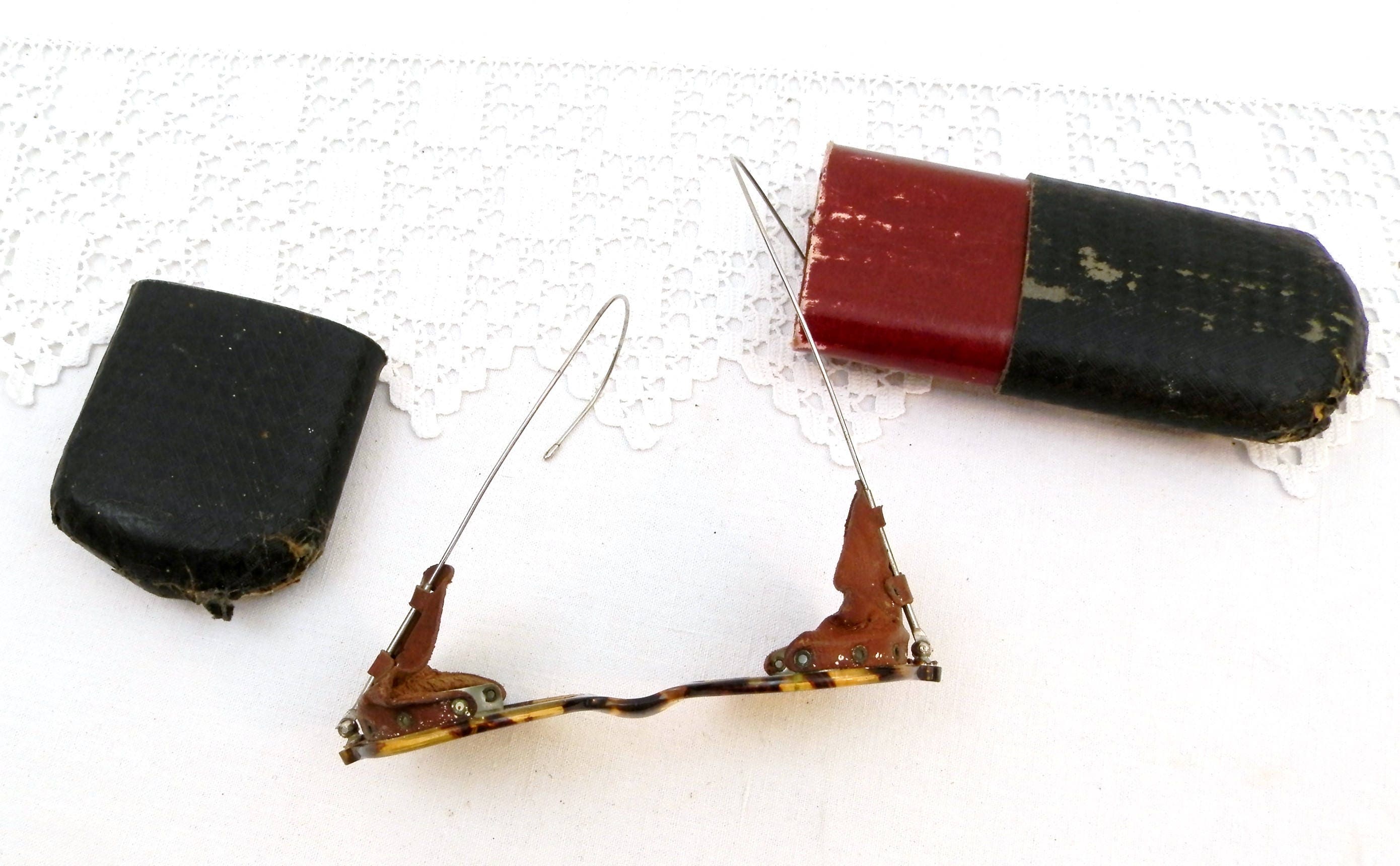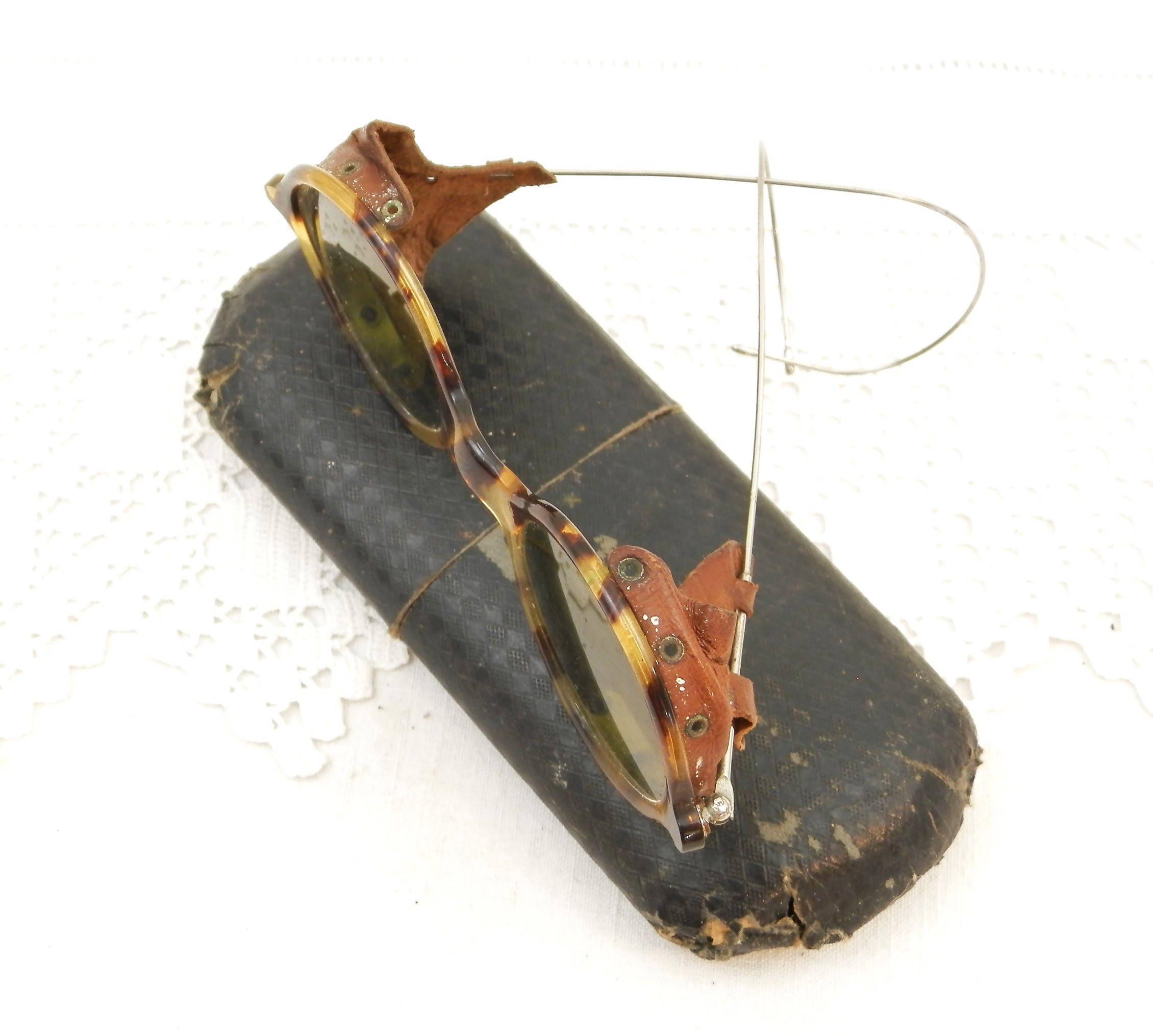 Vintage 1920s skiing / snow sports colored lens glasses with case. Made of faux turtle shell with real leather and metal. Could also have been welding glasses.