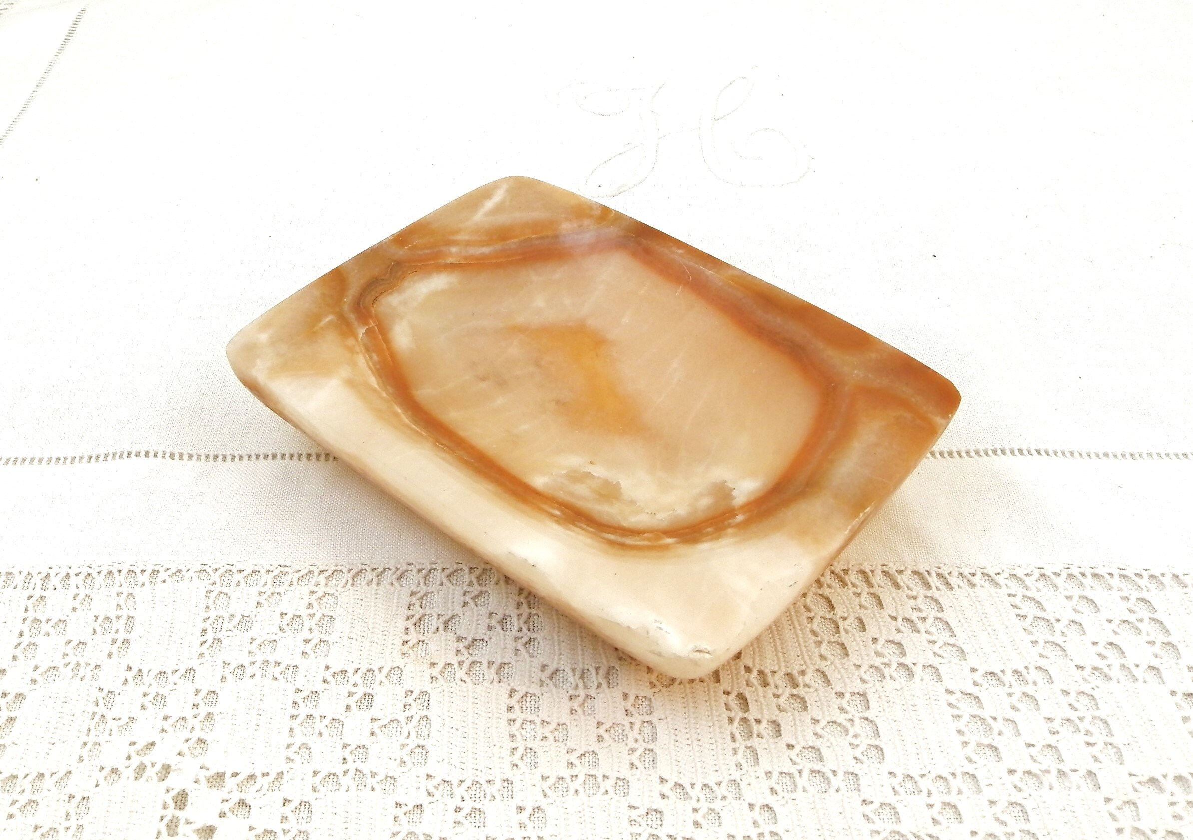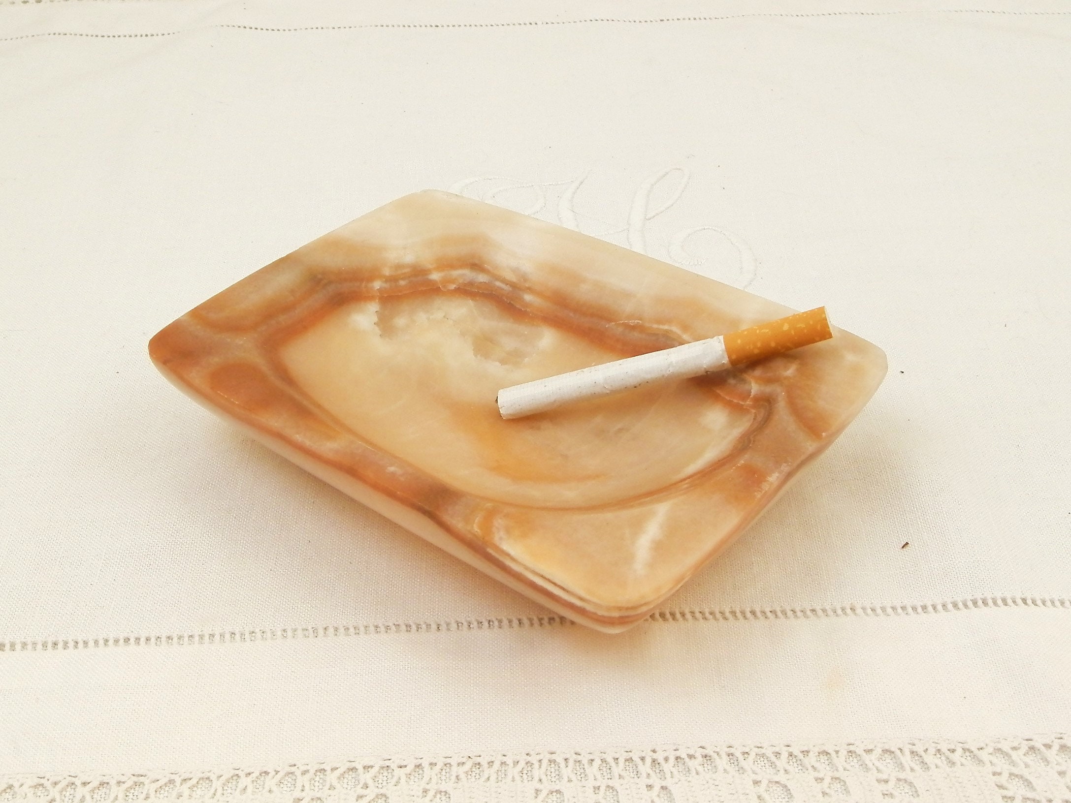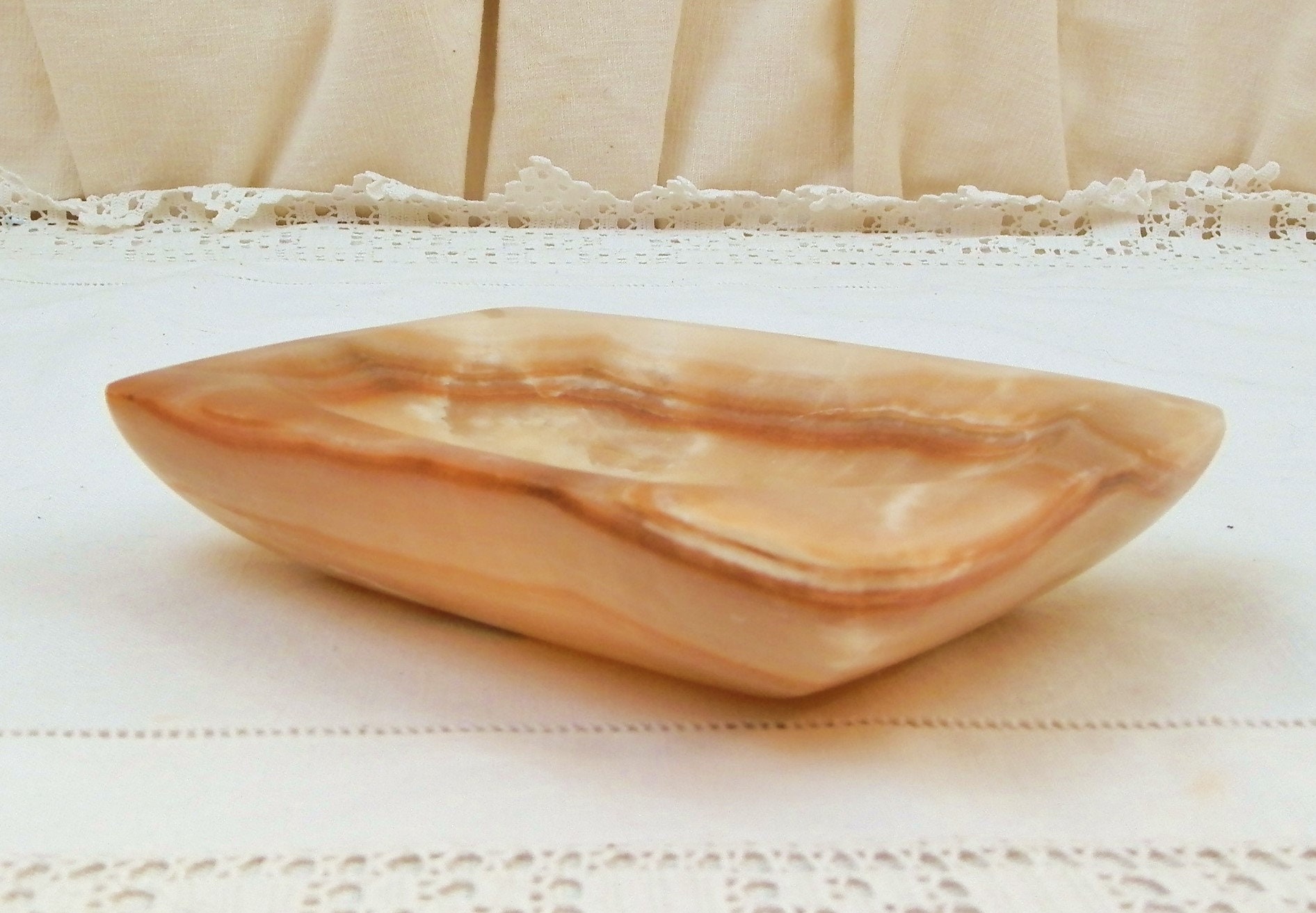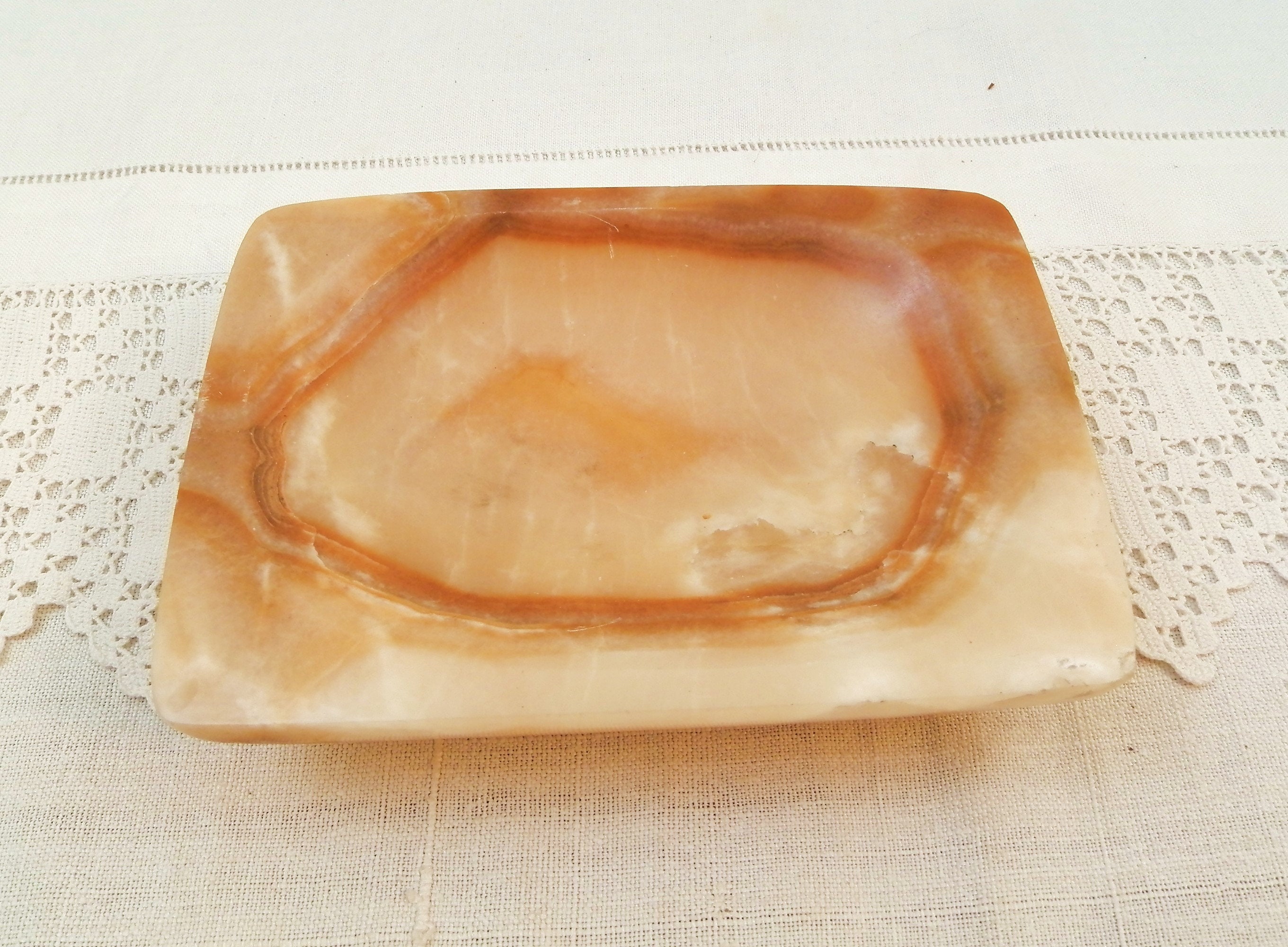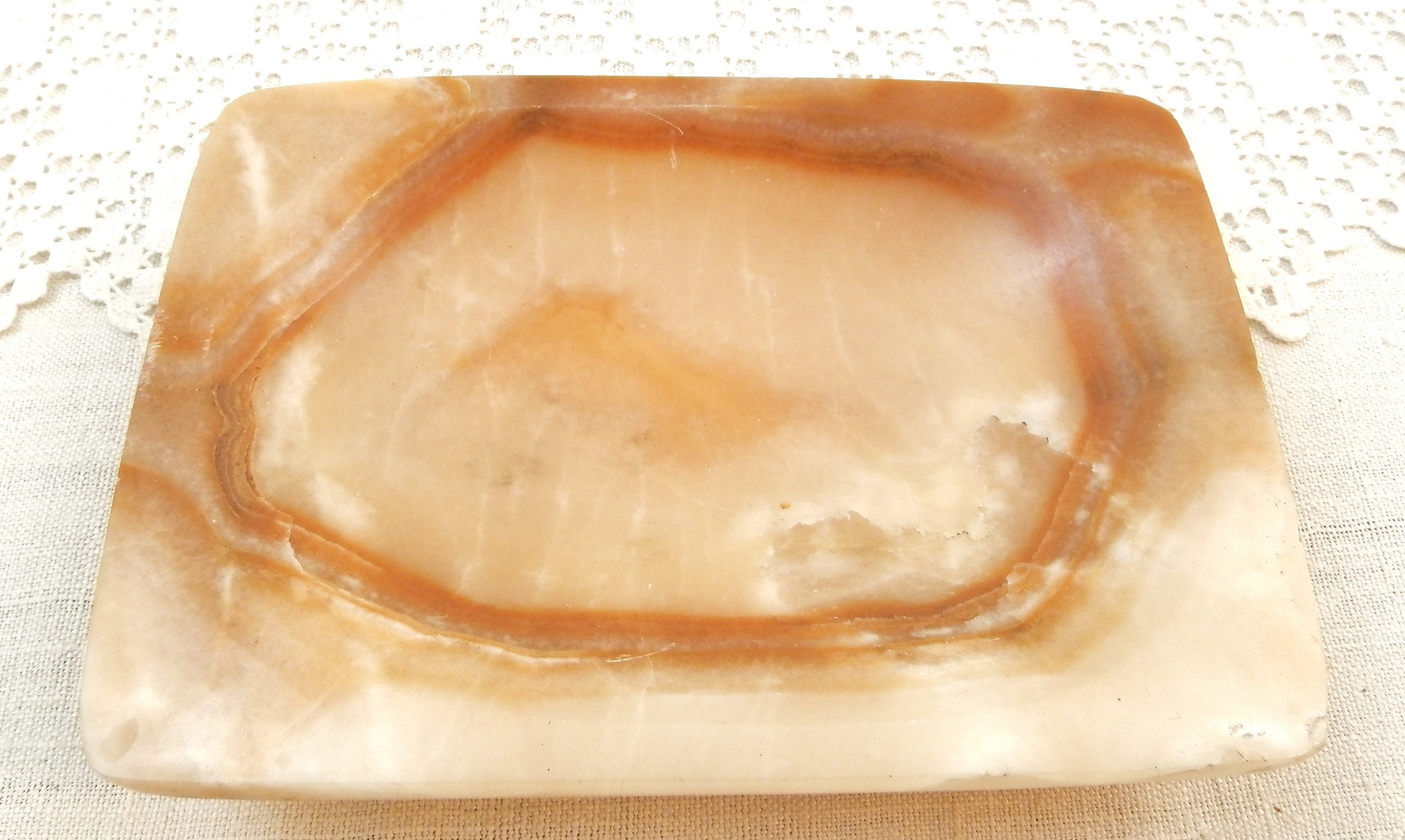 Large heavy vintage rectangular carved pale veined honey colored marble ashtray. Made from a solid piece of stone. found at a French Fleamarket near Le Mans ( famous for the 24 hour car race. )