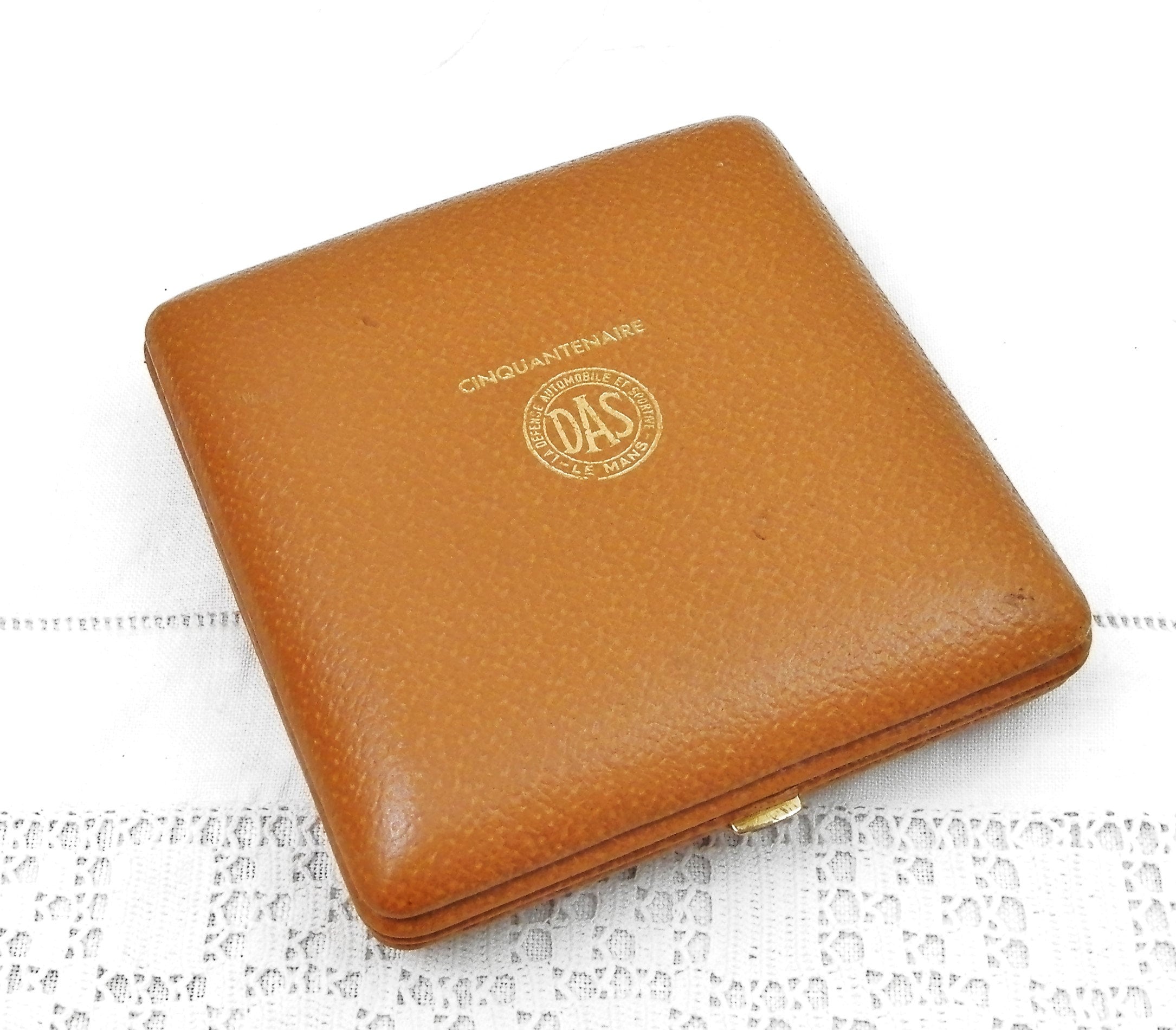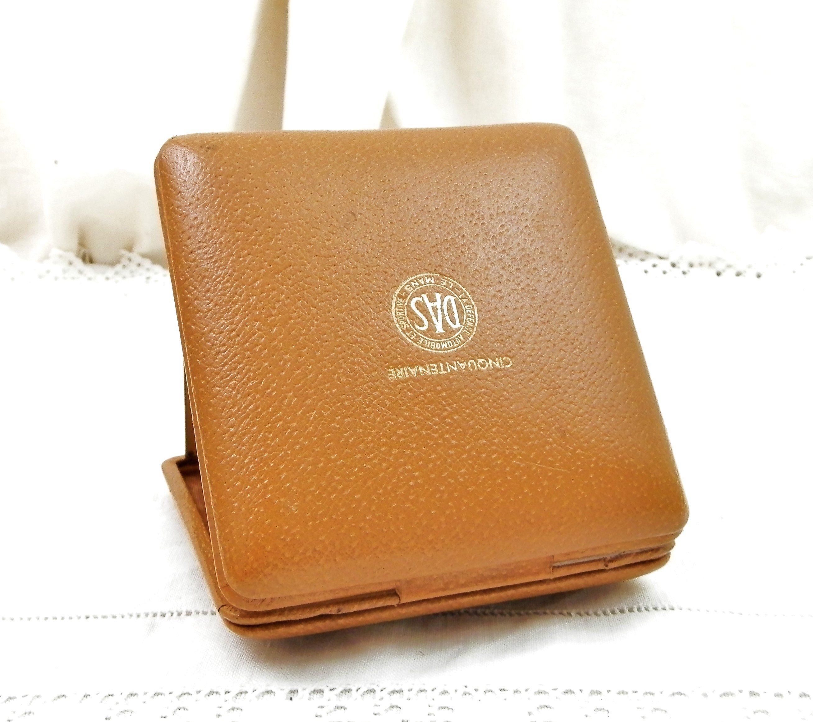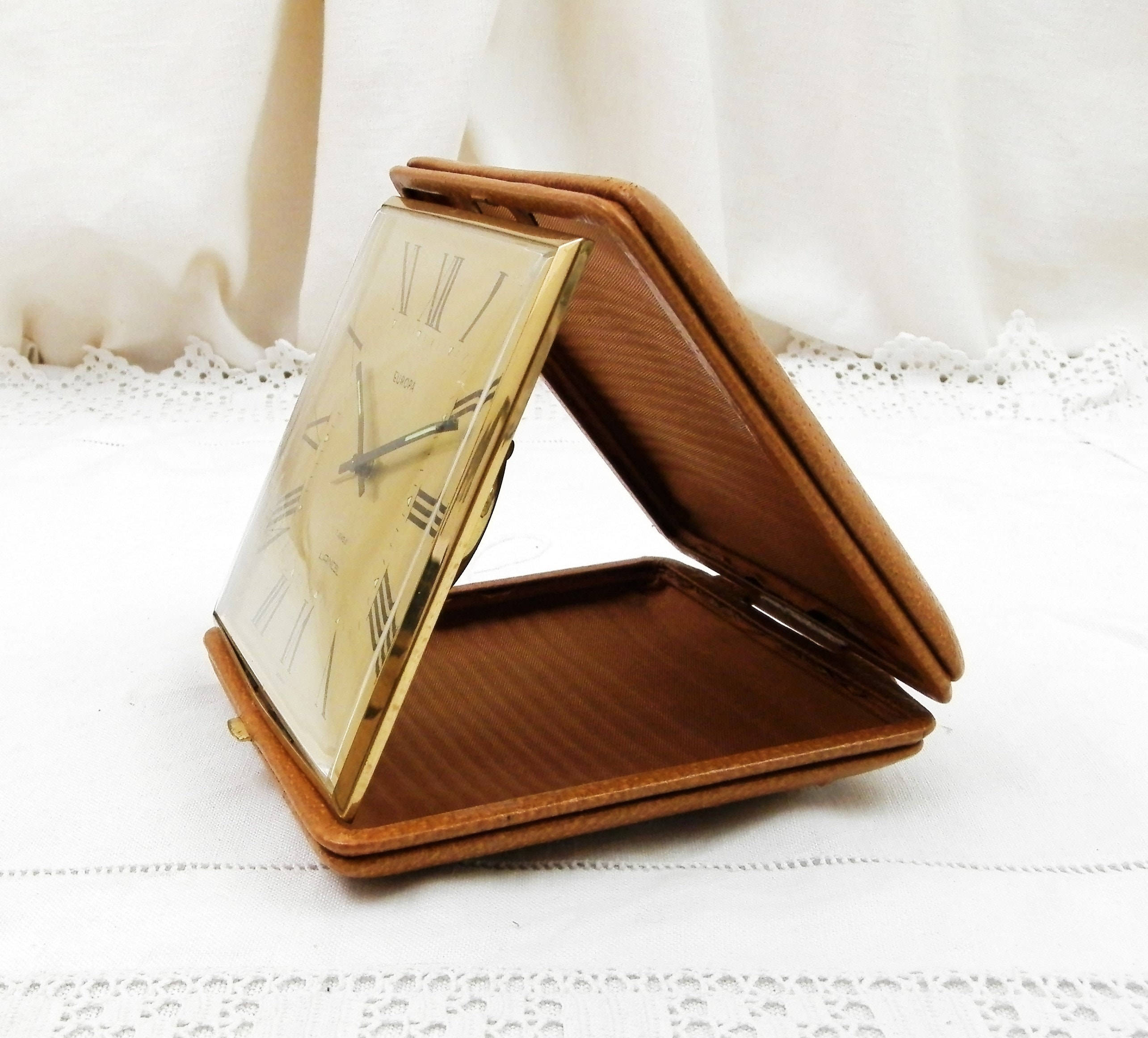 Vintage large sized mechanical wind-up Lancel travel alarm clock in leather folding case. Made by Europa in Germany with 7 jewel mechanism. This is a rare find due to its size and also the fact that it a promotional gift for the 50th anniversary in 1967 of the insurance company DAS based in the town of Le Mans created by the founder of the worlds largest car race, the 24 hours of the Le Mans. Pale brown leather case with gold colored clock face and black roman numerals, gold colored metal clock body glow in the dark hands and dots next to the numerals. Both clock and alarm are in working order.