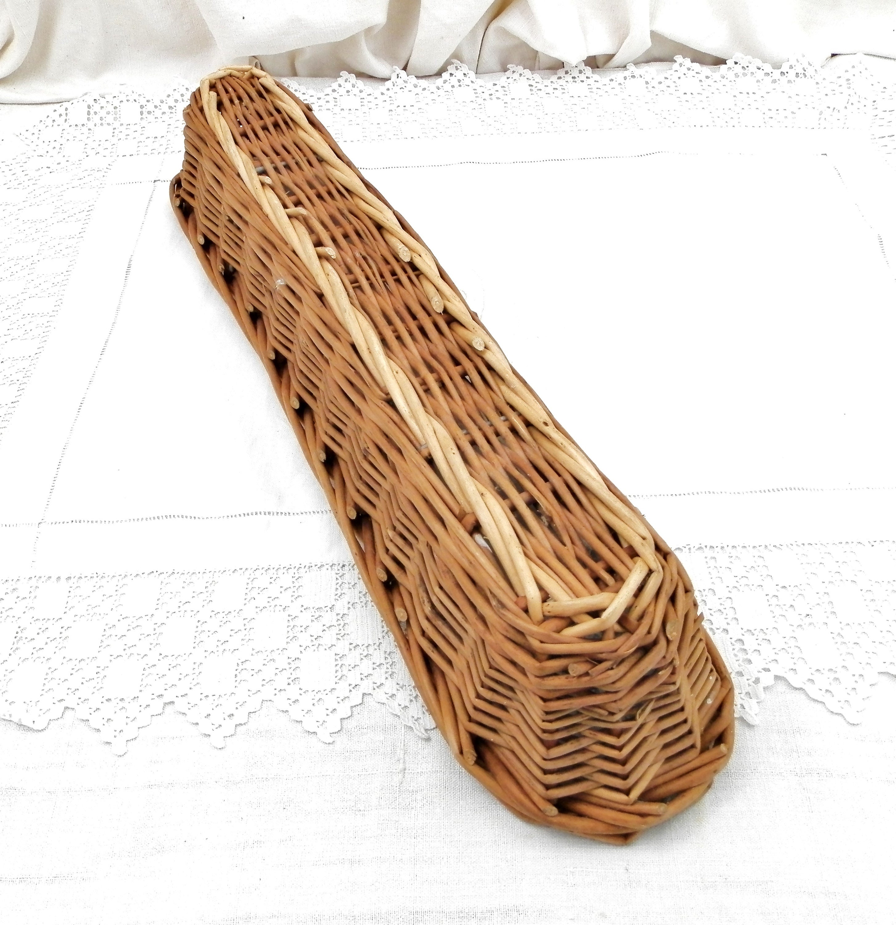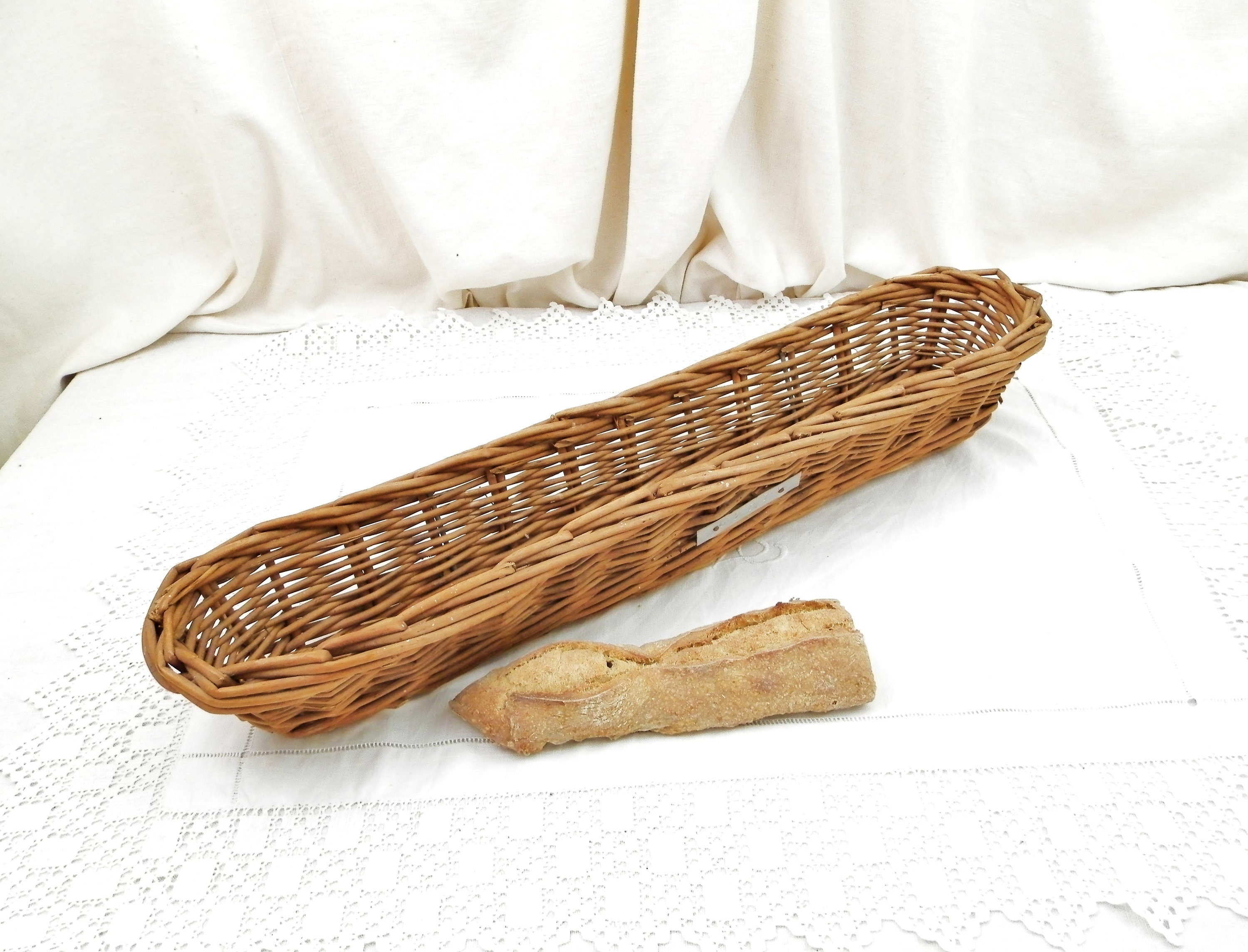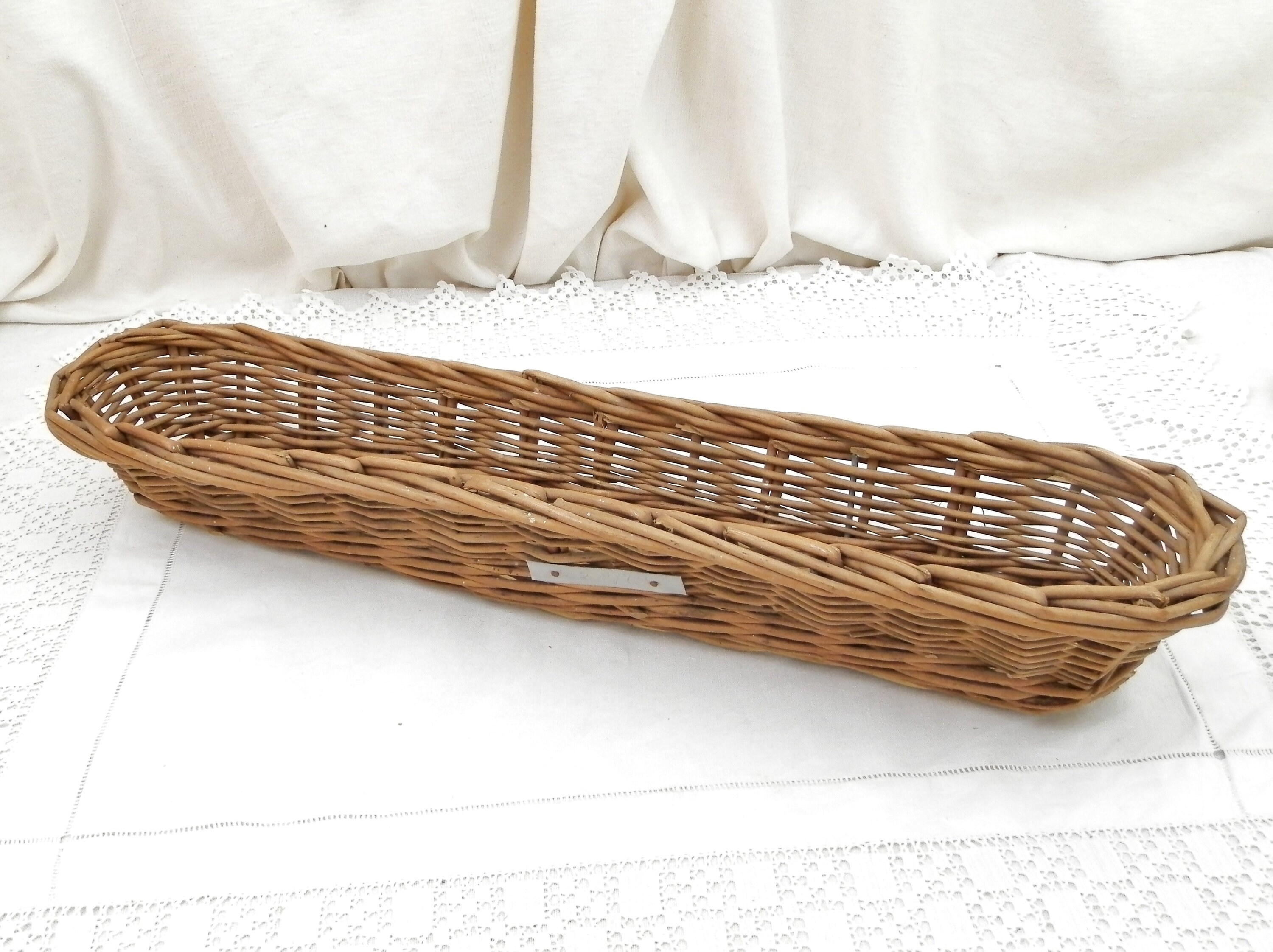 Vintage French woven wicker bread basket. These baskets are used by the boulangerie for the dough to rise and take the shape of a baguette, normally they have a fabric lining, which has been removed. Still with original metal plaque. Great to use as a bread serving basket or just decoratively.